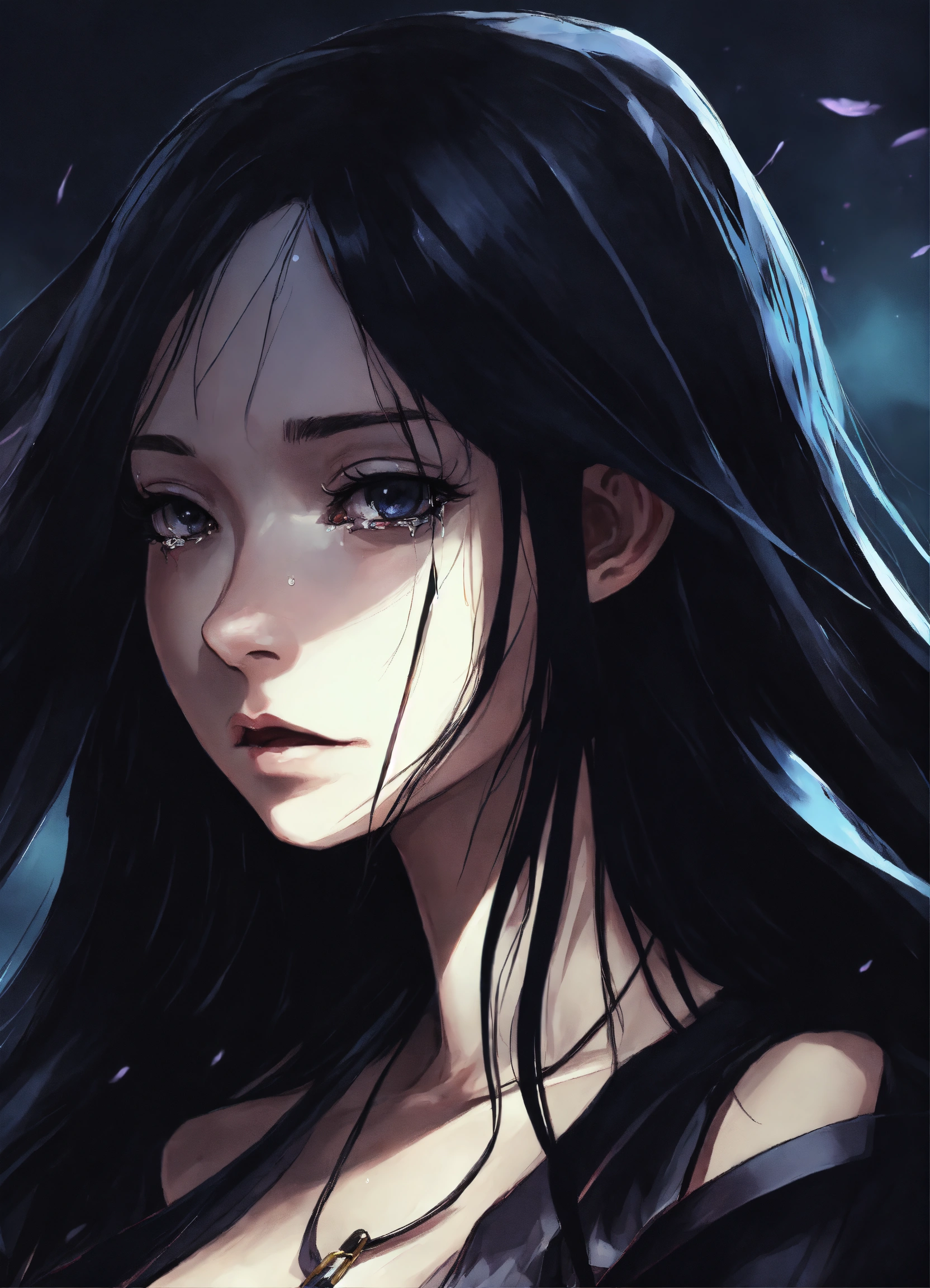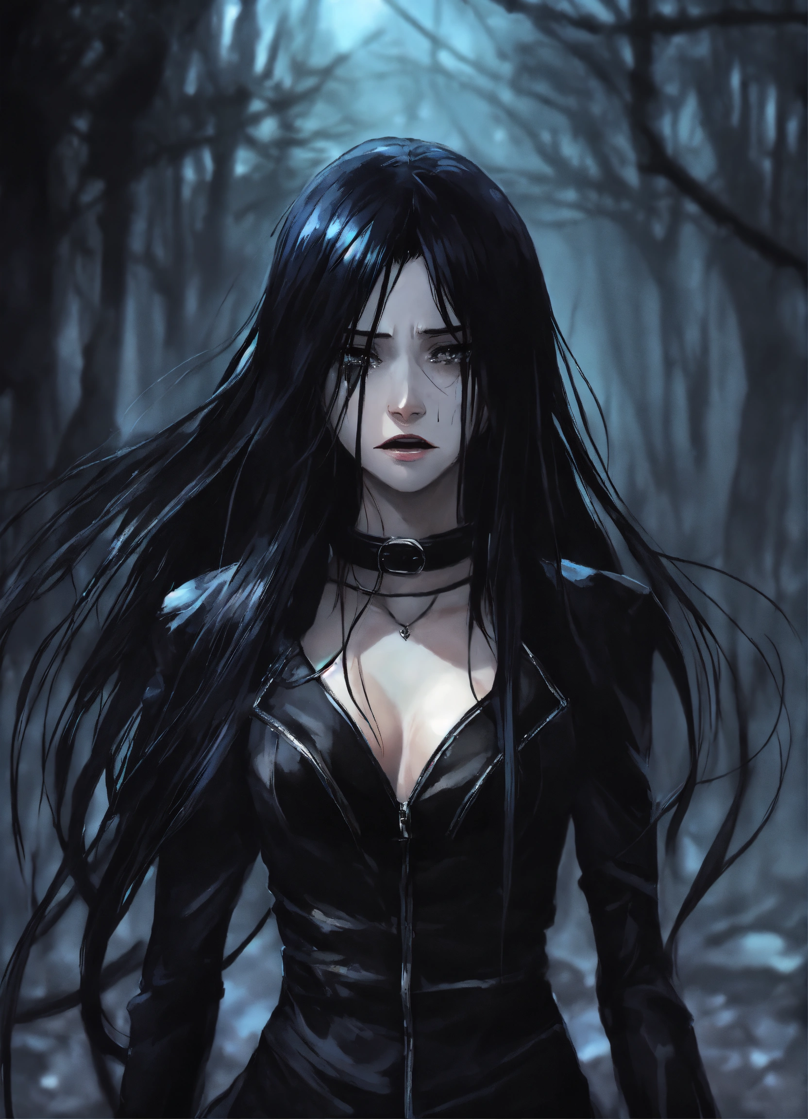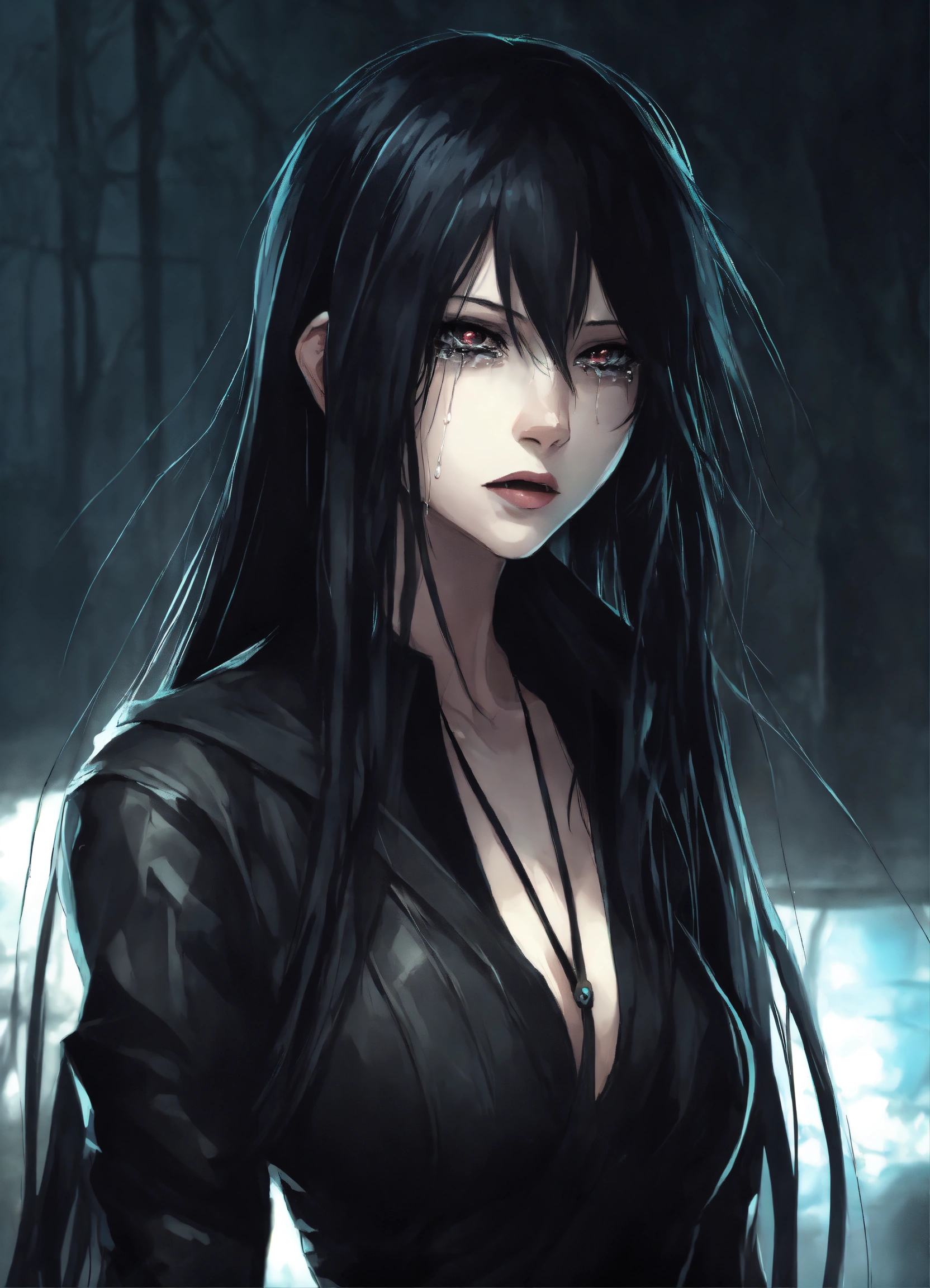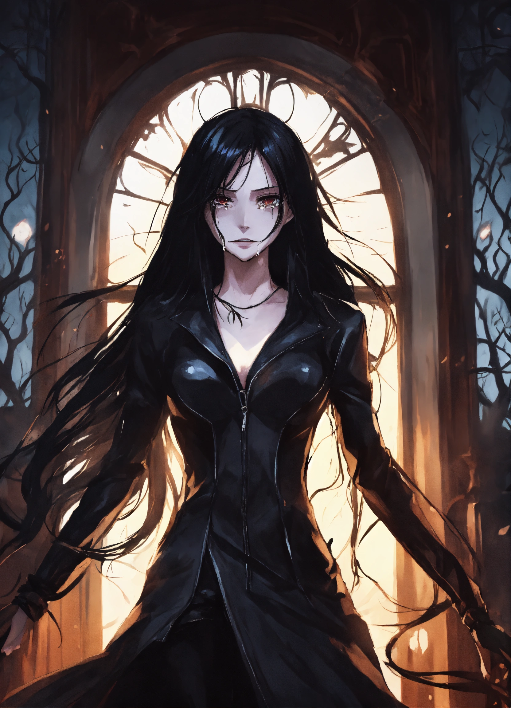 2d epic anime manga style, evil sorceress, slender man face, crying leather dress, long black hair, white pale skin, in the shadows