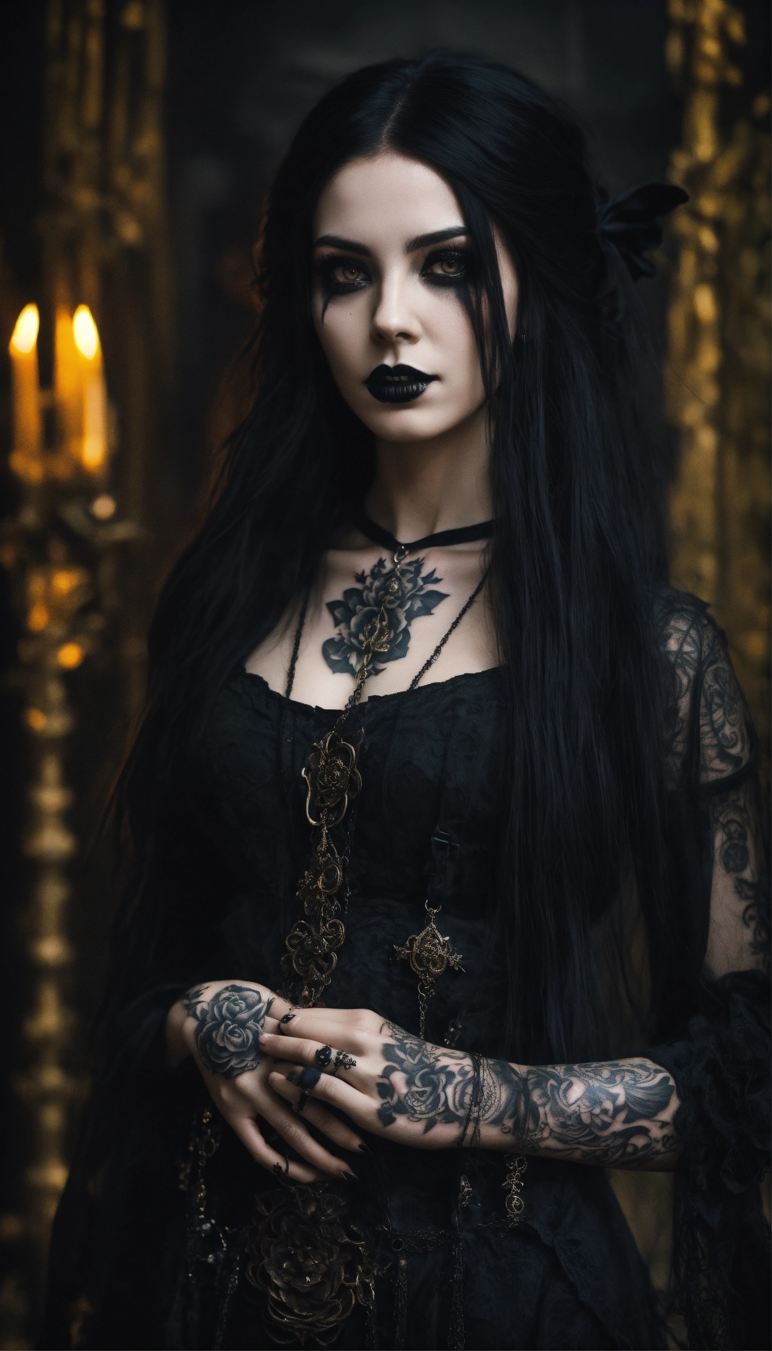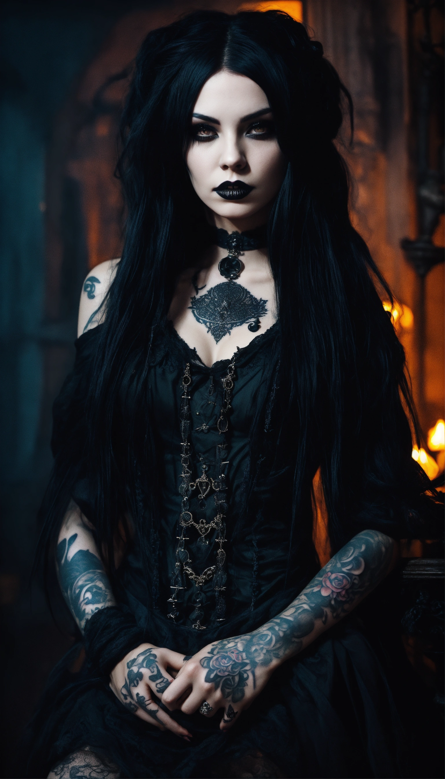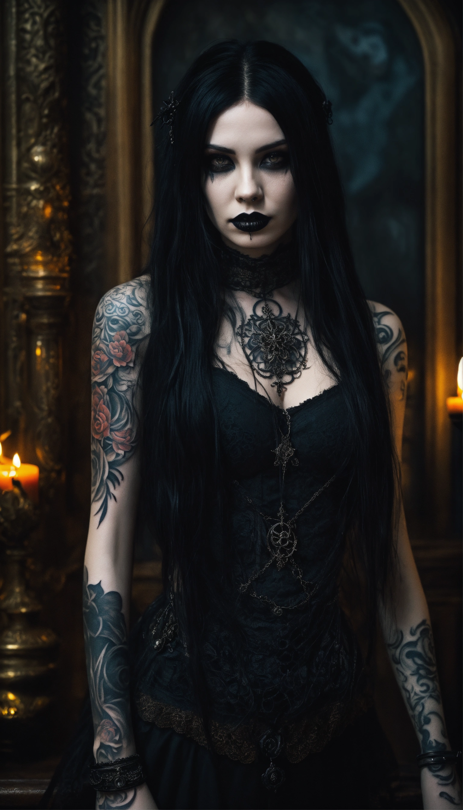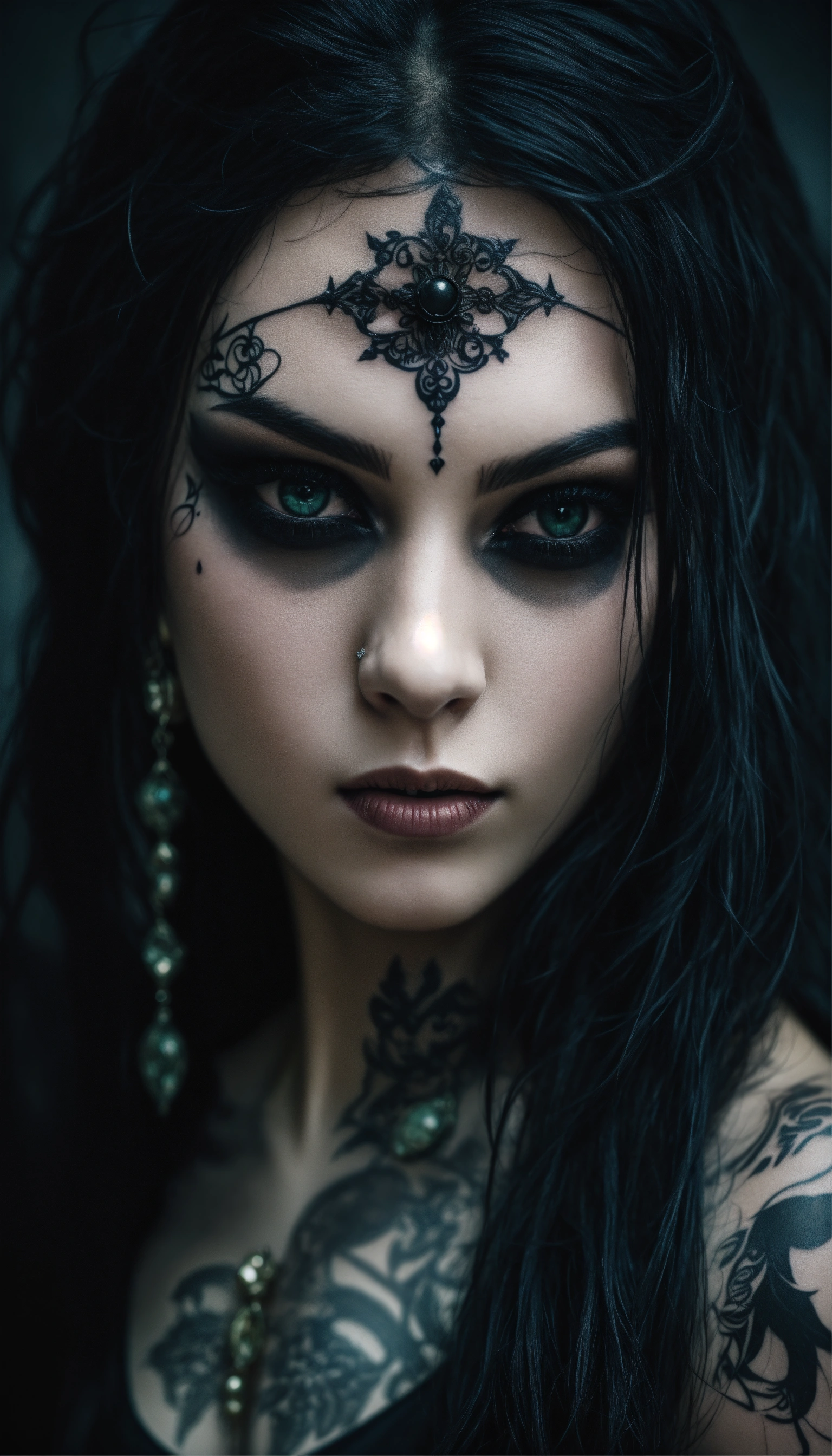 A scary girl, full body, pale skin, long crazy black hair, dark eyes, a dark and mysterious appearance, facial tattoos, gothic aura