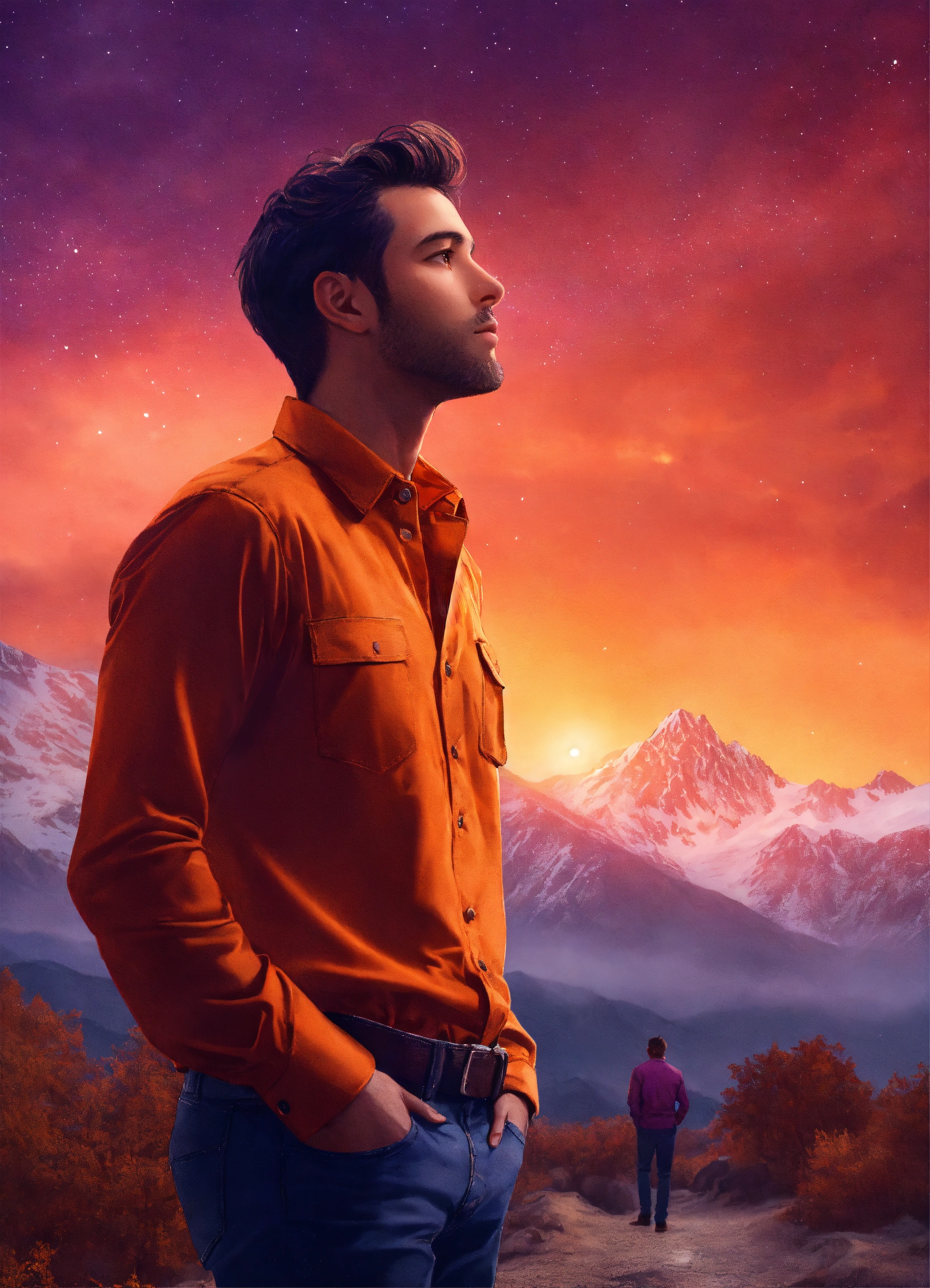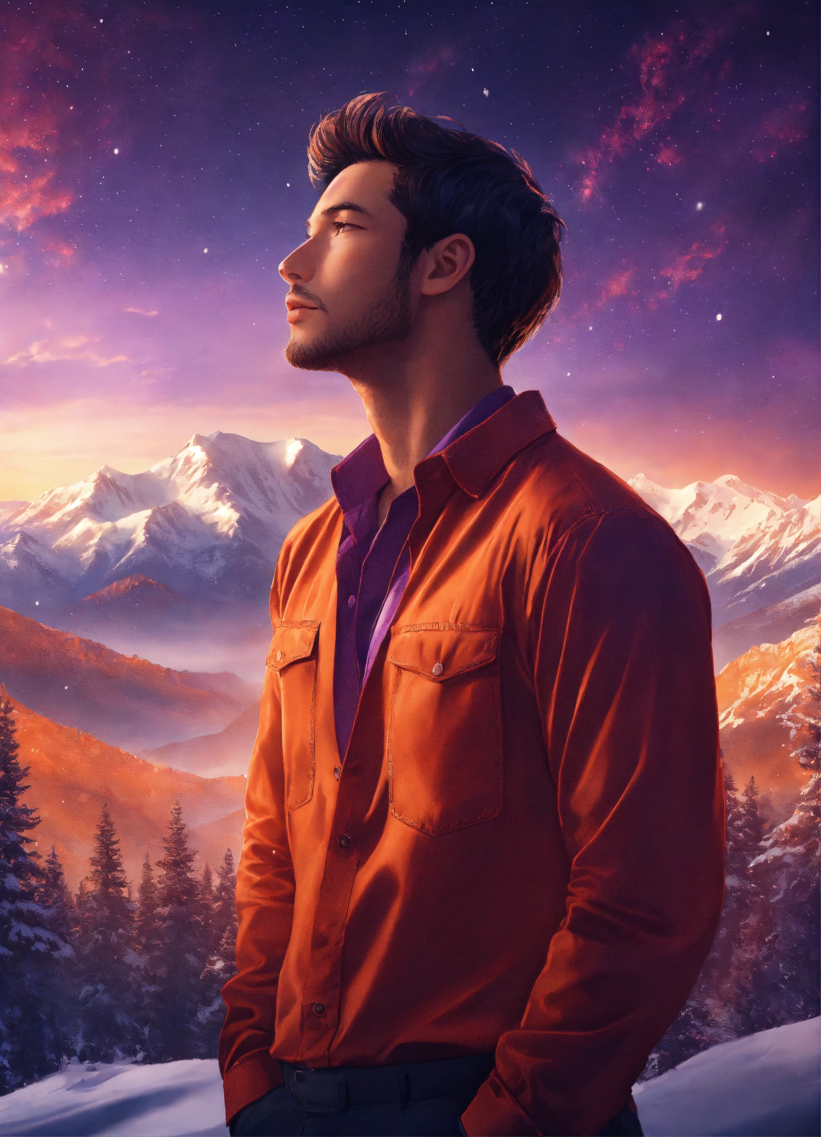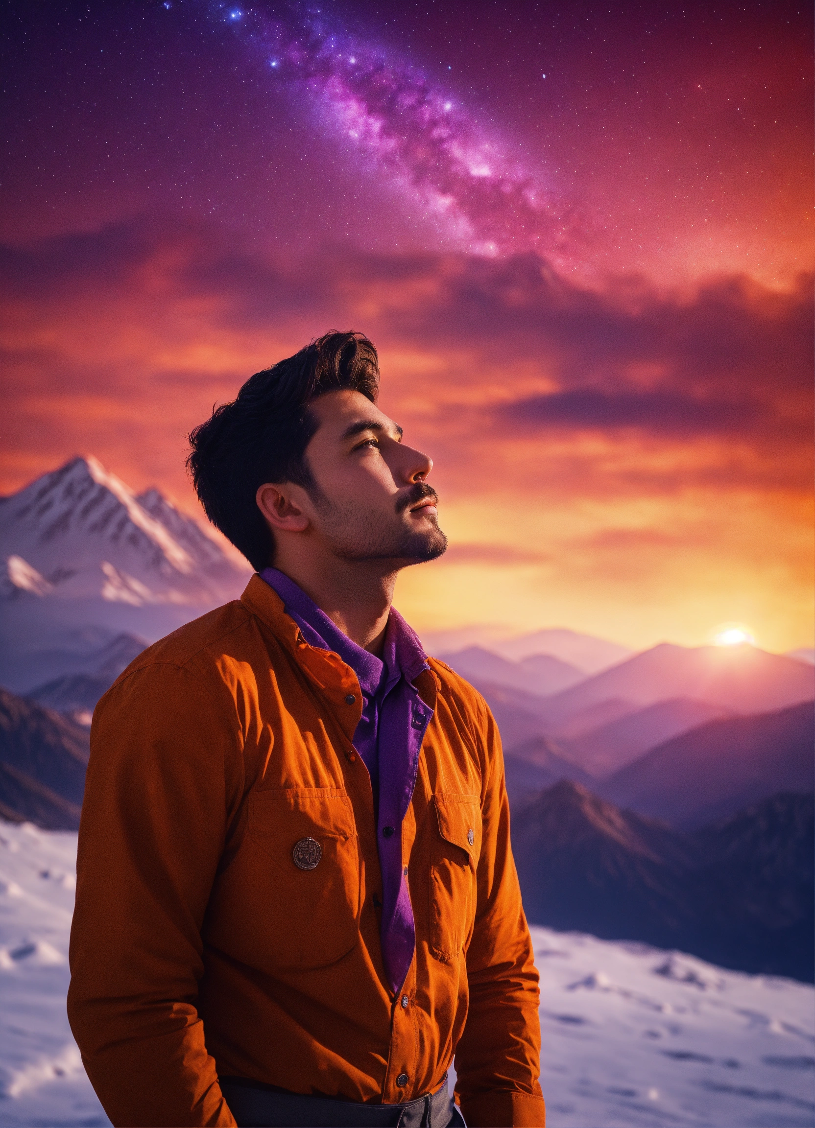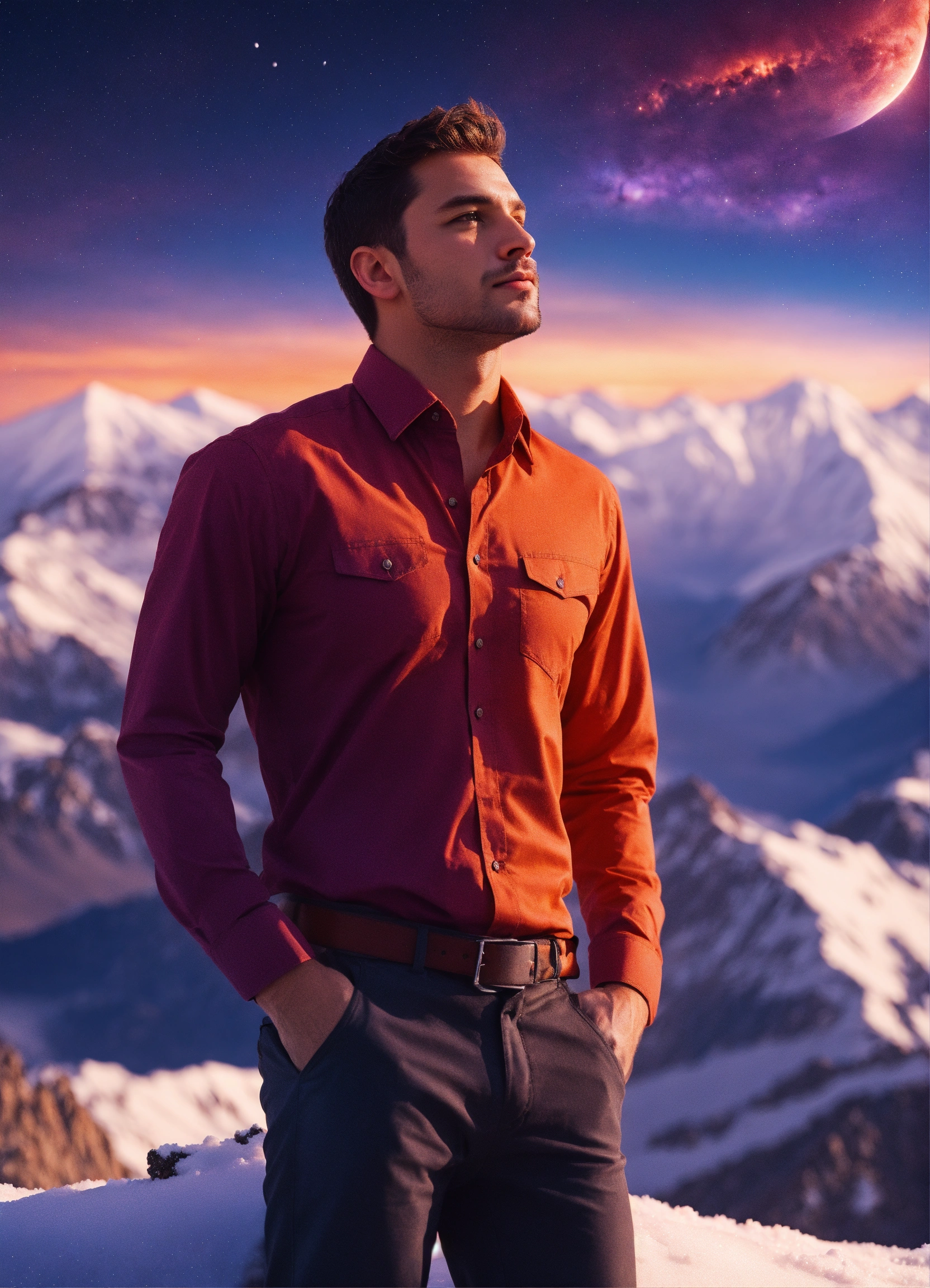 A cute man, looking up at the sky, shirt unbuttoned, sunrise orange, red, purple, snow covered mountains in the background and the universe showing in background, 4k resolution, photo realistic