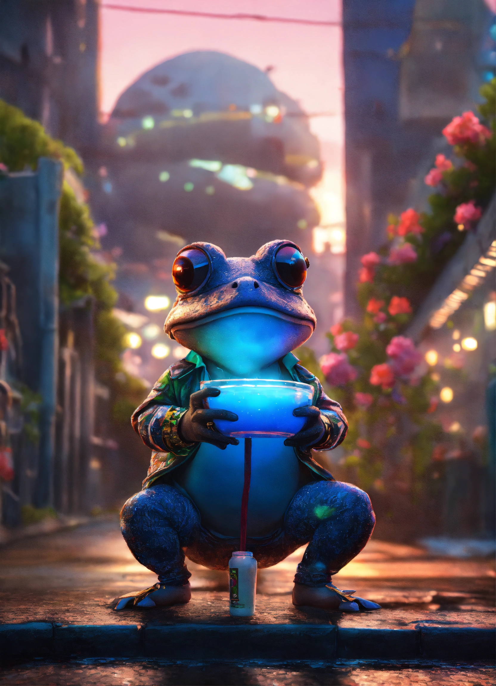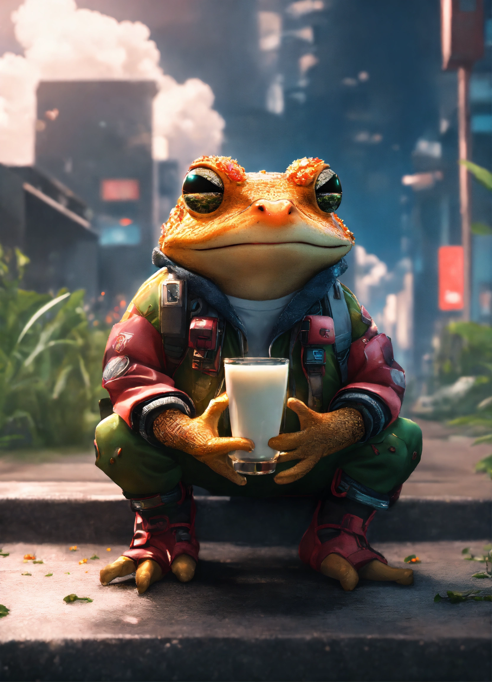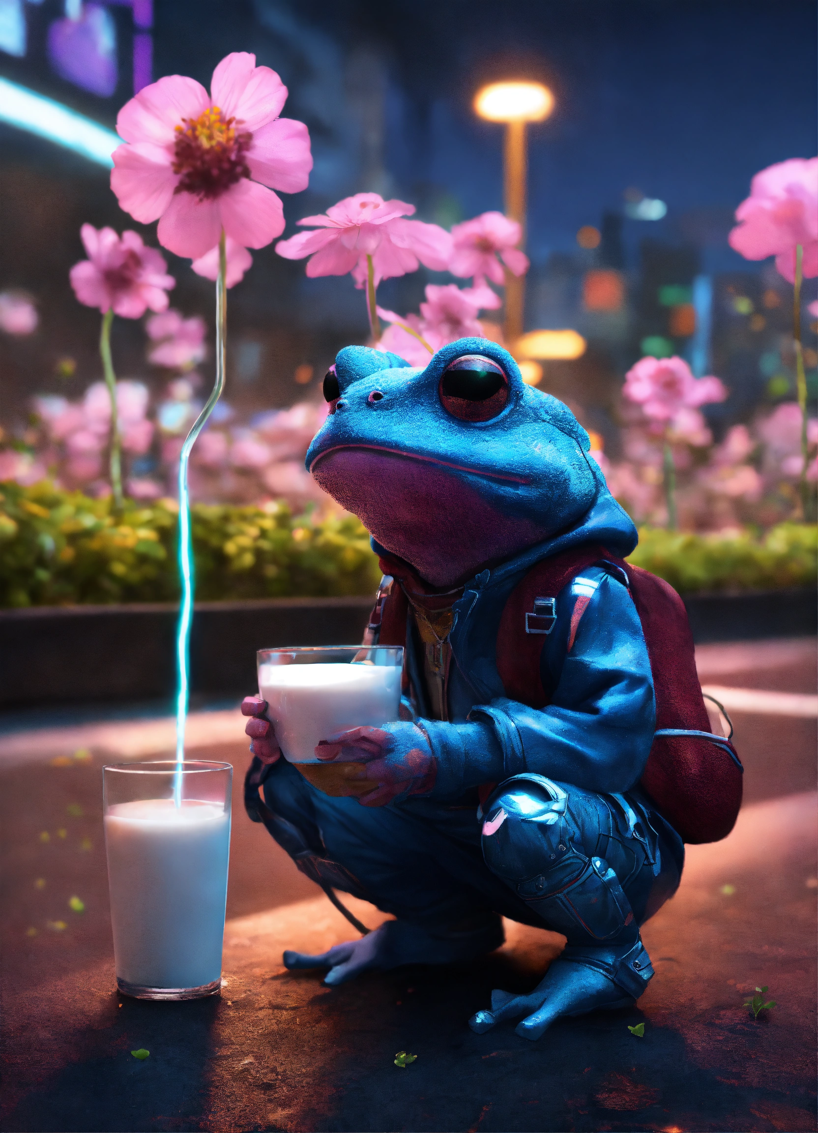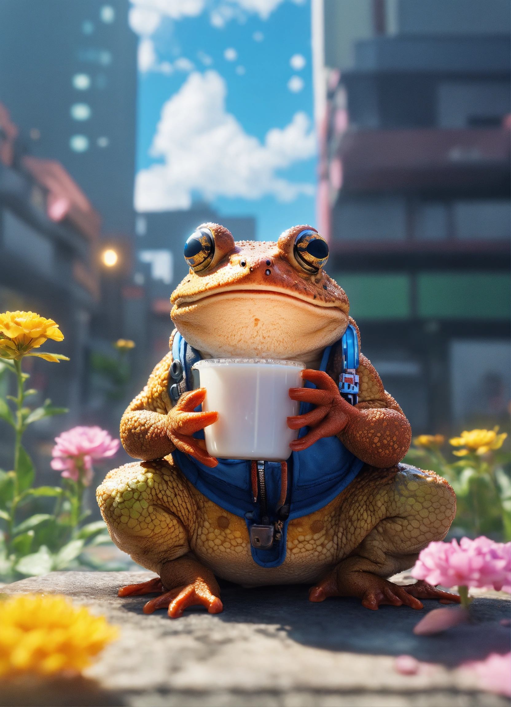 A toad drinking milk slice of life anime, cyberpunk style, of a person in urban floral wear, with a cloud as a head, photorealistic, volumetric lighting, 8k, highly detailed