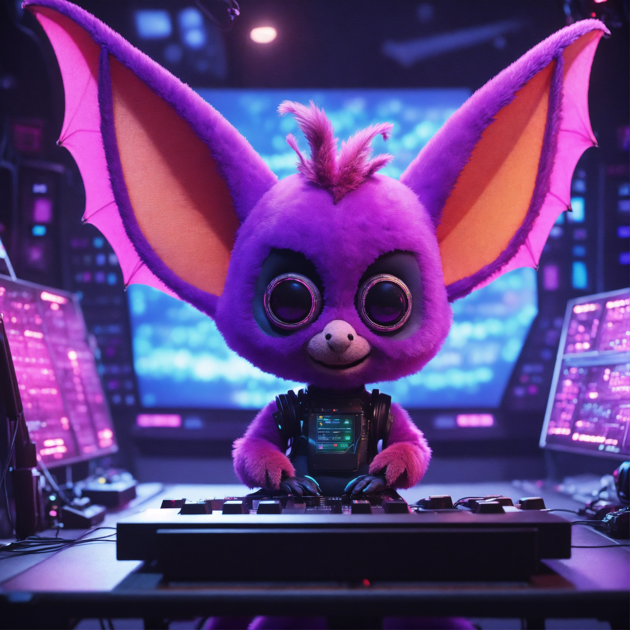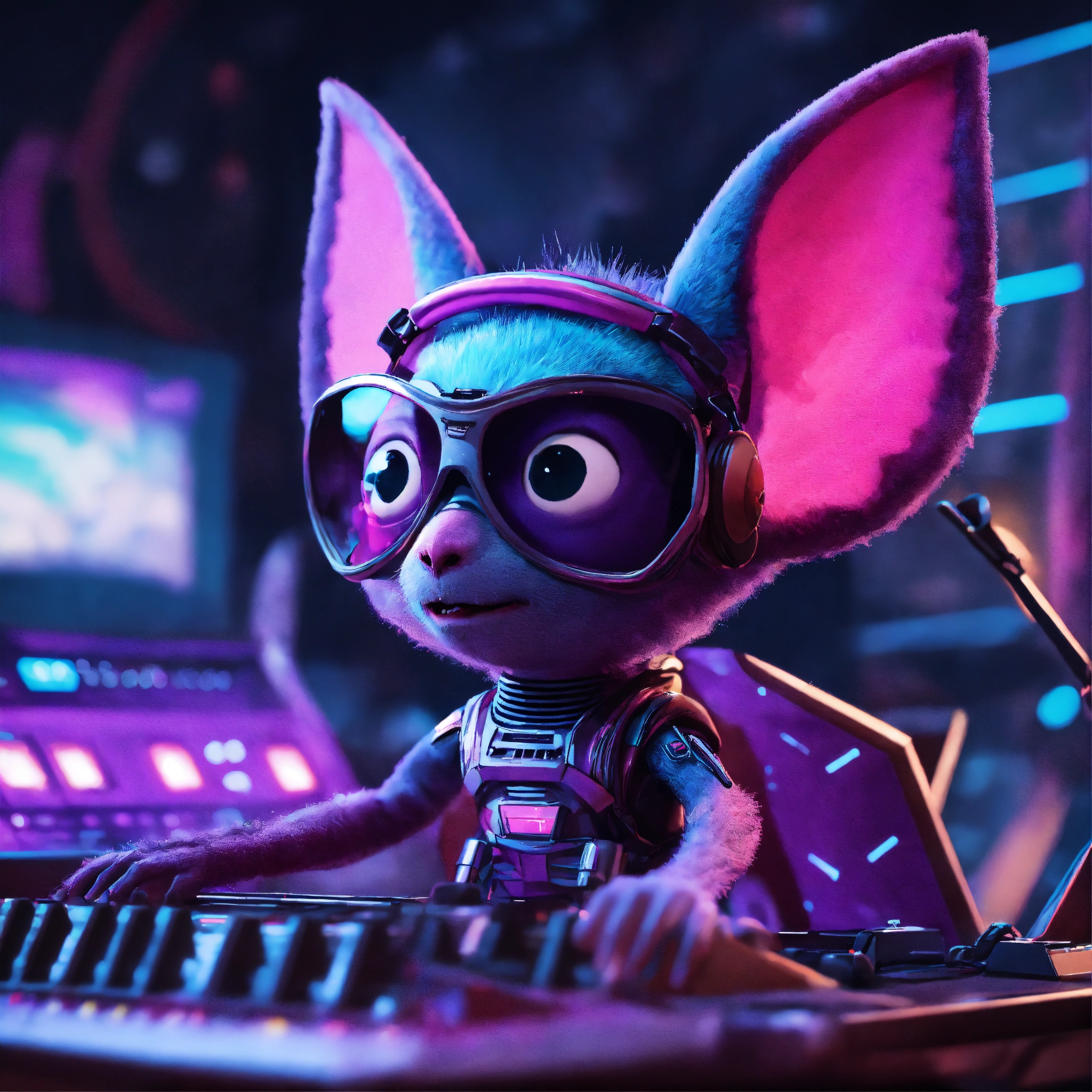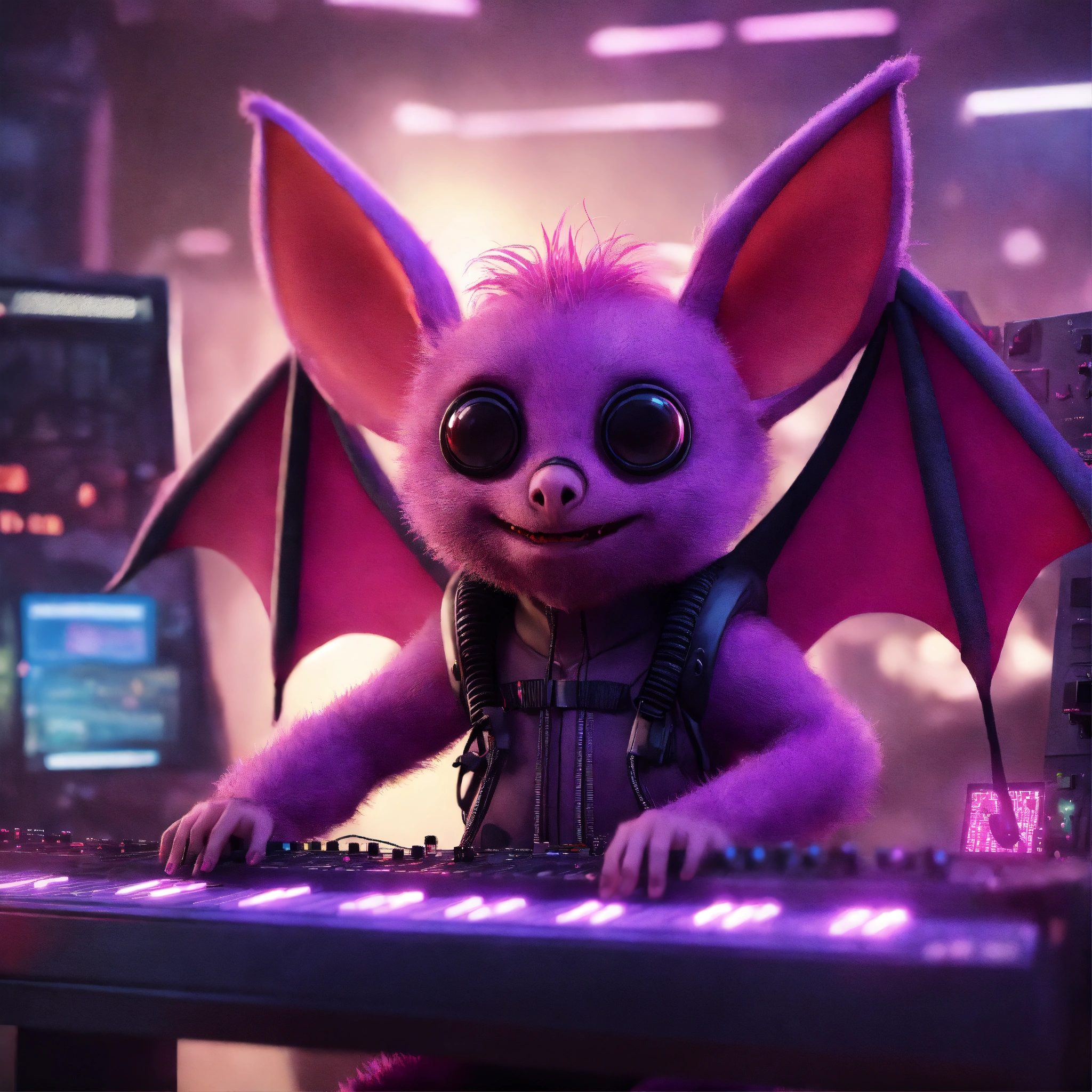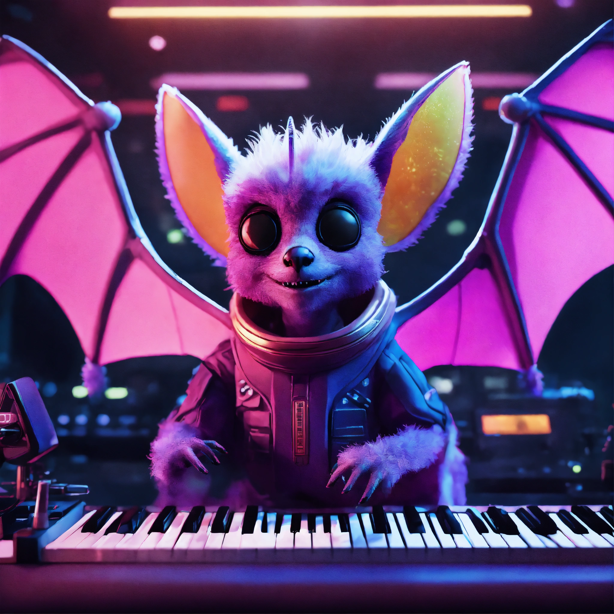 Cute silly fuzzy pink and purple alien fruitbat character with big ears, bat wings, purple mohawk, flying in a dark hi-tech control room, playing a synthesizer harp, cosmic, disney, pixar, realistic, 8k