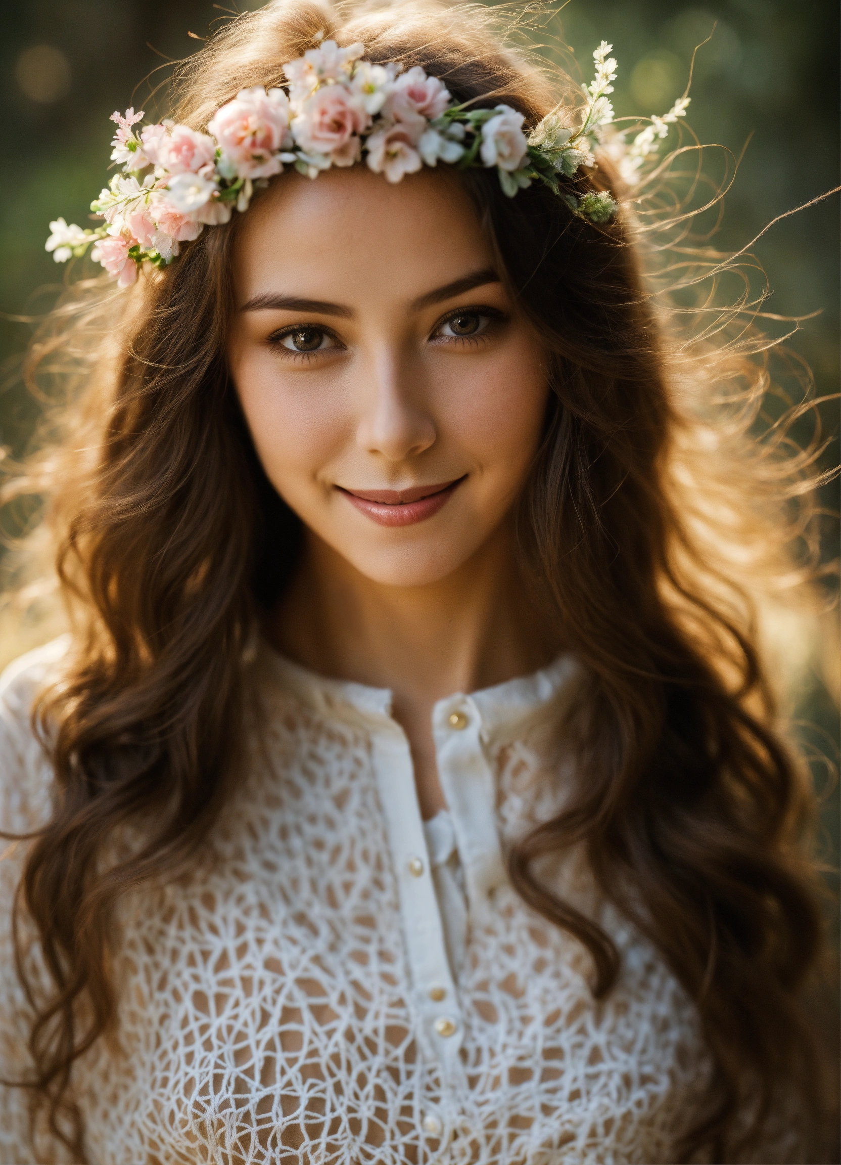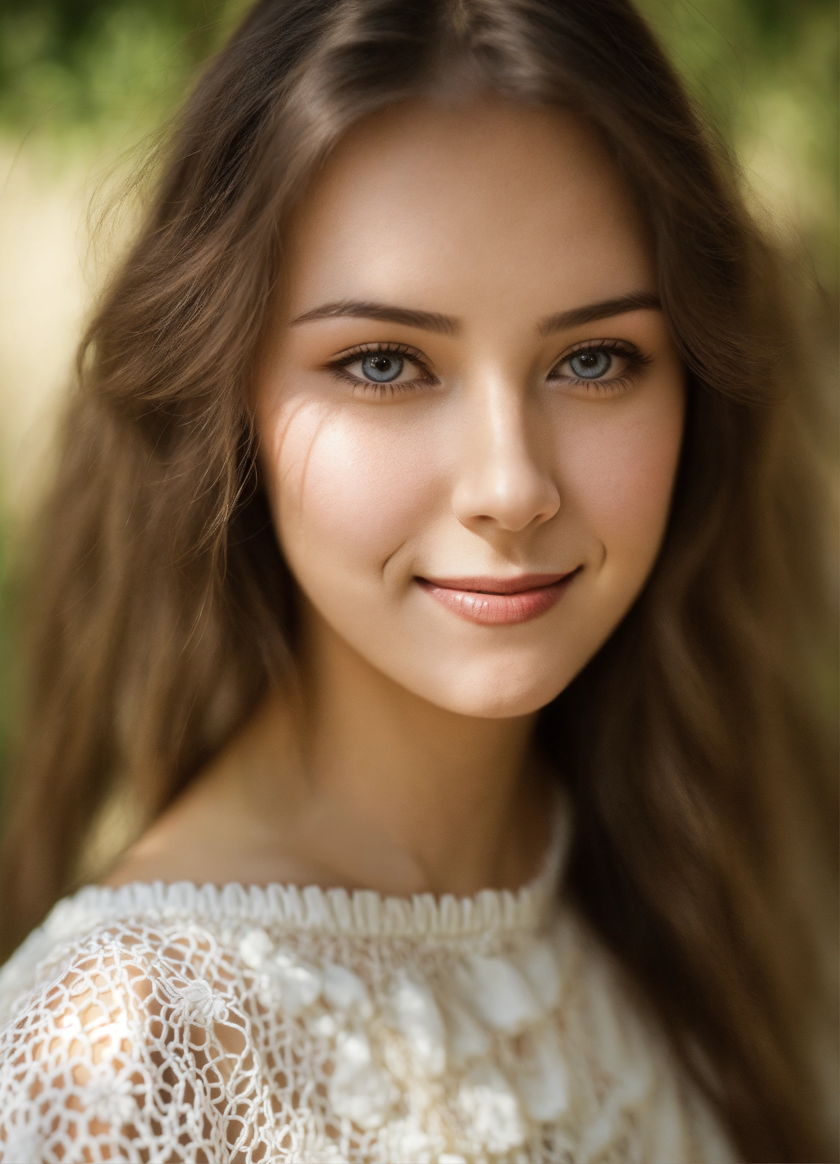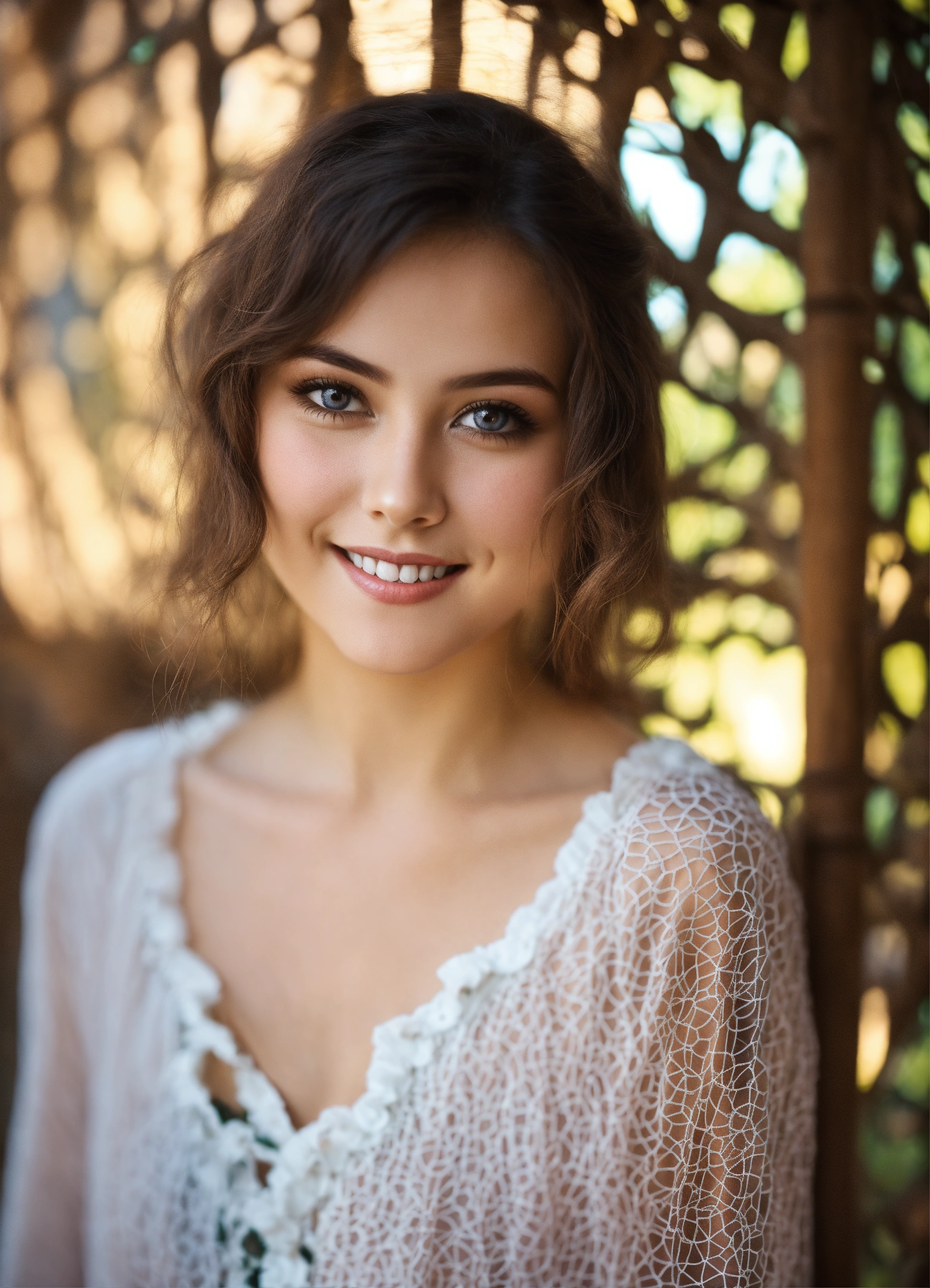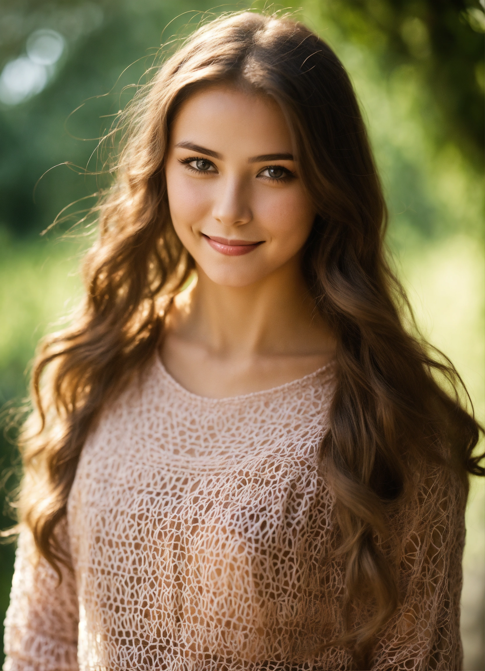 Young woman innocent sweet smile, dreamy eyes, wearing blouse of delicate fabric made of yarn or thread in an open weblike pattern