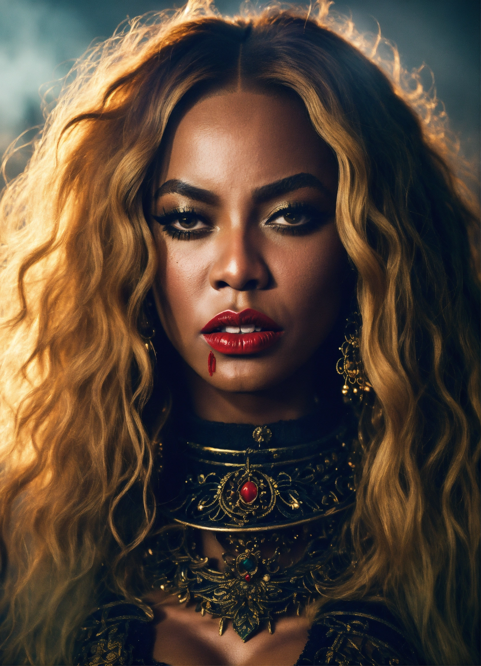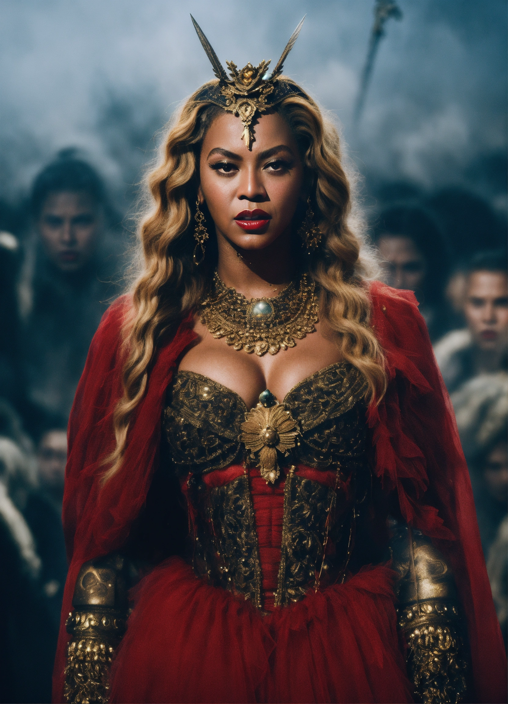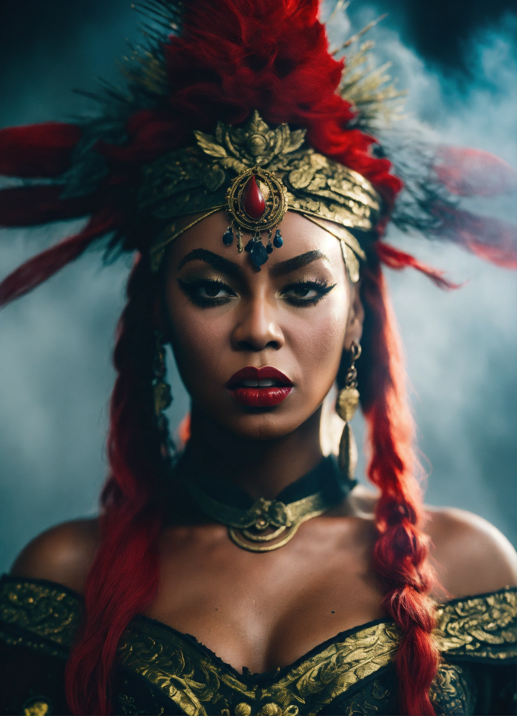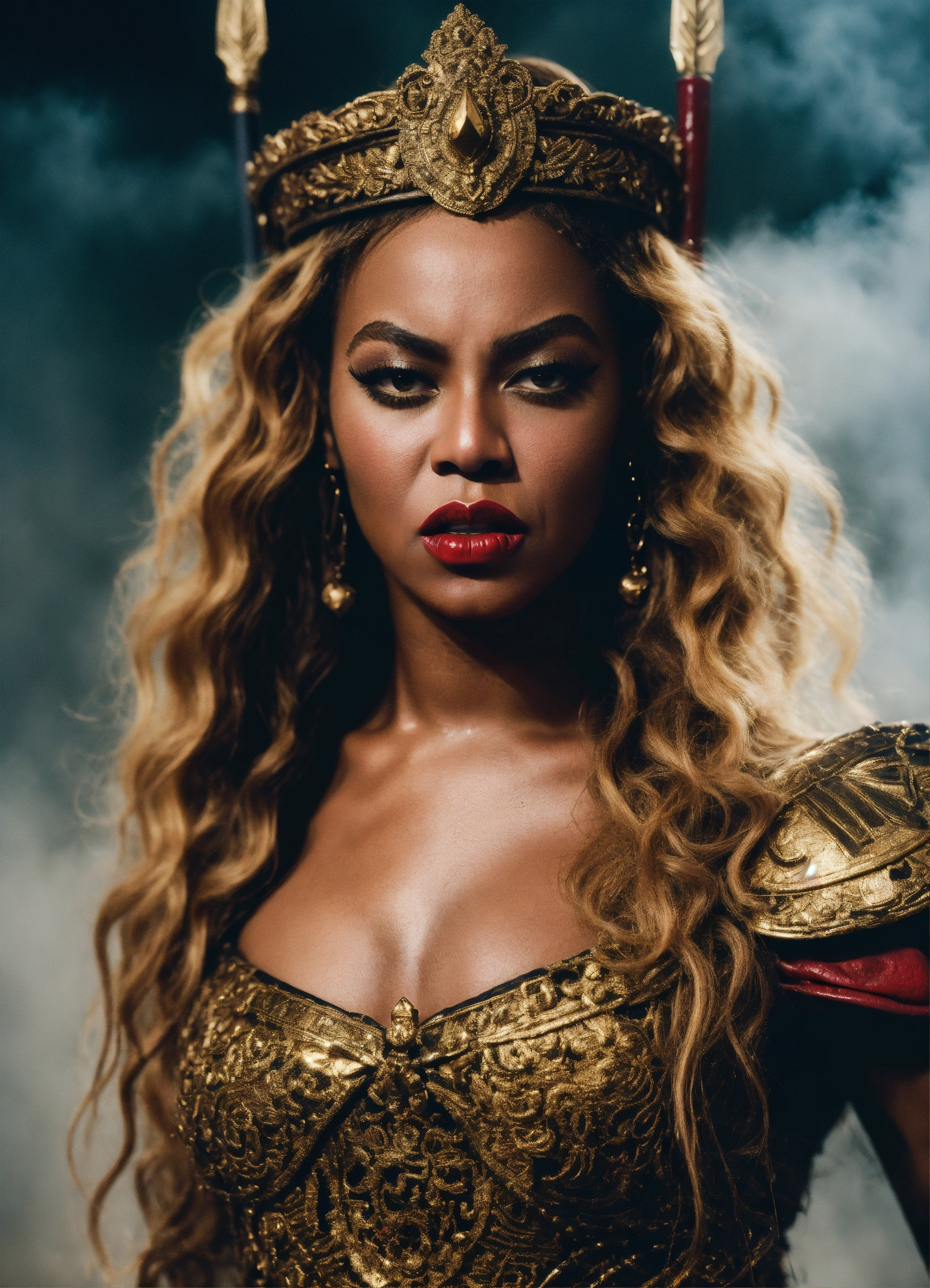 A photo quality portrait of beyoncé as a beautiful warrior with red lips, an angry expression, and surrounded by spooky fog.