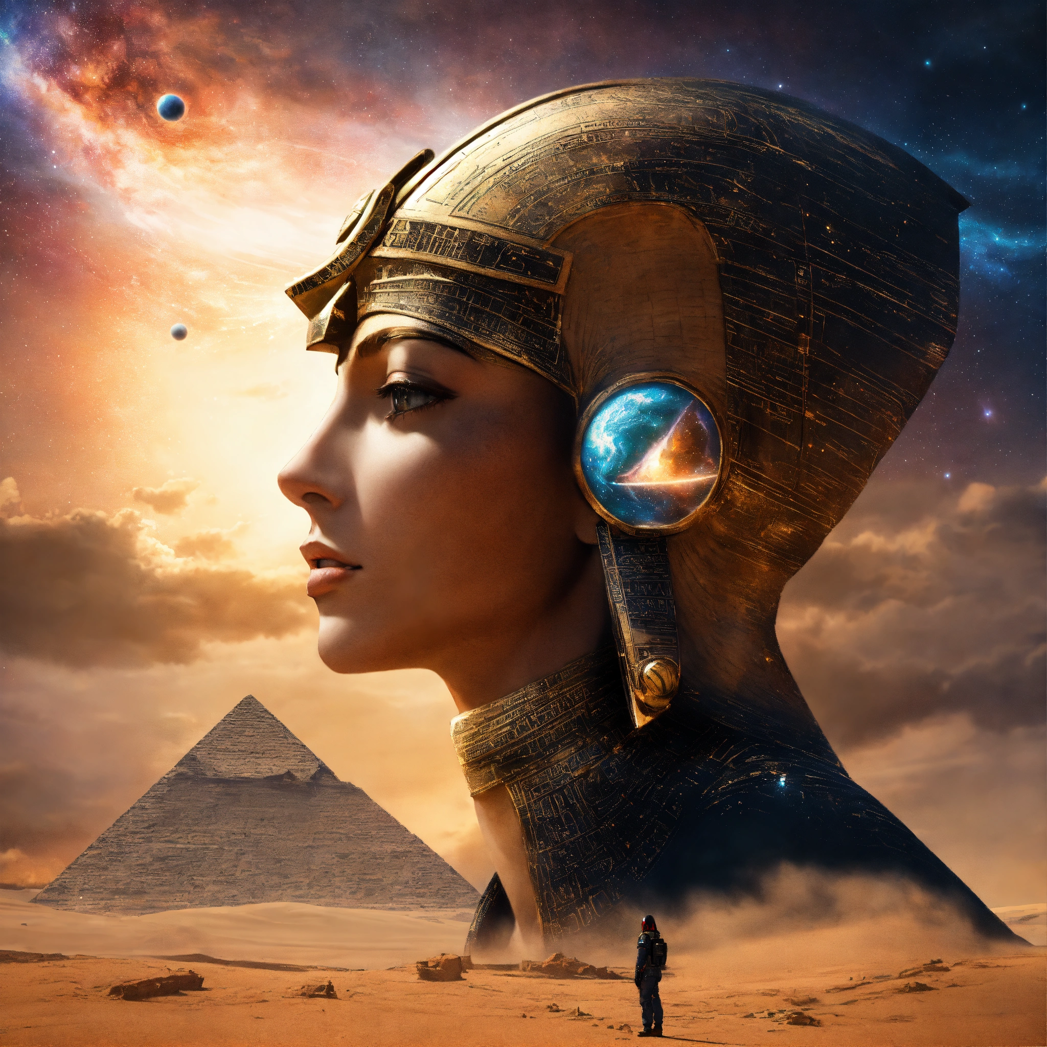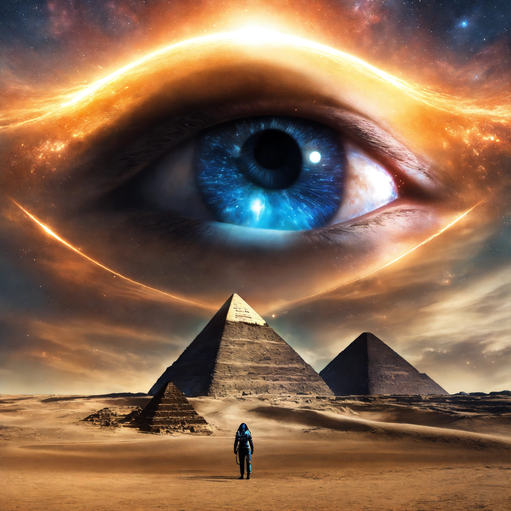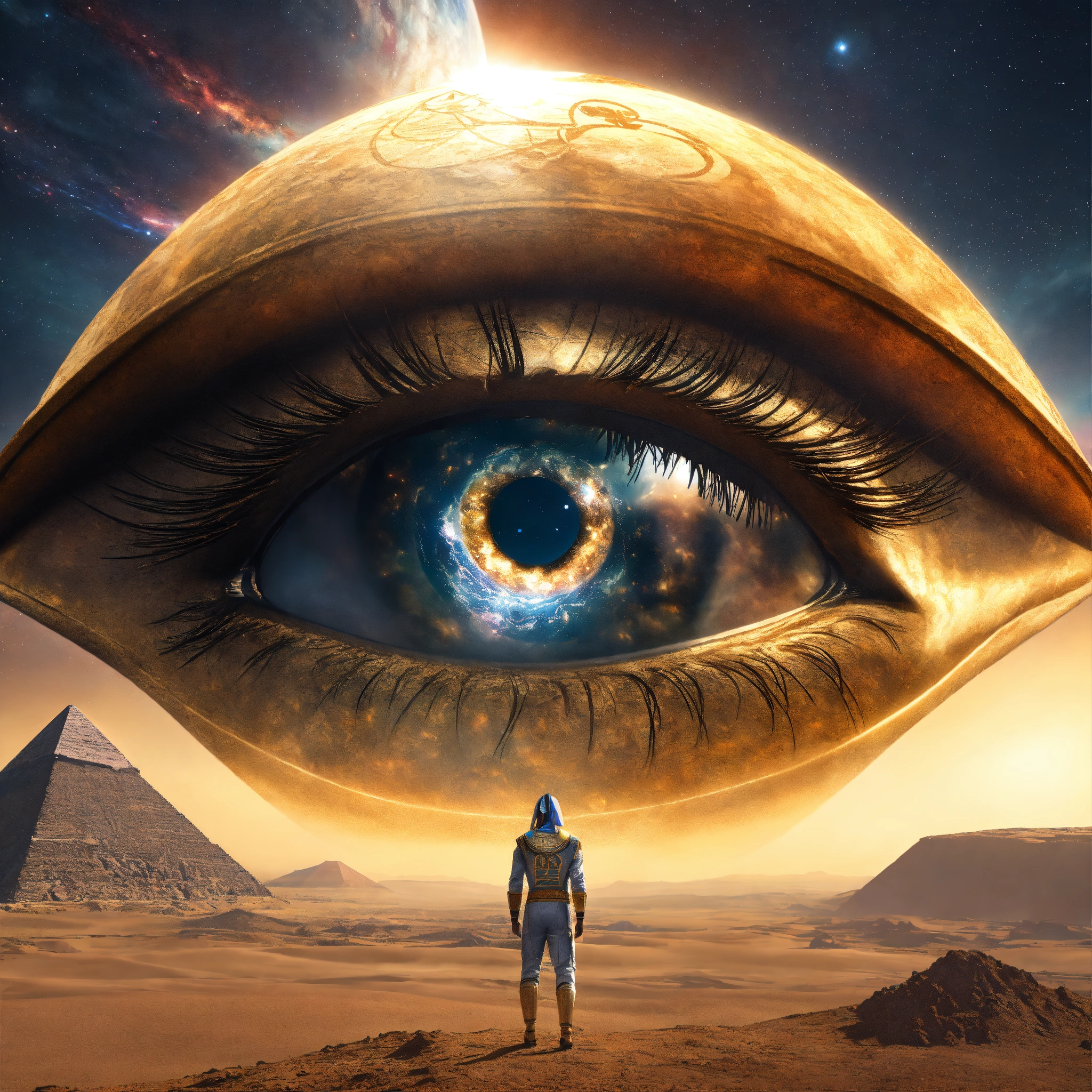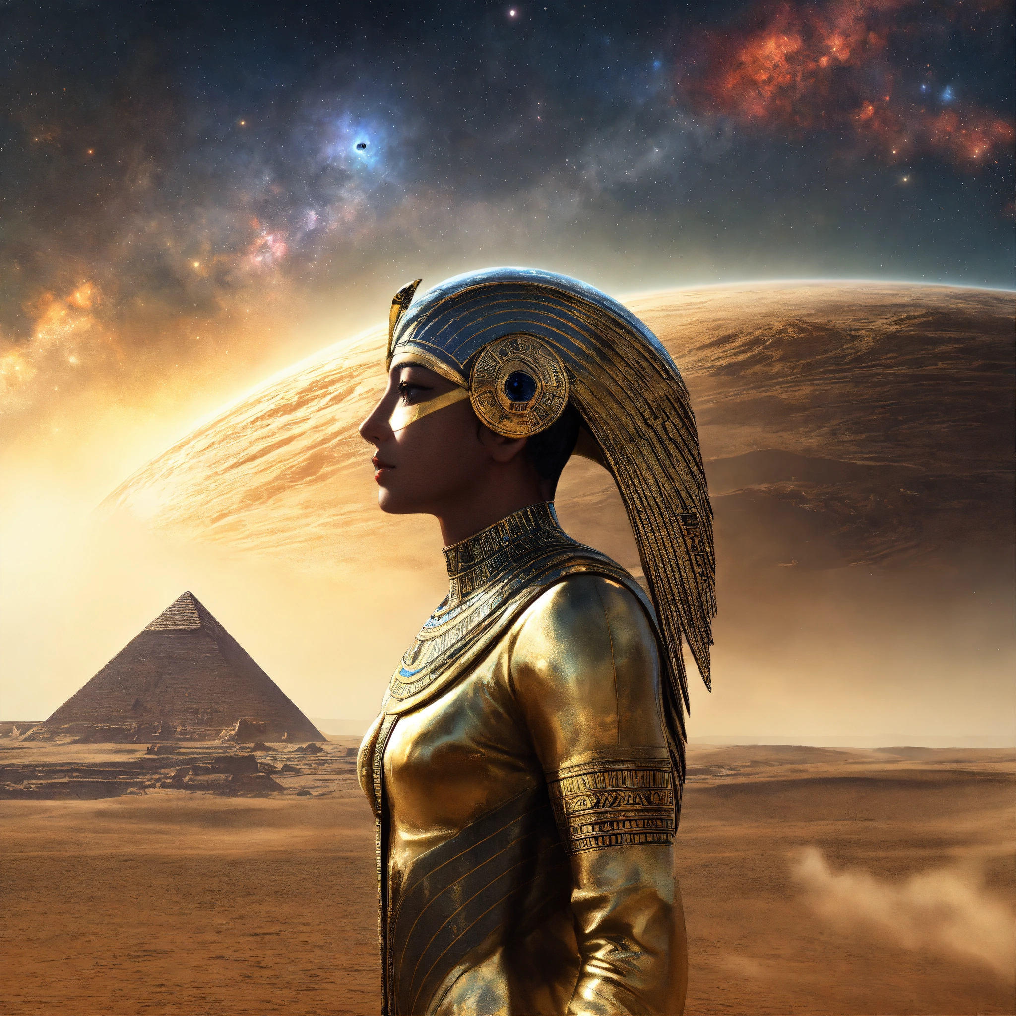 Face in the wind hiding the face, full body, frontside, the eye of horus in sky, egyptian symbol, hyper realism, poetic, romantic, starship suit, realistic shading, realistic render, detailed textures, photorealistic, wide shot, space nebula landscape