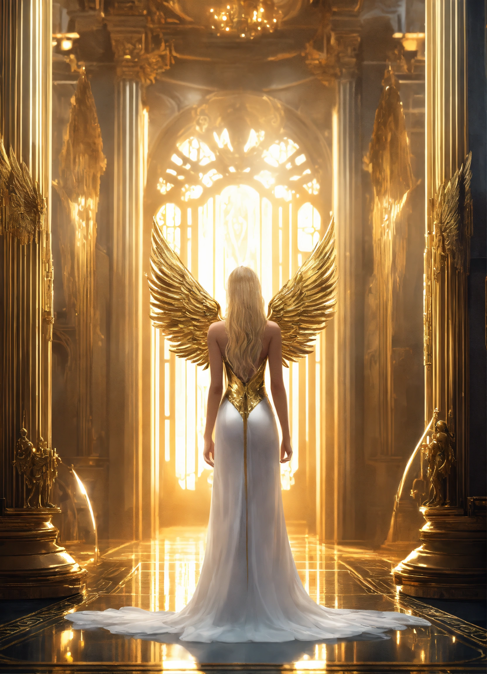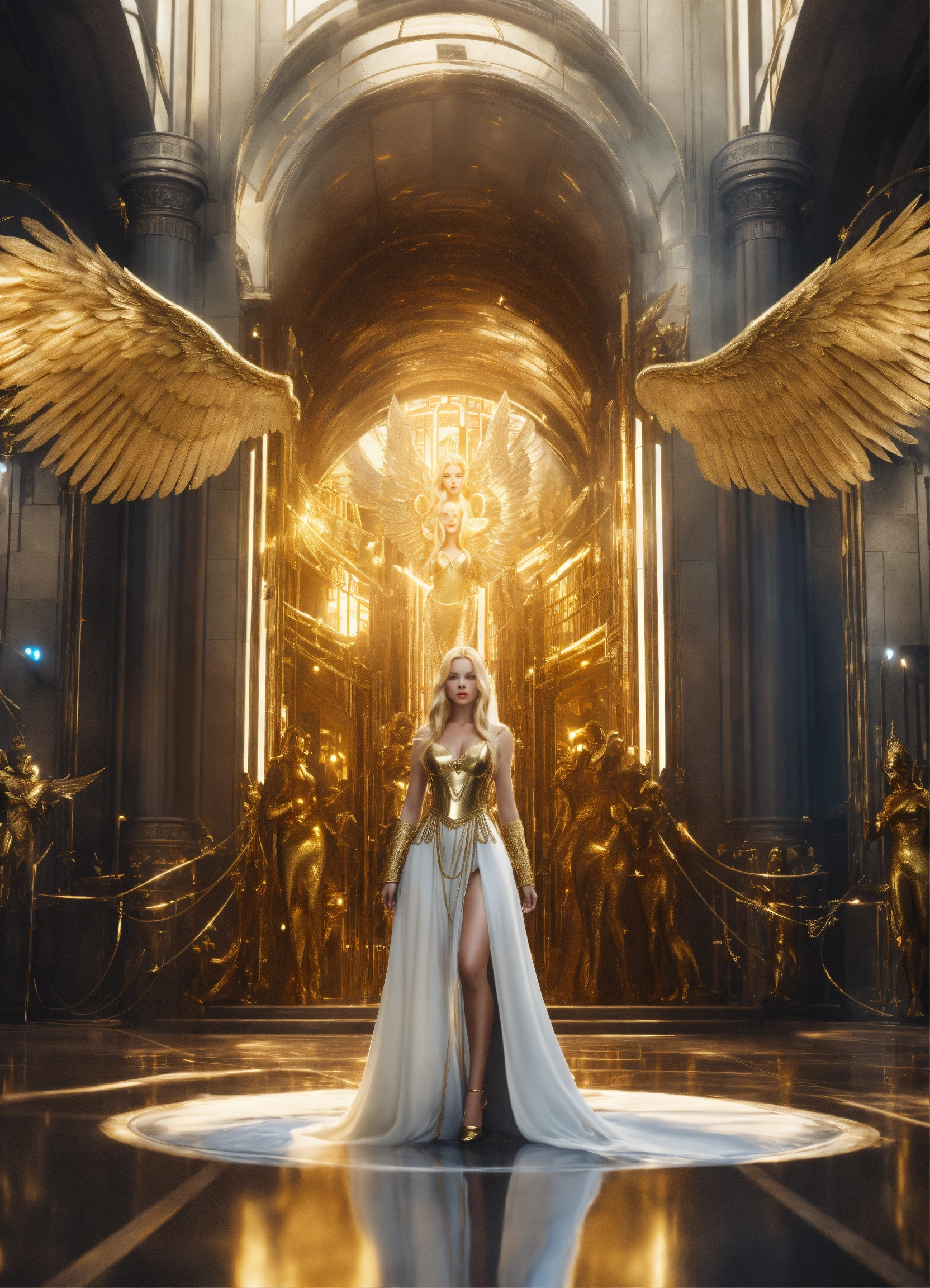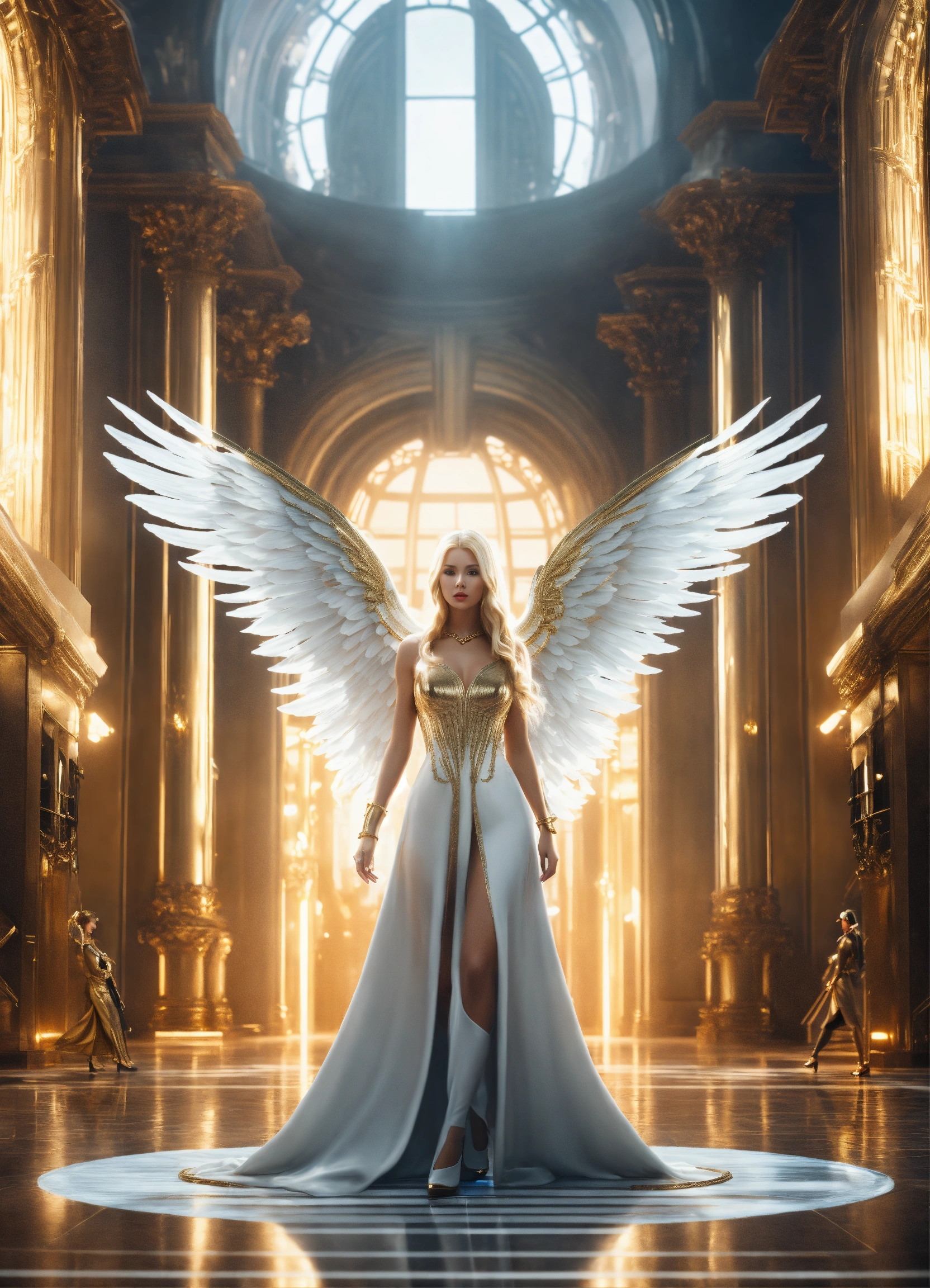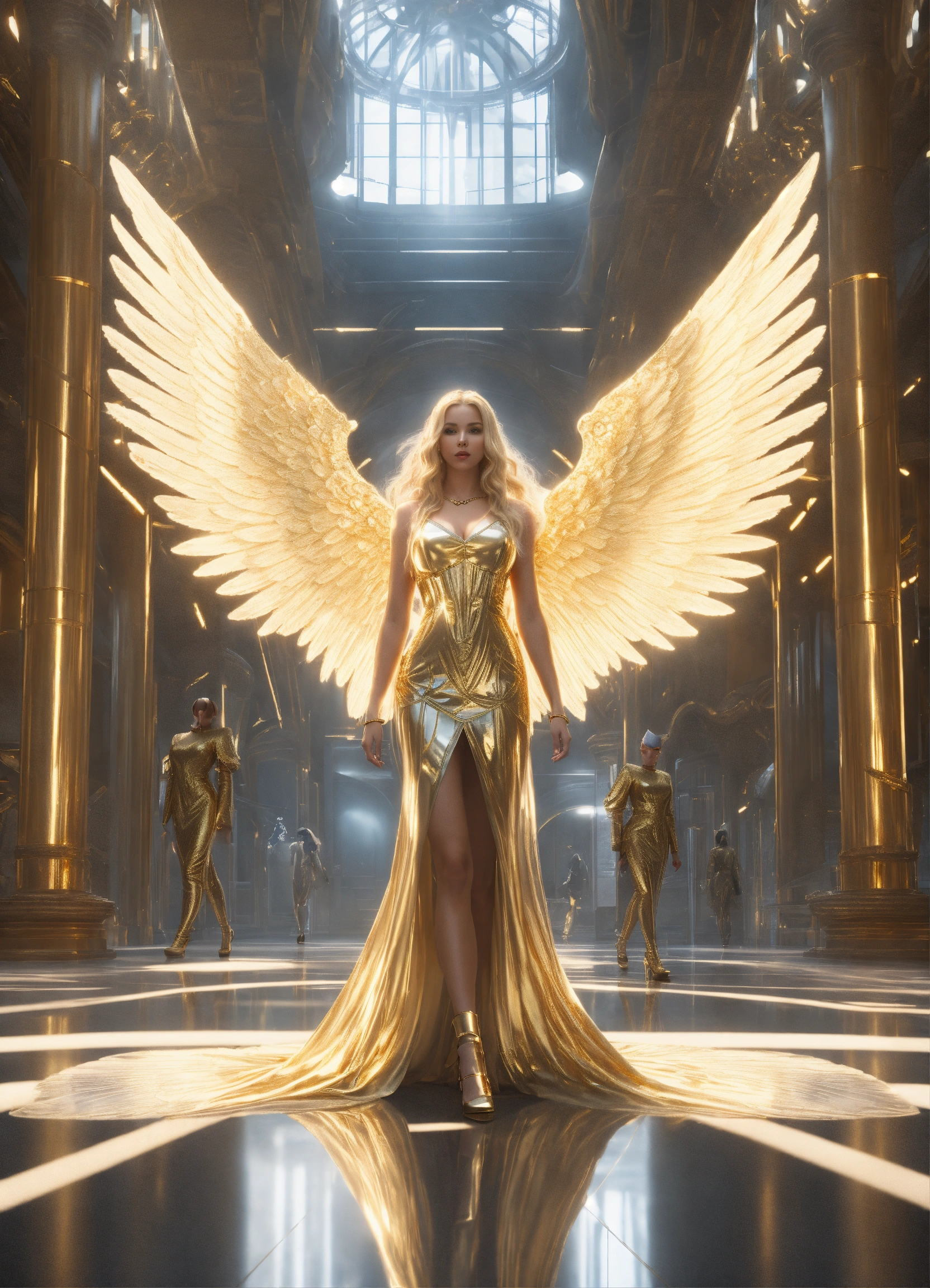 Handcuffed, a beautiful white blonde girl angel goddess, a beautiful goddess with long blonde hair hour-glass figure angel wings wearing a gold dress, walking in a futuristic palace with guards and evil scientists in the background, resolution 8k, insanely detailed