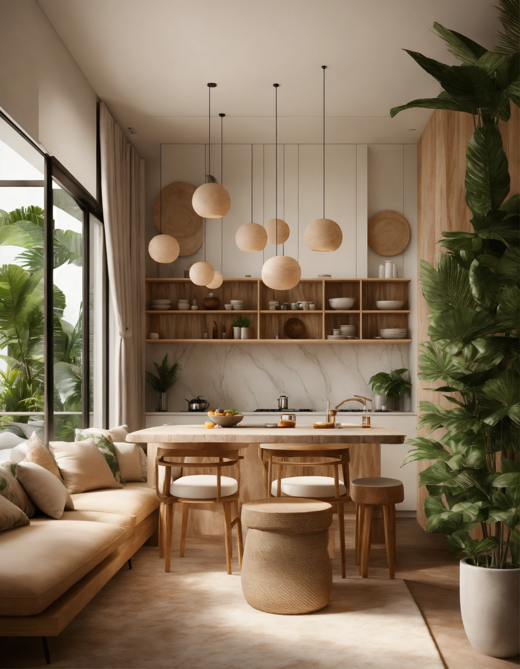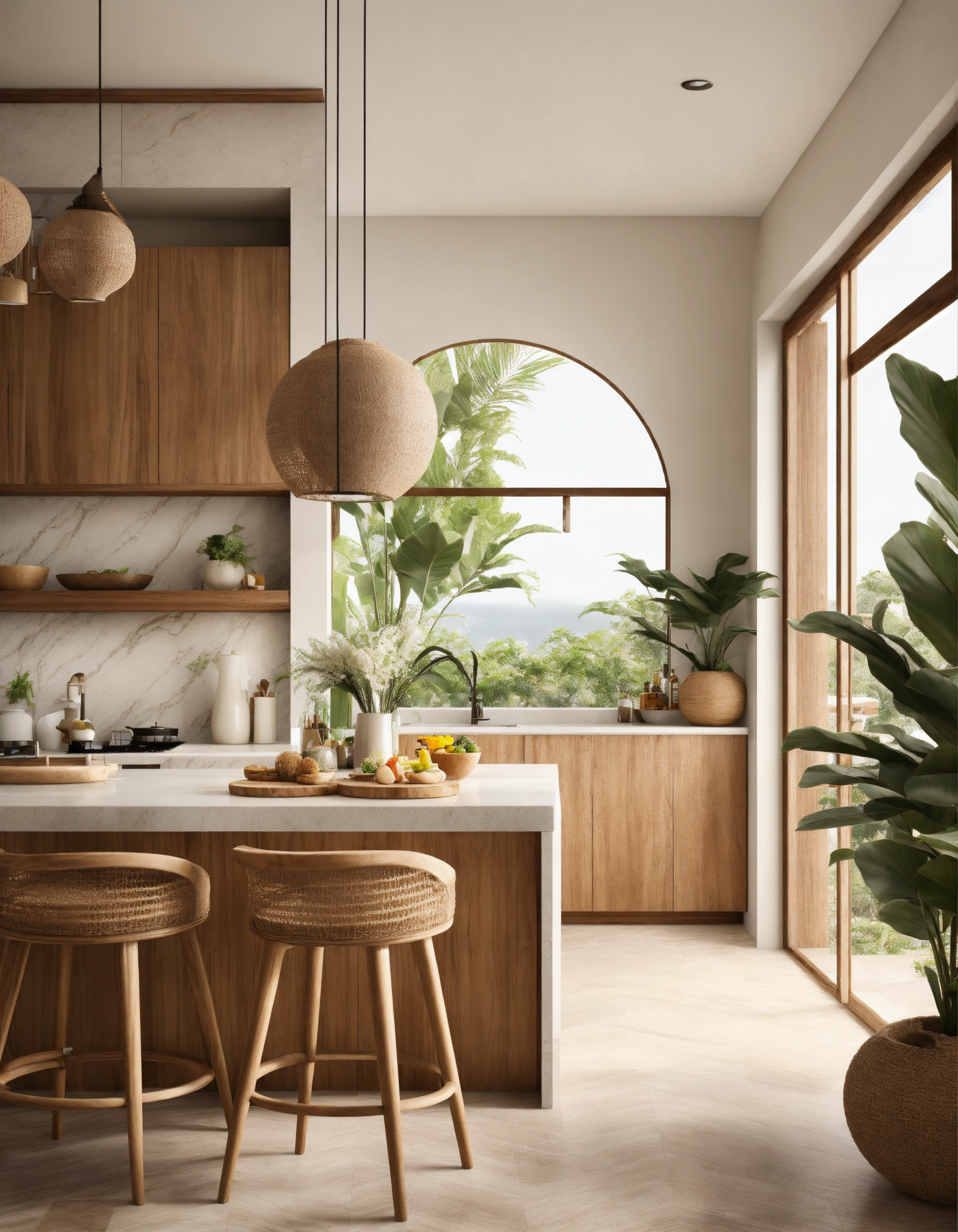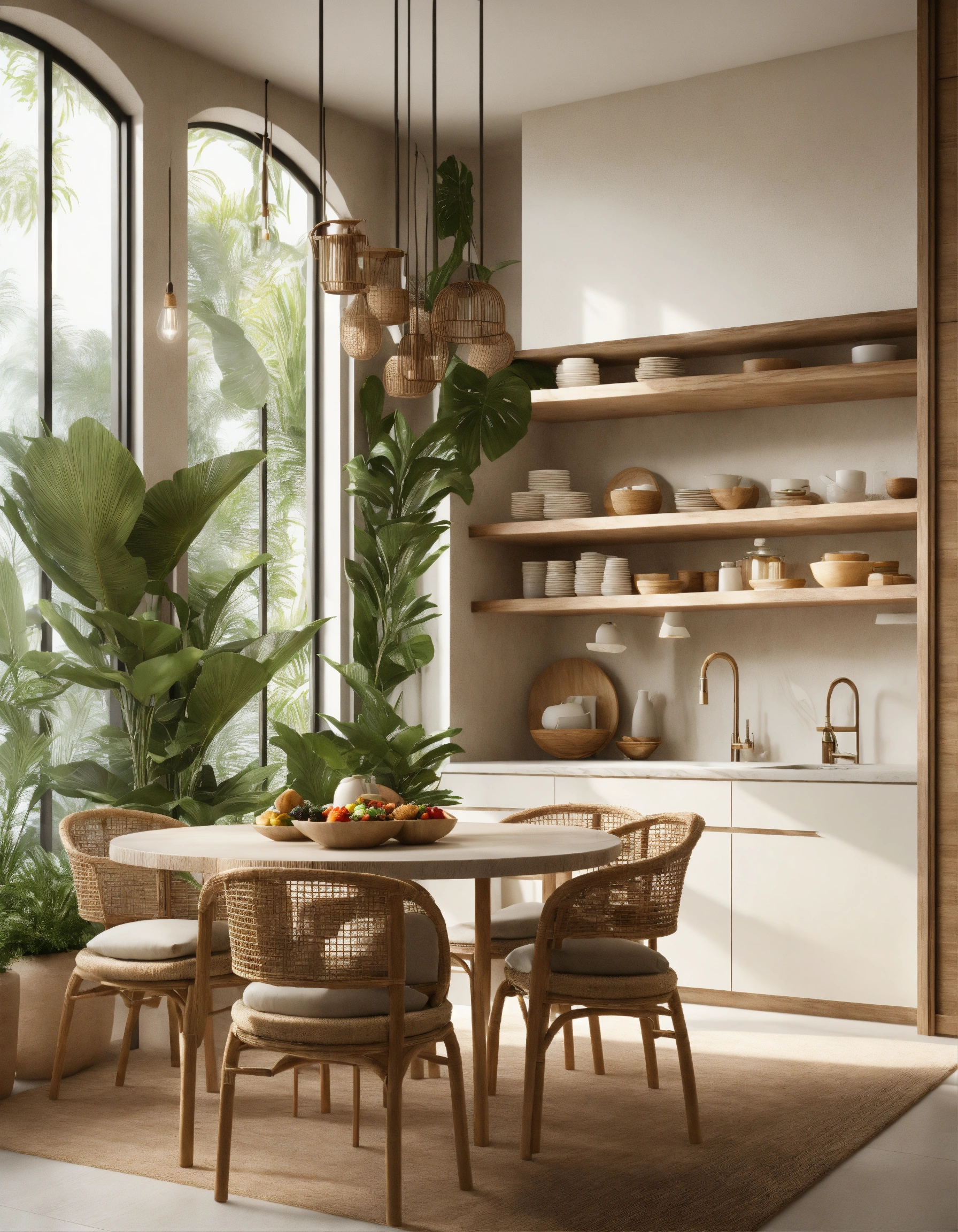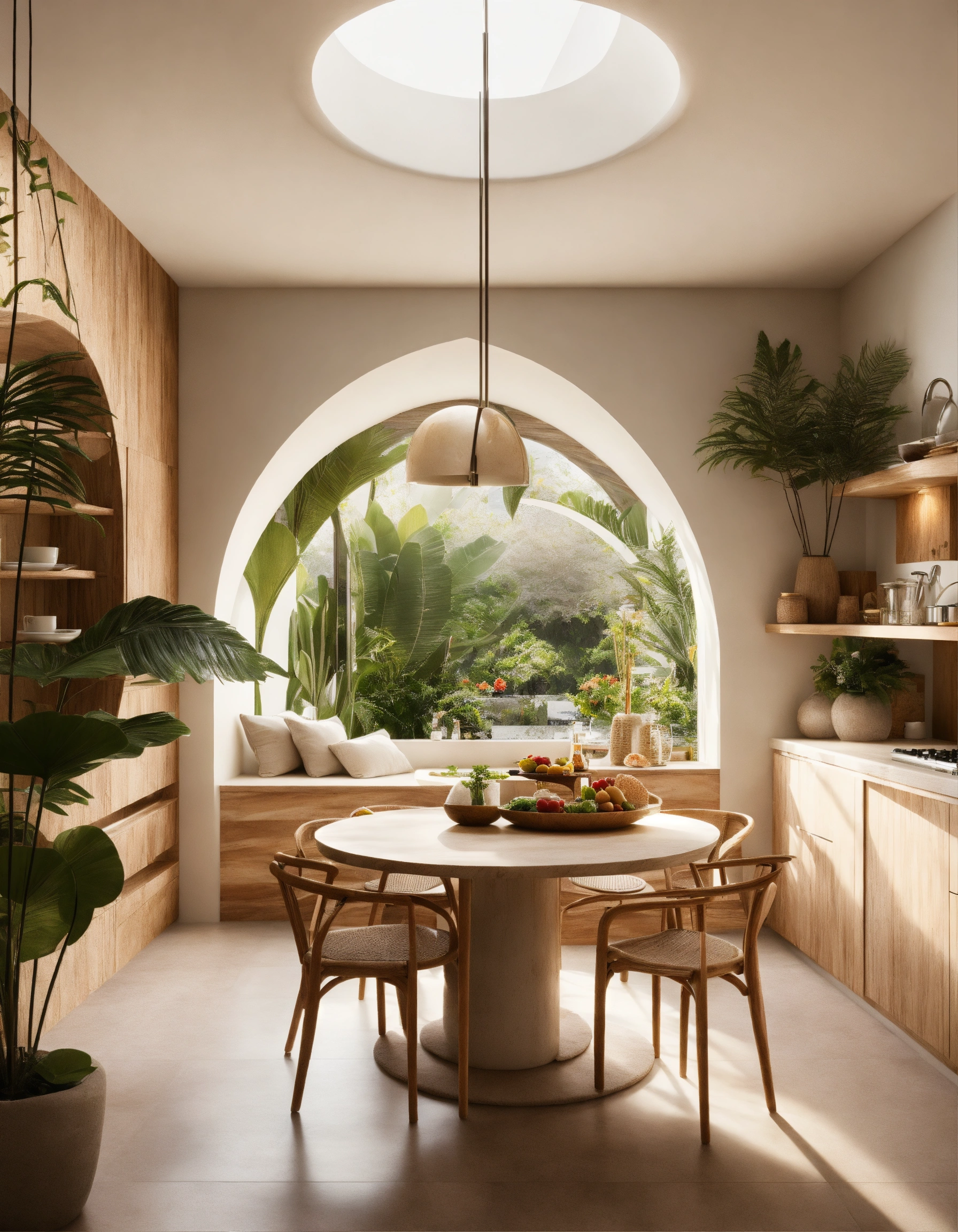 Ultra realistic photo of modern take on upscale bali inspired small condo white cream stone, light wood round arches interor view of kitchen with breakfast table and shelving with tropical foliage