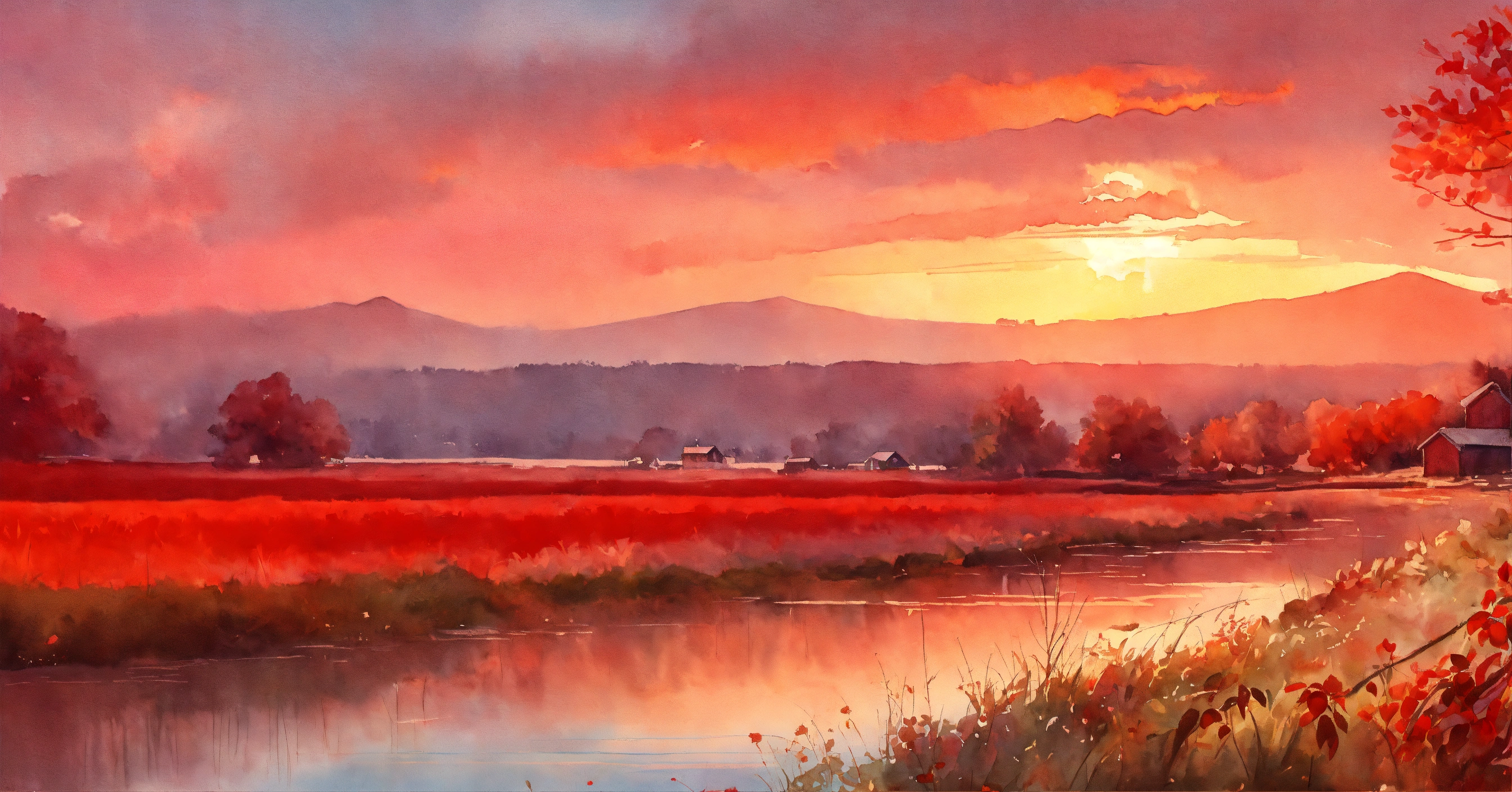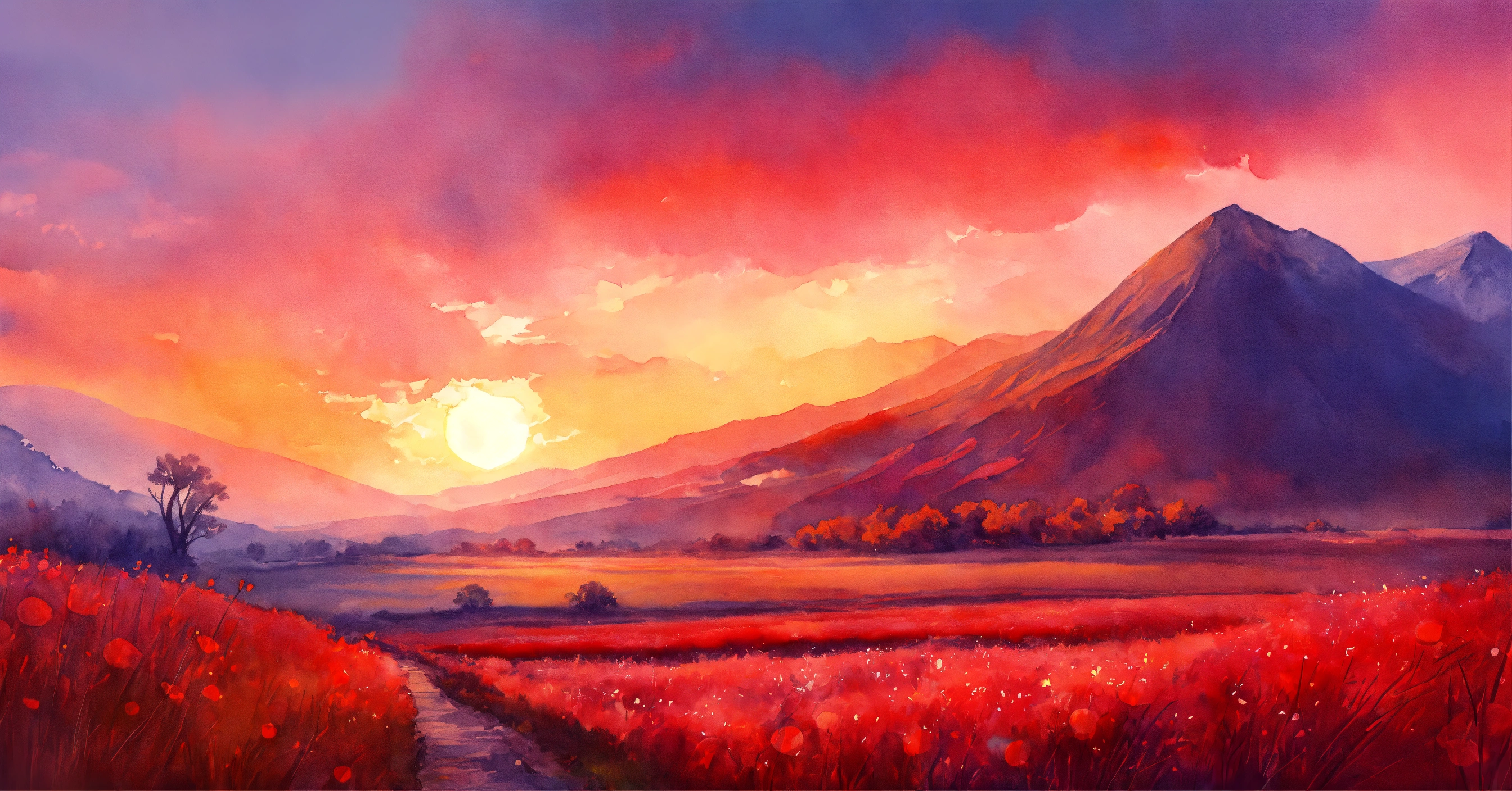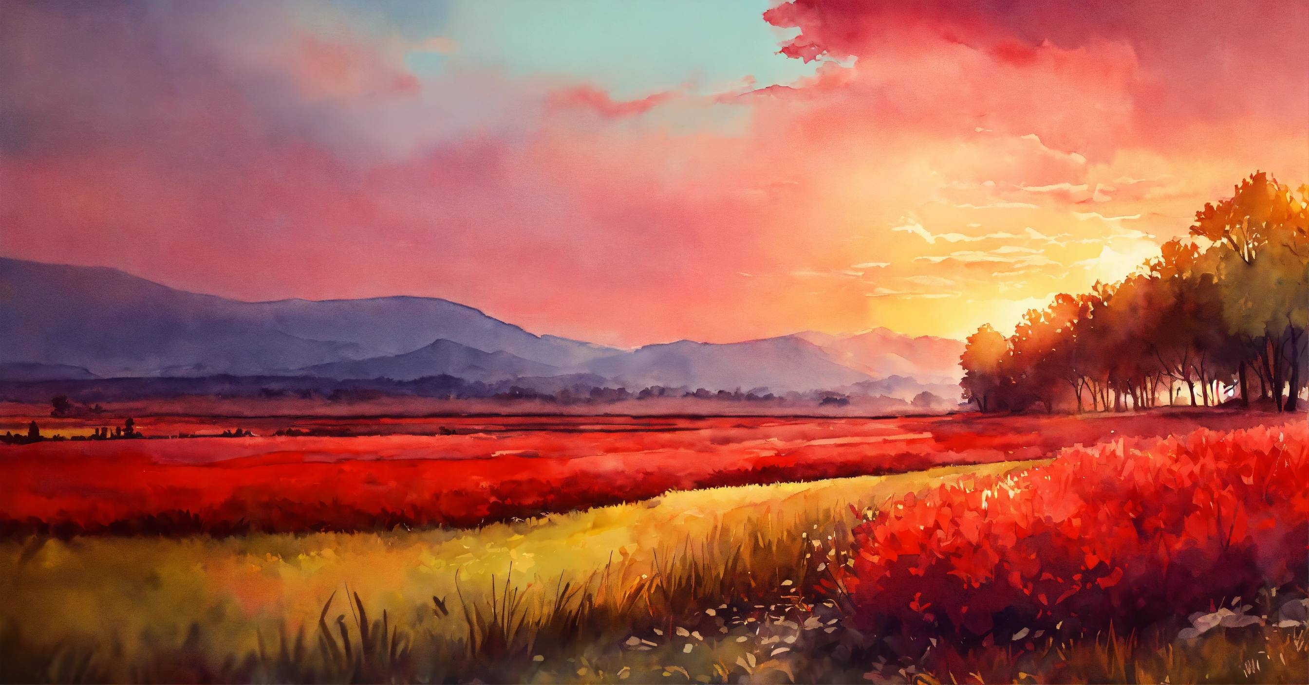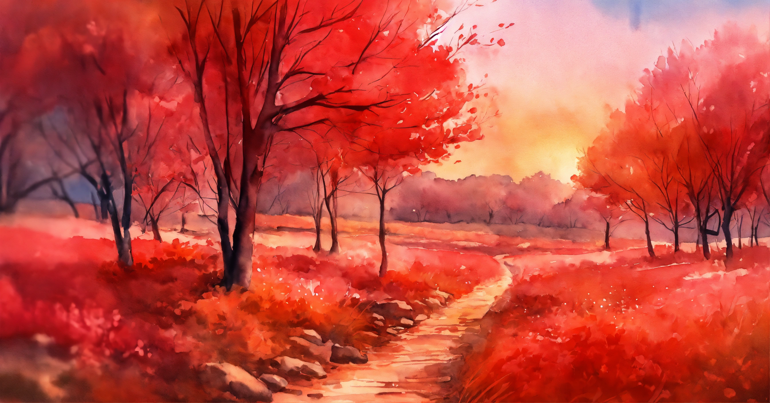 Stunning beautiful random red landscape in watercolor style, intricated detail, fine detail, ambience light, perfect composition, beautiful landscape, pastel colors, bright, vivid, colorful, perfect arwork, trending on artstation