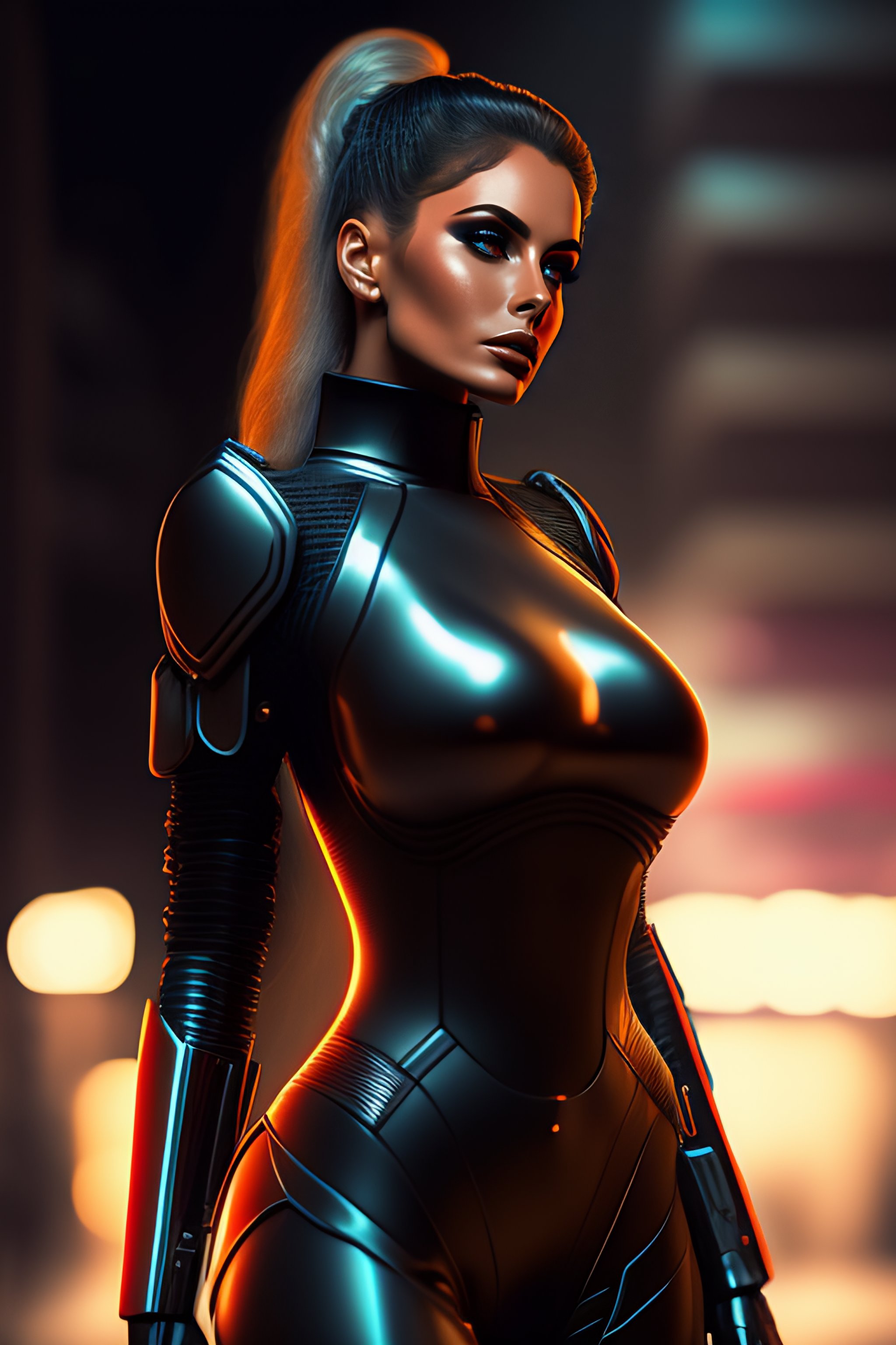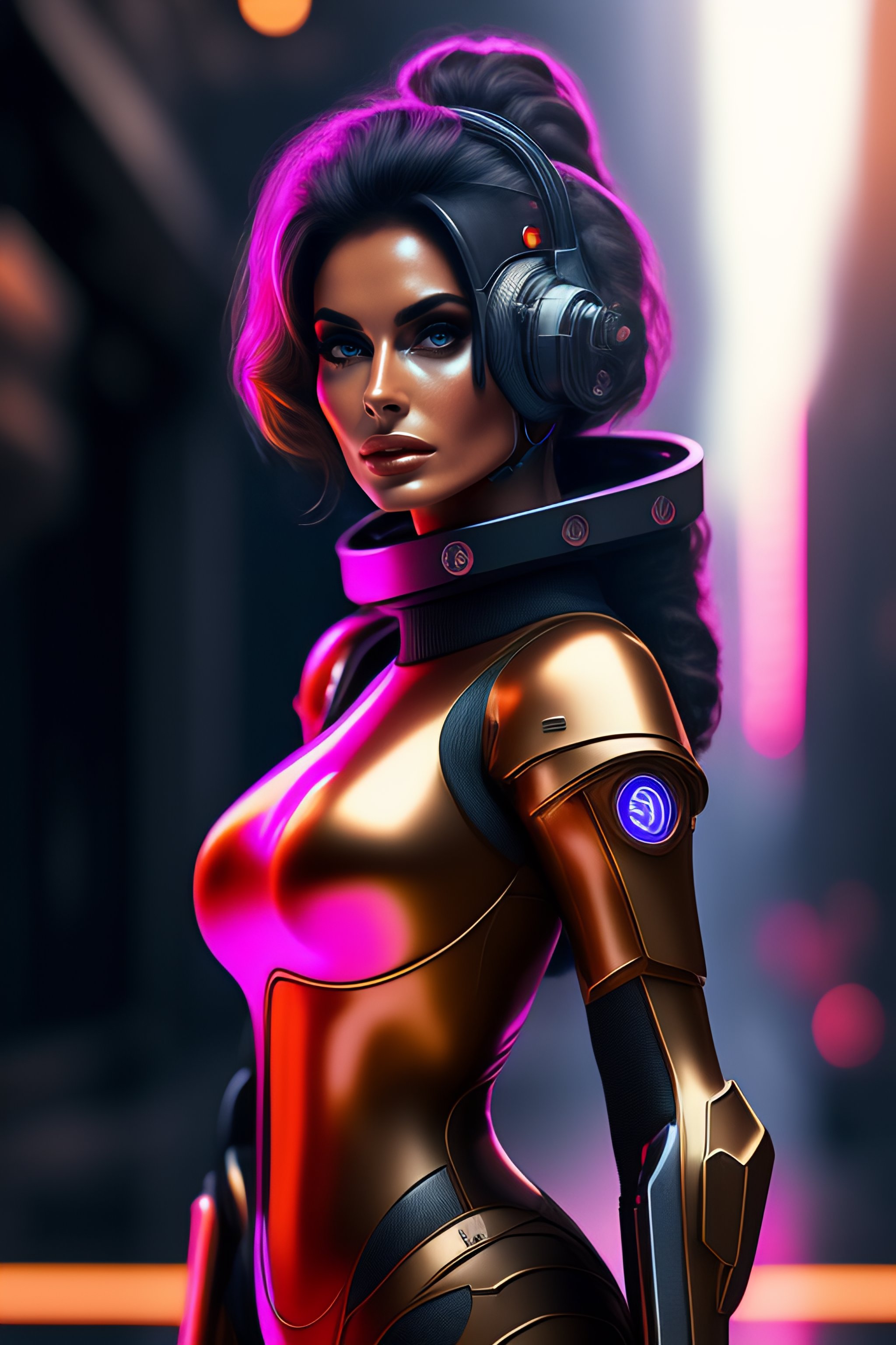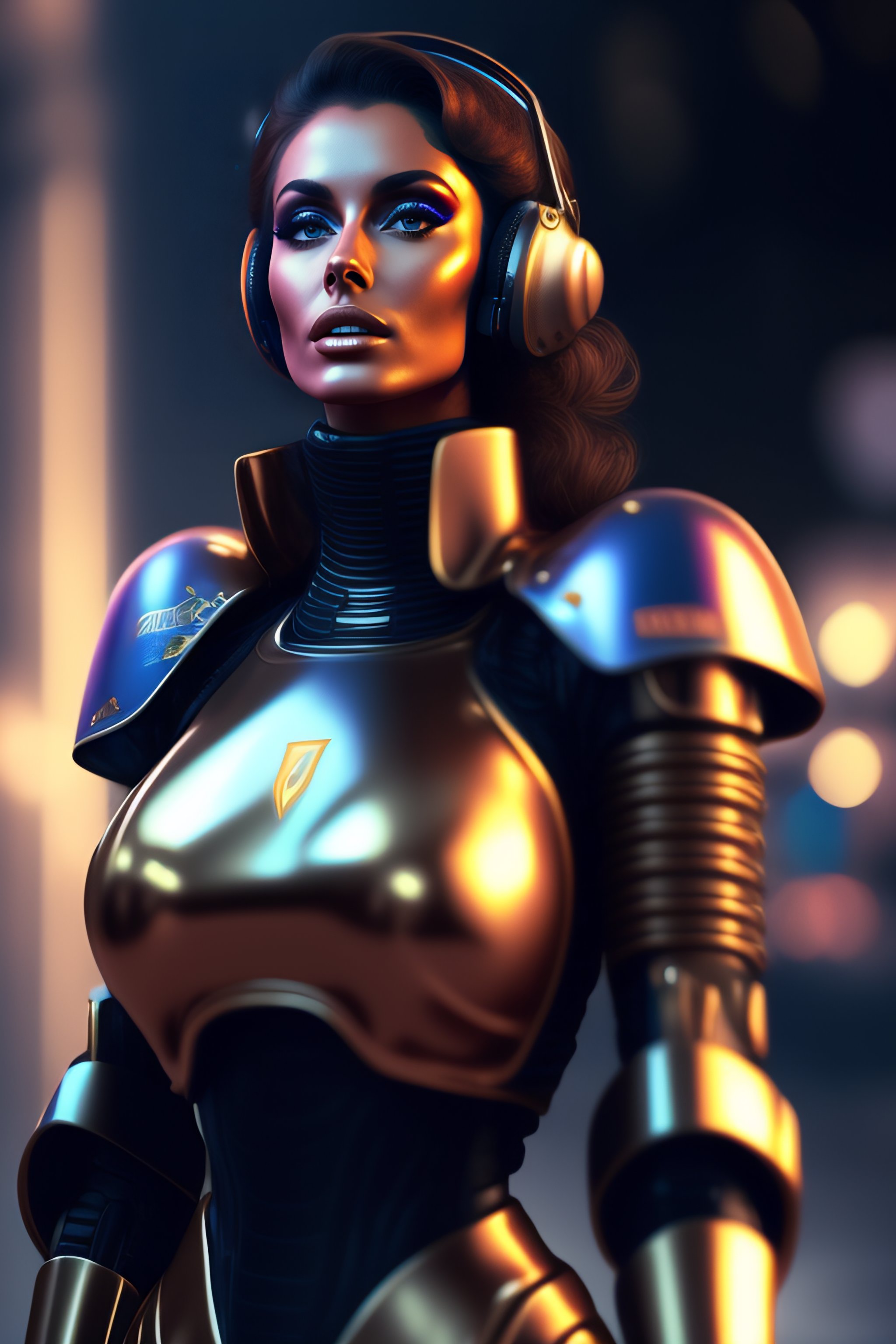 Female sofia loren robot solder, tactical armor, rifle, neon, movie still, cyberpunk, photo realism, ultra detailed, plain background, future