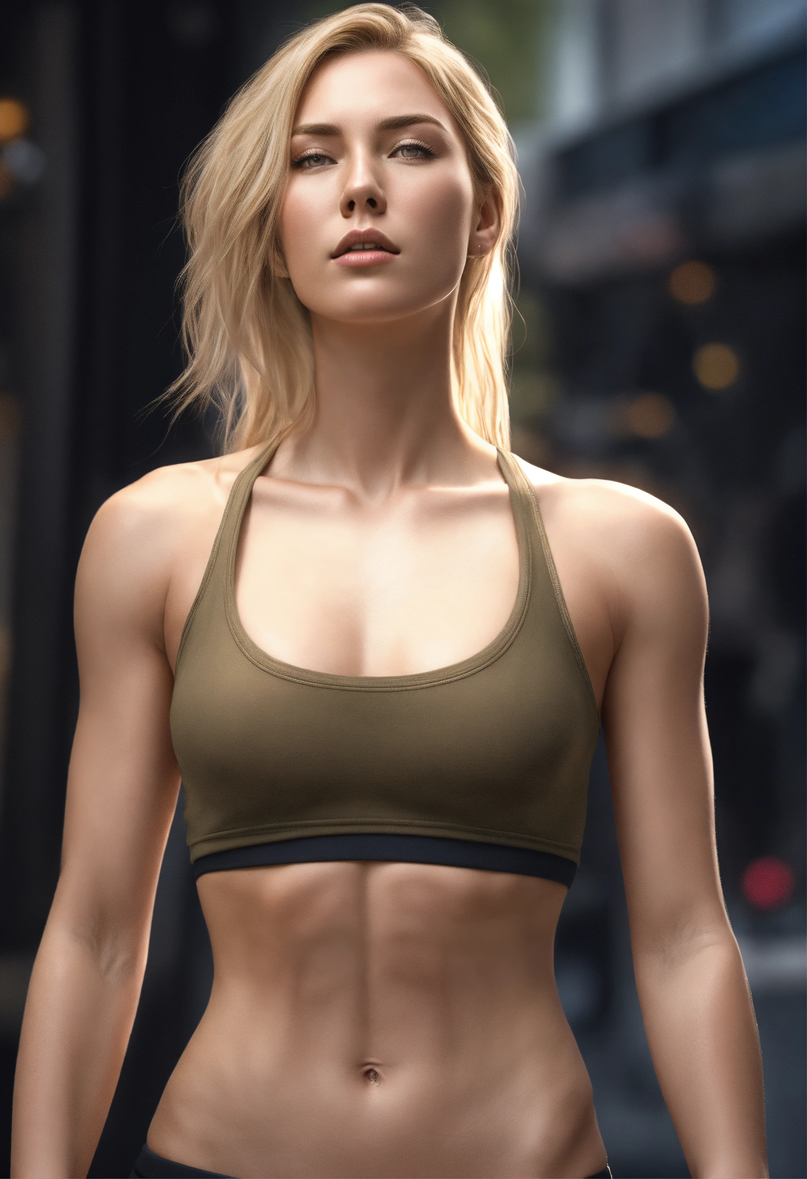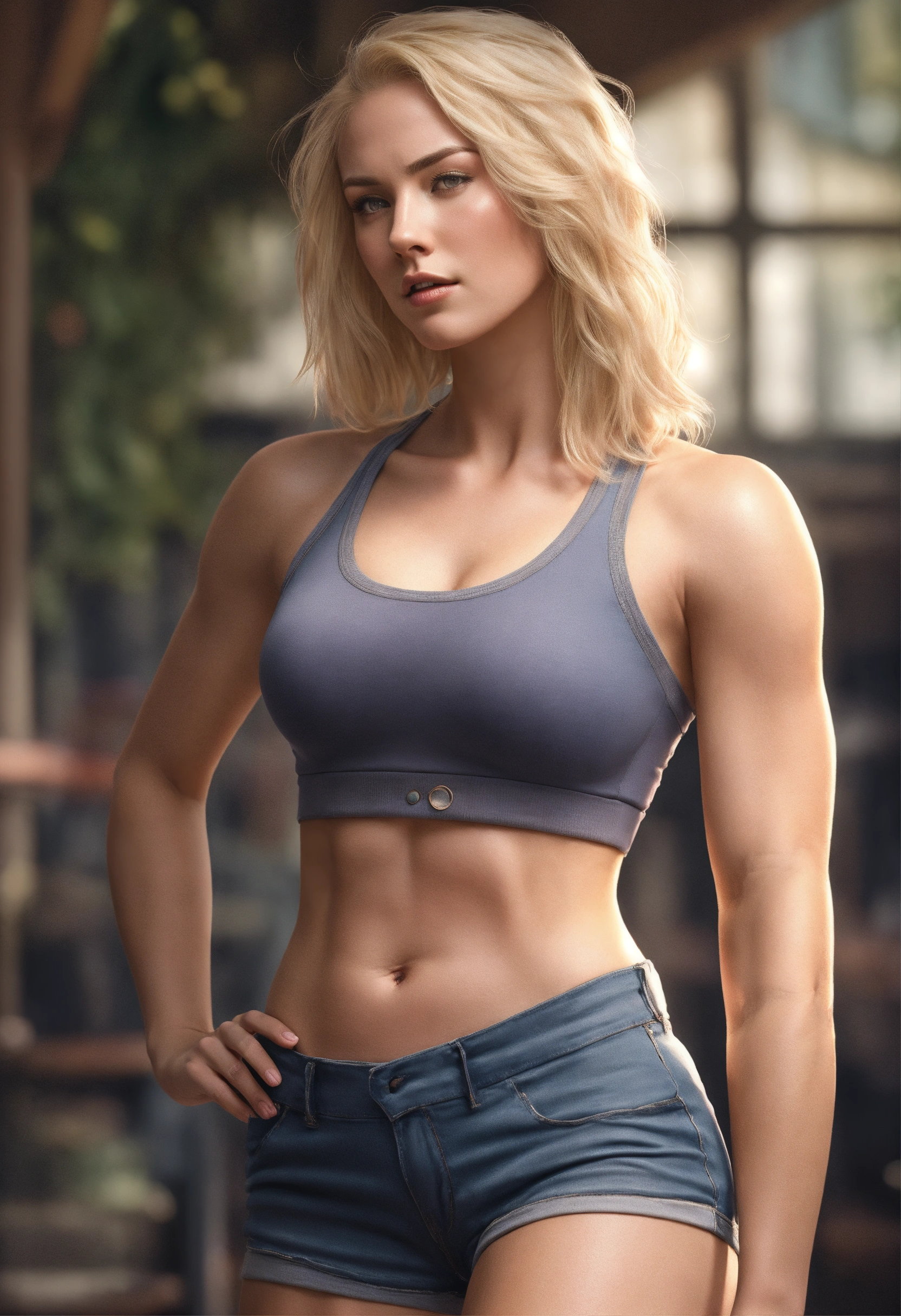 Full body potrait of beautiful faced tall woman with high cheekbones, pale skin, blonde hair, muscular midriff in pain, illustration, hyper realistic, highly detailed, digital photography, side glamor pose, 4k, hdr, smooth, sharp focus, high resolution, aspiring photographer, 8k, 3d