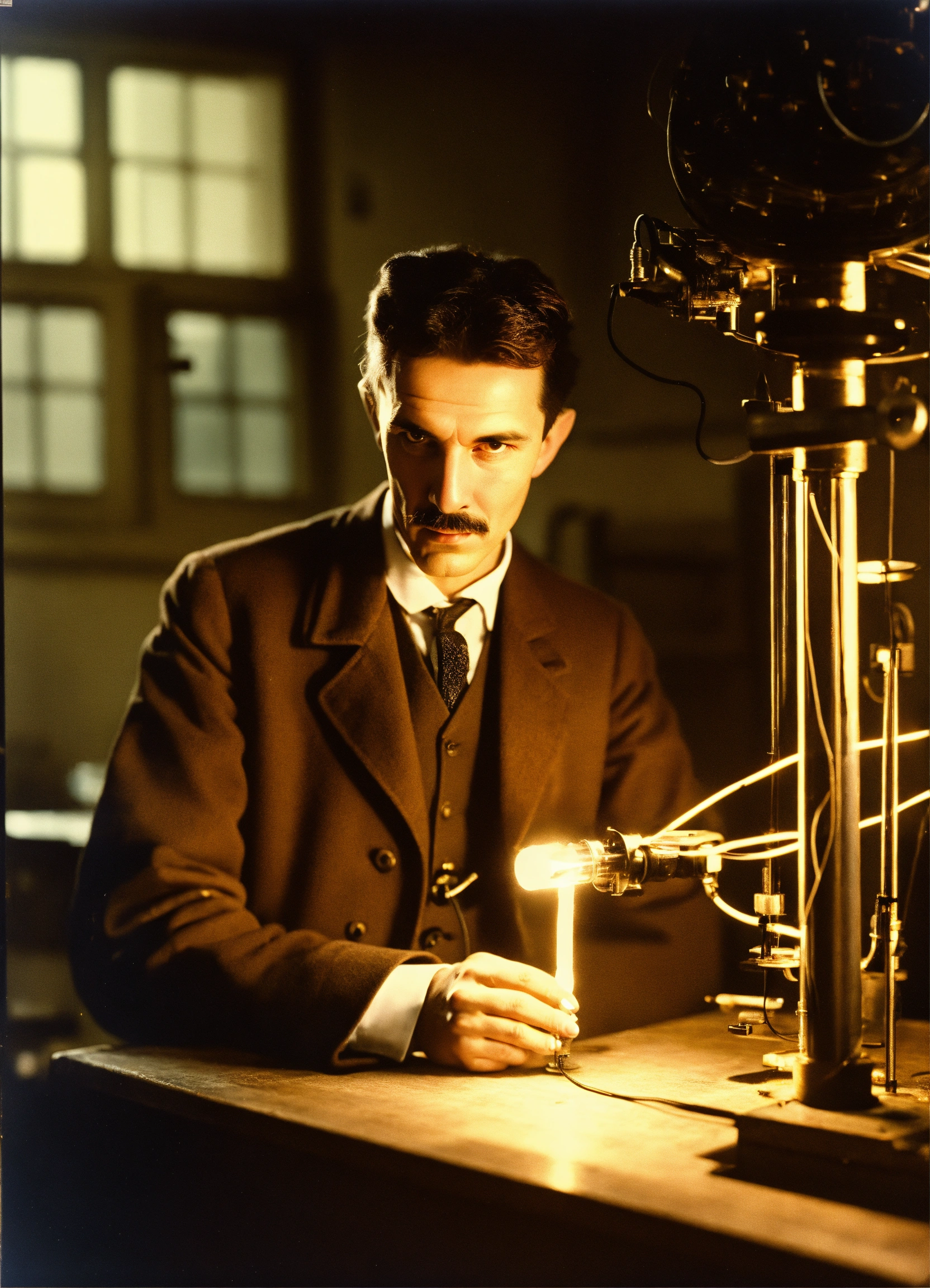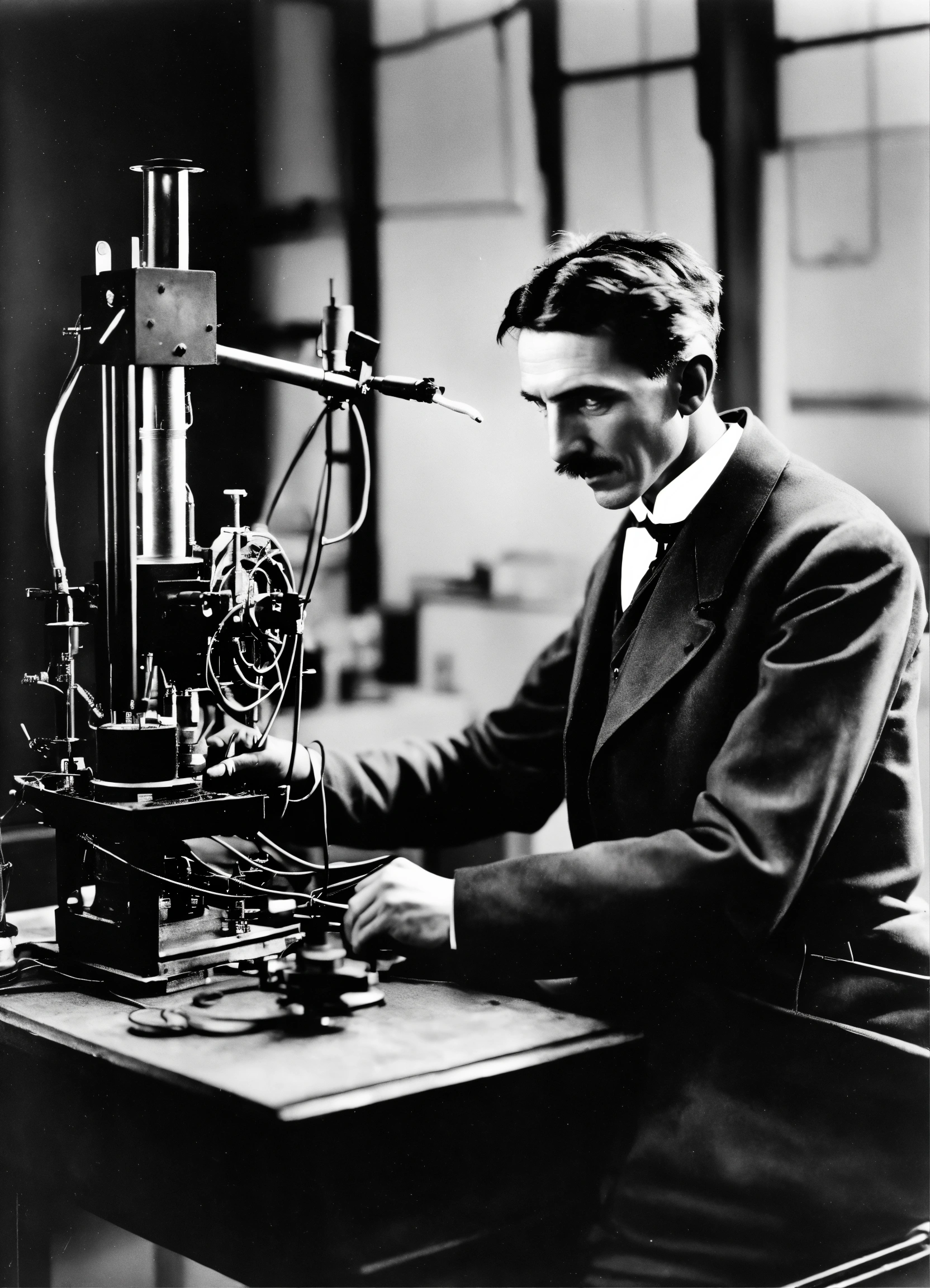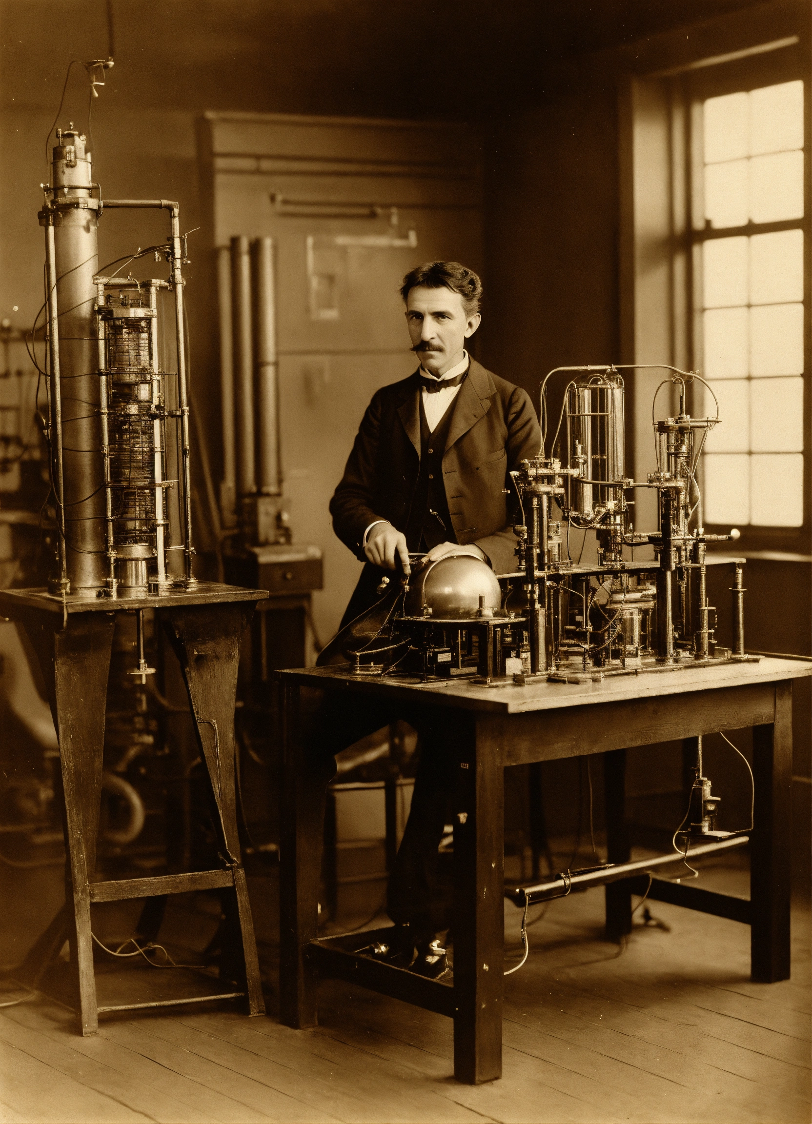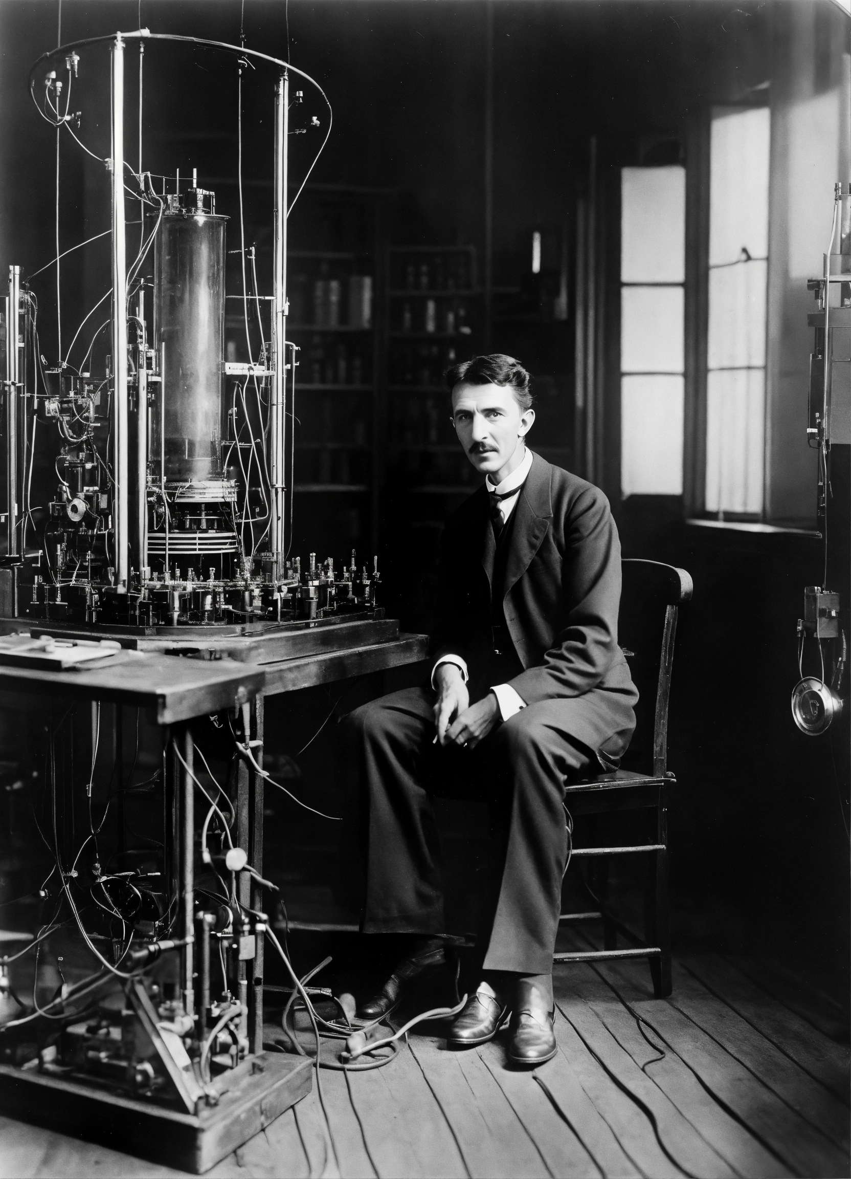 Nikola tesla en su laboratorio electrico, una bobina resonante de alto voltaje negativo con campo electrico con carga que apunta al centro y que abre un agujero de gusano al hiperespacio a través de las fórmulas "tiempo=2pi.r2" y "frecuencia=1/tiempo"