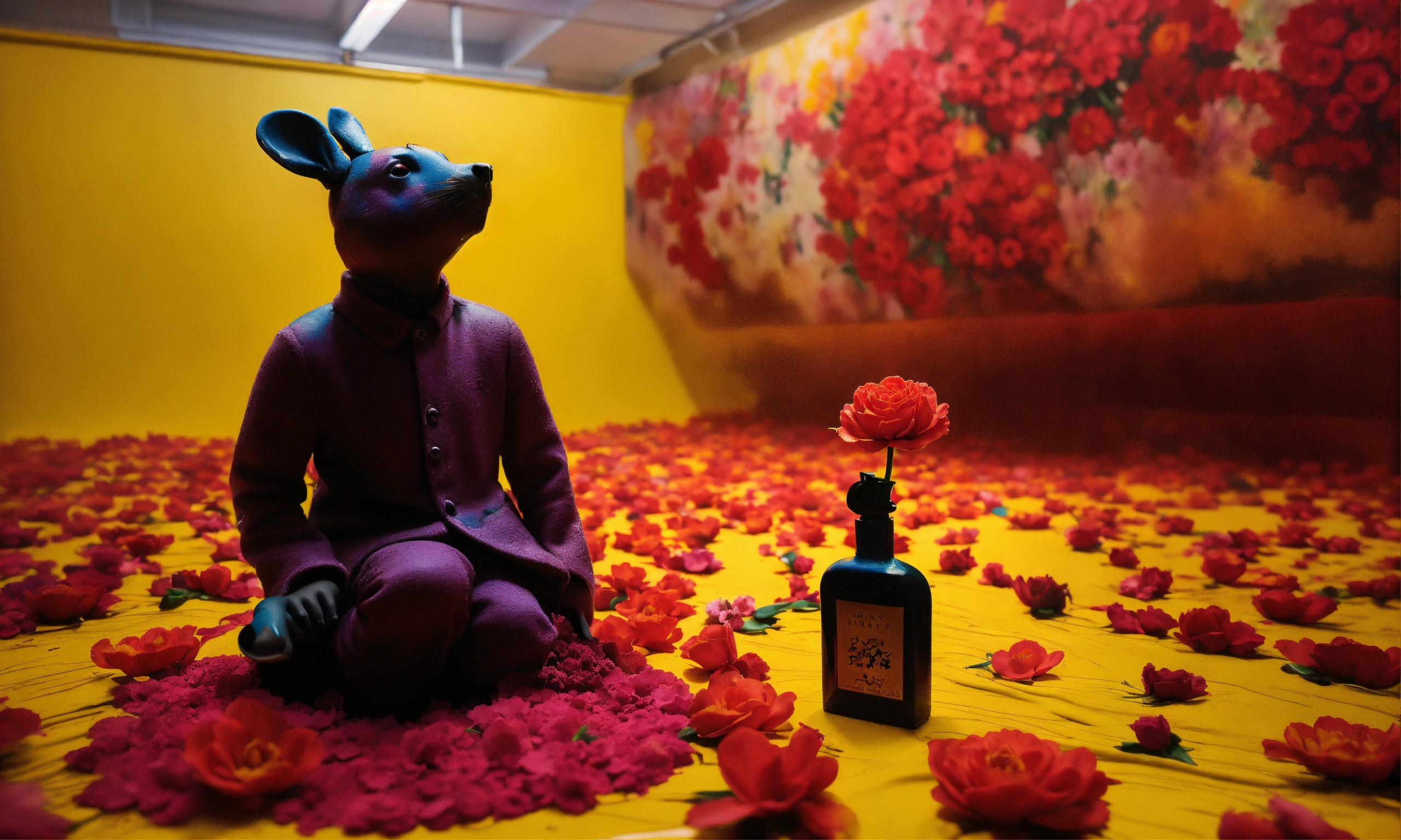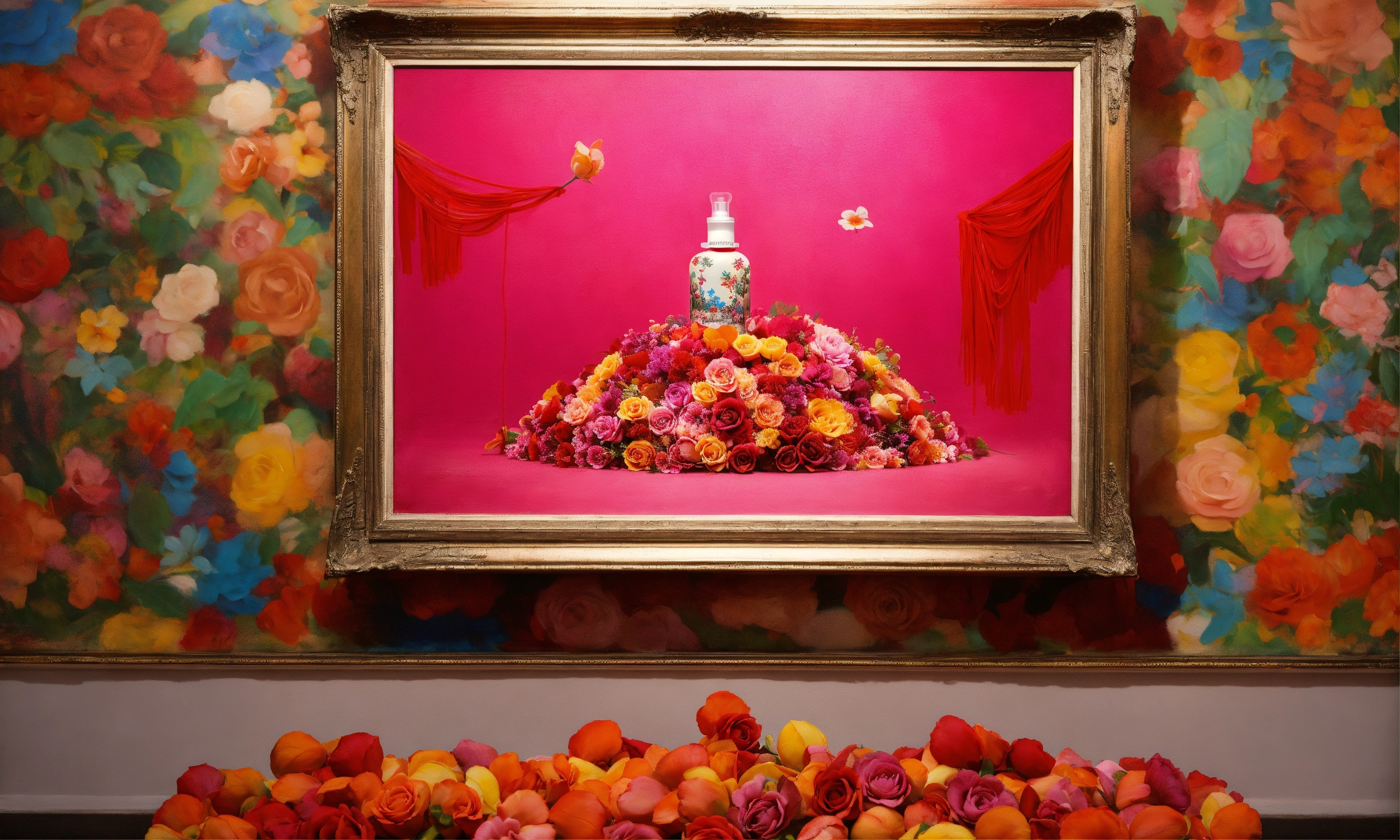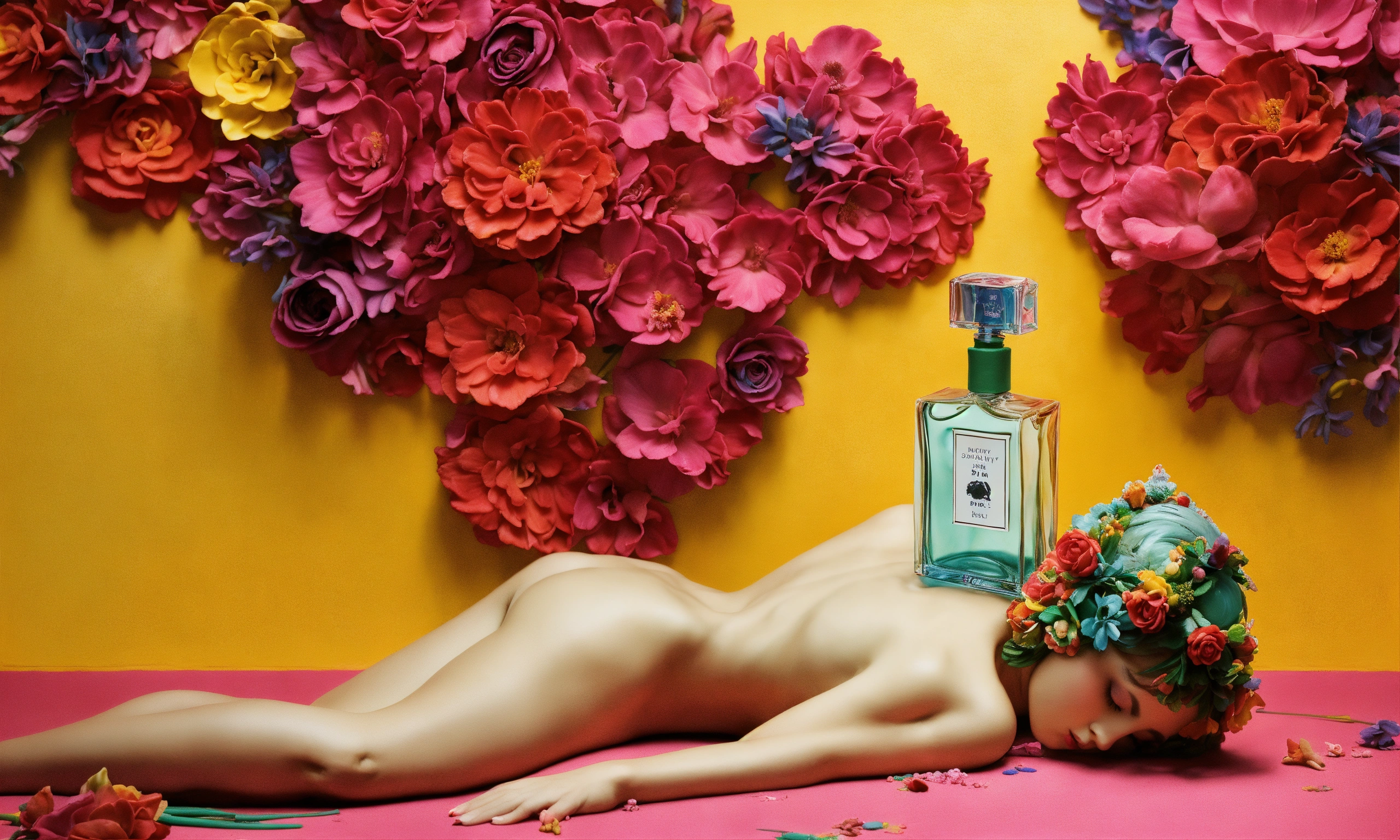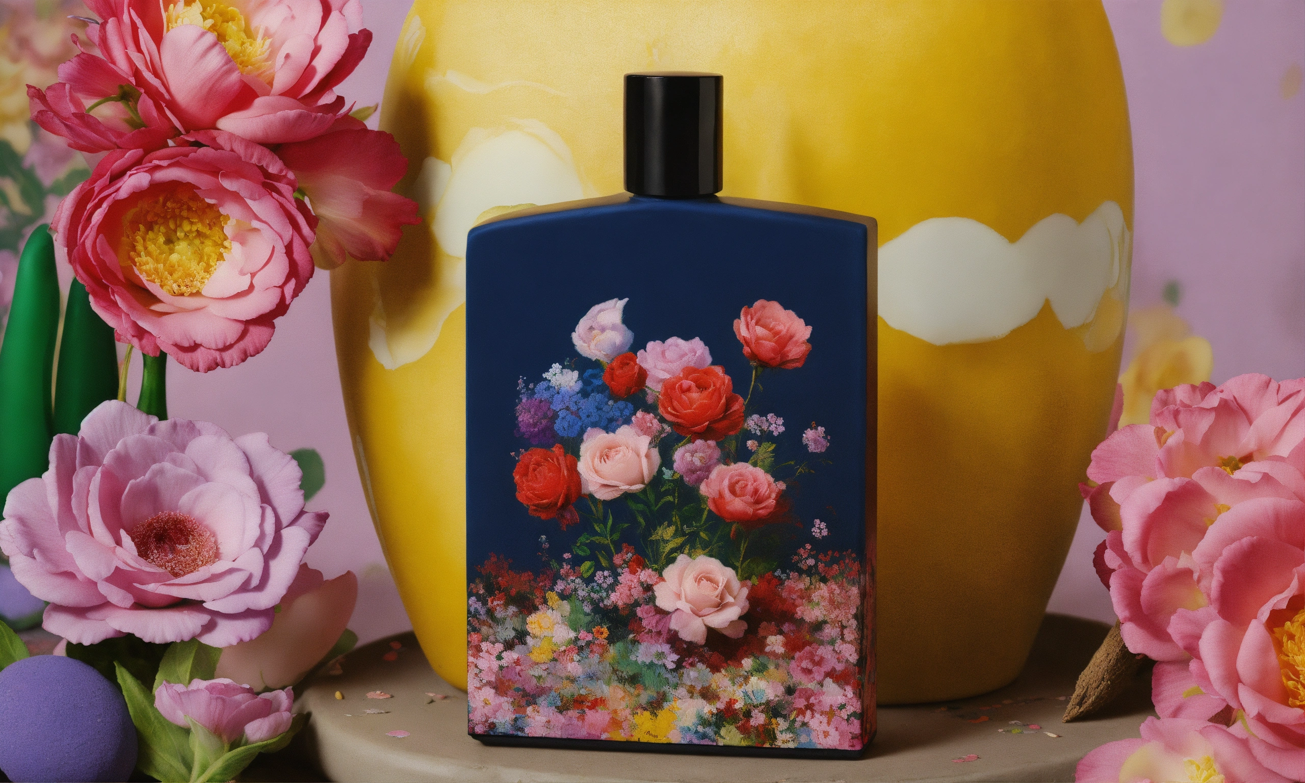 Photography made from modeling clay, floral-inspired fragrance bottle, paintings by banksy created under the influence of lsd.