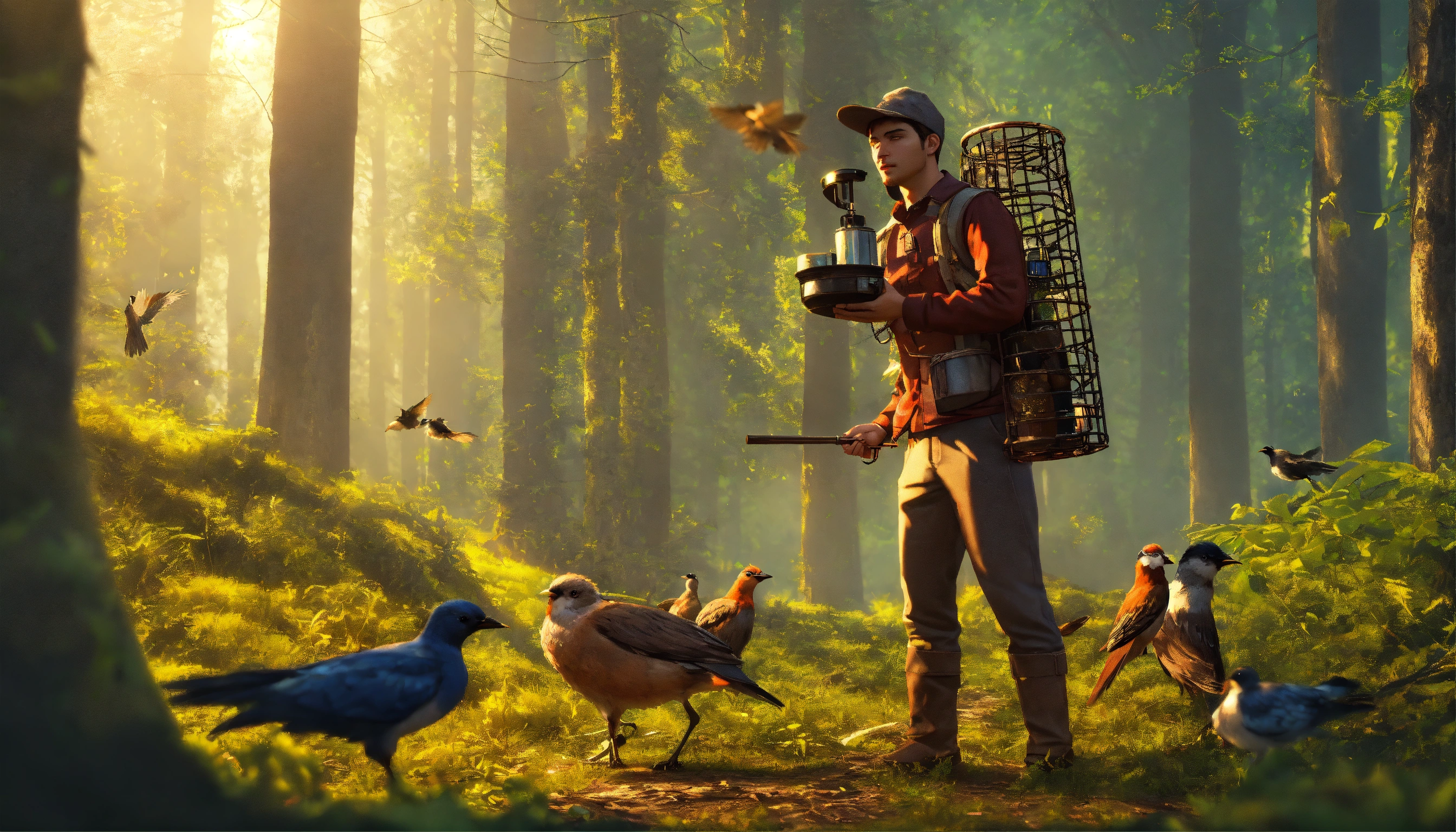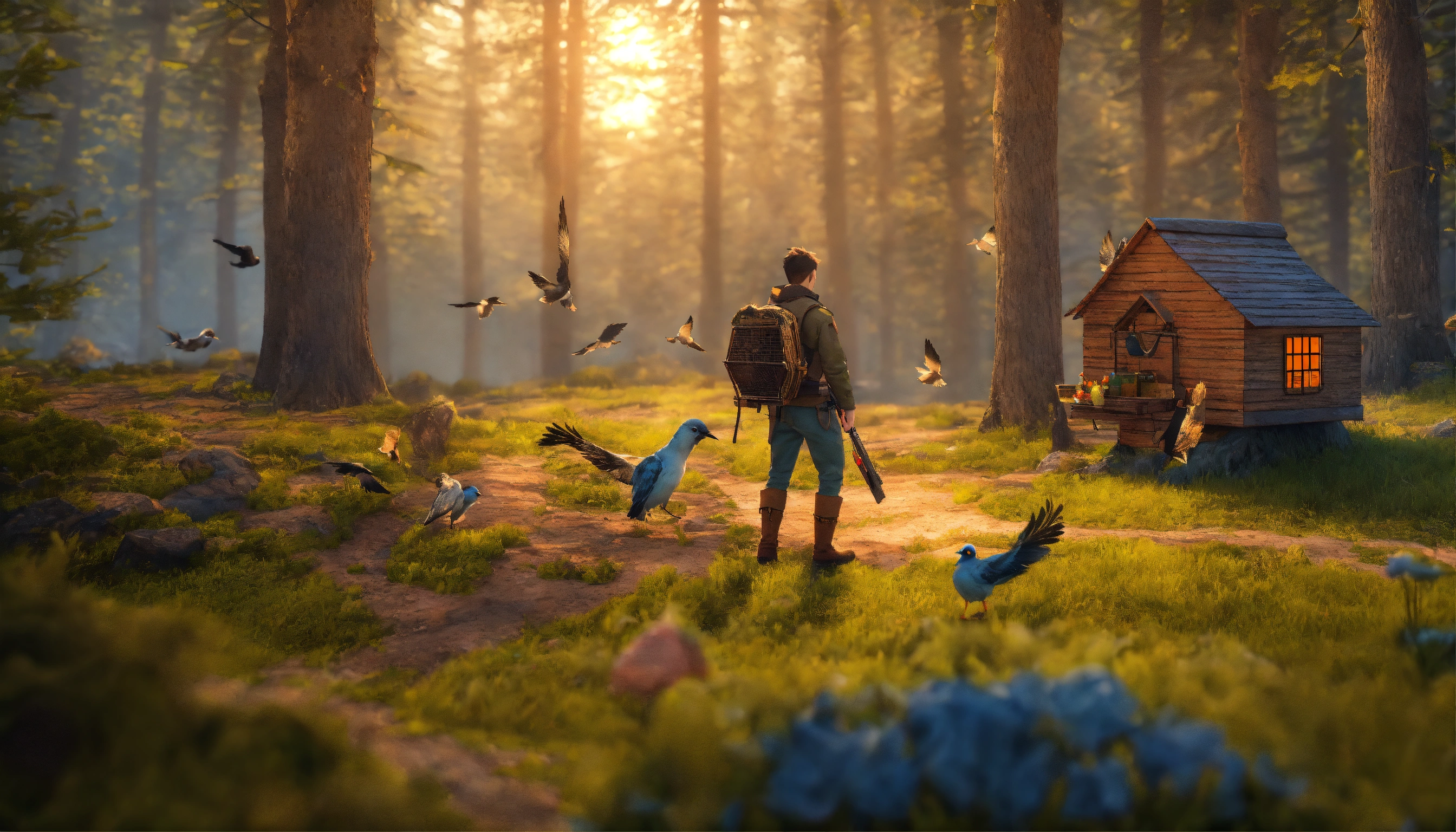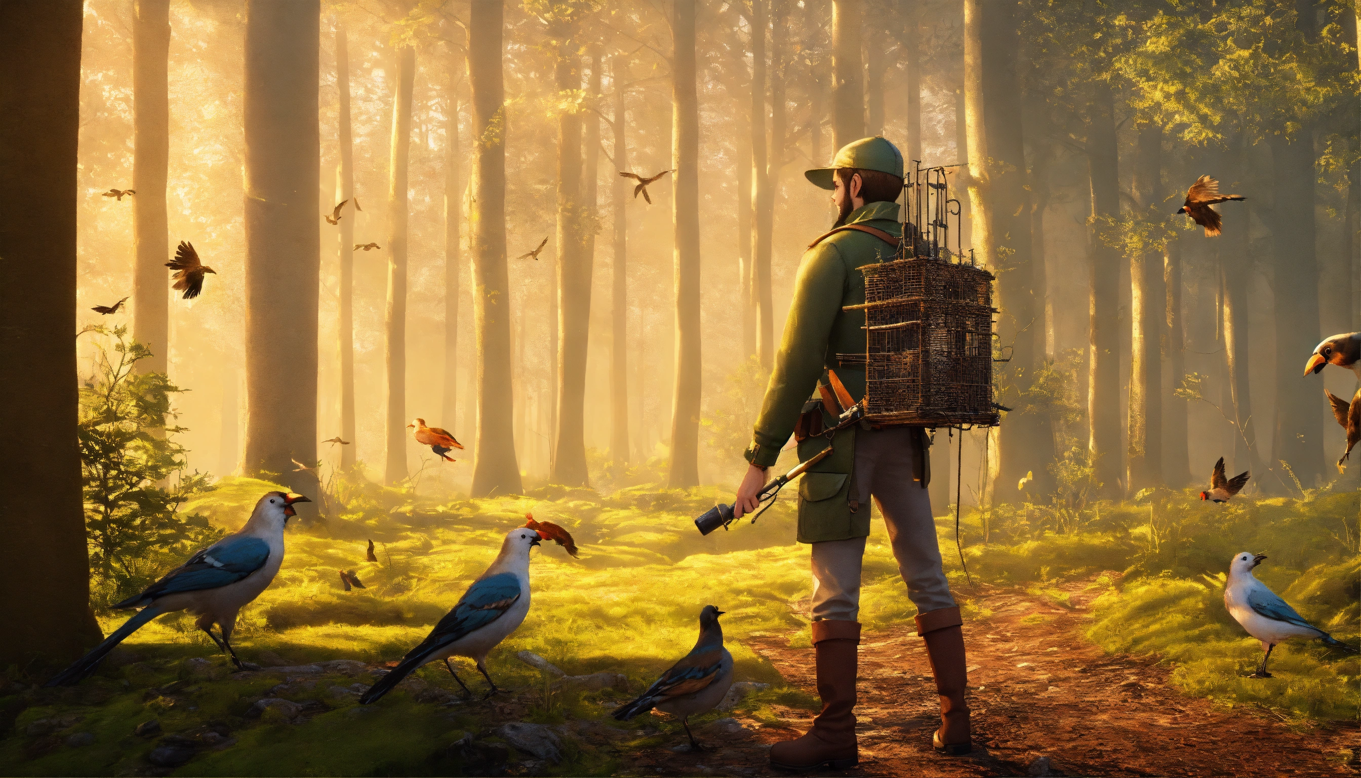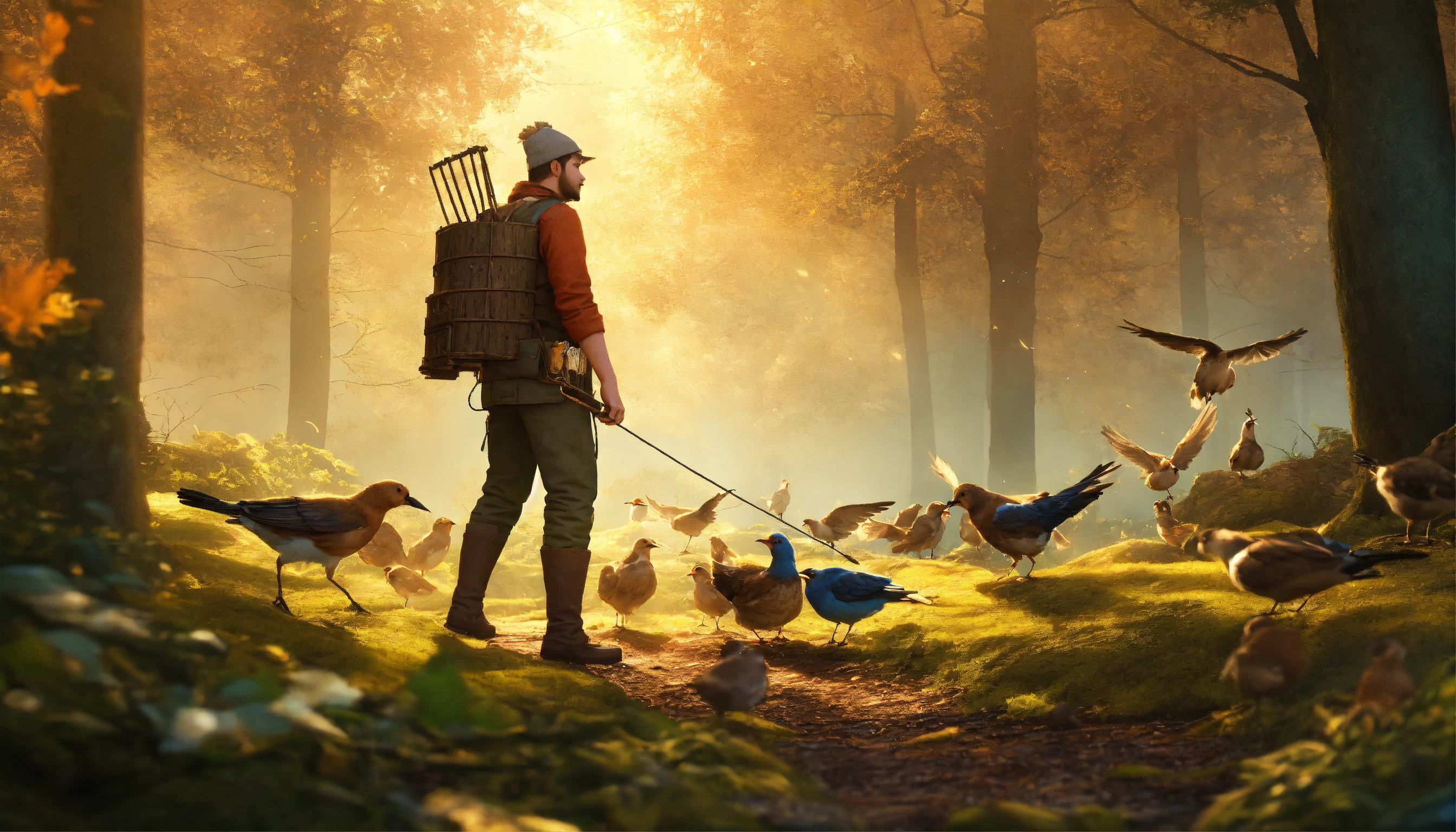 Generate an image hunter man with birds trap wandering in the forest, 3d pictures, storybook illustration, digital art, professional, high quality, detailed.