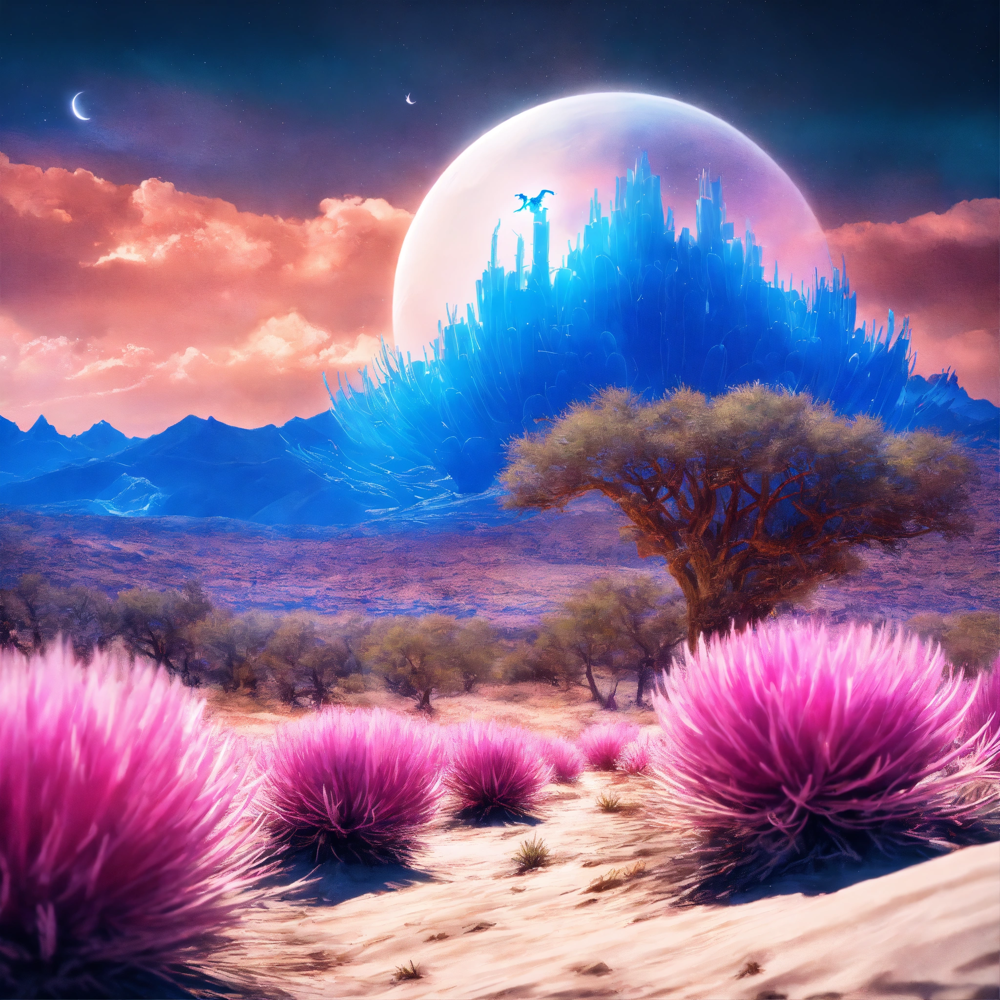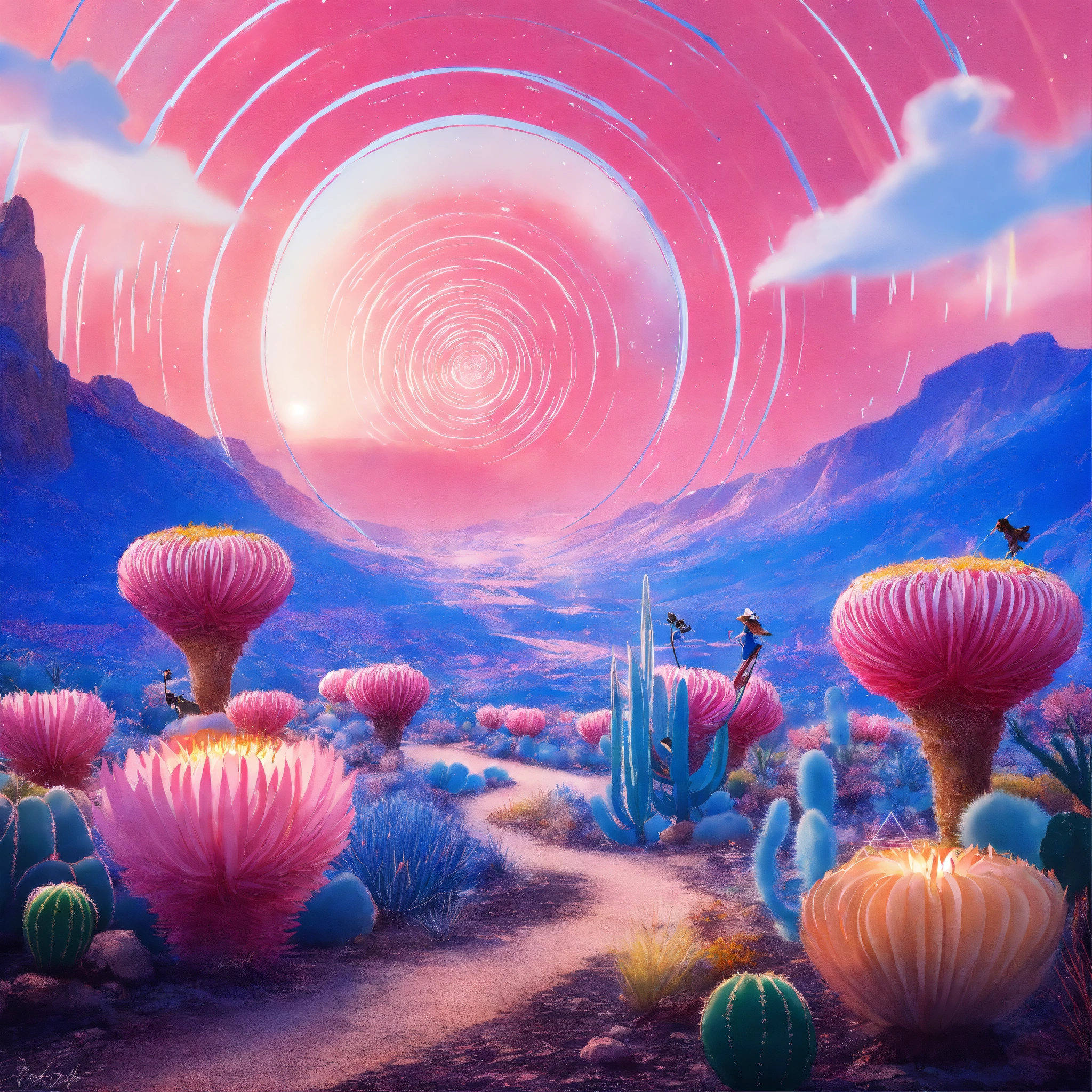 Image. illustrate a pink tornado with wings in a white desert filled with glowing blue cactus. long exposure photography style, cartoon style, x-ray style, in the style of tim burton, lion king, the chronicles of narnia, beauty and the beast, and peter pan. with native american and sacred geometric patterns on the body. enchanting aura. the chronicles of narnia, wizard of oz, and alice in wonderland background with snow mountains, and fruit trees with white leaves.