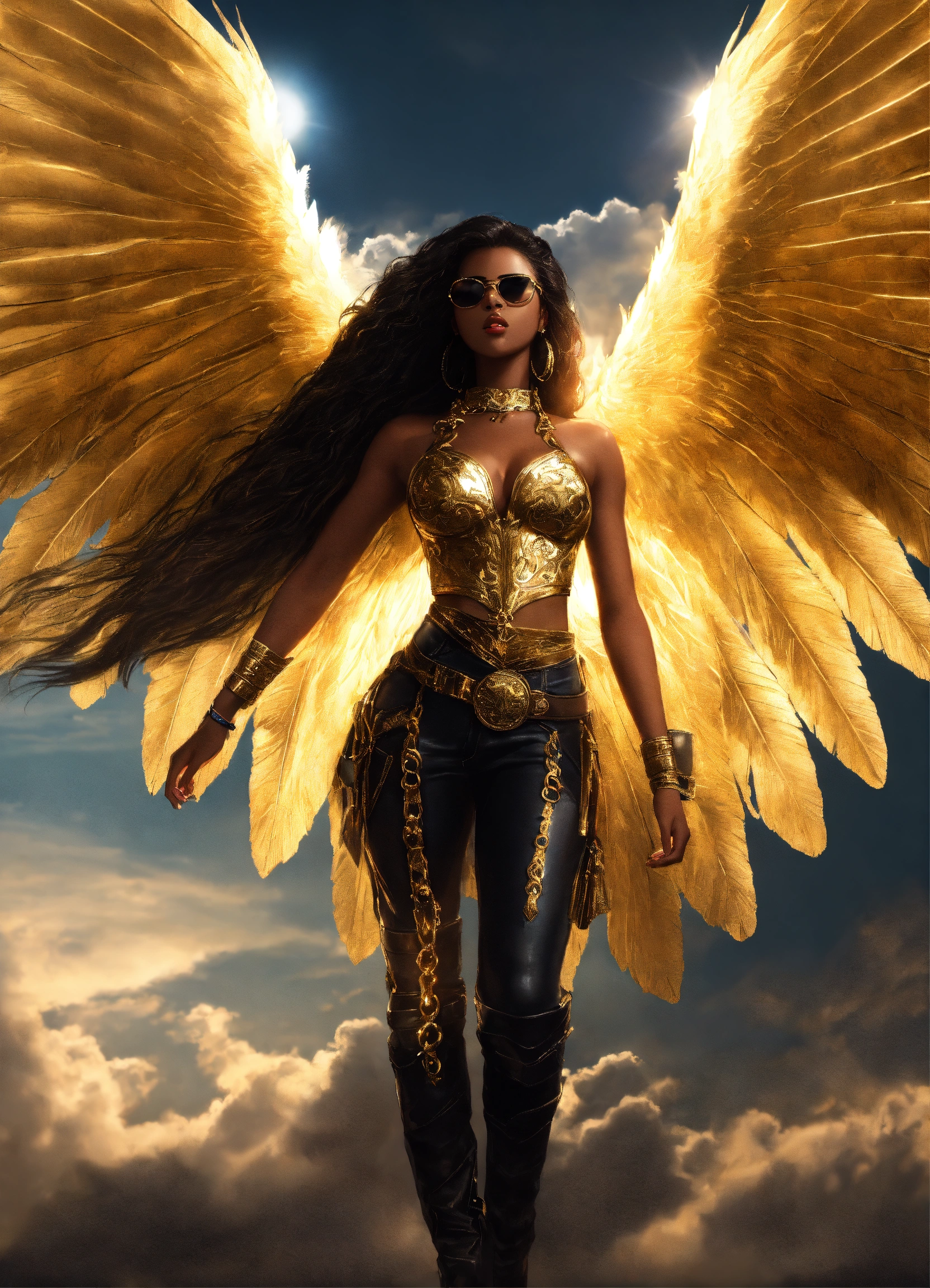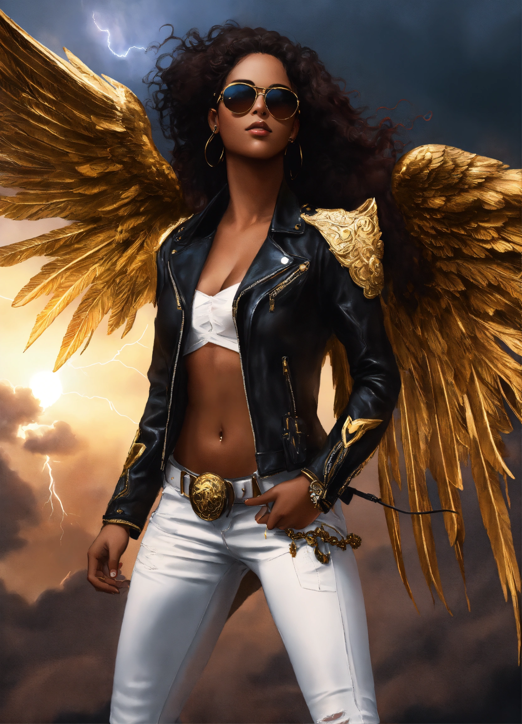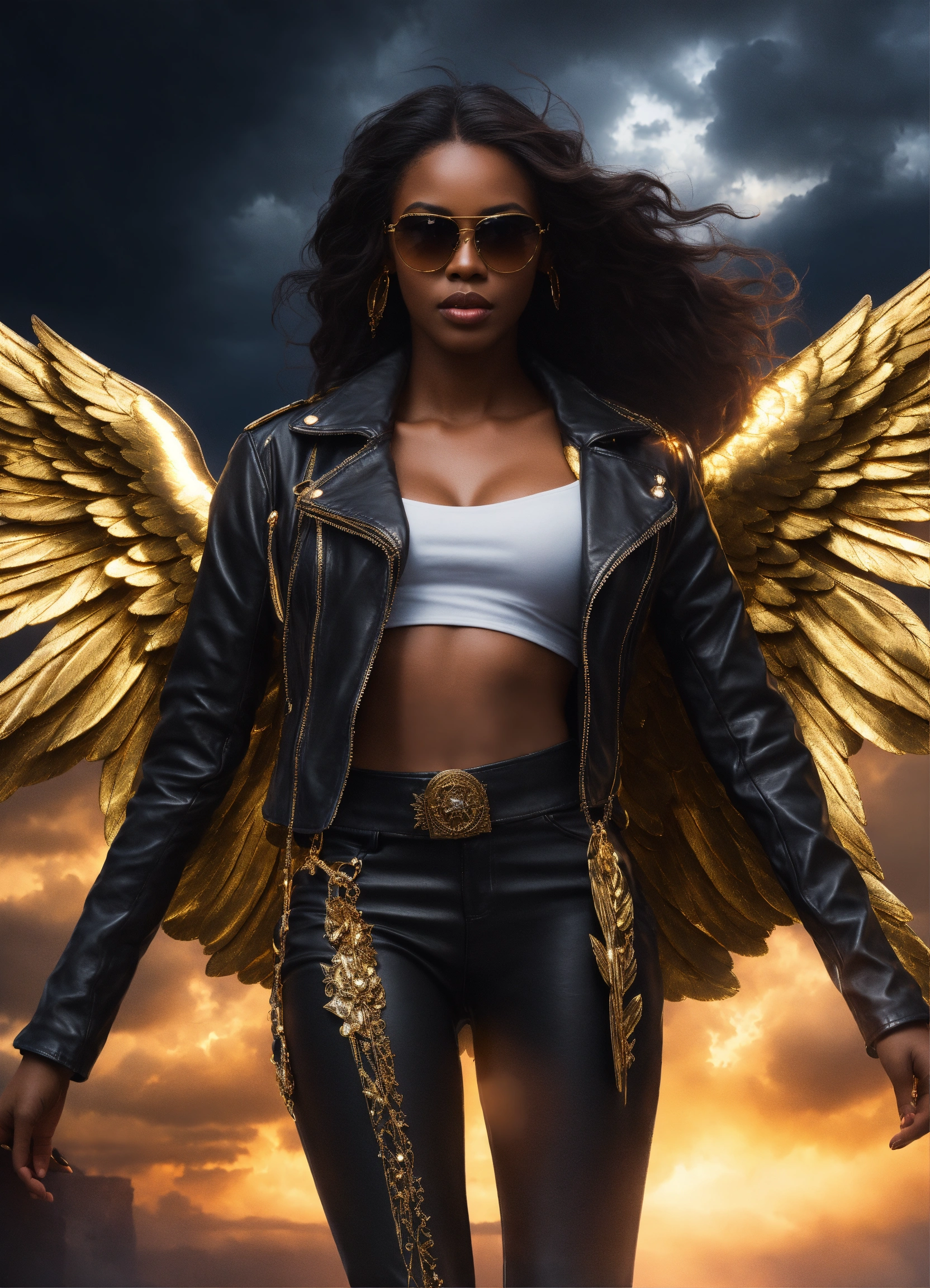 Full body beautiful black goddess angel with wings, beautiful black warrior angel woman with dark brown skin, beautiful perfect face, shapely hour-glass figure long flowing hair, fully clothed black leather jacket, jean pants and white blouse with gold accessories and sunglasses, she's floating in the sky with gold lightning dark clouds behind her, fantasy, high detail, realistic photo, high detail, digital painting, cinematic, stunning, hyper-realistic, sharp focus, high resolution 8k, insanely detailed