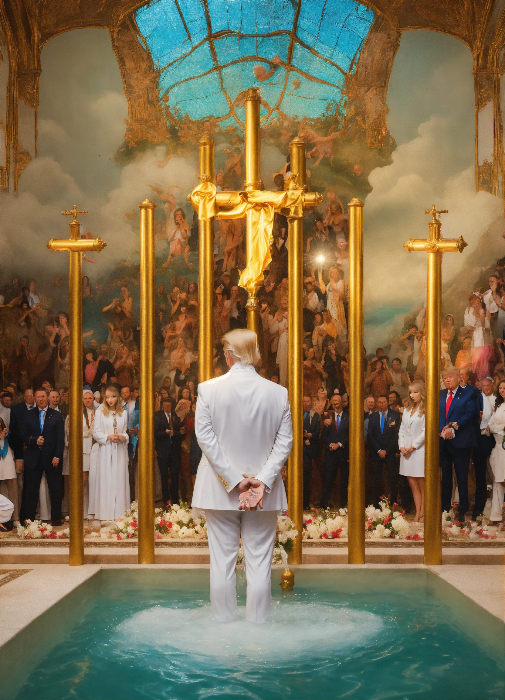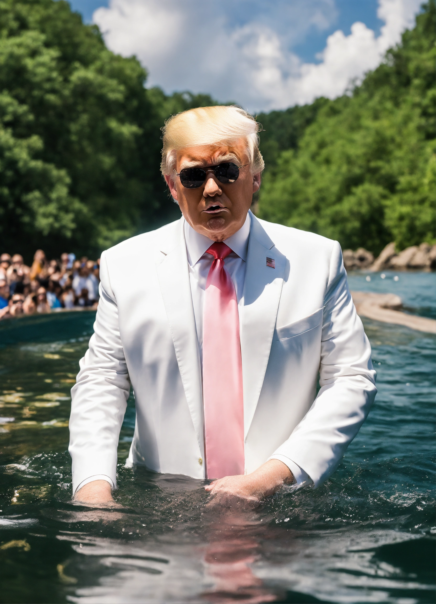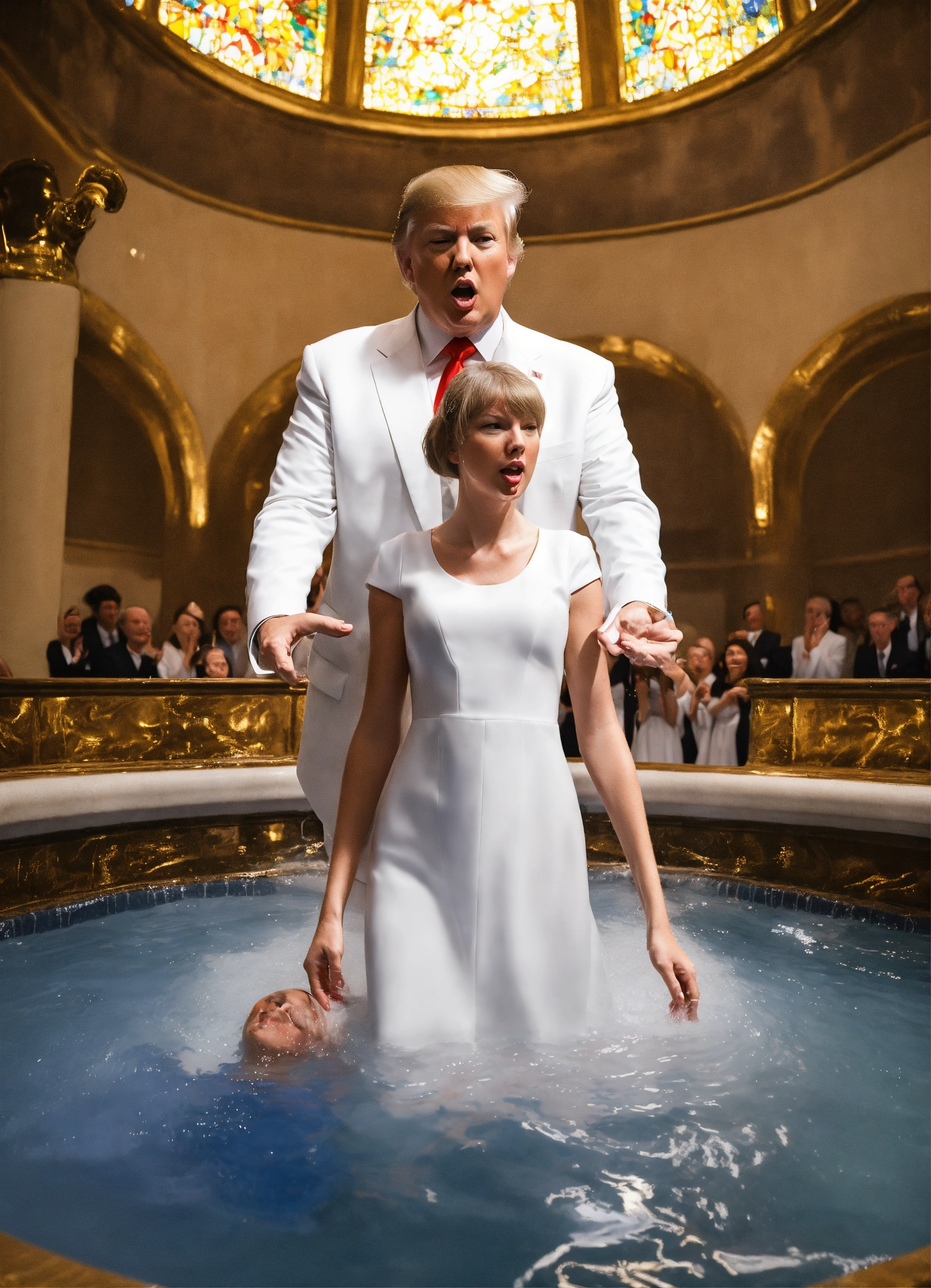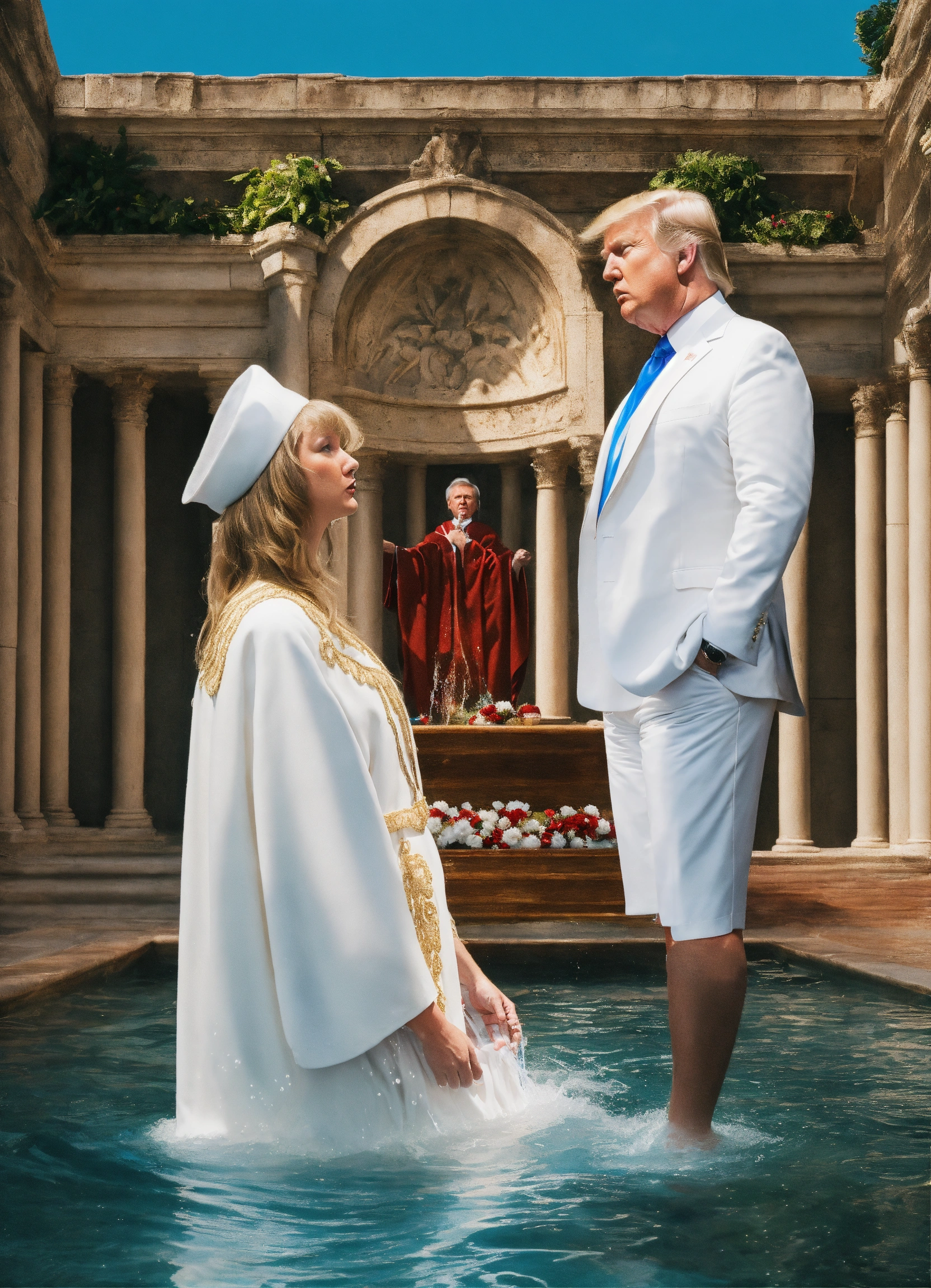 Photo realistic shot of donald trump in a white suit getting baptized by taylor swift