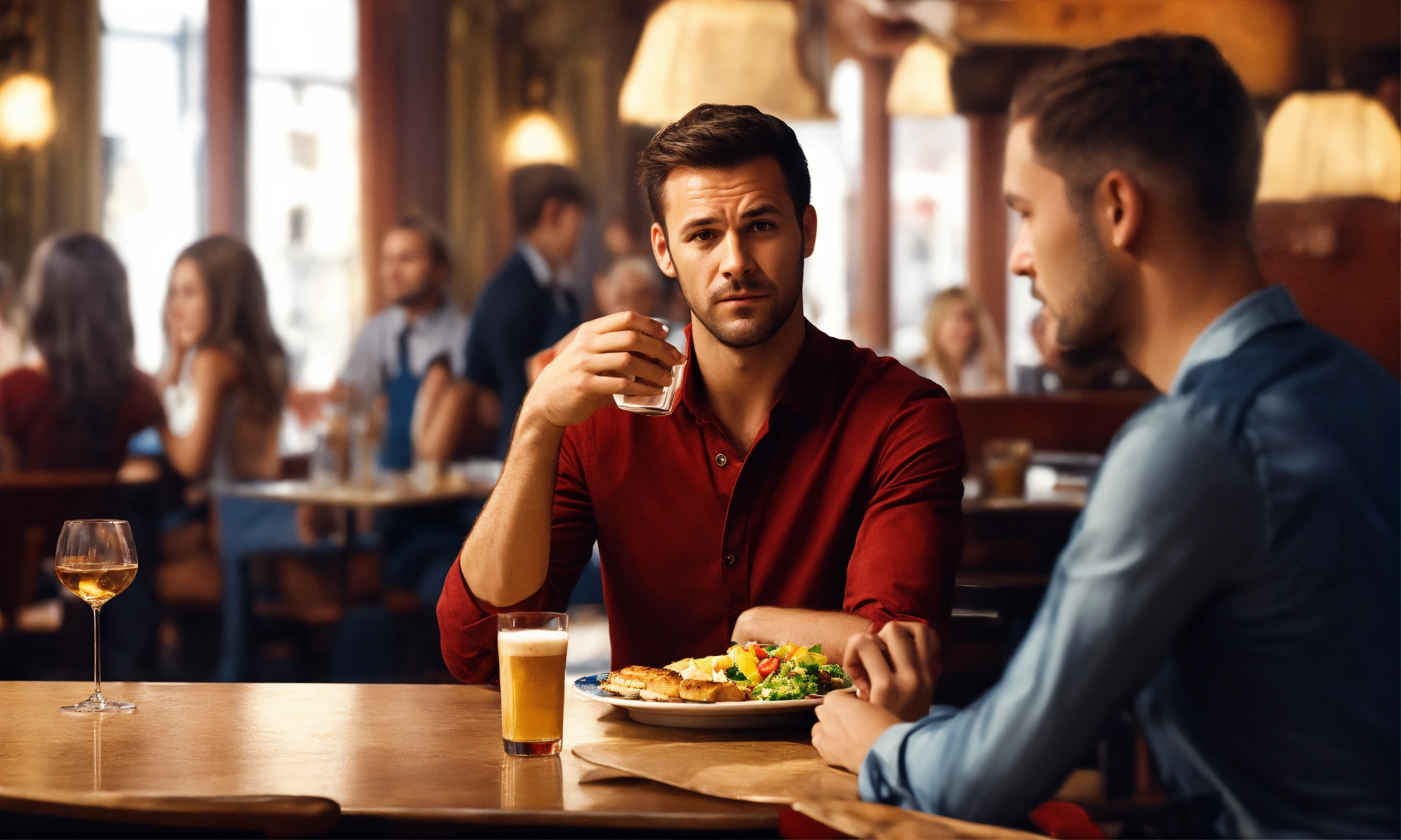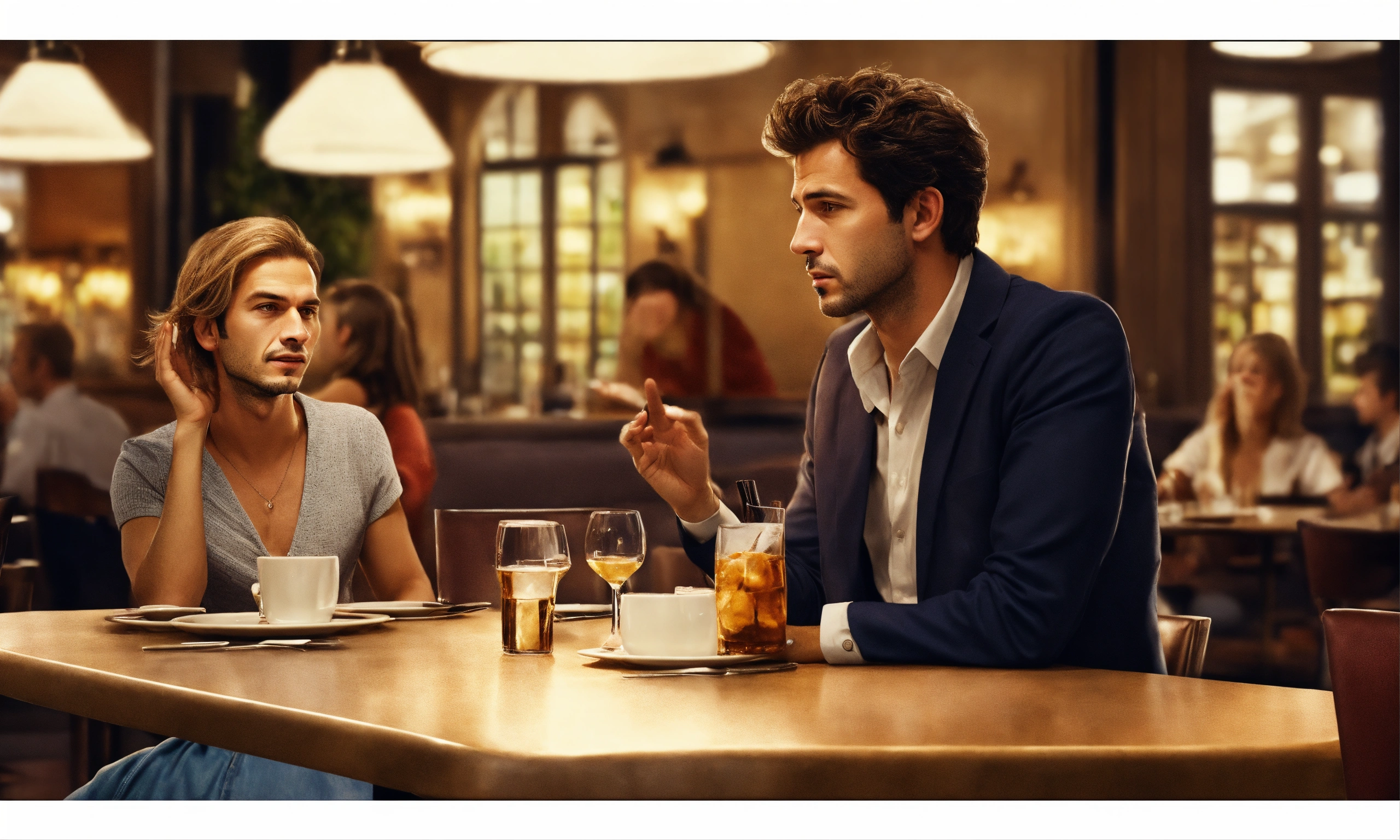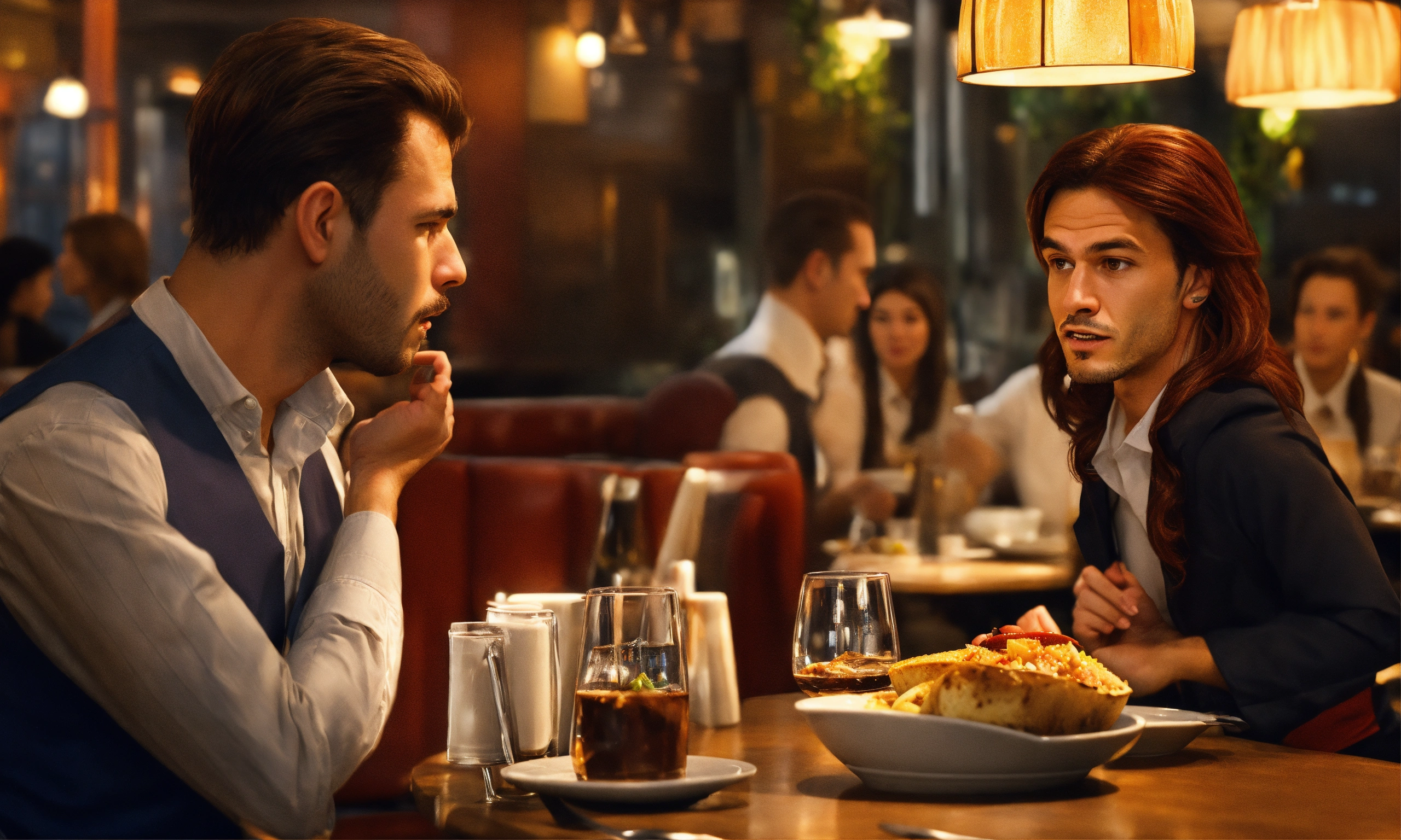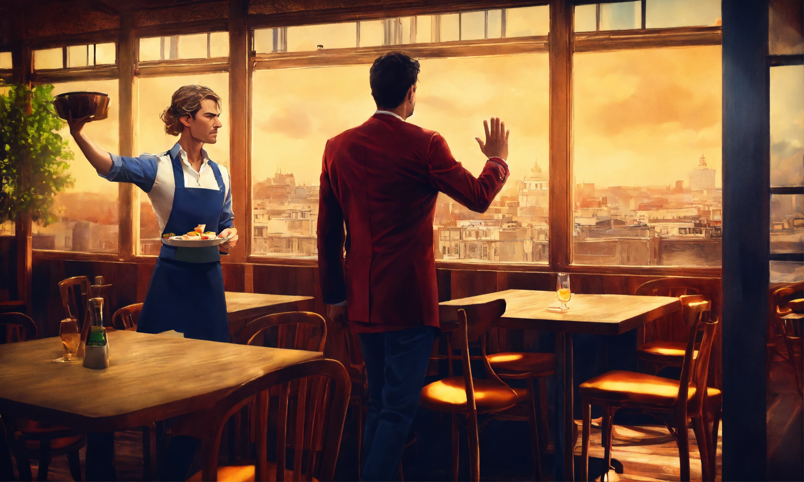 An artistic photo realistic picture of an unhappy man waving his hand at a waitress, waitress ignoring man at tabe