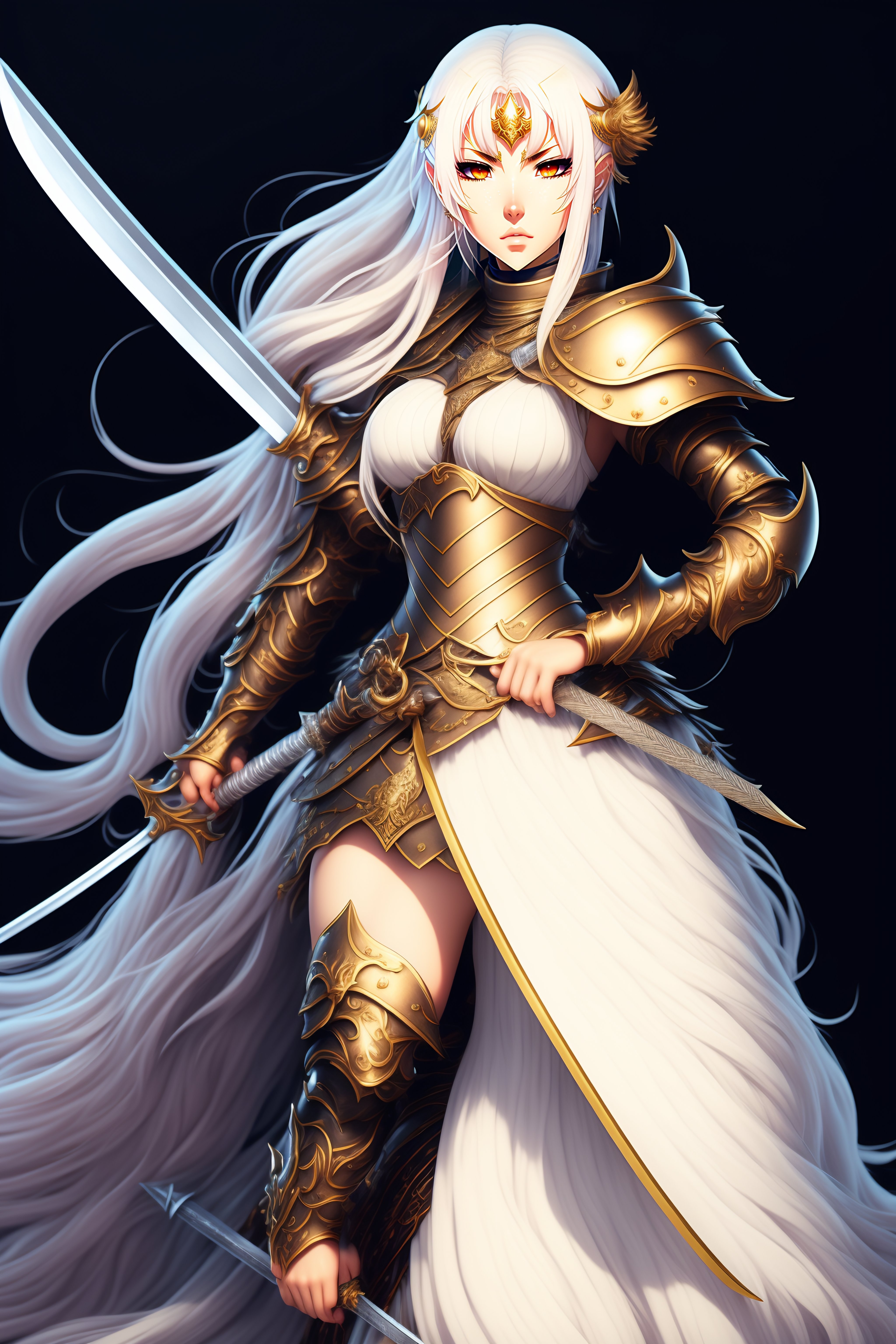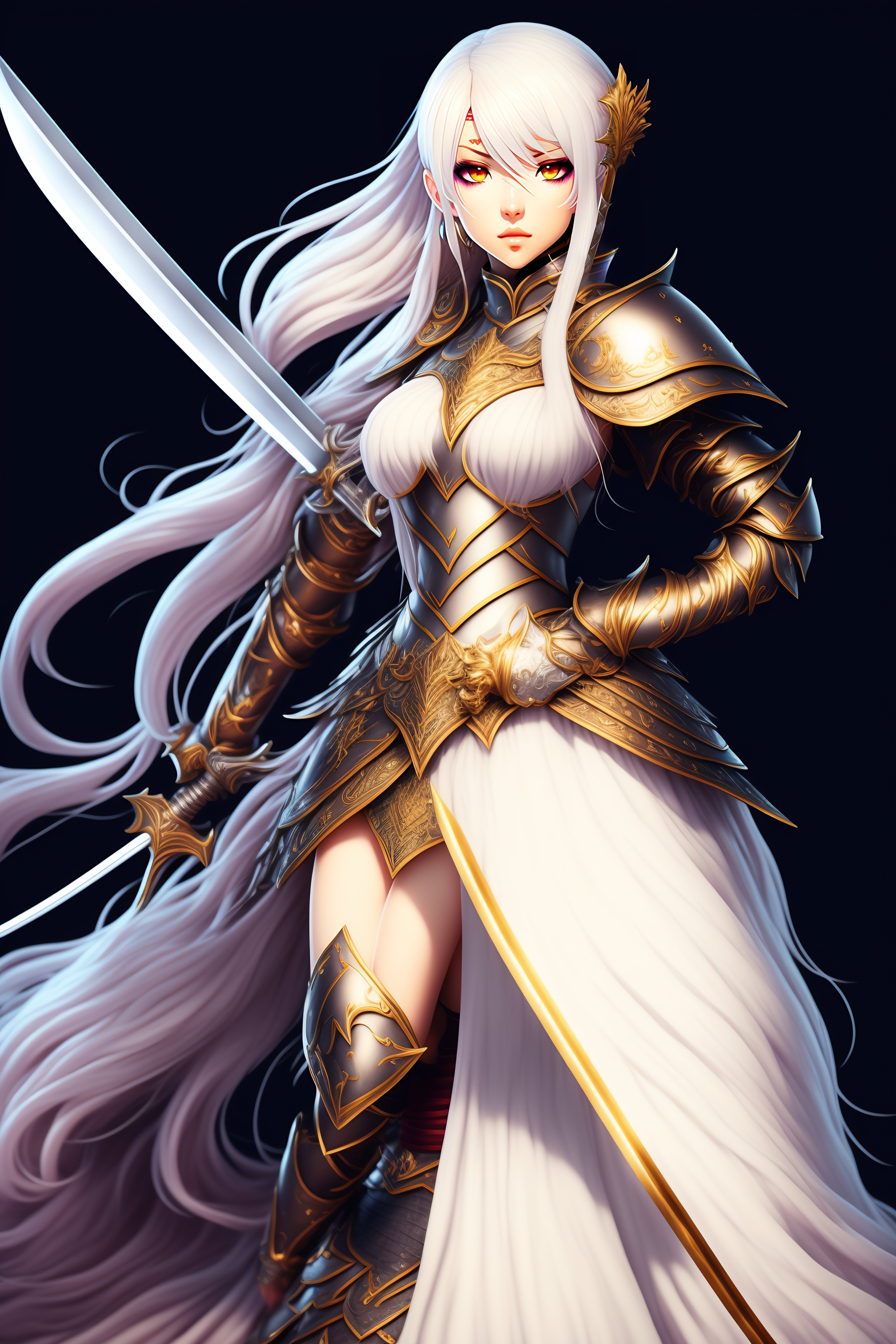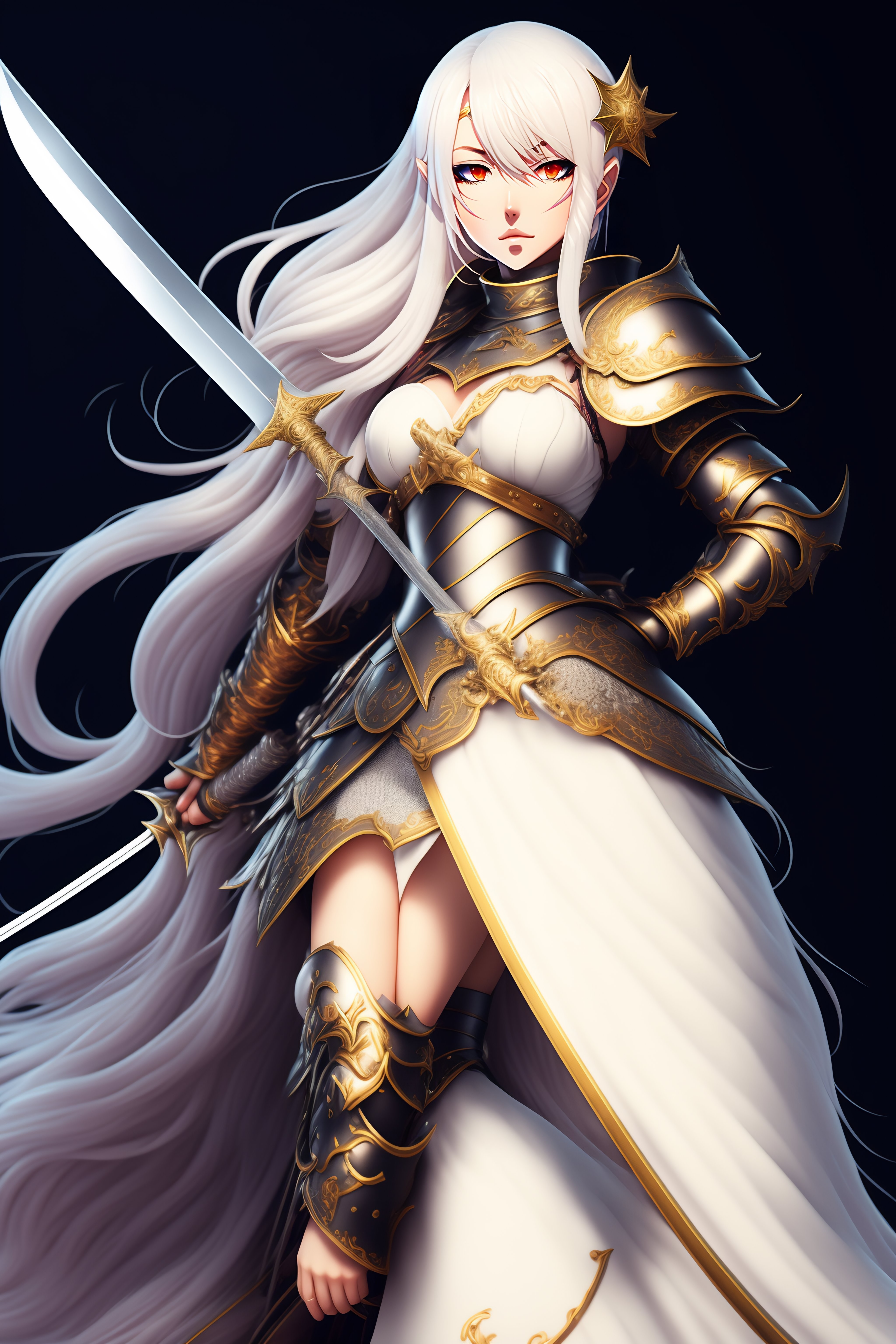 Anime female knight full body holding sword white hair
