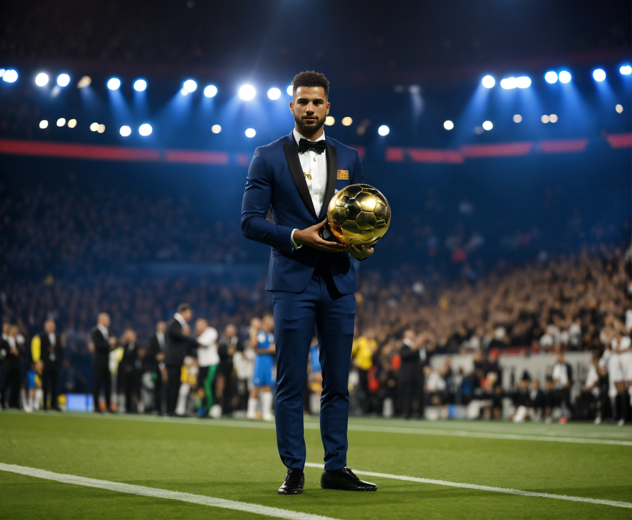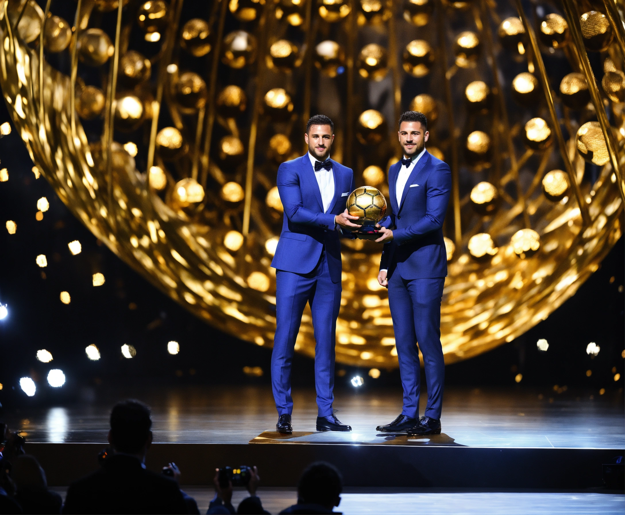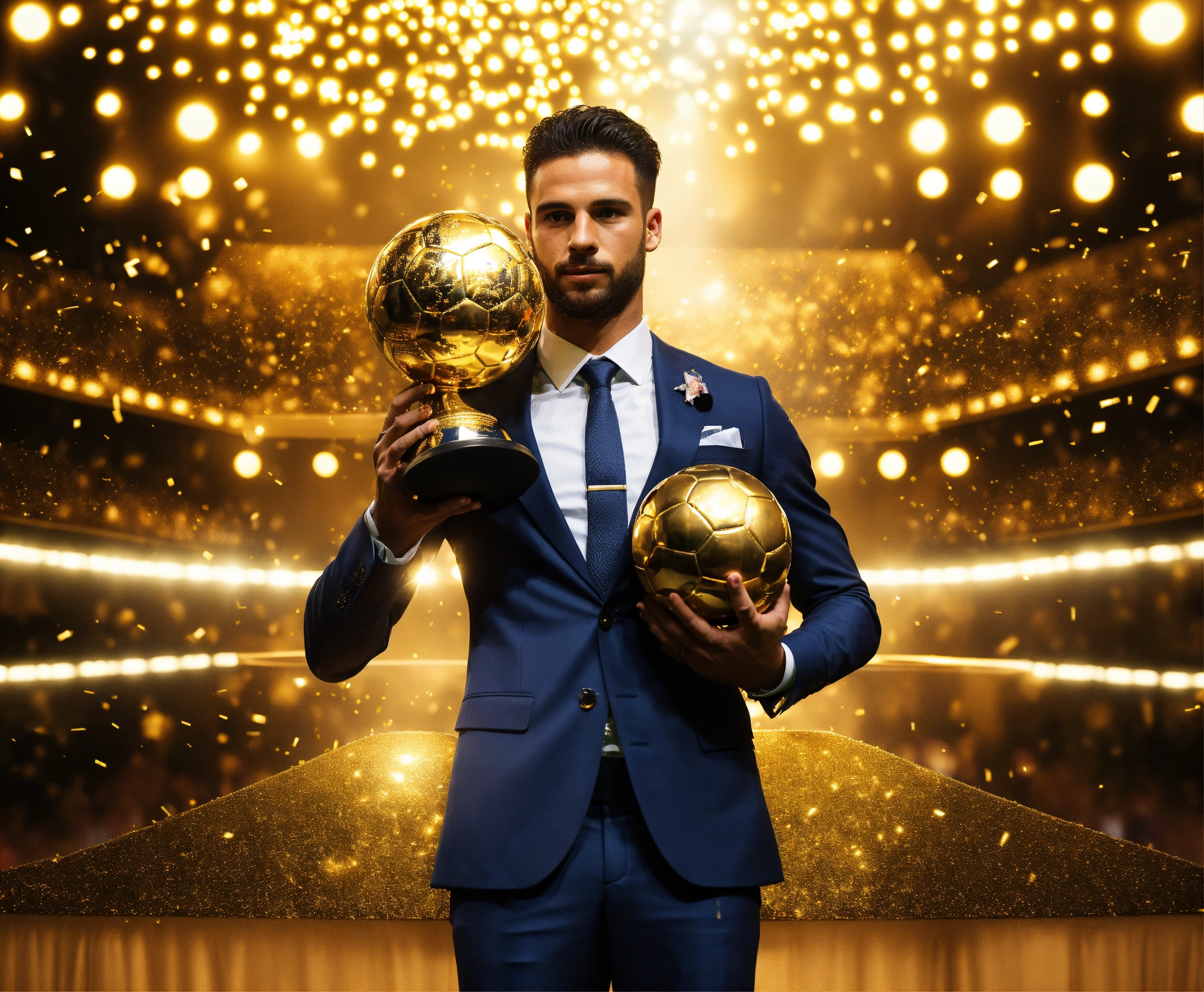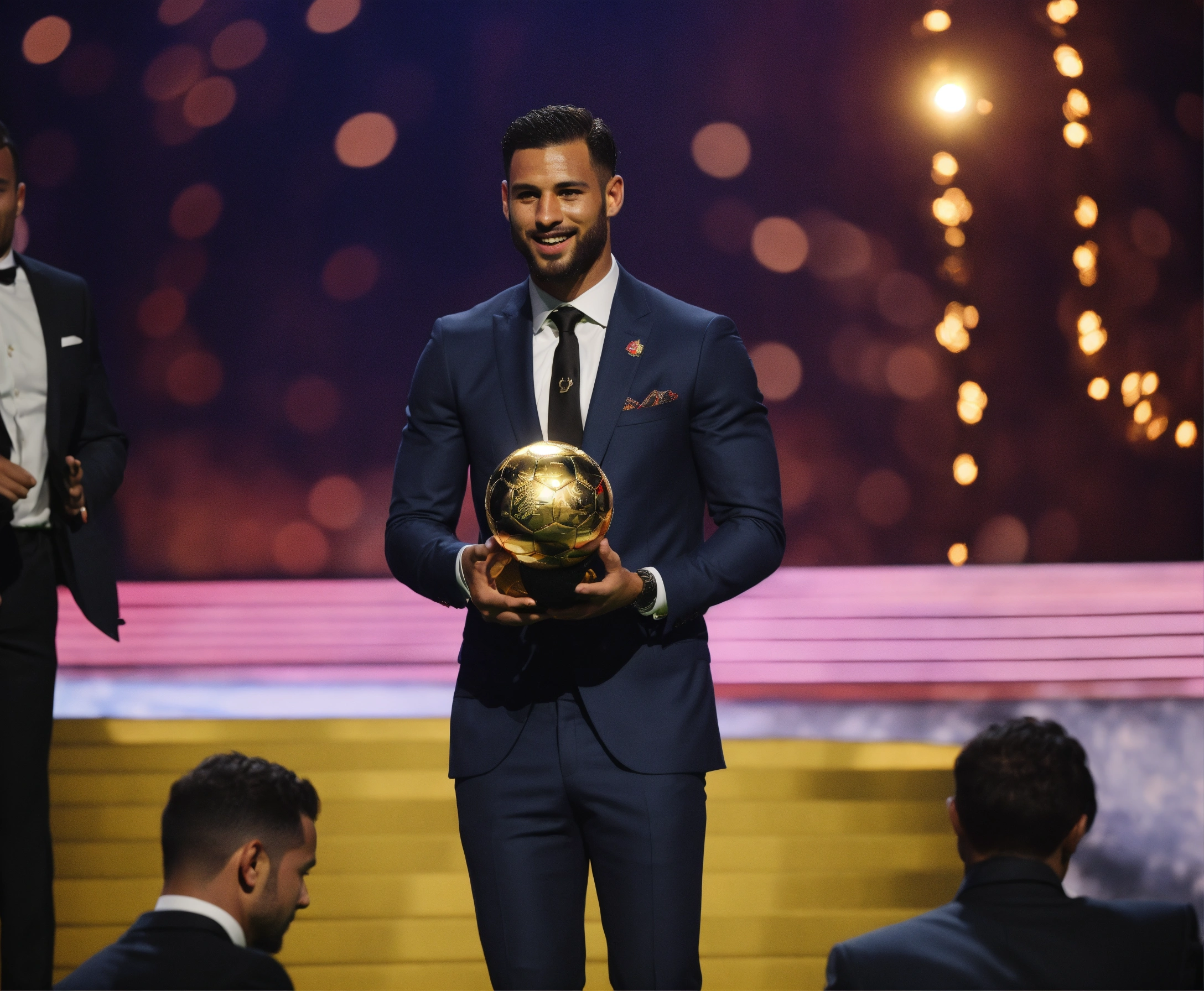 Awarding the golden ball to the best football player, on stage, half of the body is visible, a man in a suit