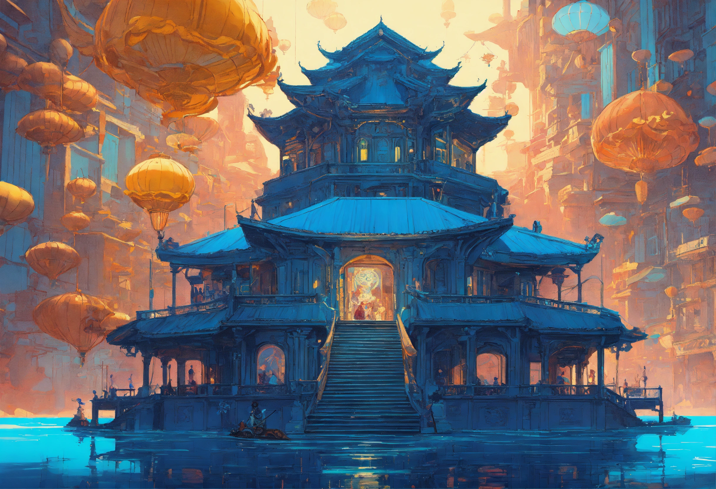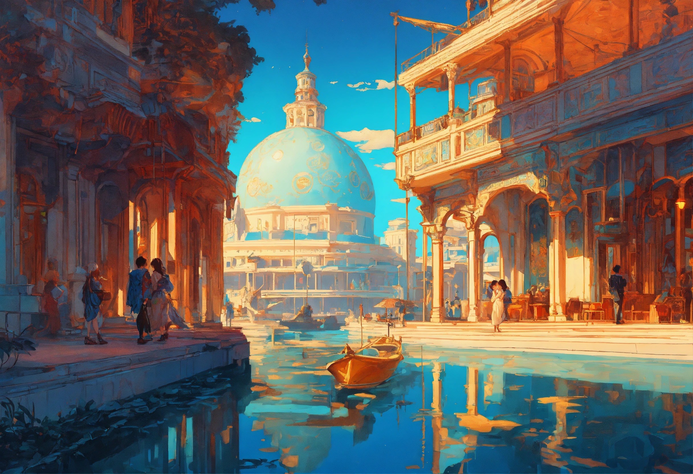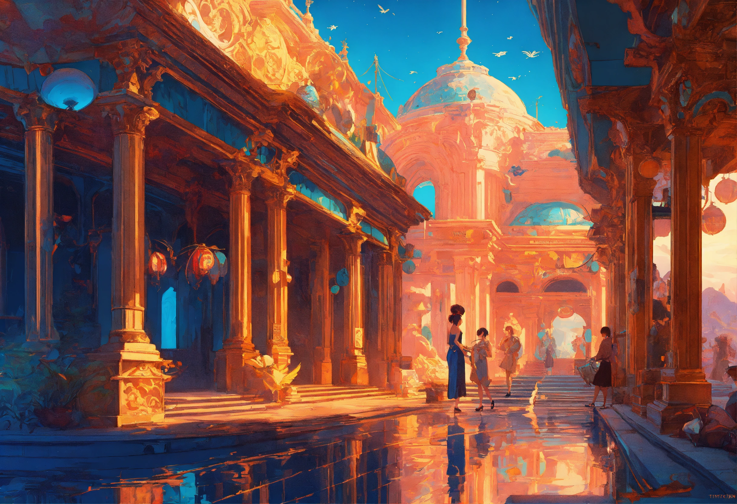 Ancient rich fantasy ocean city, grecian architecture, blue and gold, ernst haeckel maria sibylla merian. tristan eaton, victo ngai, artgerm, rhads, ross draws, kaethe butcher, hajime sorayama, greg tocchini, virgil finlay, fantasy, colors, neon lights, digital painting, pixiv, by ilya kuvshinov, neon lights, 3d, perspective