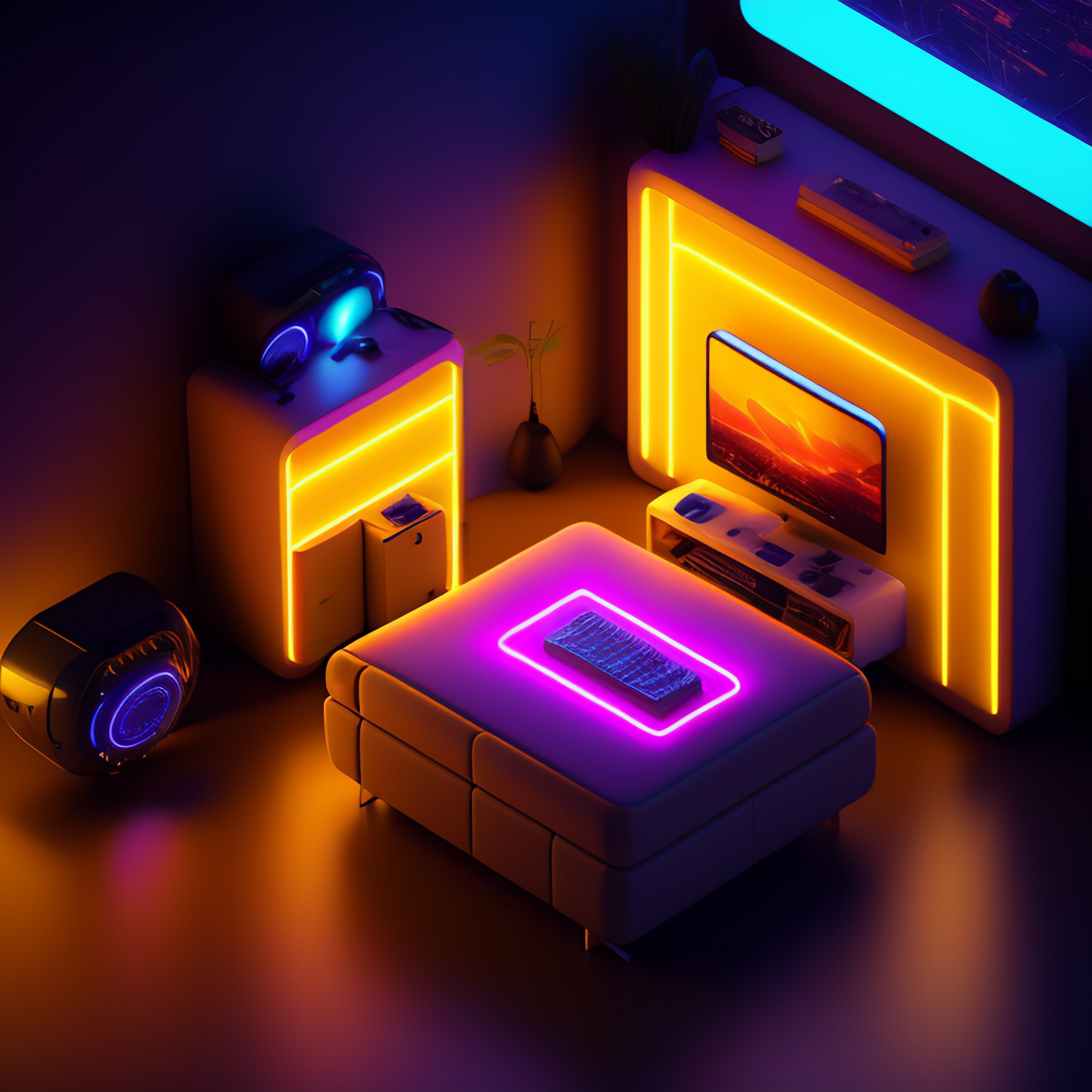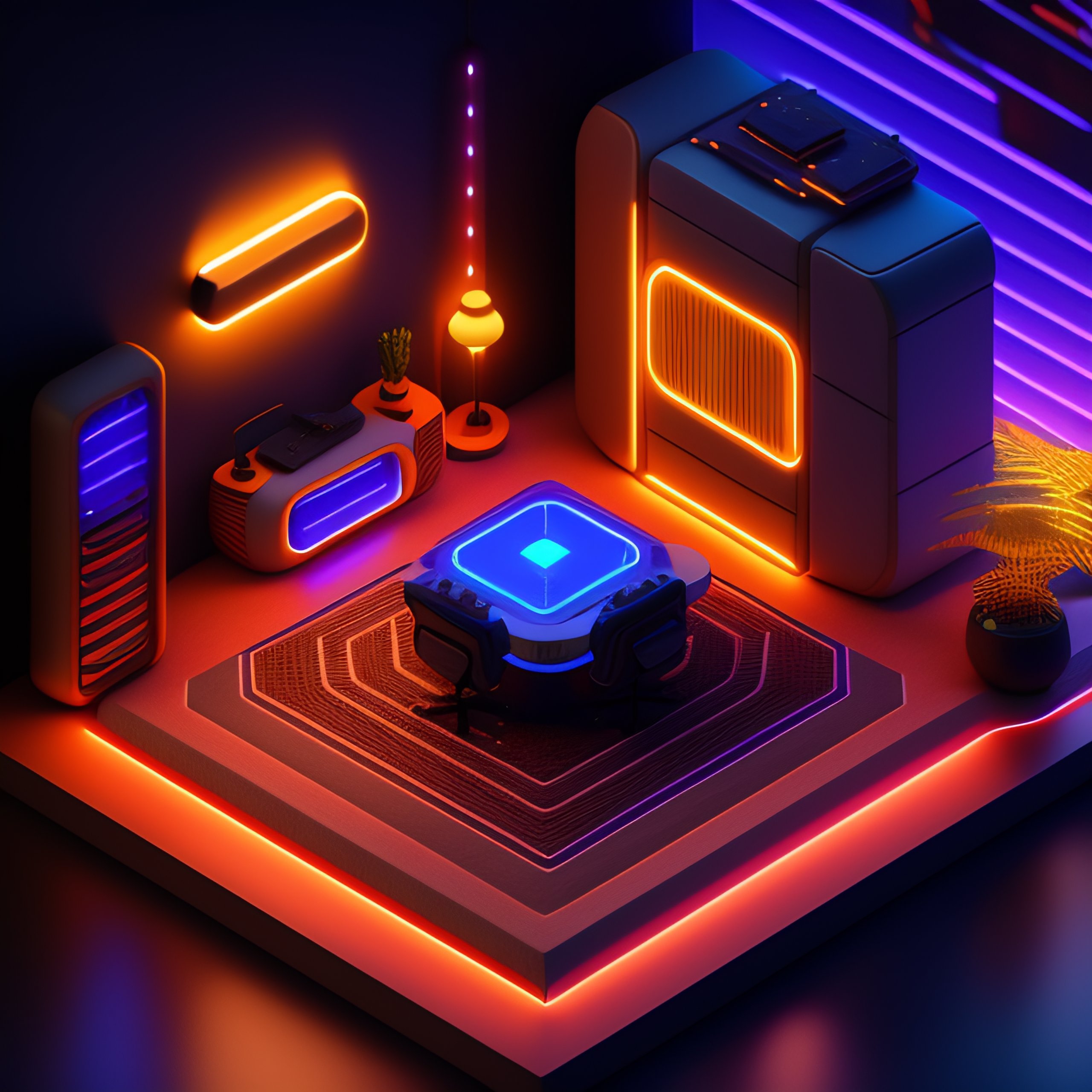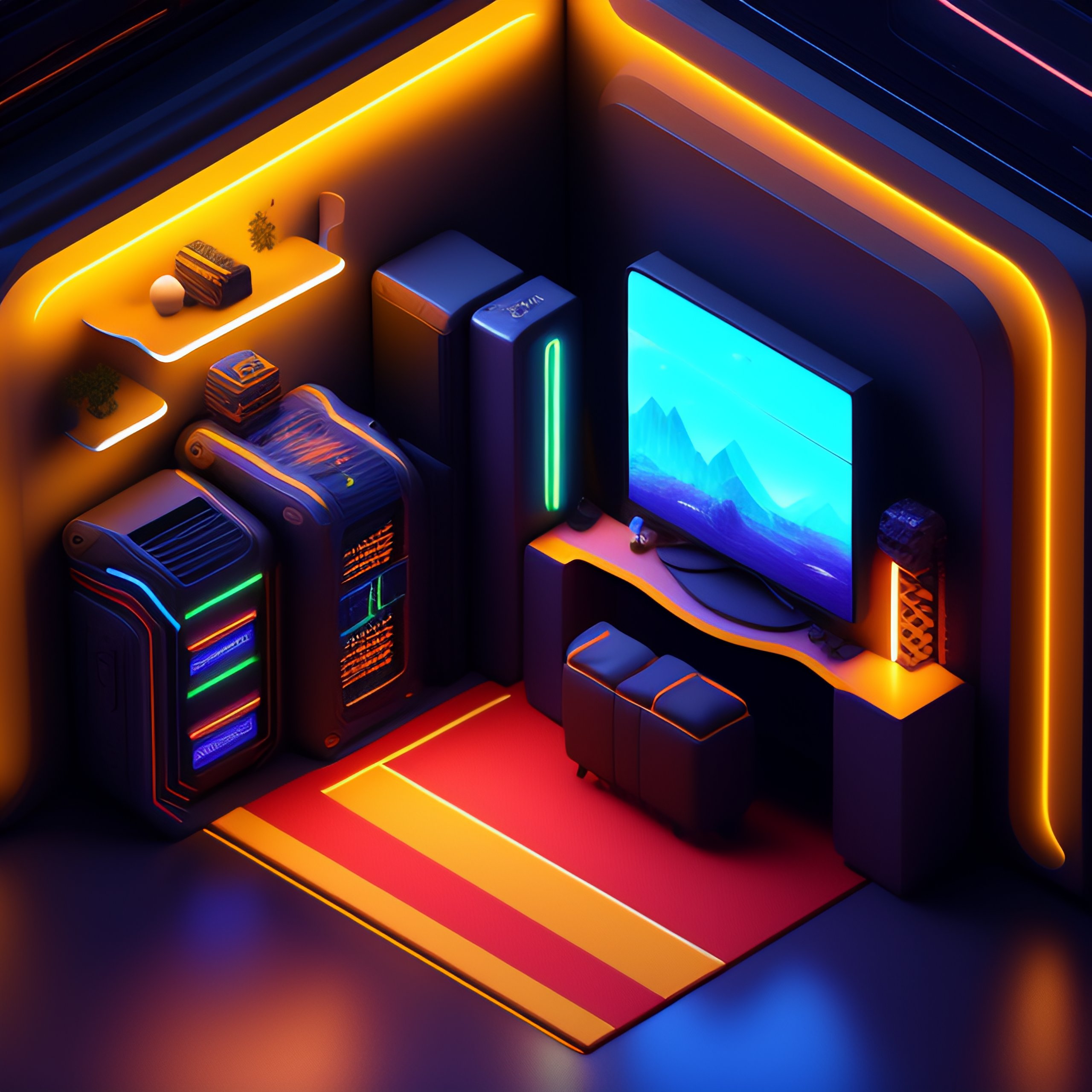 Detailed isometric futuristic gaming room, neon lights, unreal engine render, video games, very cozy, boy in room in front of the computer, c4d render