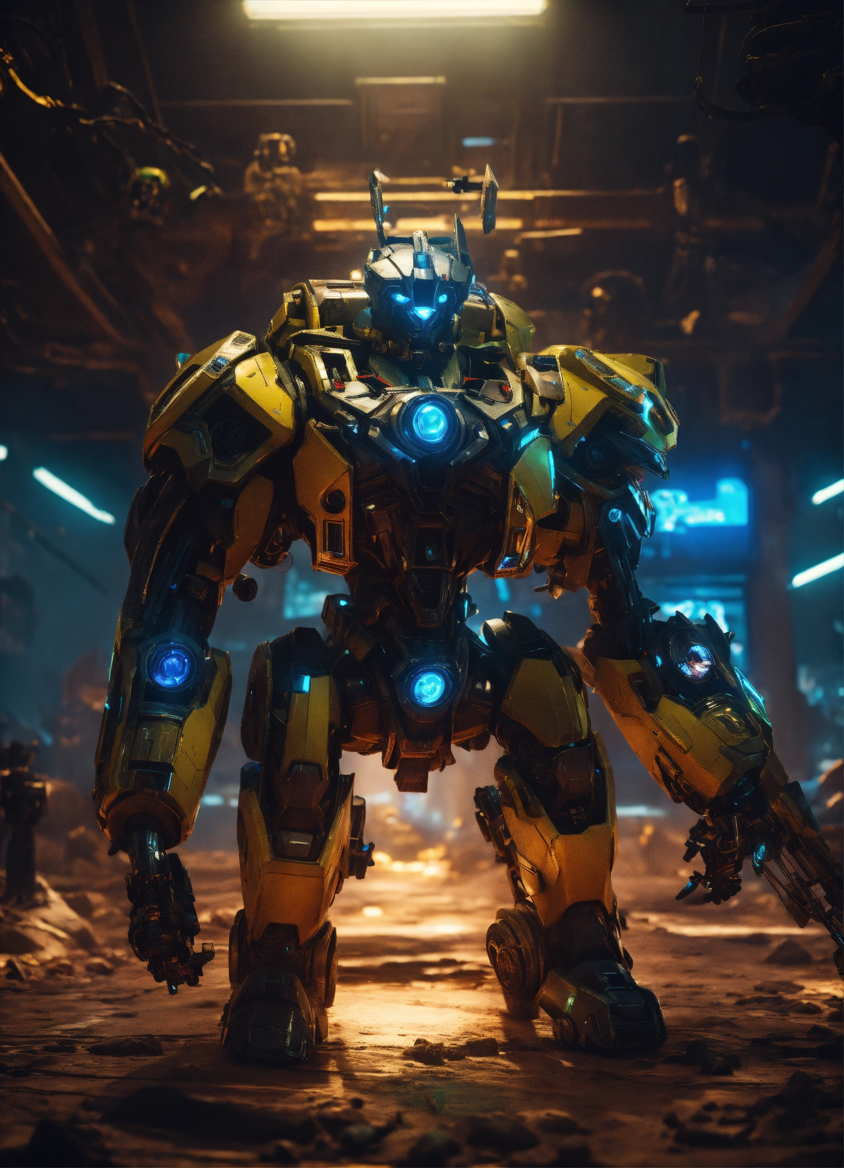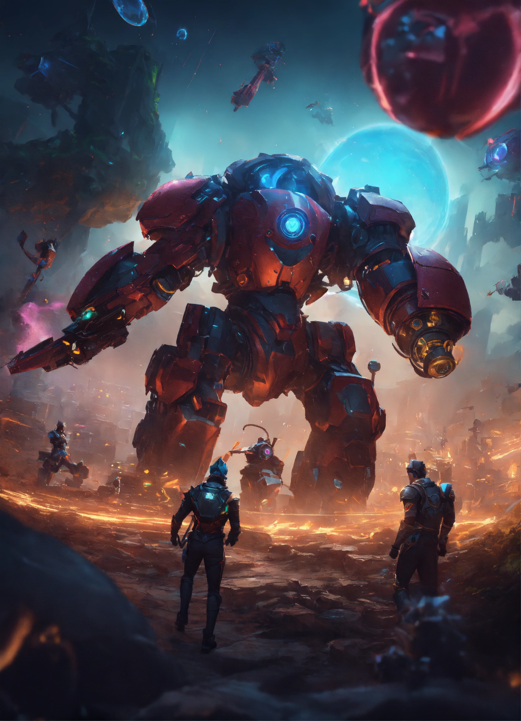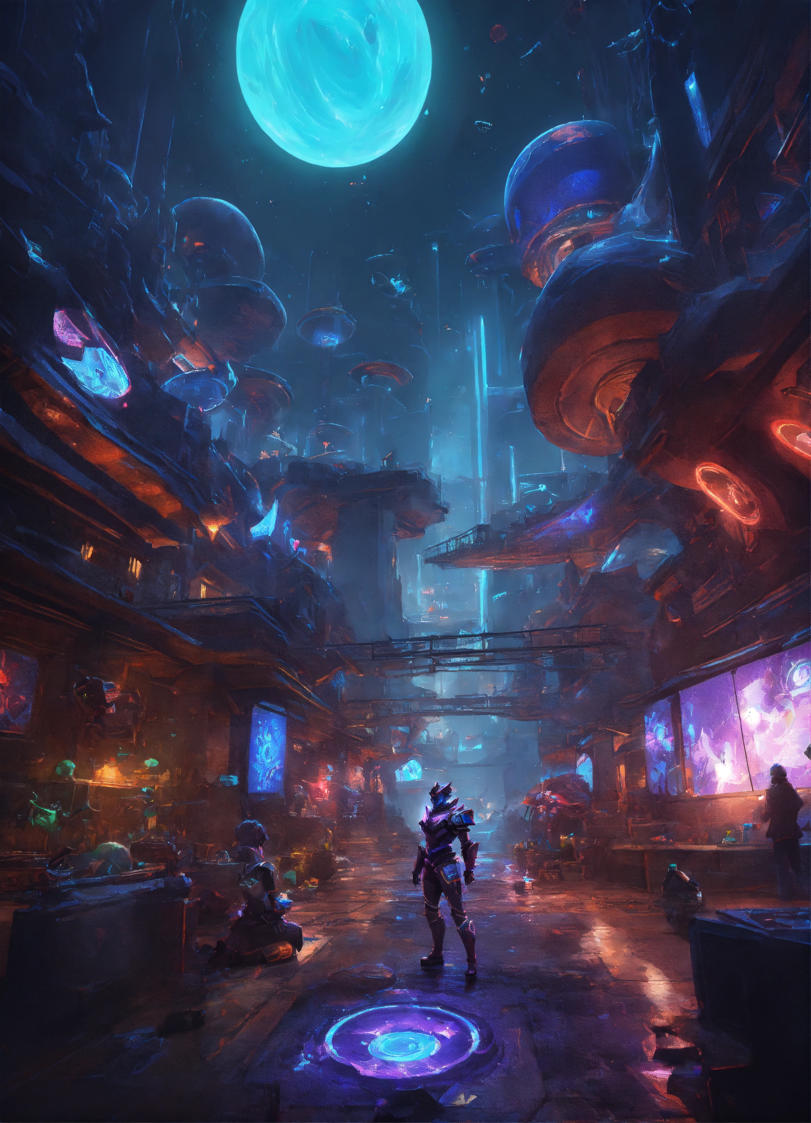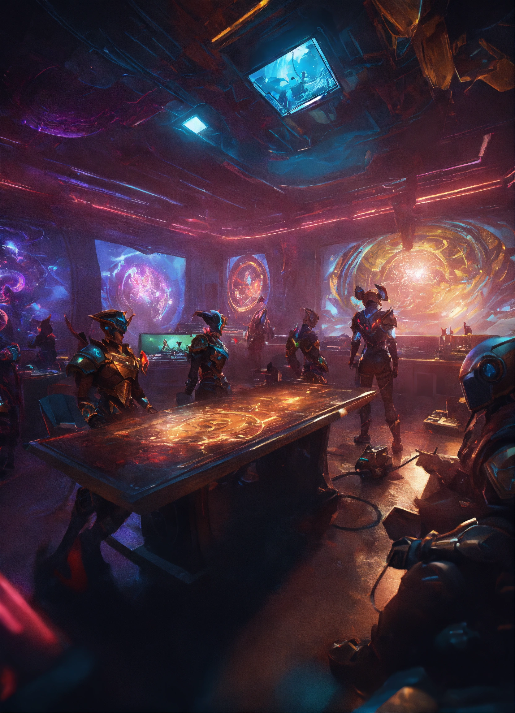 Wide angle environmental shot of ai augmented human intelligence league of legends, surreal, dramatic, dark, sharp focus, 8k.