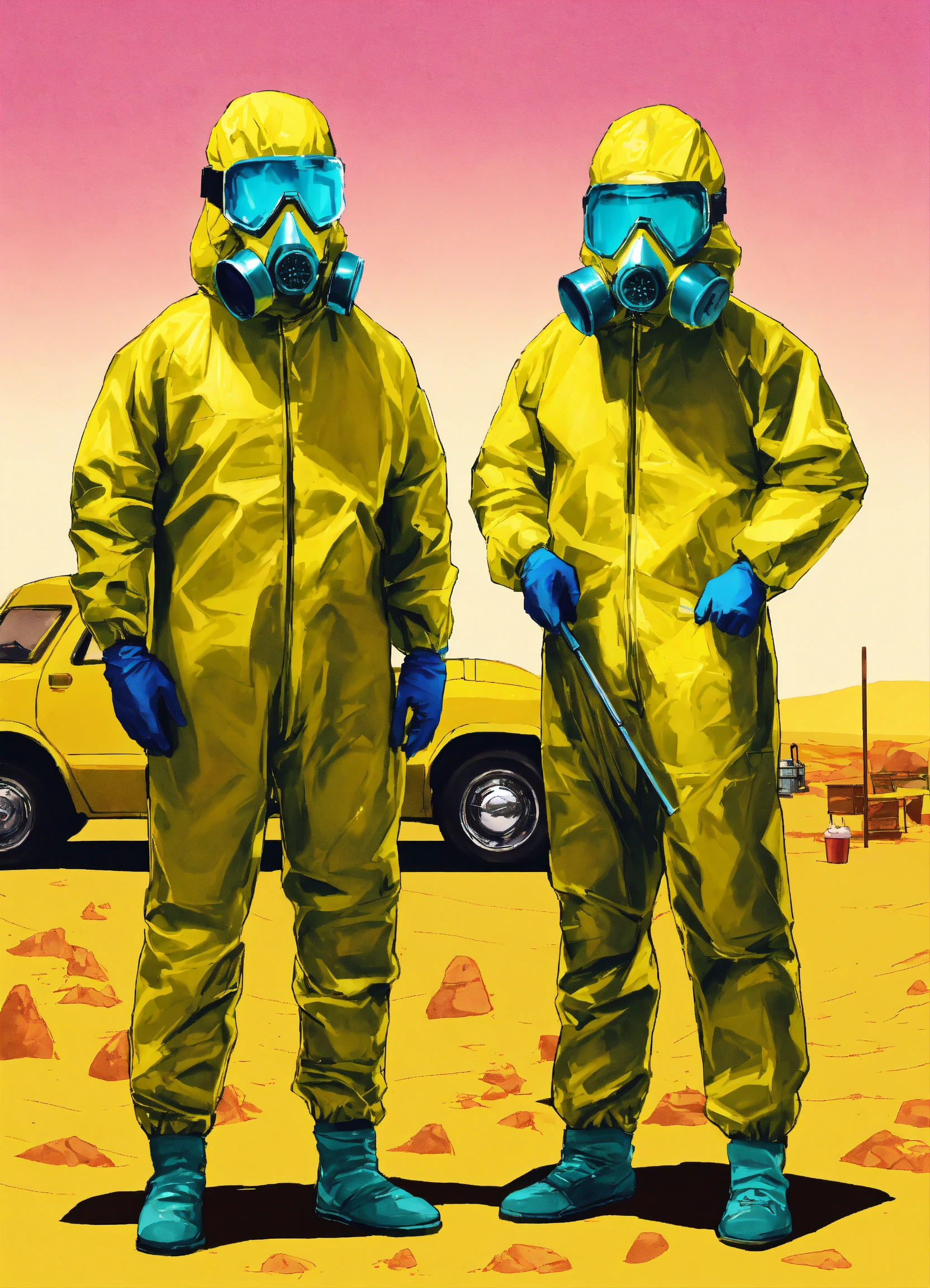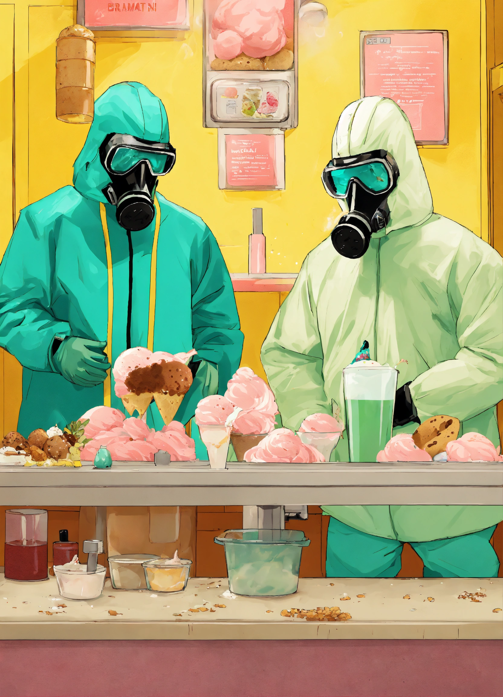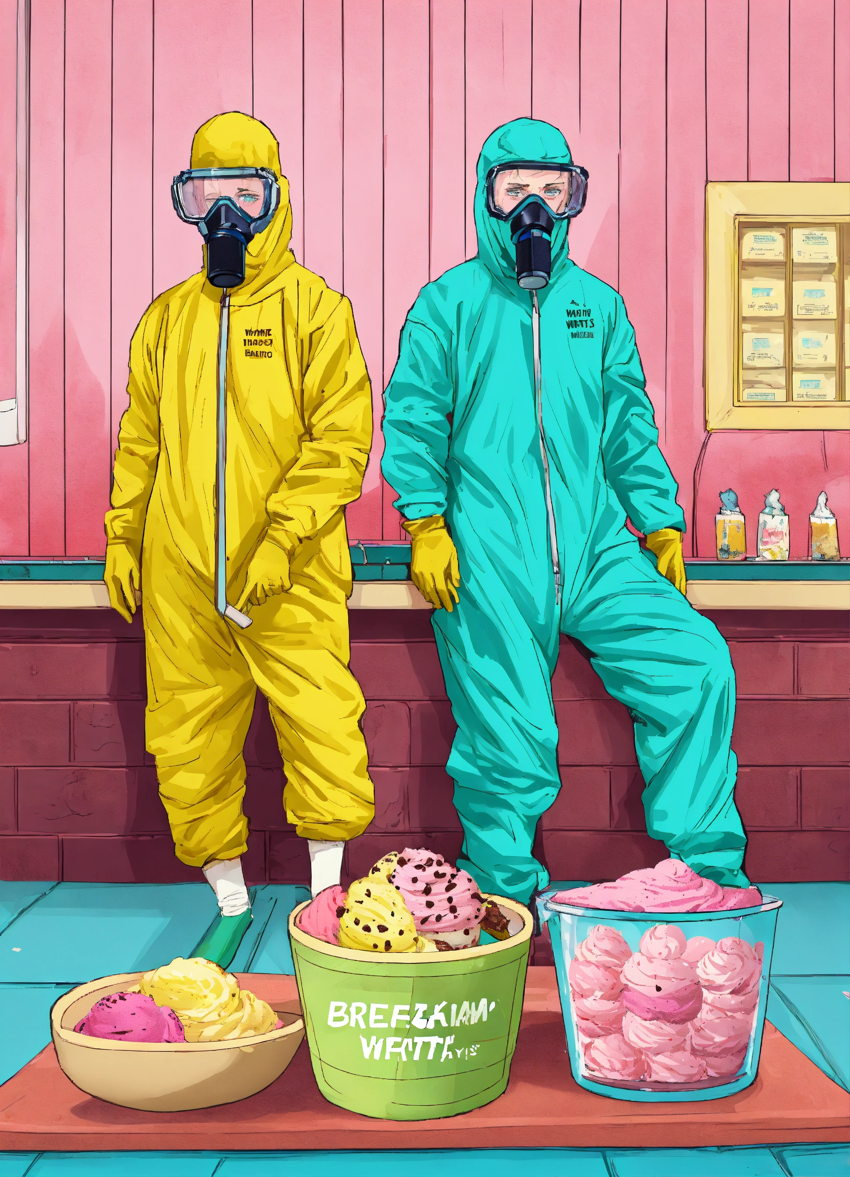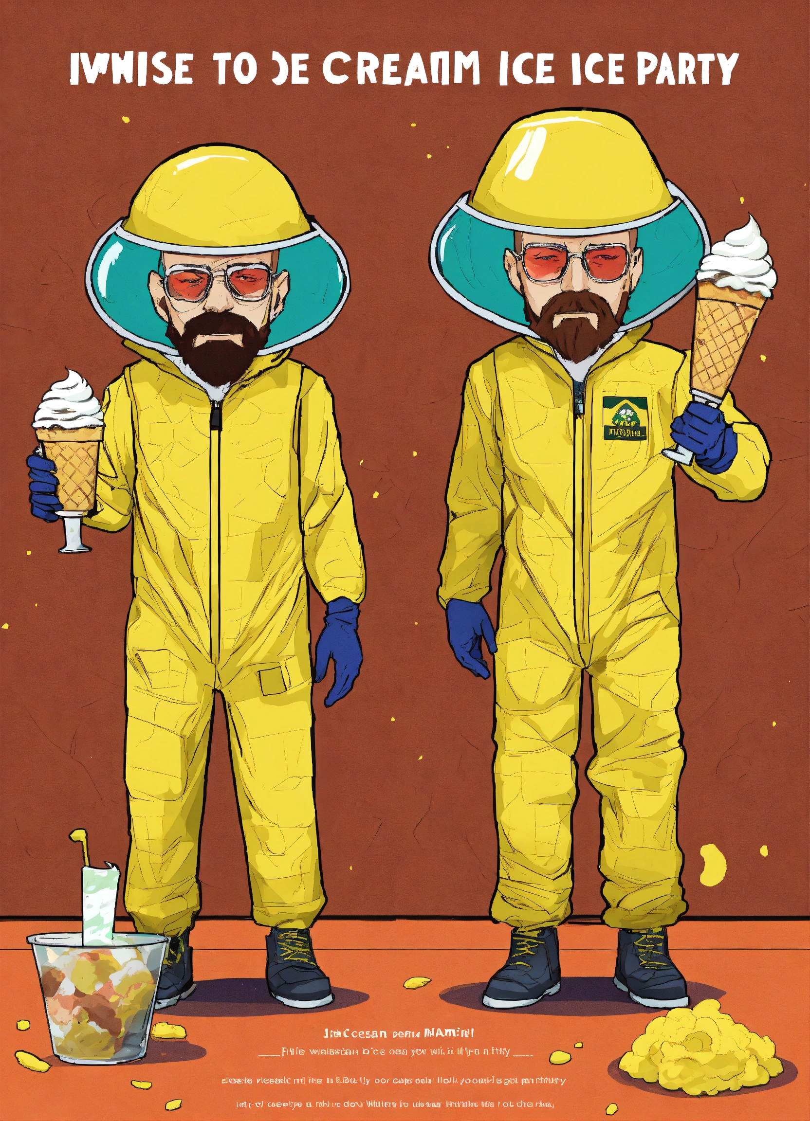 An invitation to an ice cream party, themed like breaking bad, jesse pinkman and walter white from breaking bad should be on the invite but you can't see their faces, they're making ice cream and wearing hazmat suits, style animated