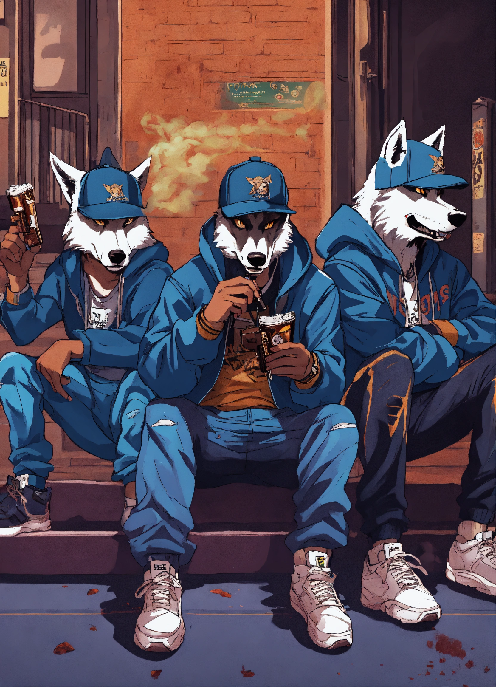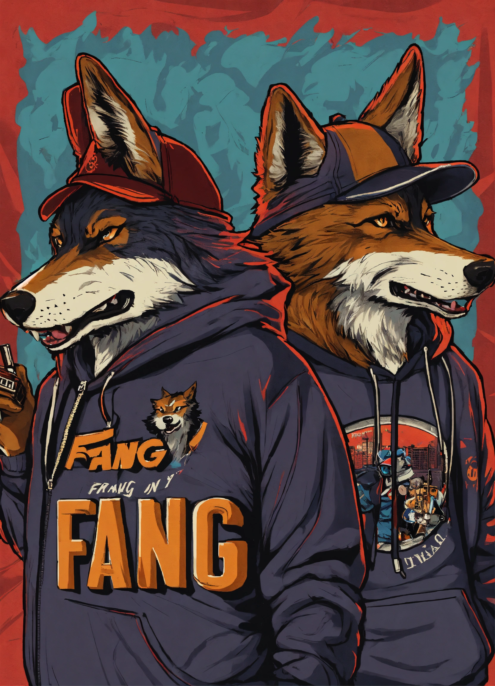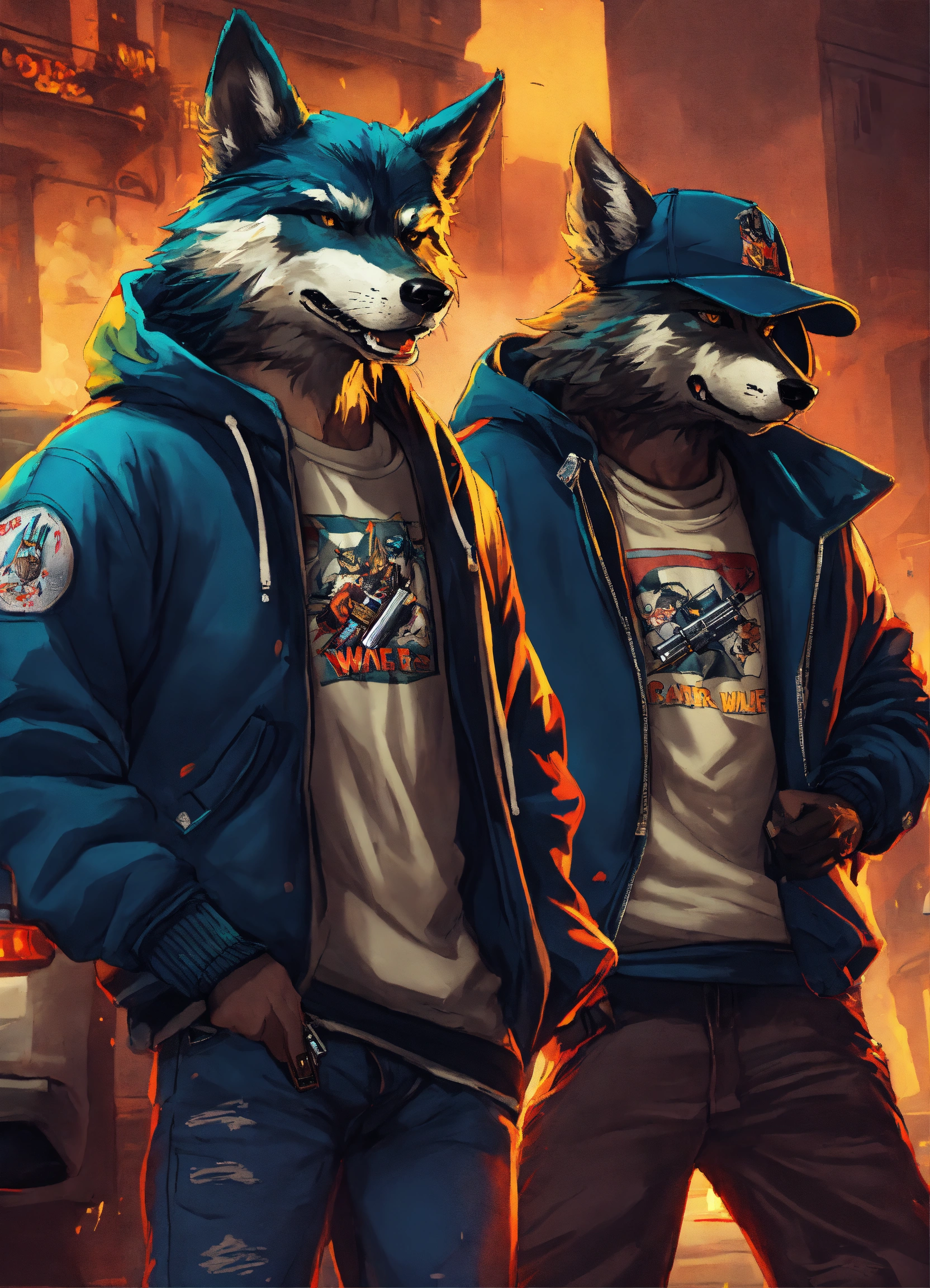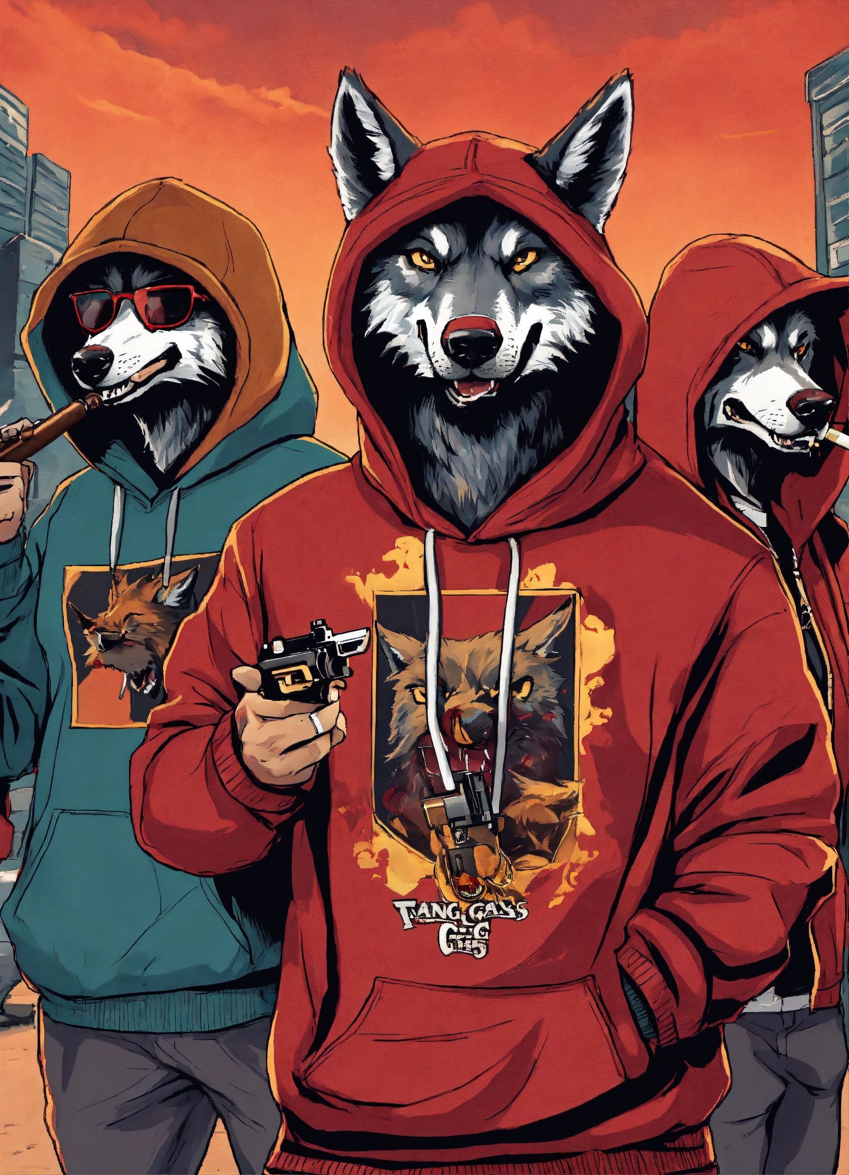 Gangster wolves smoking a cigars and holding guns wearing snapbacks and hoodies that says fang gang on the hoodies, having a street fight
