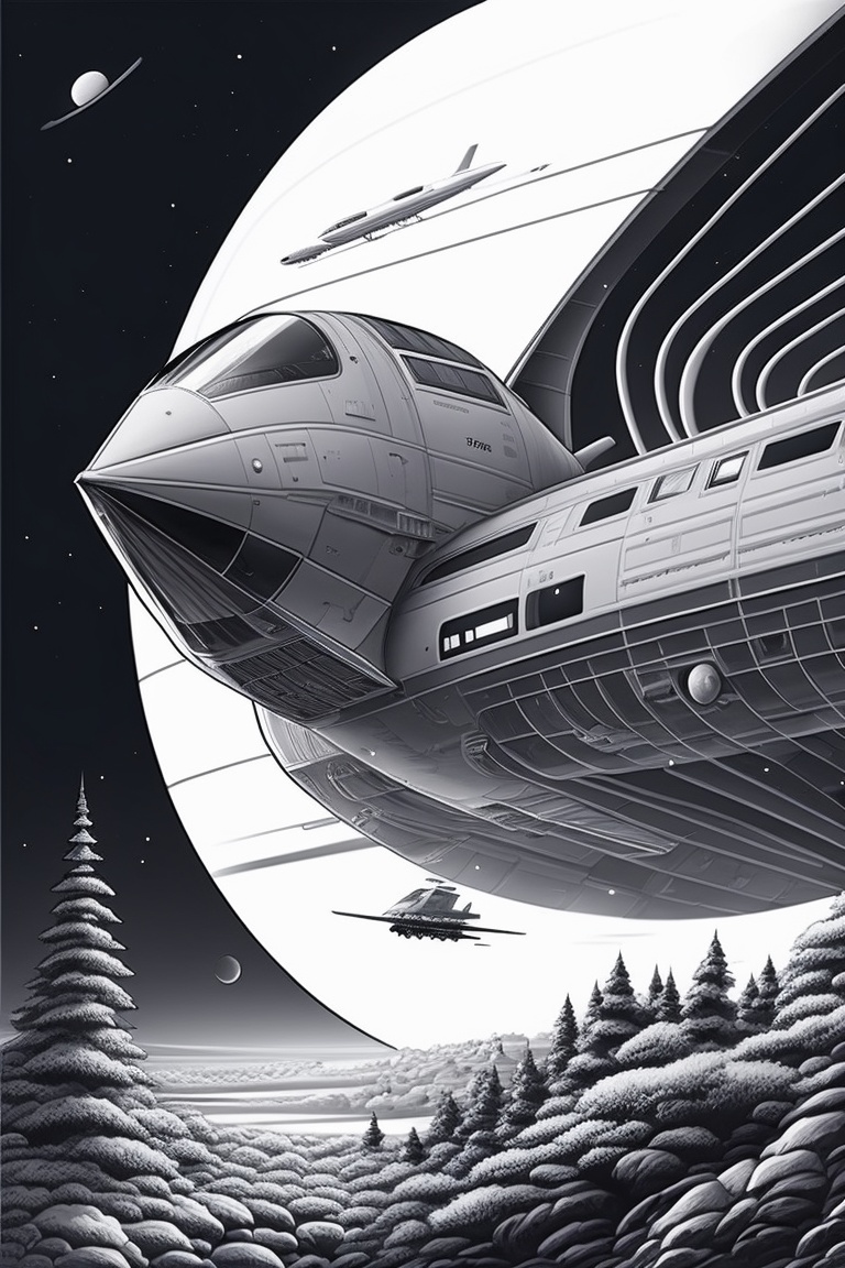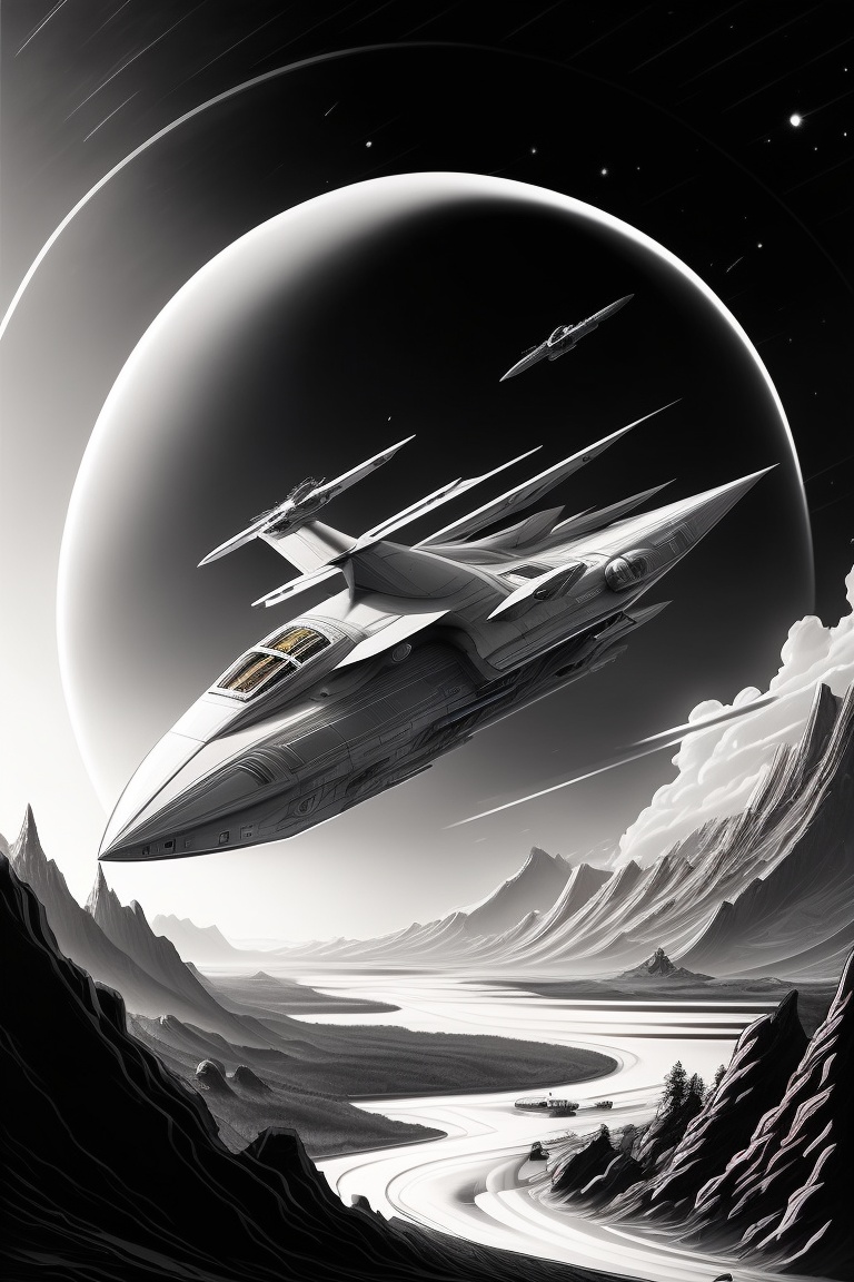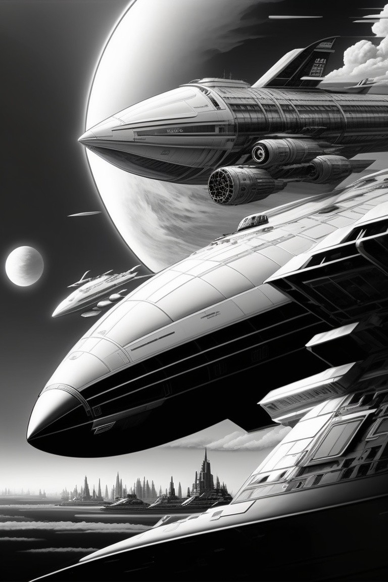 Anime style spaceship, fighting against alien spaceships, detailed line drawing, black and white, planet as background, fine details.