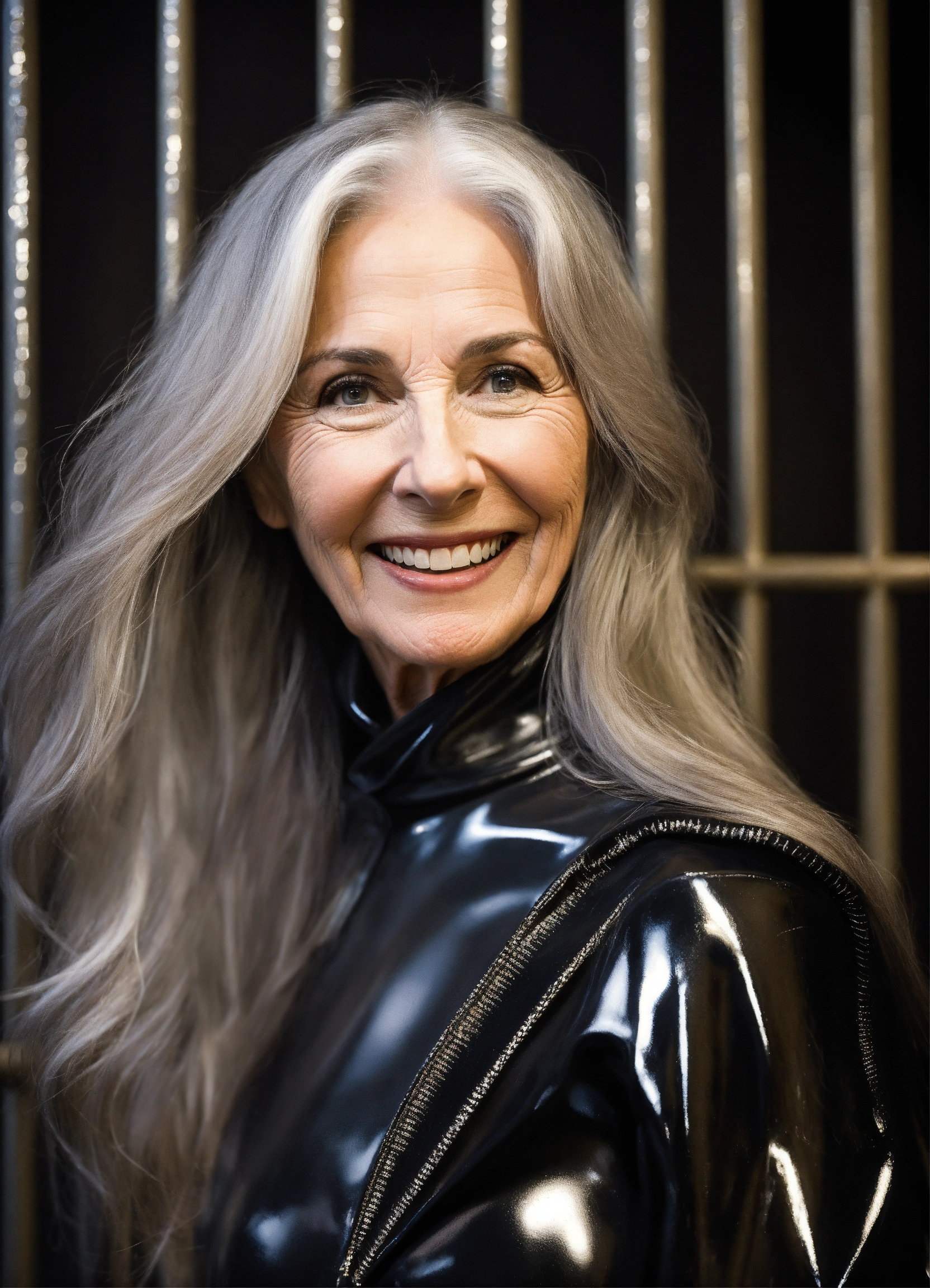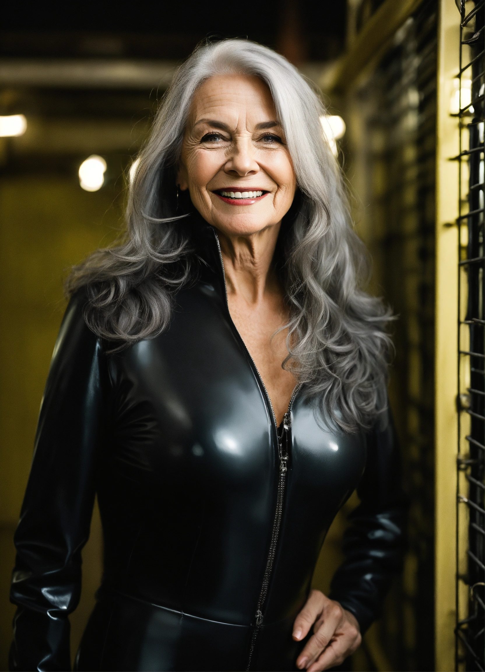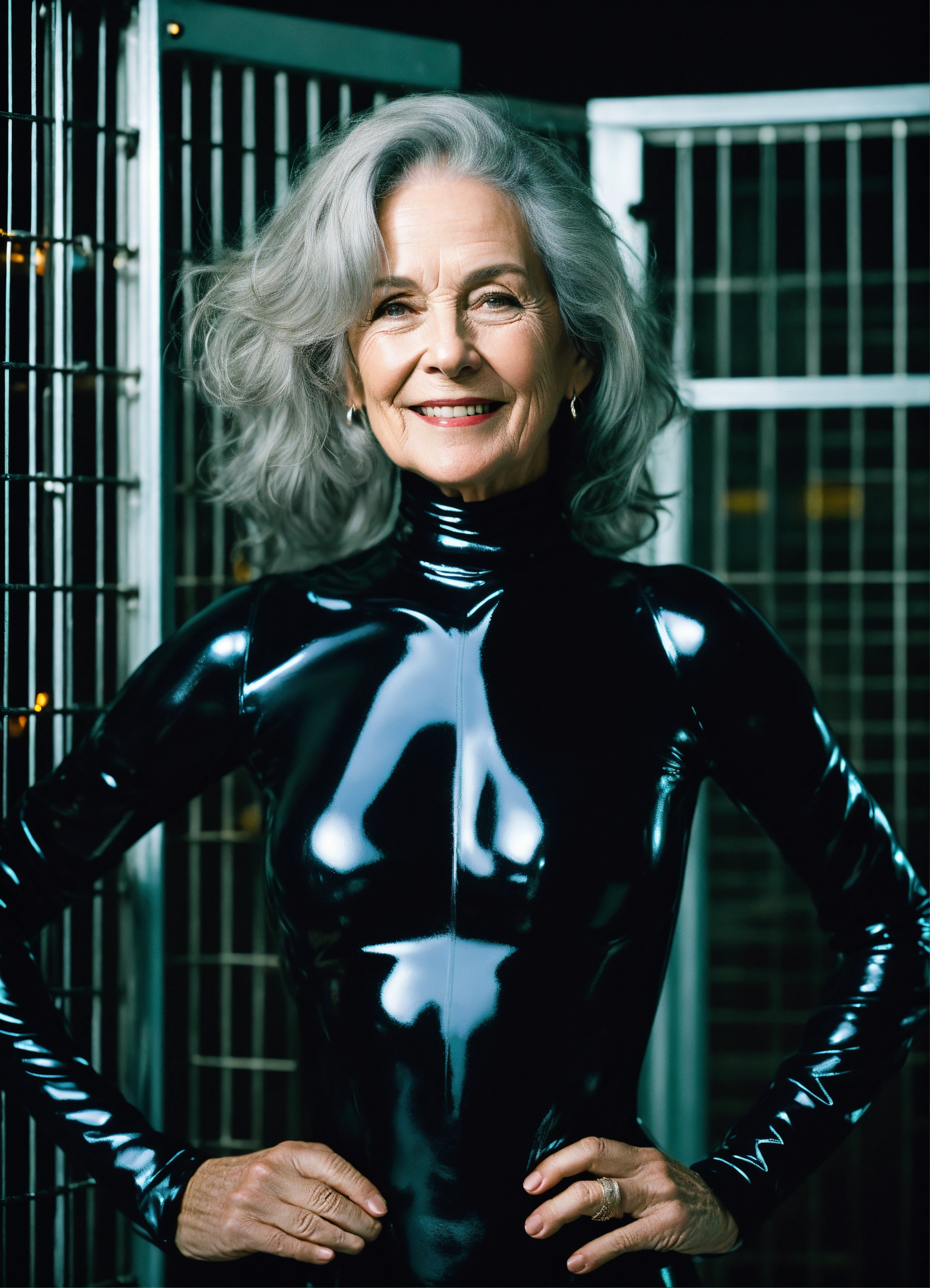 Chic older woman, 65, female, long flowing gray hair, wearing polished black latex suit, standing, from a low angle, mischievous grins, dark, cameras, photo shoot, lights, film camera, movie, jail