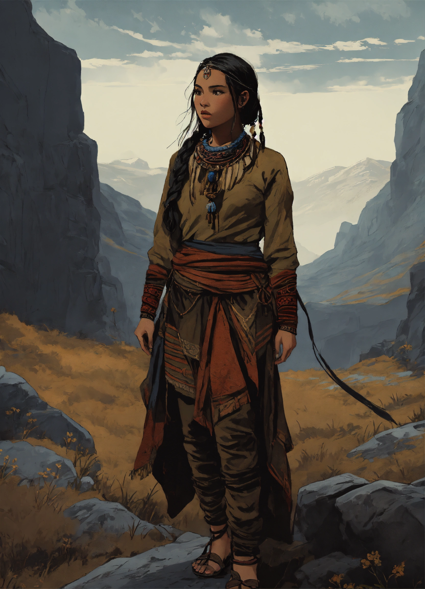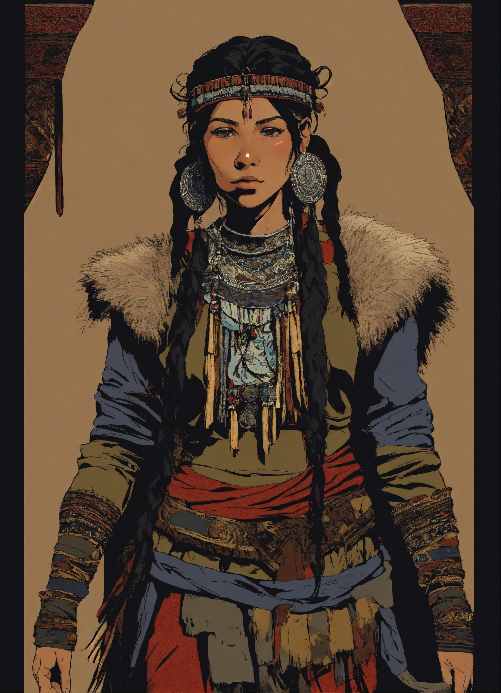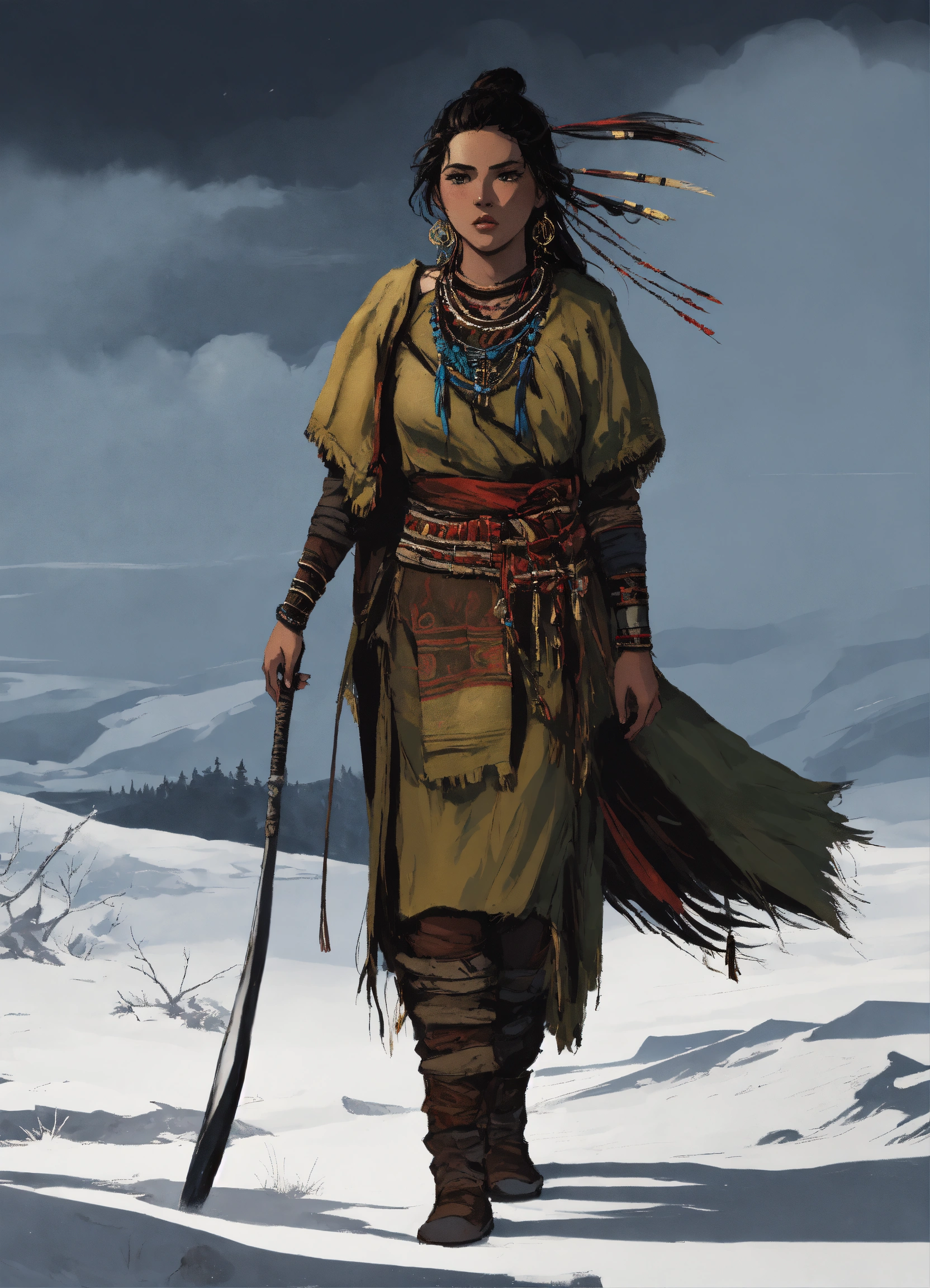 Illustration of a young sámi woman in the style of bernie wrightson. olive skin, black hair, asian phenotype, tribal sámi clothing, tribal adornments, full body. gloomy and depressing atmosphere. dark hues color palette, composition balance, outlined silhouettes, shadows, highlights, intricate details, dark fantasy, narrative-rich illustration, visual compellingness in the style of bernie wrightson. inspired by senua's hellblade and horizon zero dawn.