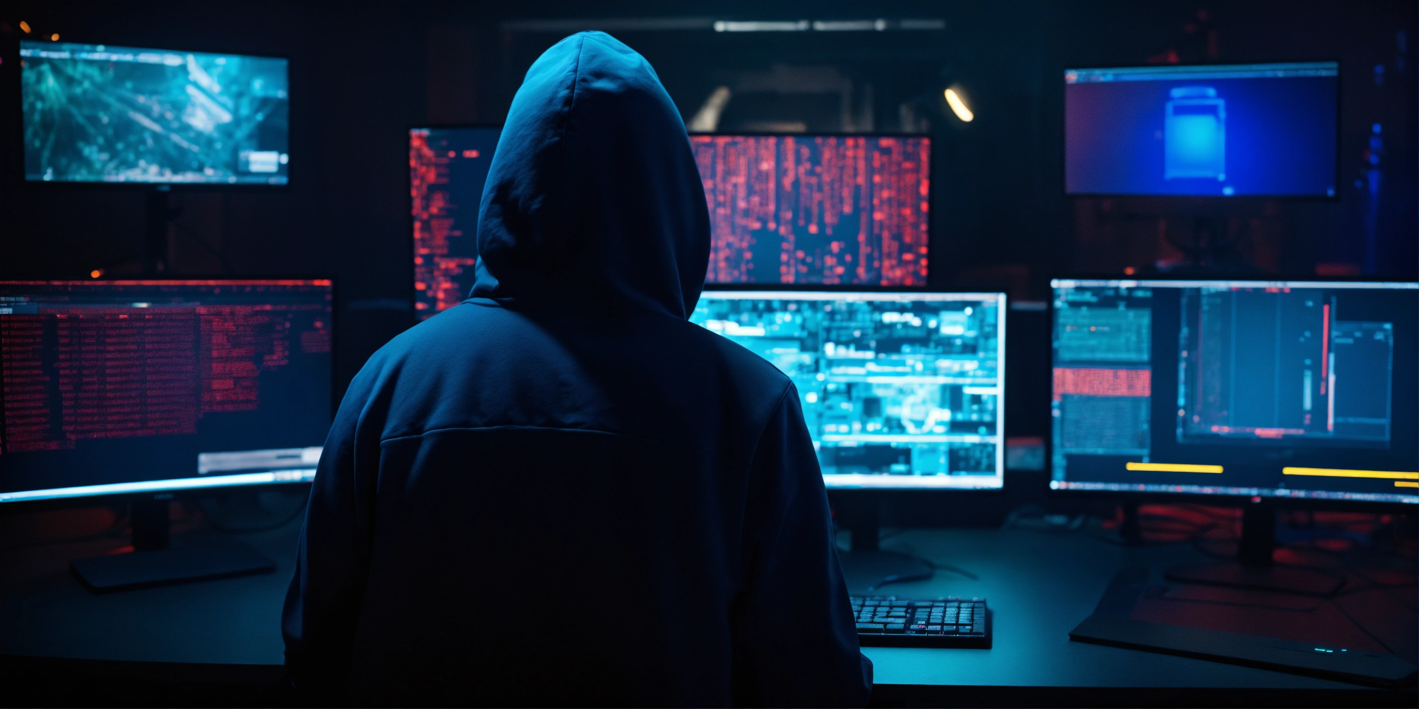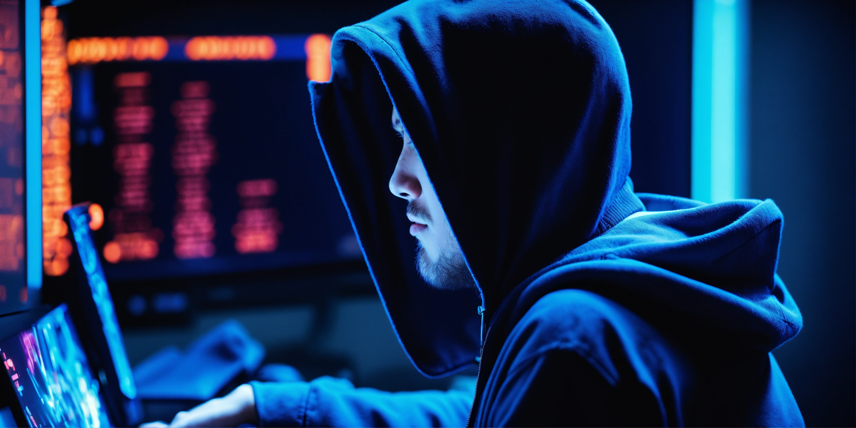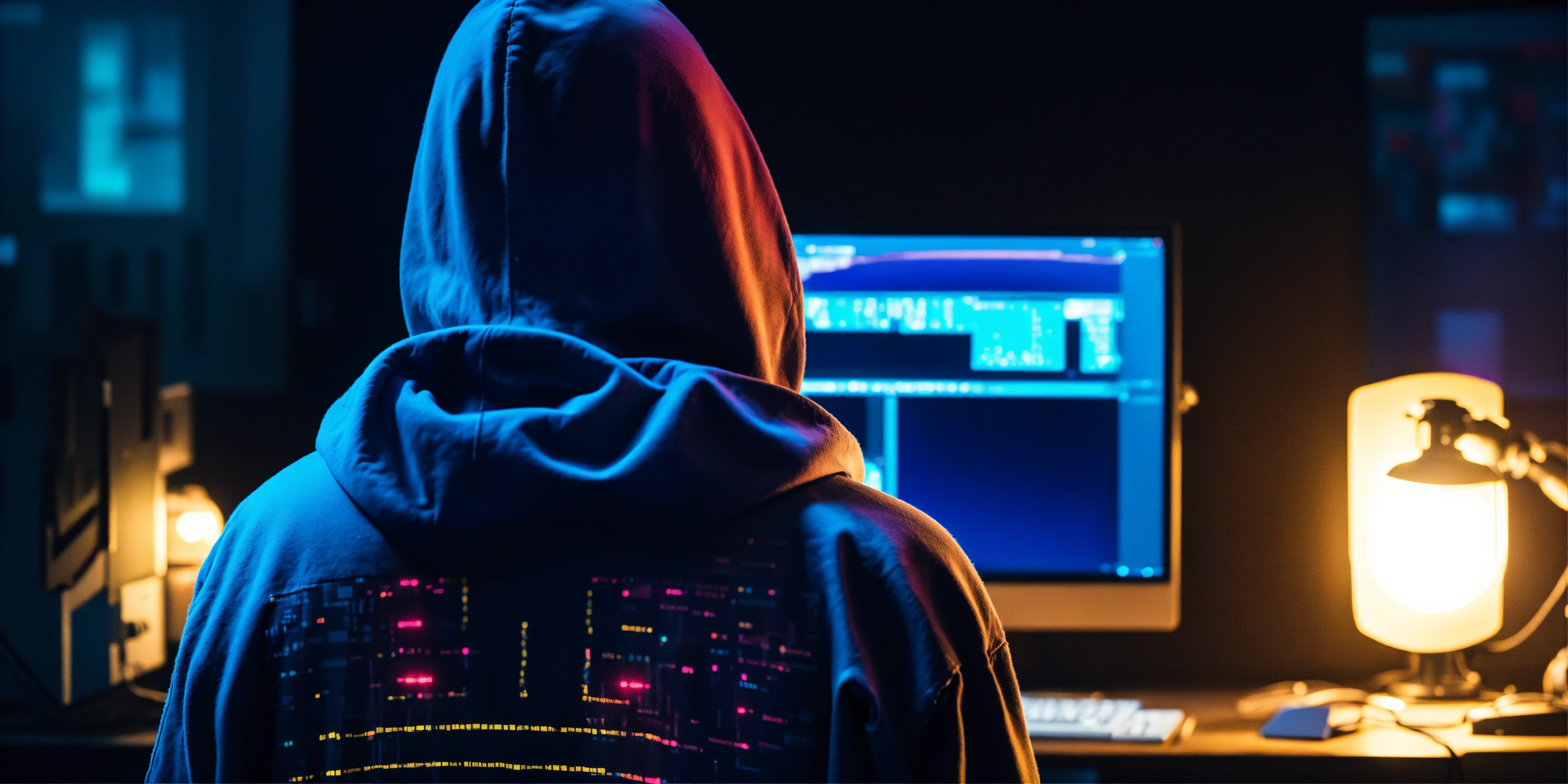 Back view of a hacker on a hoodie front of his computer committing digital cybercrime in a dark room, neon blue colors, closeup, cinematic shot, realistic, film grain, volumetric light, imax, photorealistic