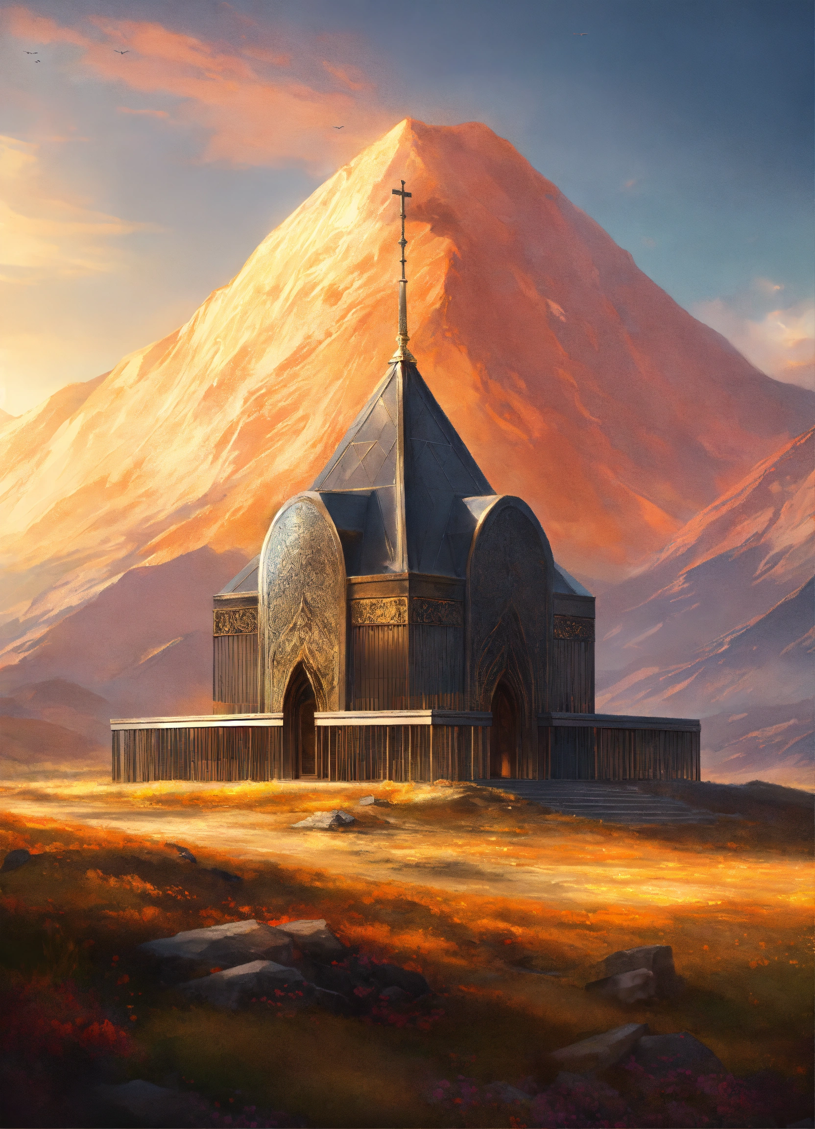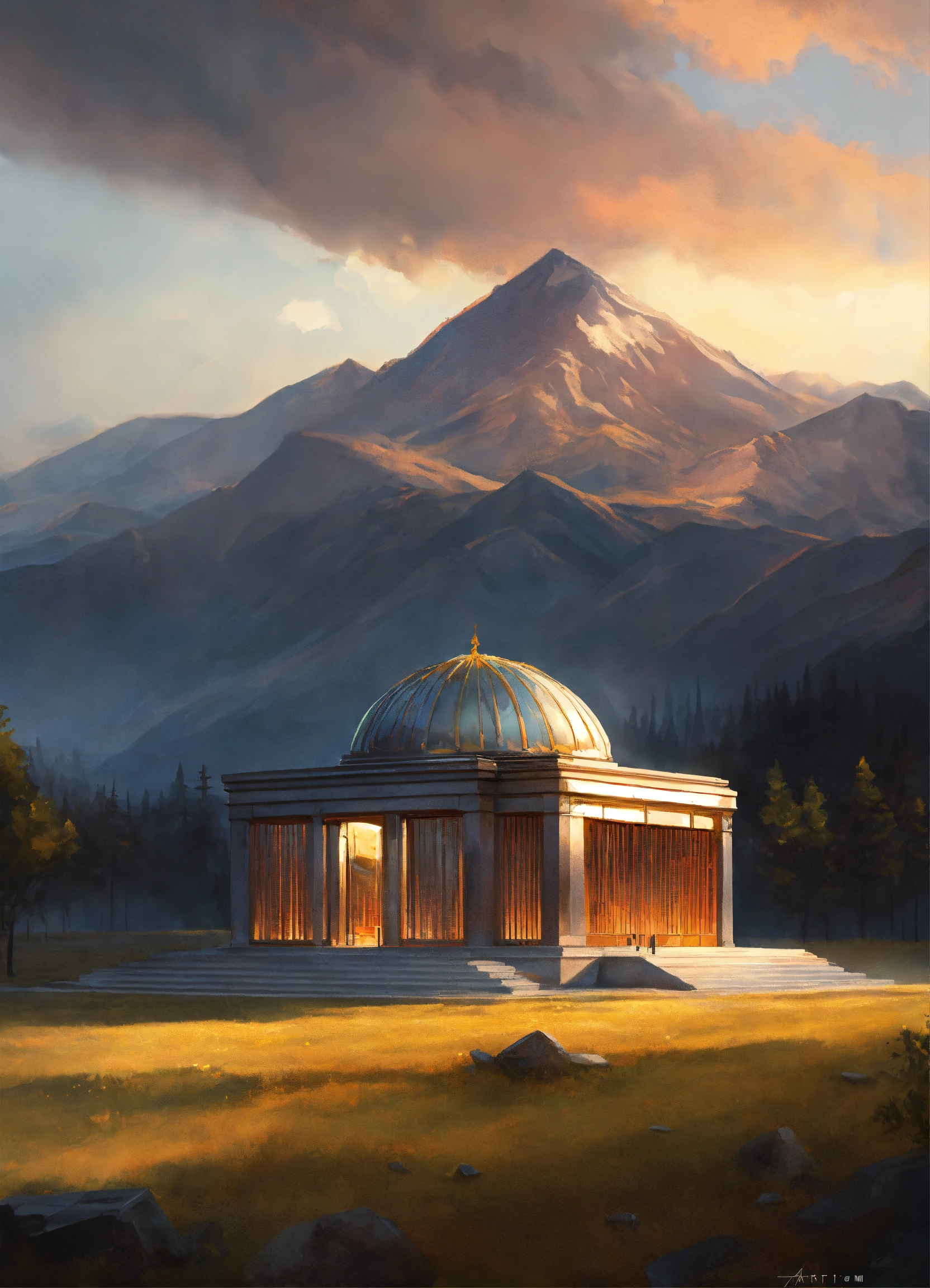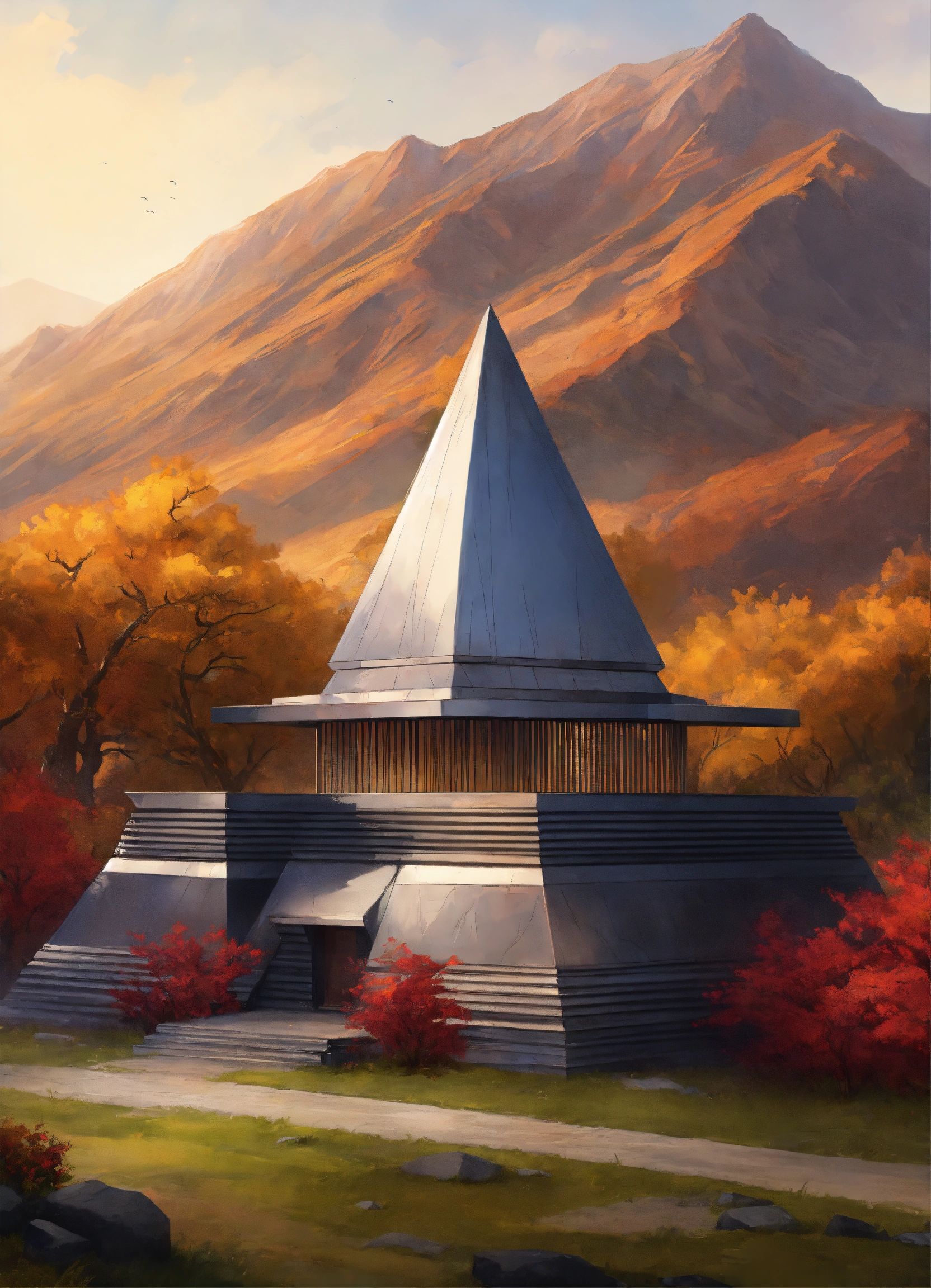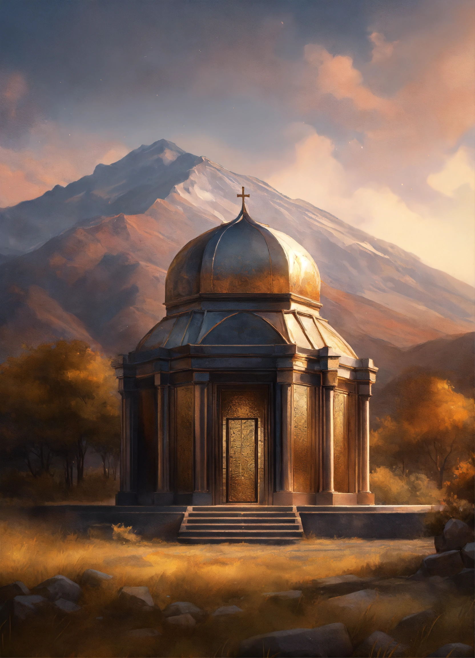 Mausoleum made from metal, simple but beautyfull structure, surroundet by mountains, associated to fire, by artgerm