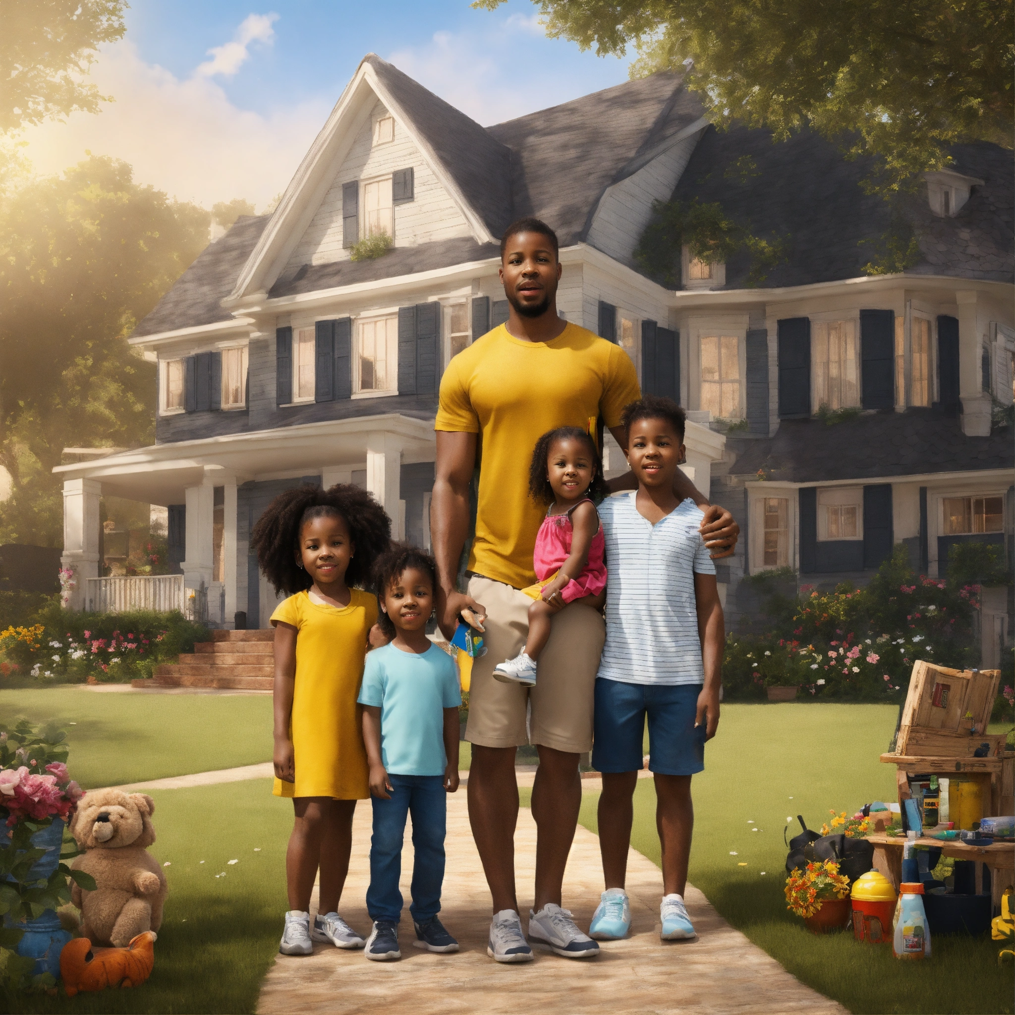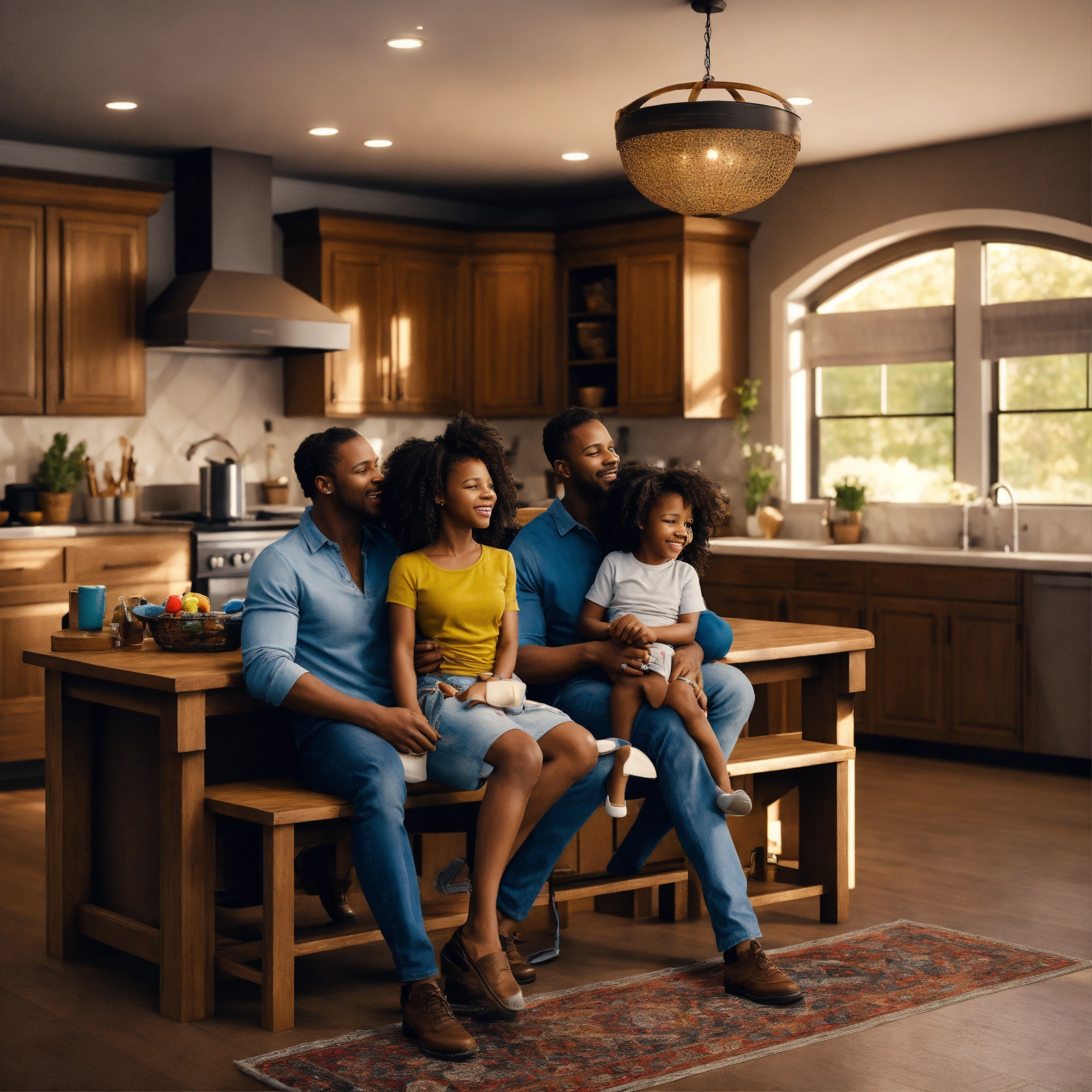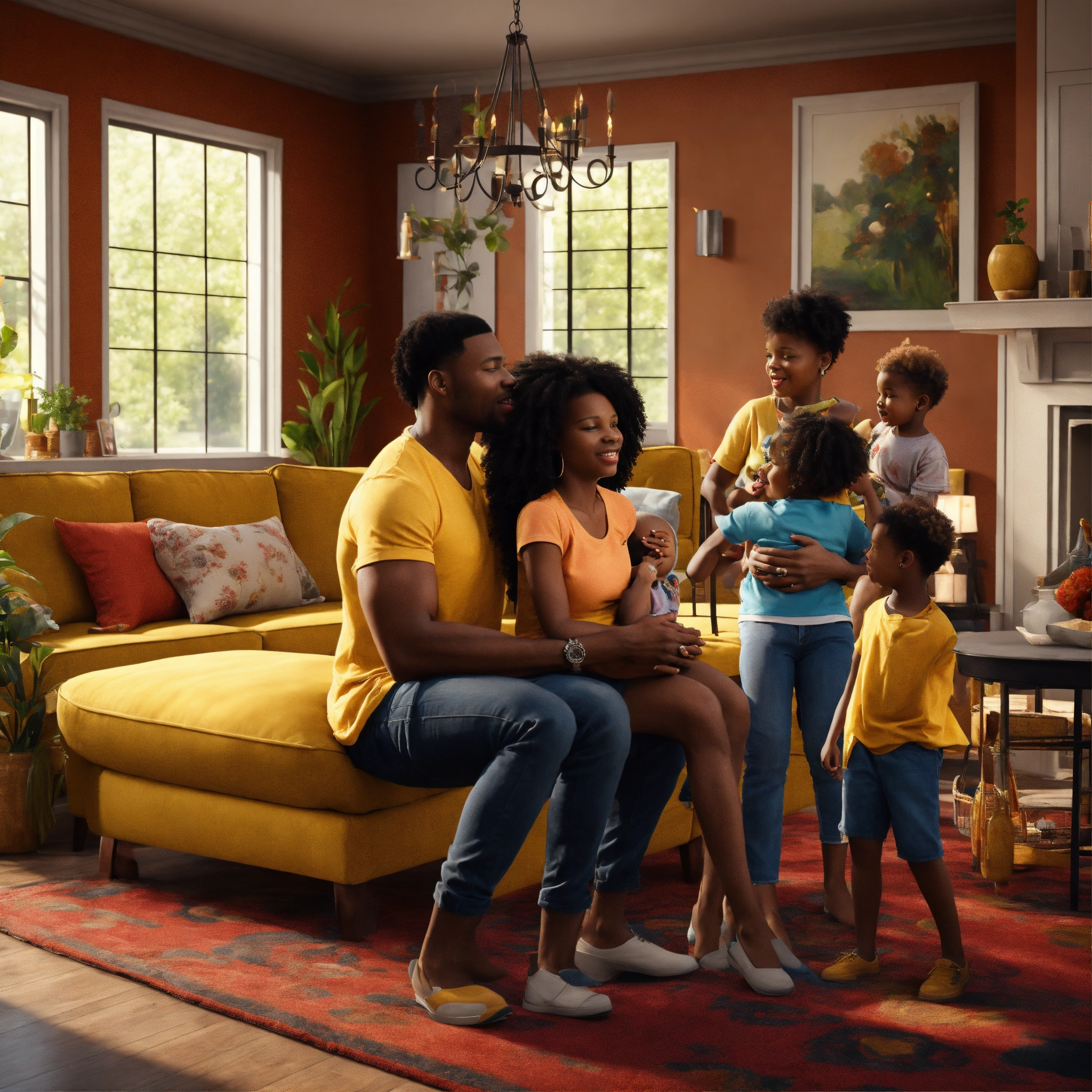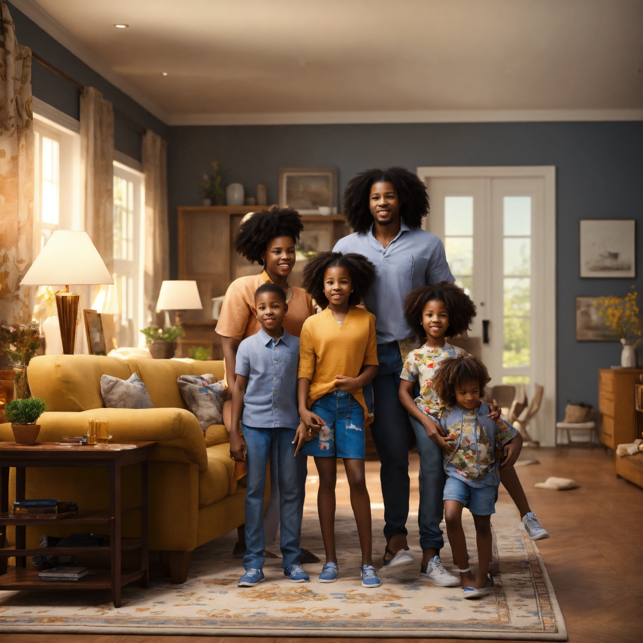 Black husband, black wife, 2 black kids, celebrating inside the house, furnitures in the background, big house, very detailed, extreme realistic, not paint, 4.5k, real photos