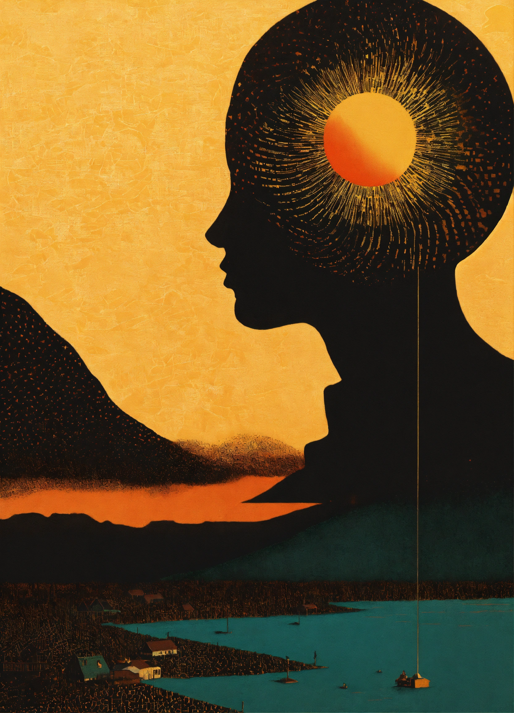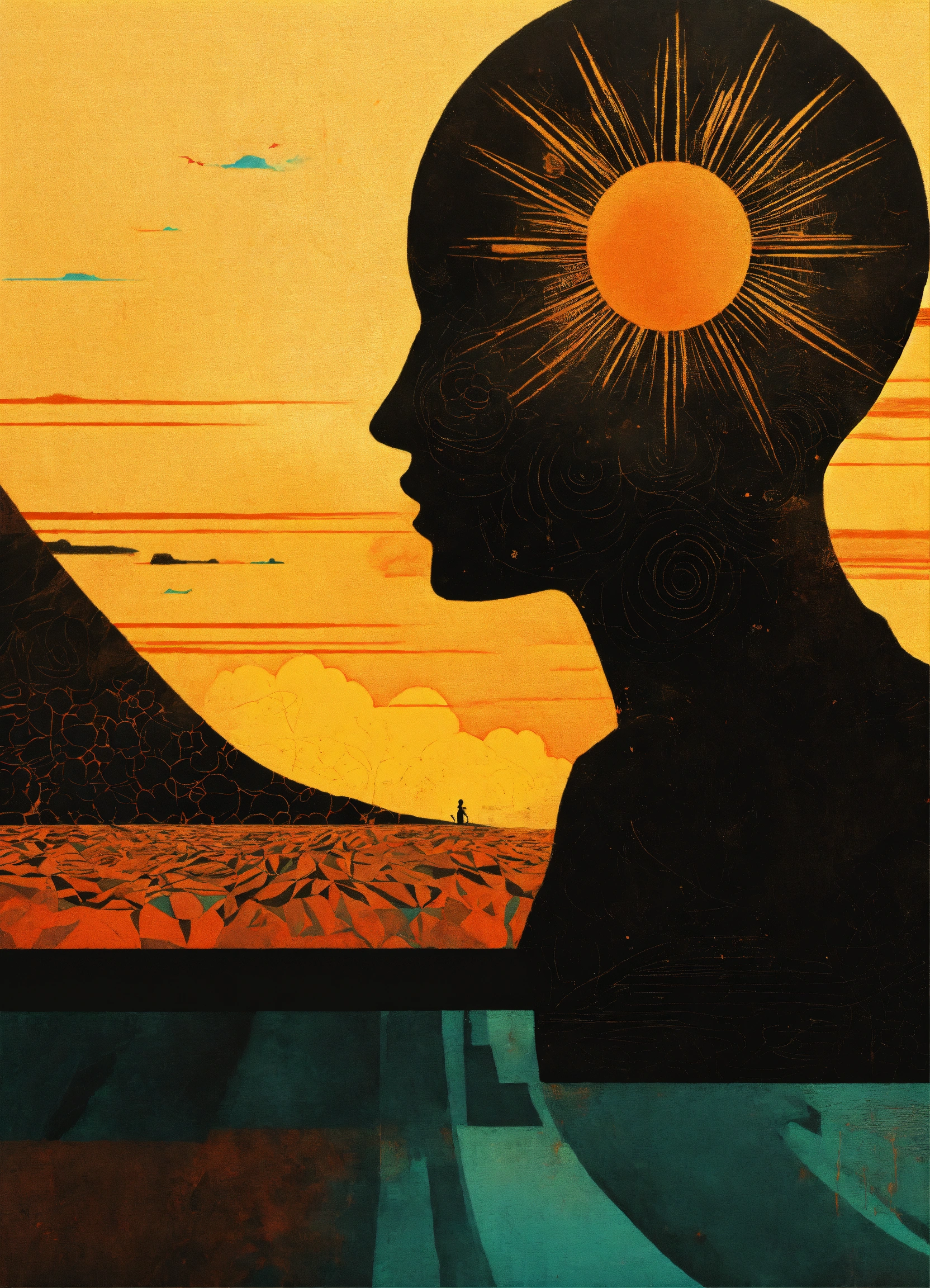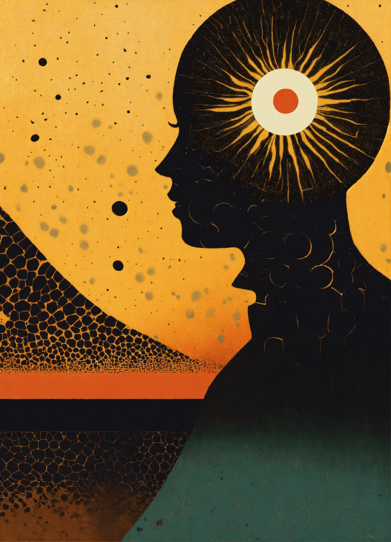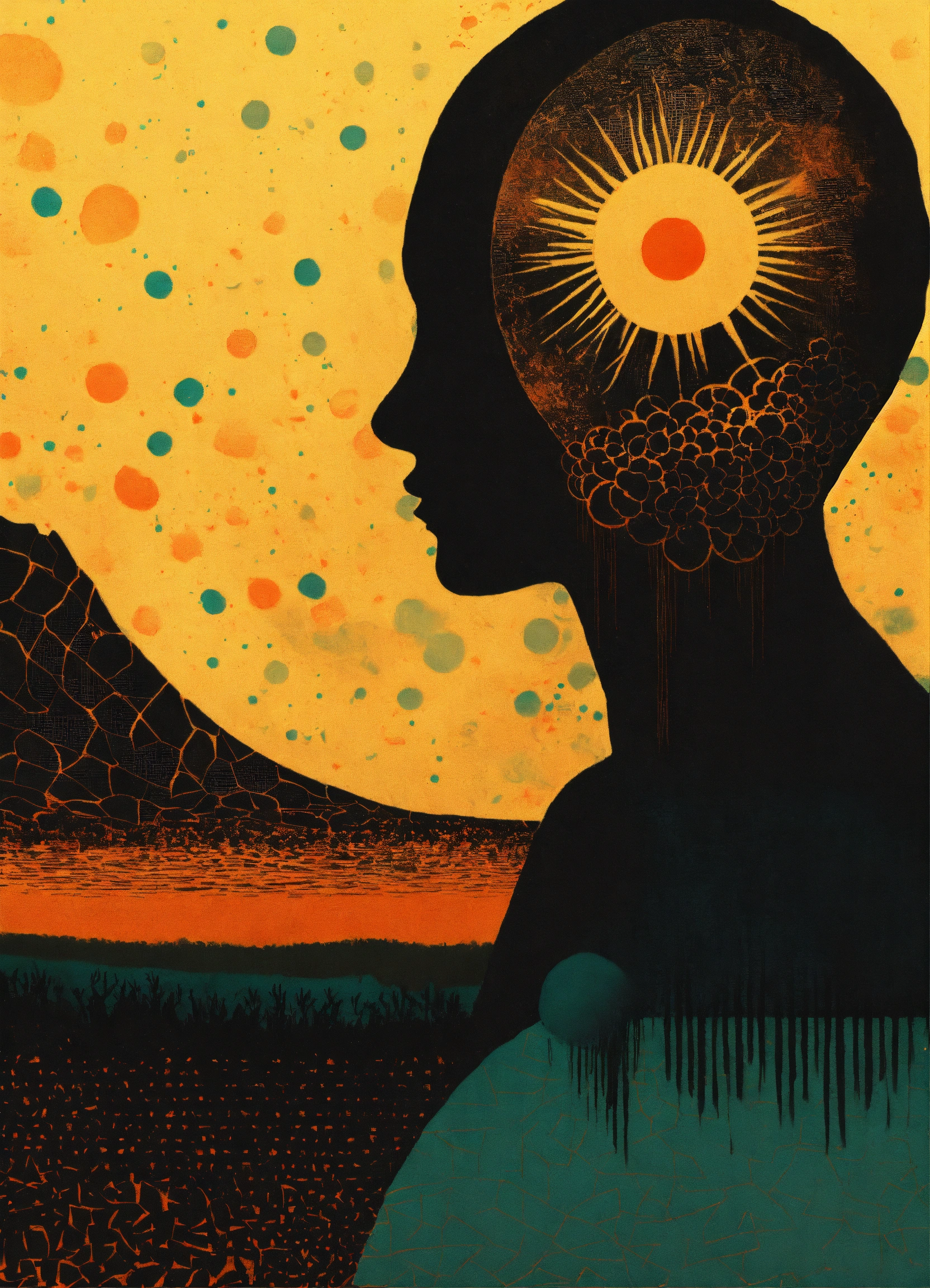 Sun profile + halftone pattern + editorial illustration of the memento morti + higly textured, genre defining mixed media collage painting + fringe absurdism + award winning halftone pattern illustration + simple flowing shapes + subtle shadows + paper texture + minimalist color scheme + inspired by zdzisław beksiński.