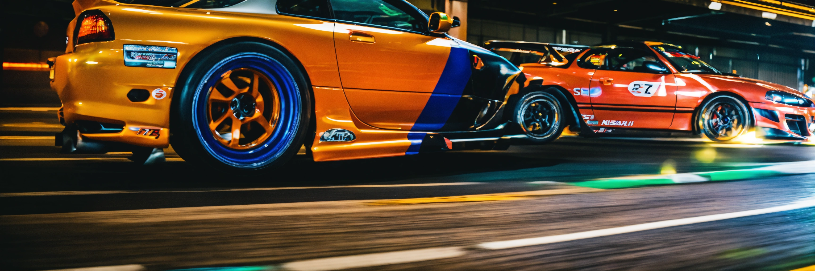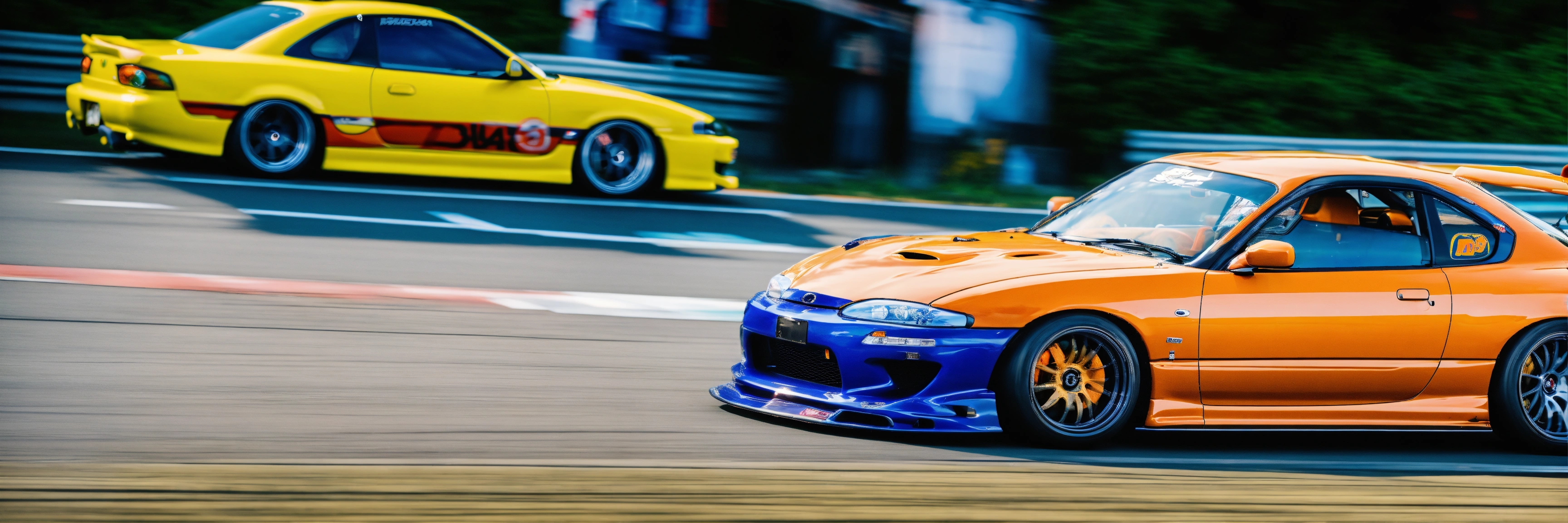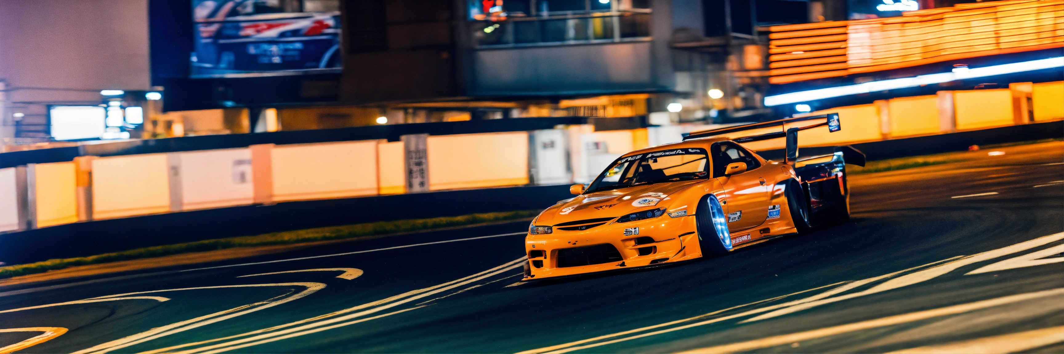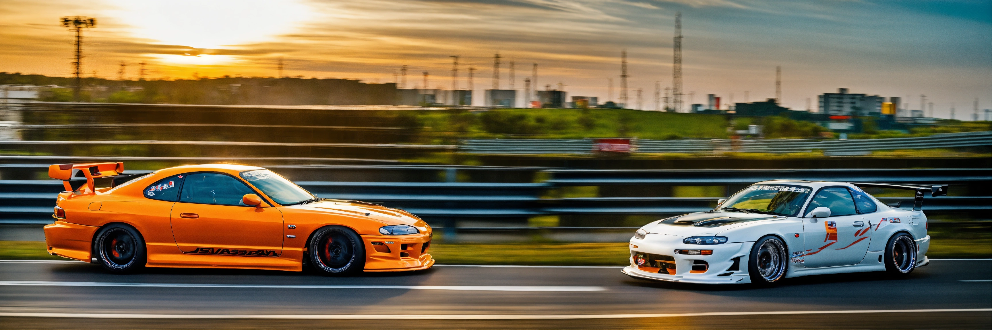 A colorful orange nissan silvia s15 with a wide-body kit racing a white mazda rx7 in tokyo highway
