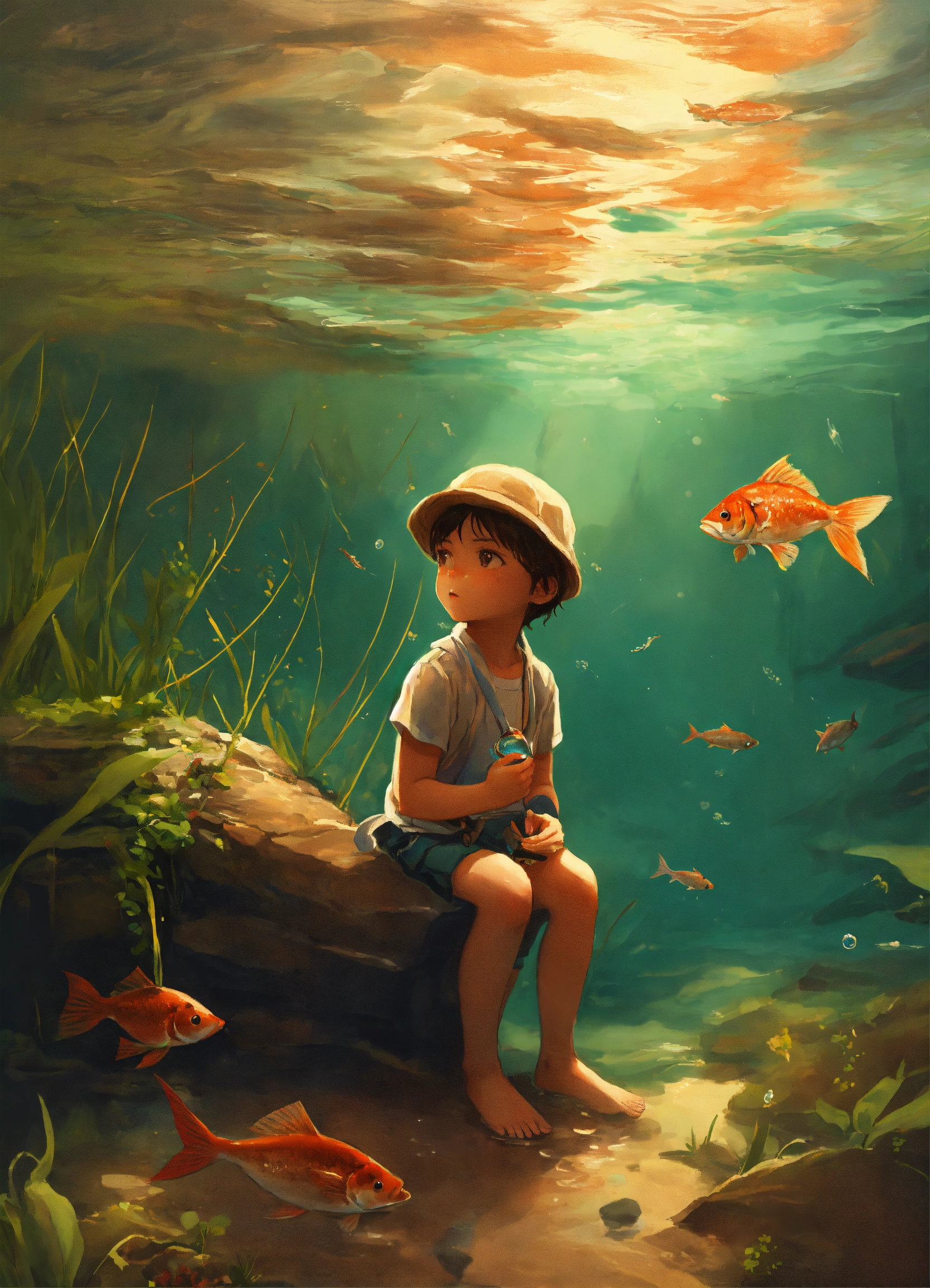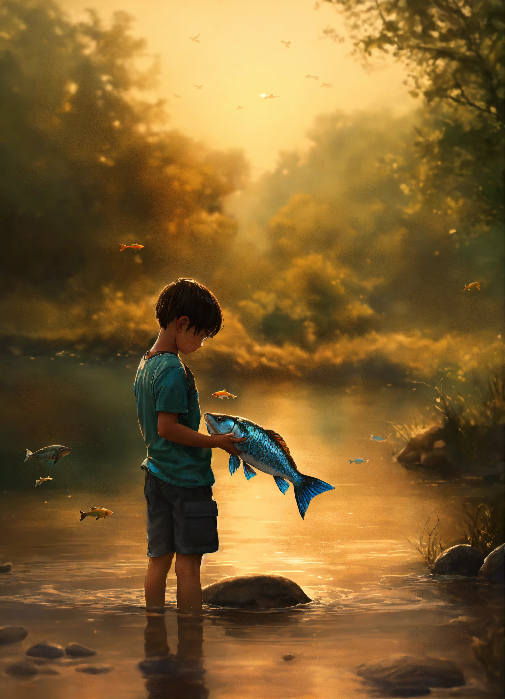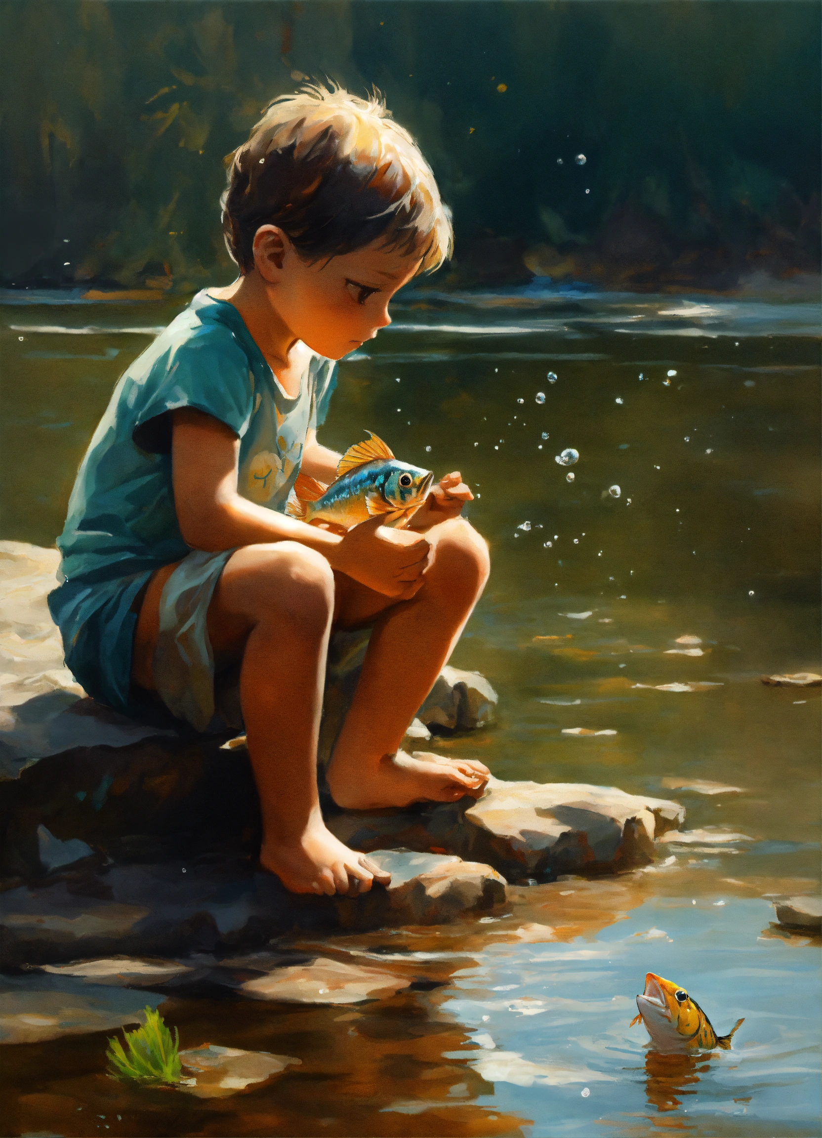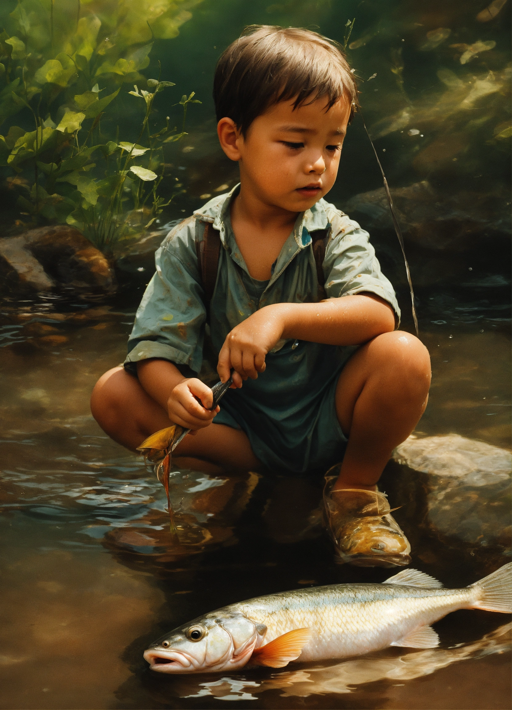 Create an image illustrating a touching and somber moment where a small kid, with a look of curiosity and innocence on their face, is holding a fish they've just taken out of the water. the fish should be depicted in a lifeless state, emphasizing the fragility of its existence outside its aquatic habitat. the scene should convey the idea that 'she'll perish' when removed from the water, evoking a sense of empathy and understanding about the importance of the fish's natural environment."