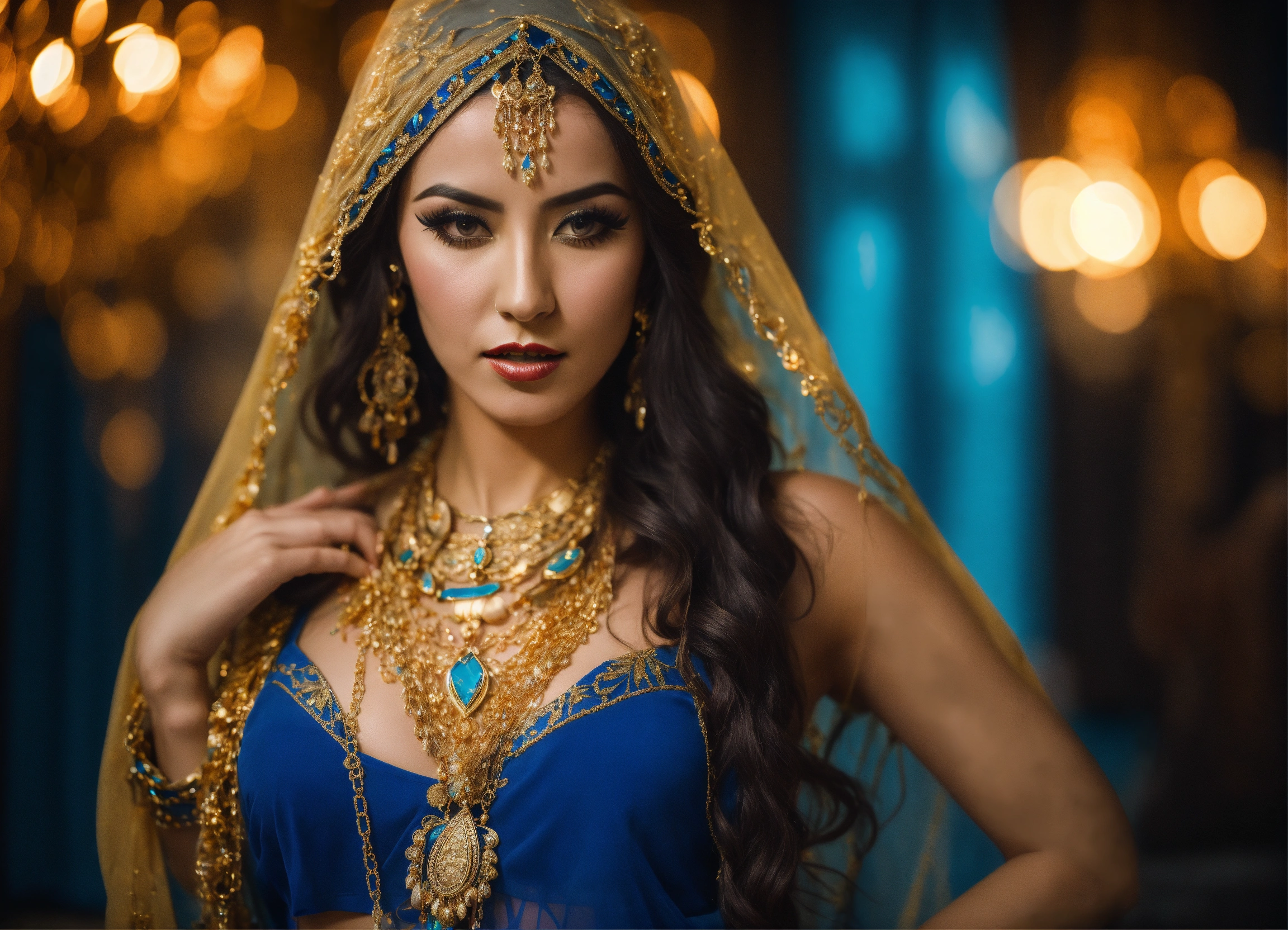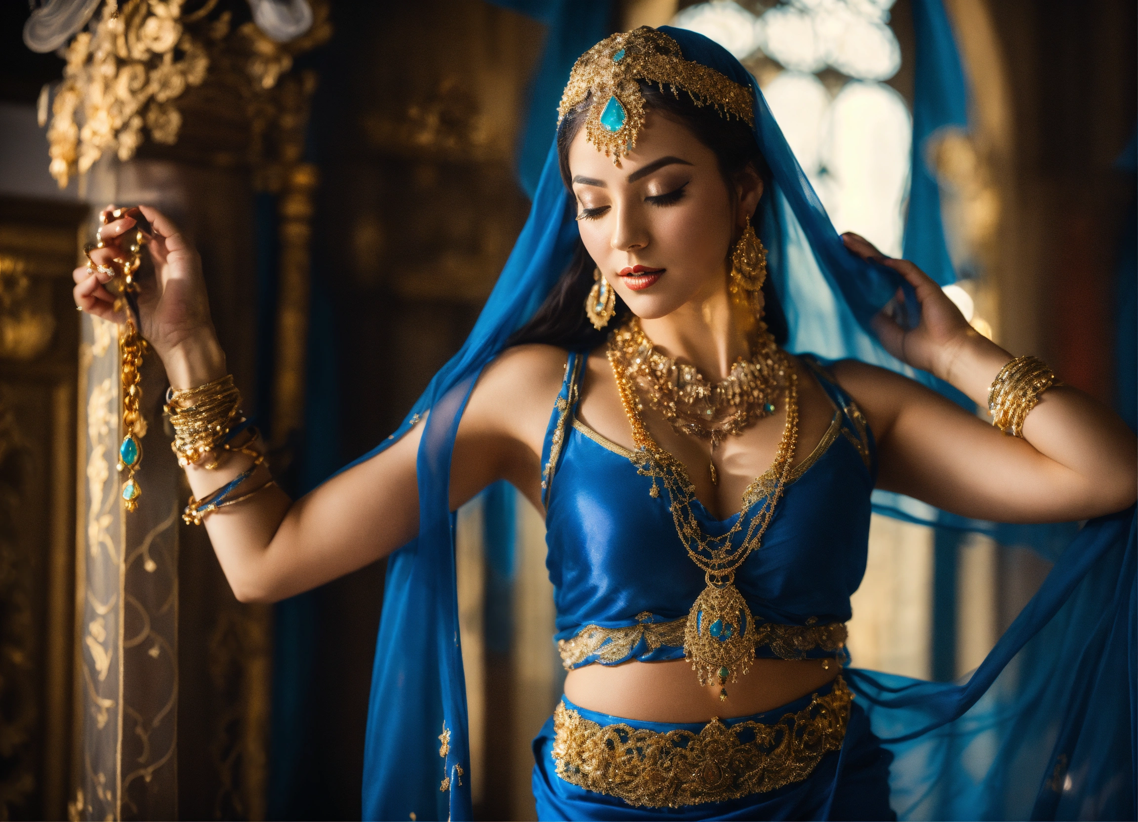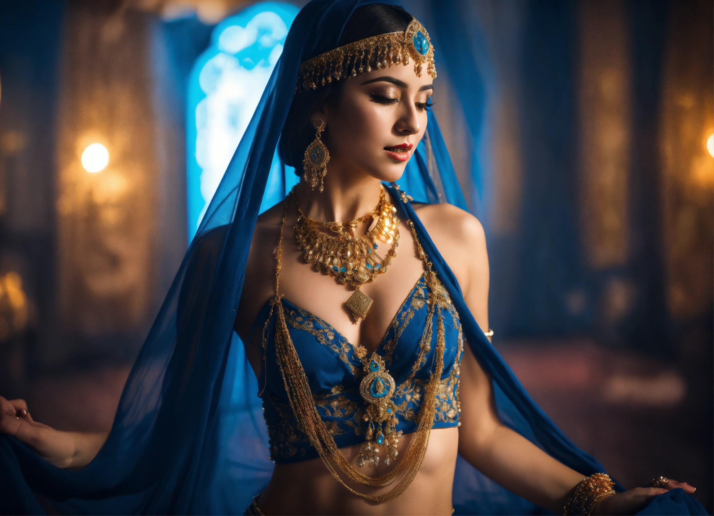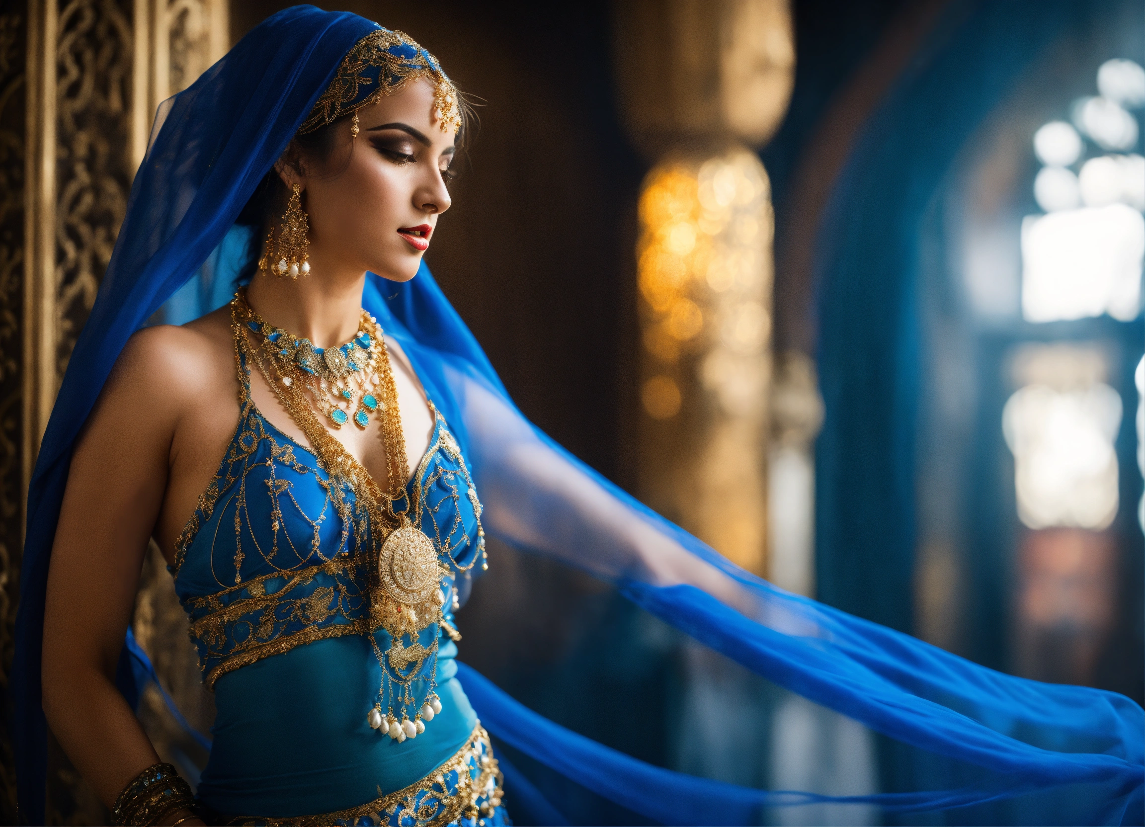 Photo portrait of dynamic belly dancer dancing in oriental palace. with an pendant, a top of gold chains and blue skirt only. hiding behind a transparent veil. three-quarter view.