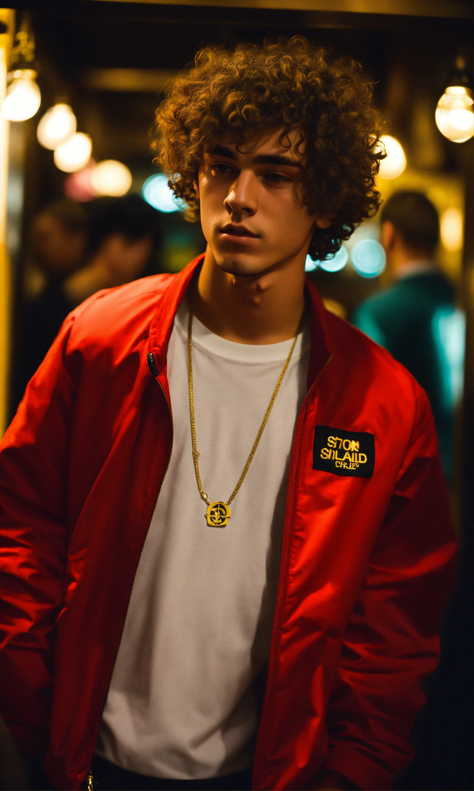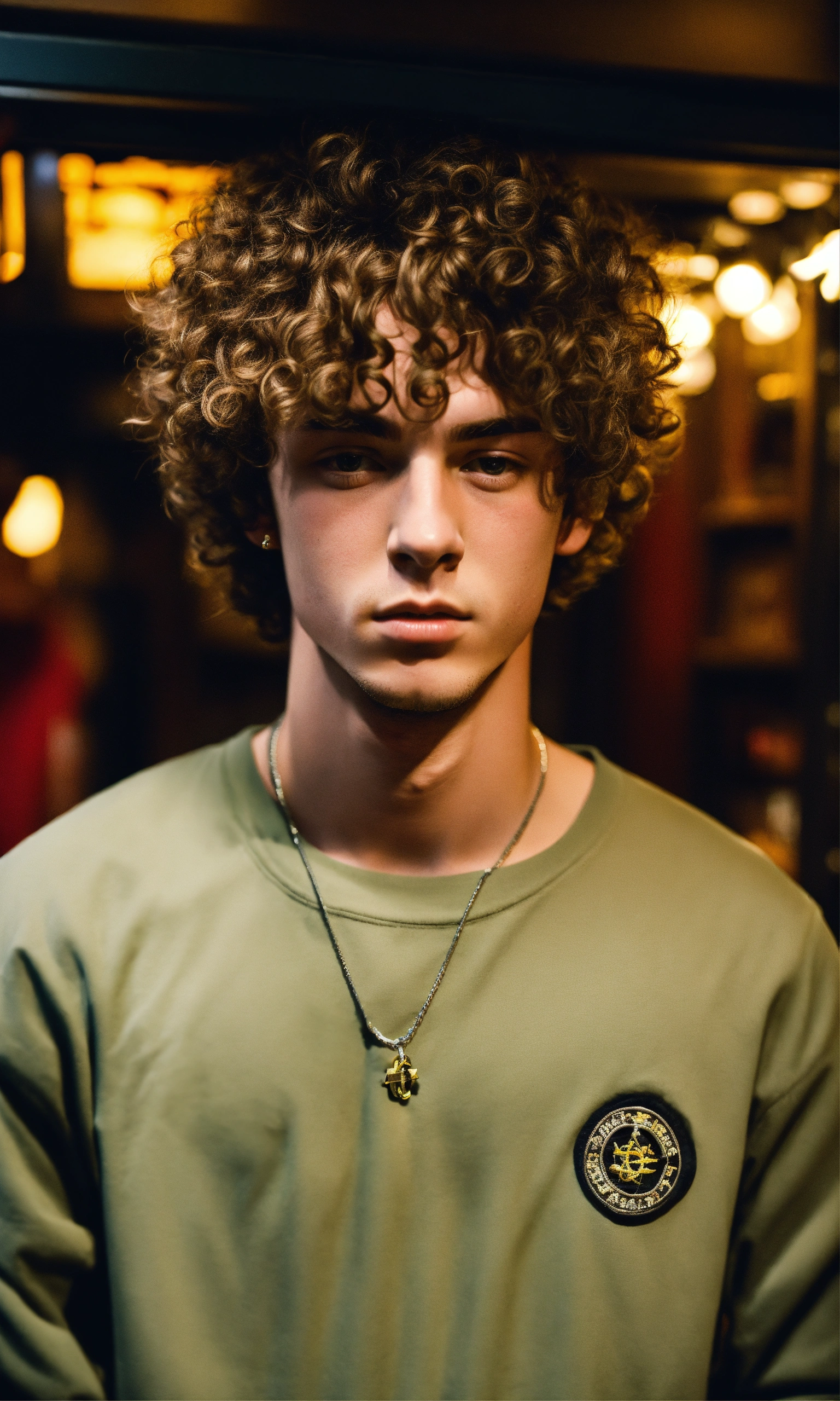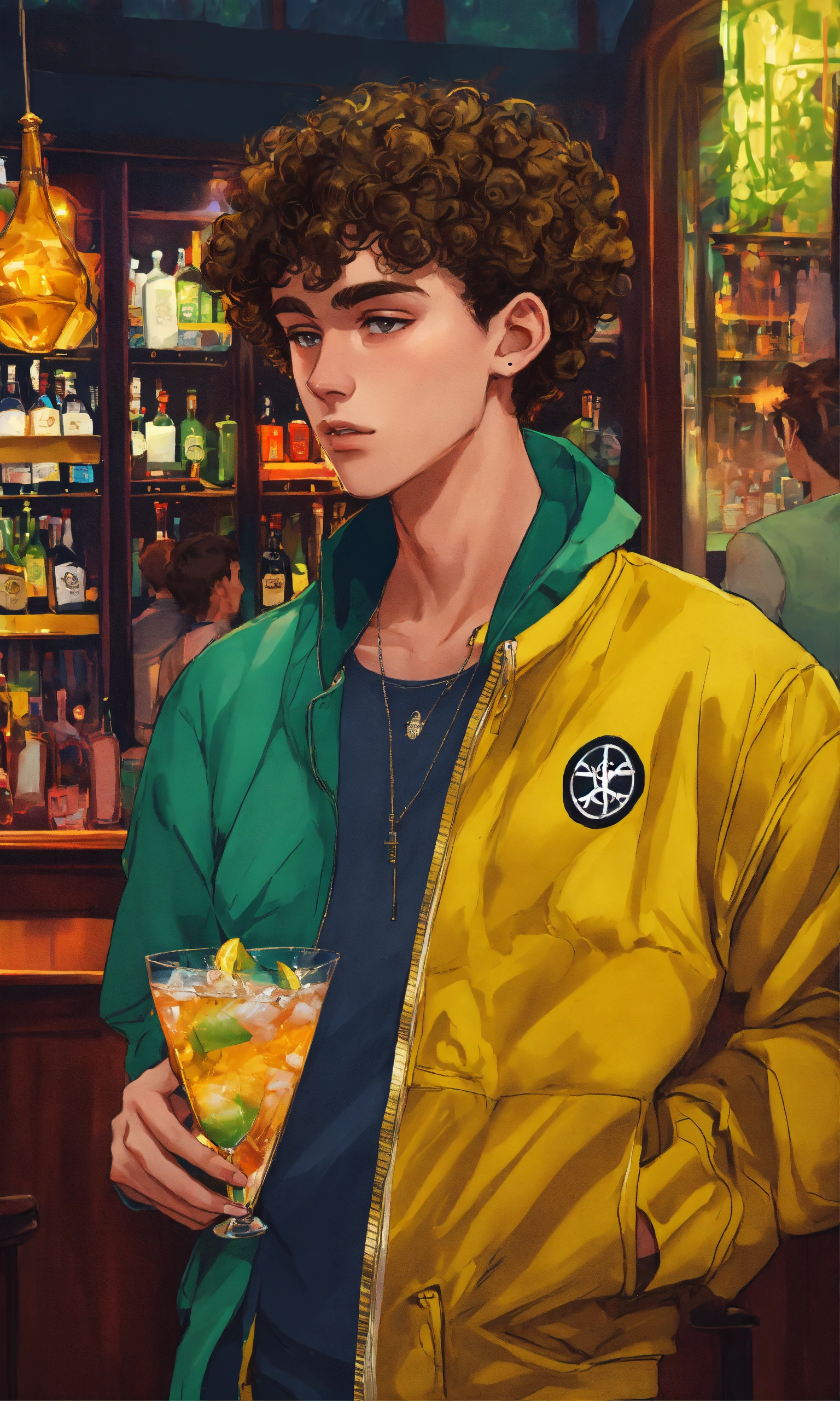 18 year old british chav, he has short curly hair, he is wearing stone island, he is entering a cocktail bar with 2 other guys