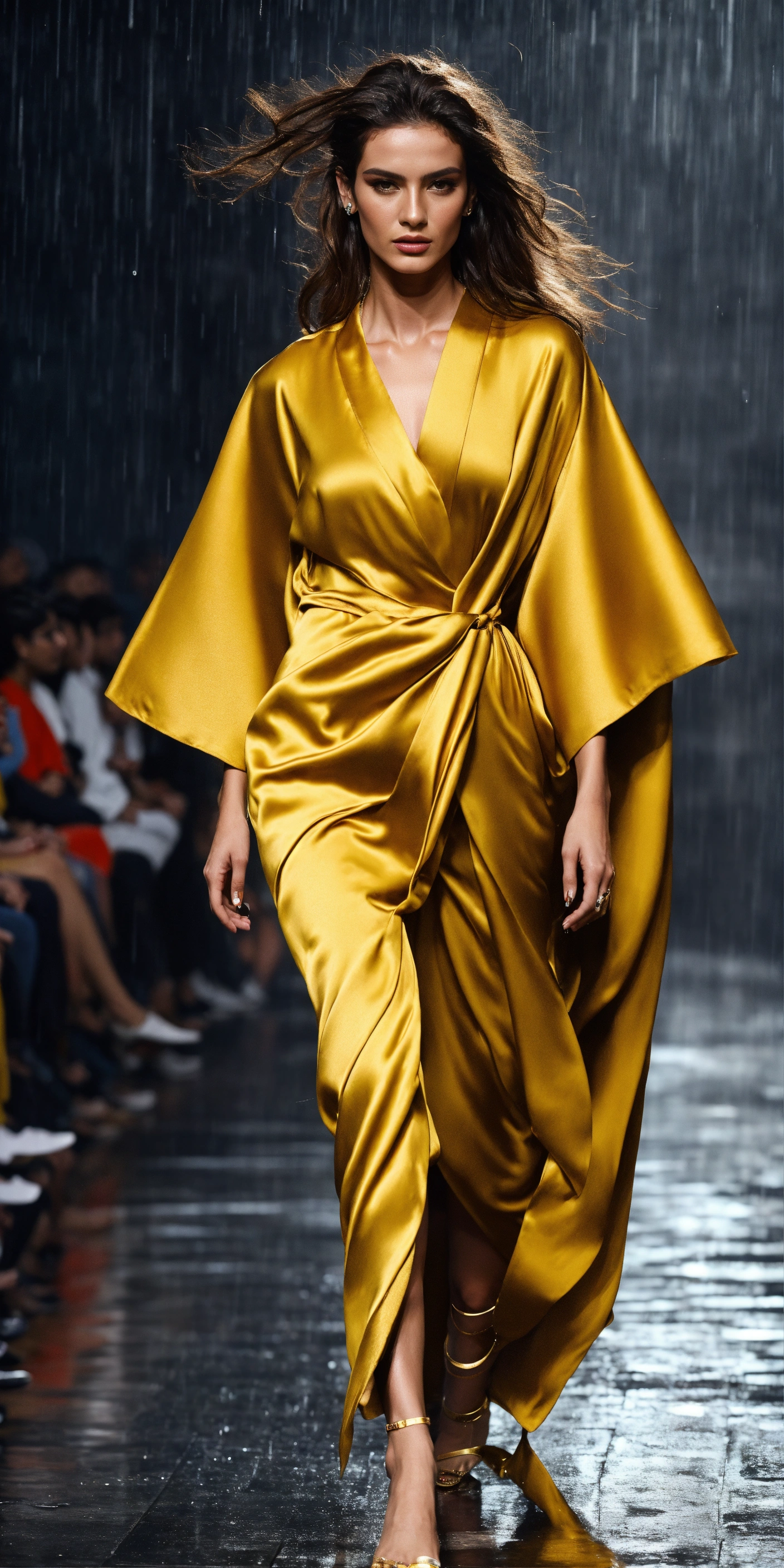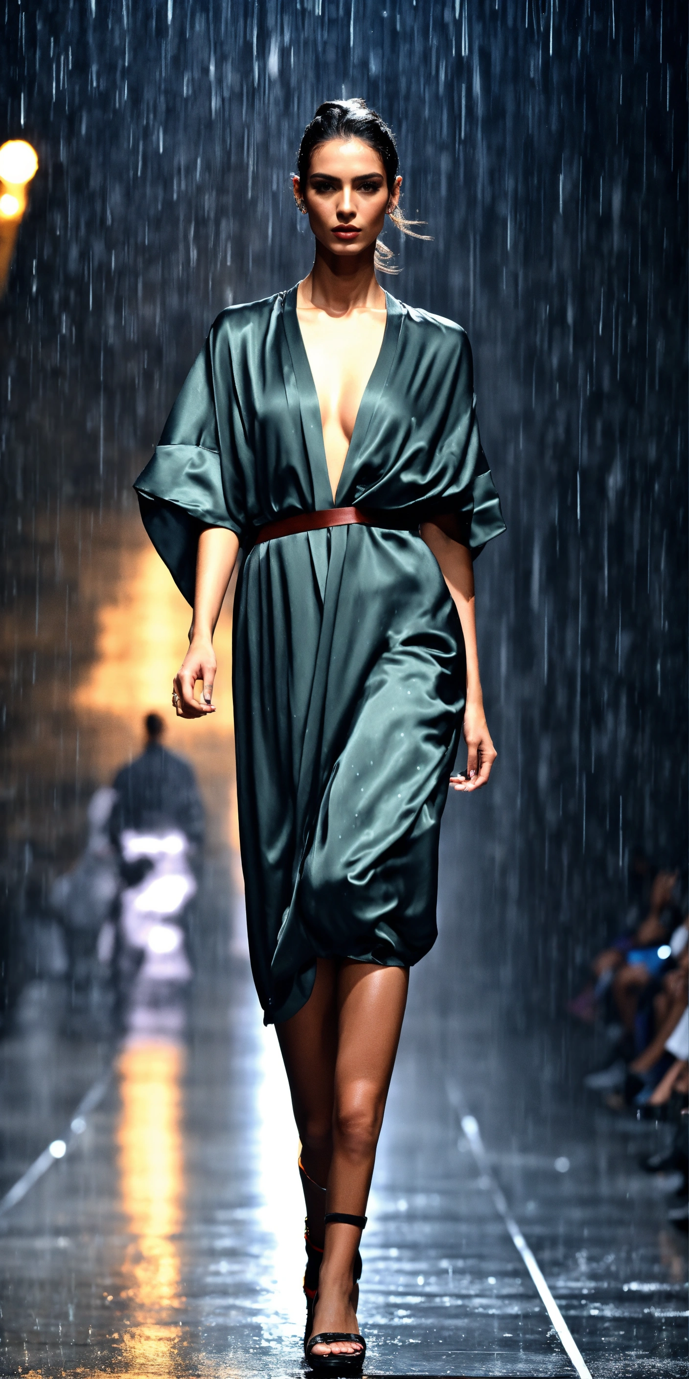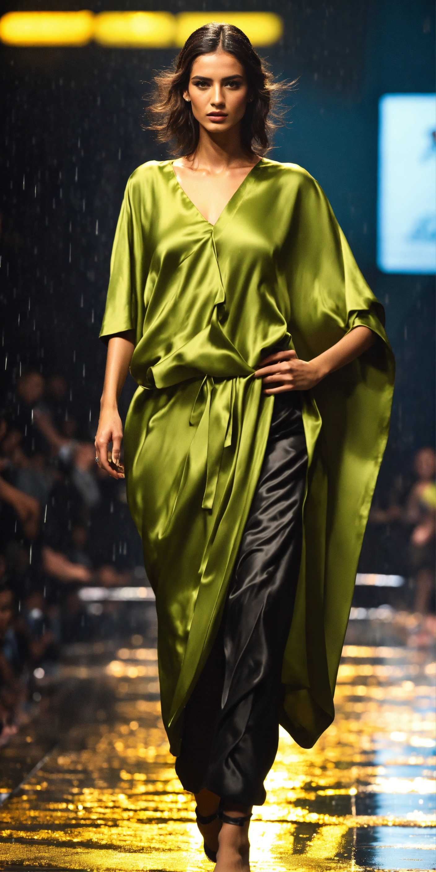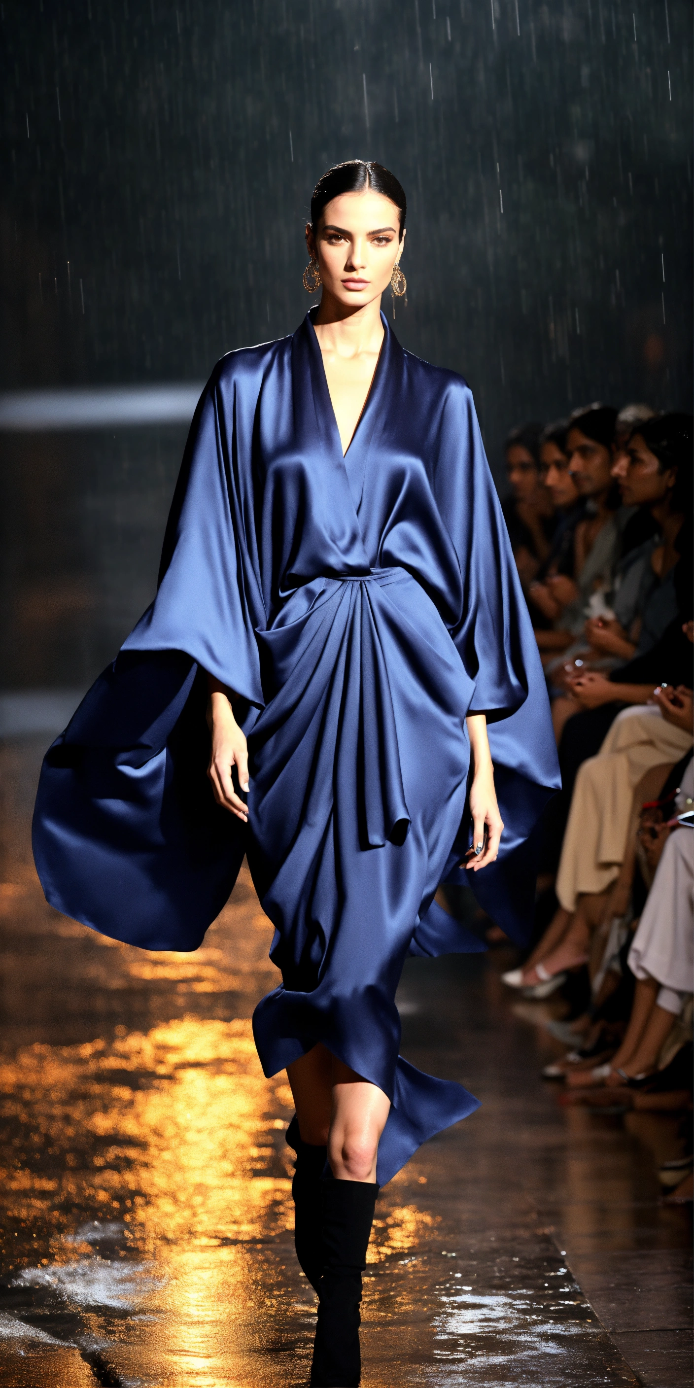 3d realistic photo of fierce italian model wearing dolman sleeve donna karan upscale fashion in satin walking a runway in delhi in the rain