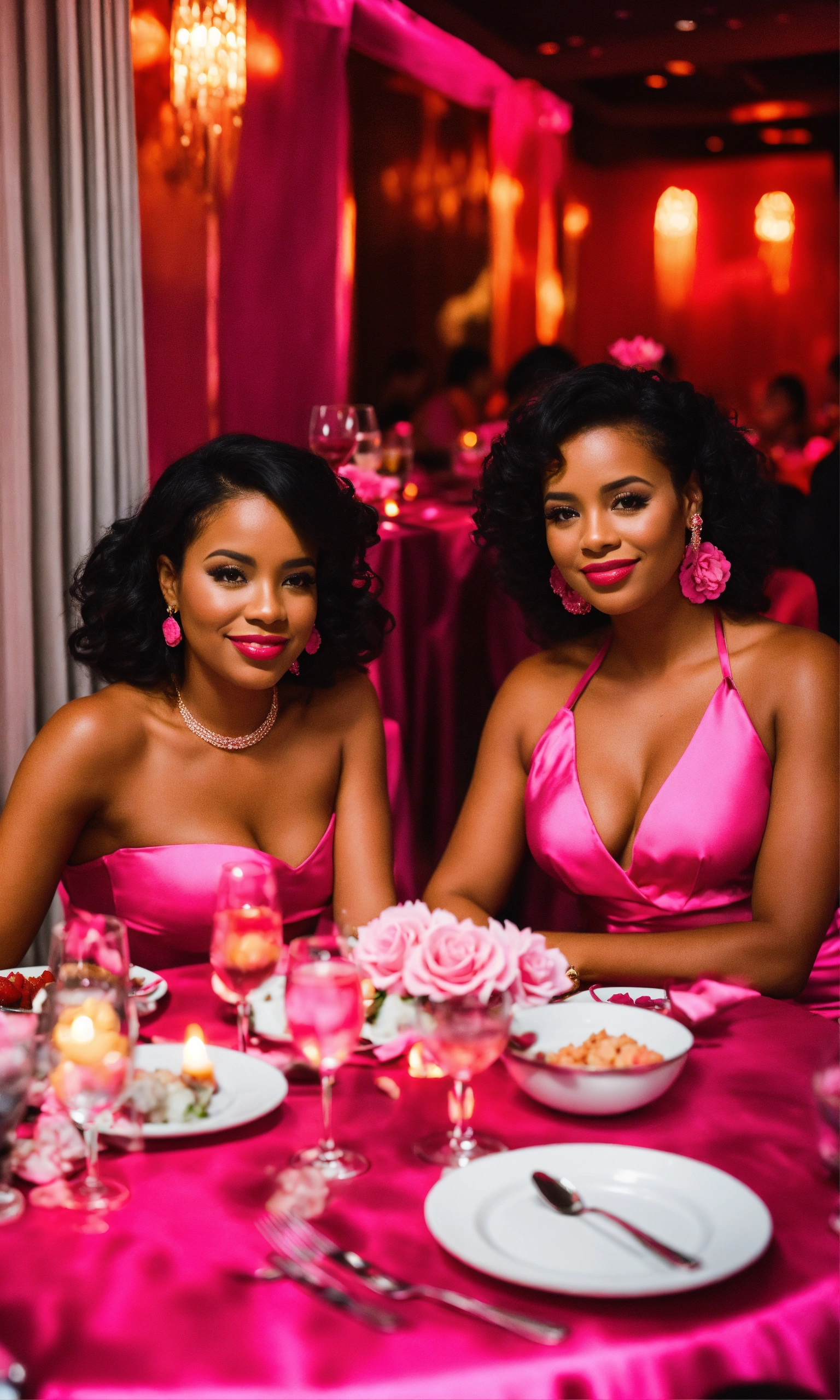 2 dominican women dressed in pink at pink themed dinner party in a nightclub sitting at dinner table