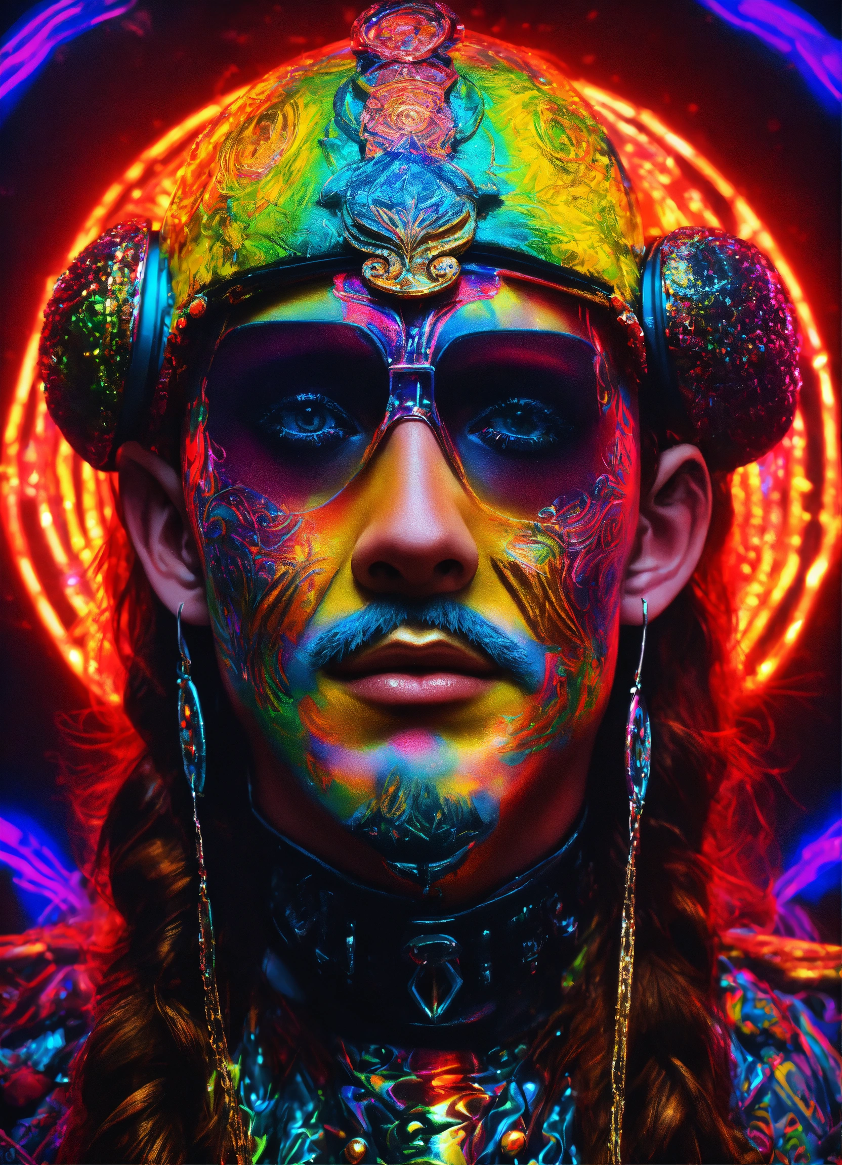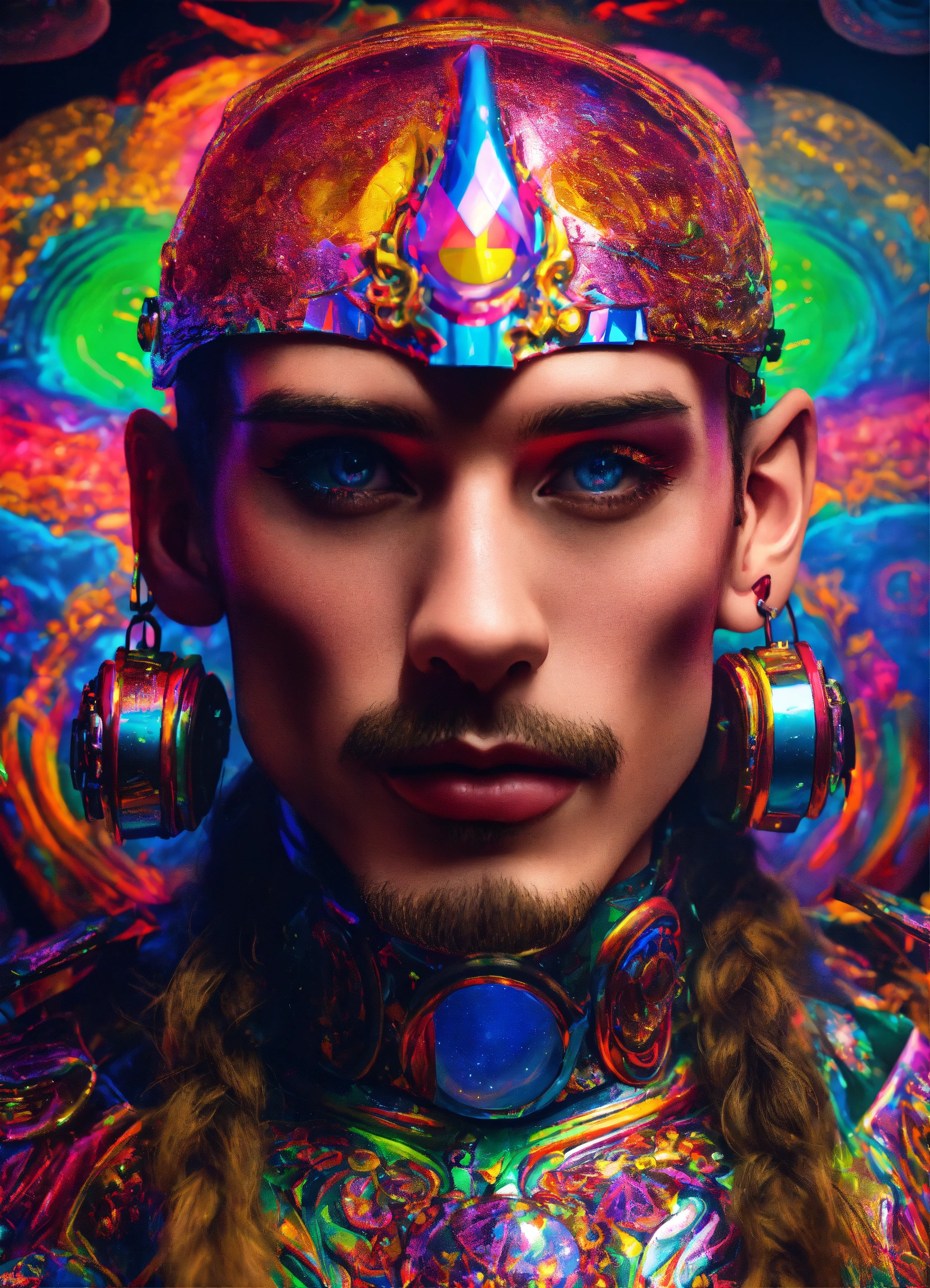 Photorealistic 3d 35 mm portrait of gothic male warrior man ai god dmt laughing psytrance grimes punk rock anime haute couture costume, baptized in a cosmic alex grey painting in a dmt black laser light neon black rainbow glitter holographic techno club art by salvador dali and holy mountain the movie.