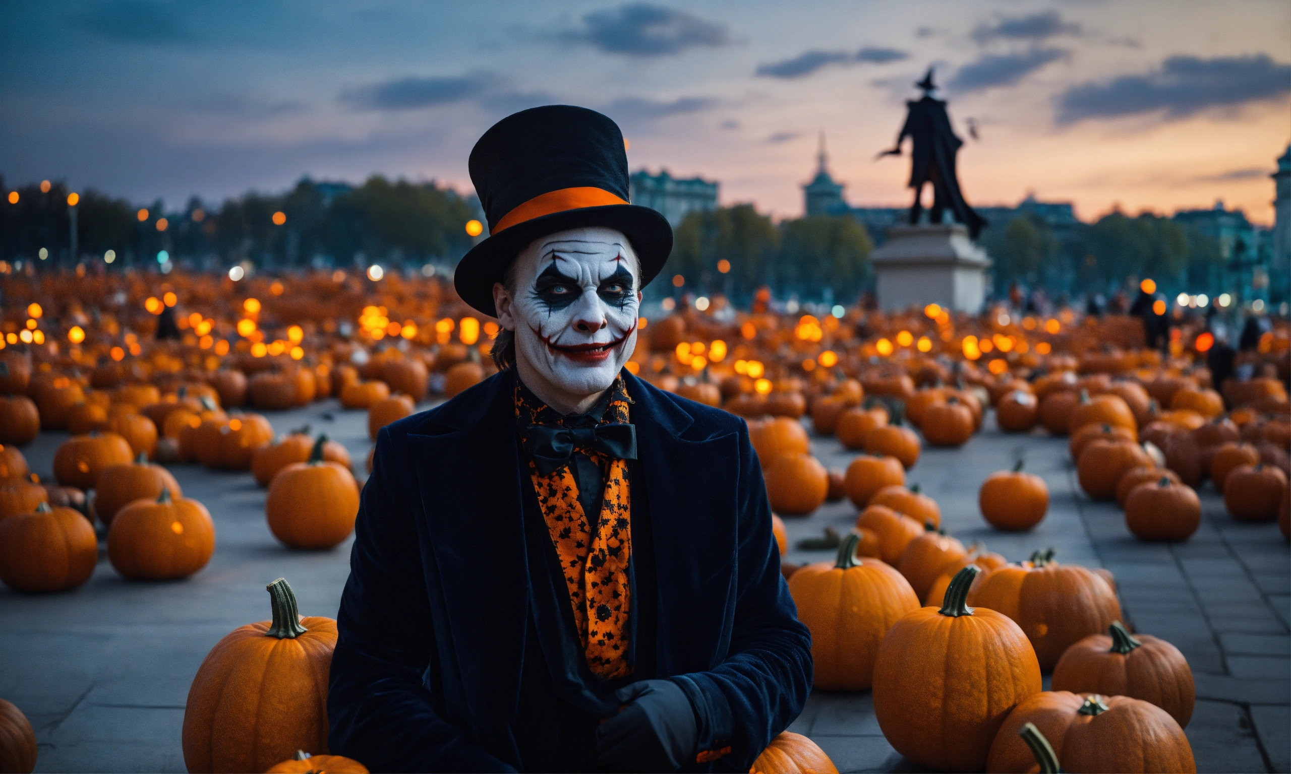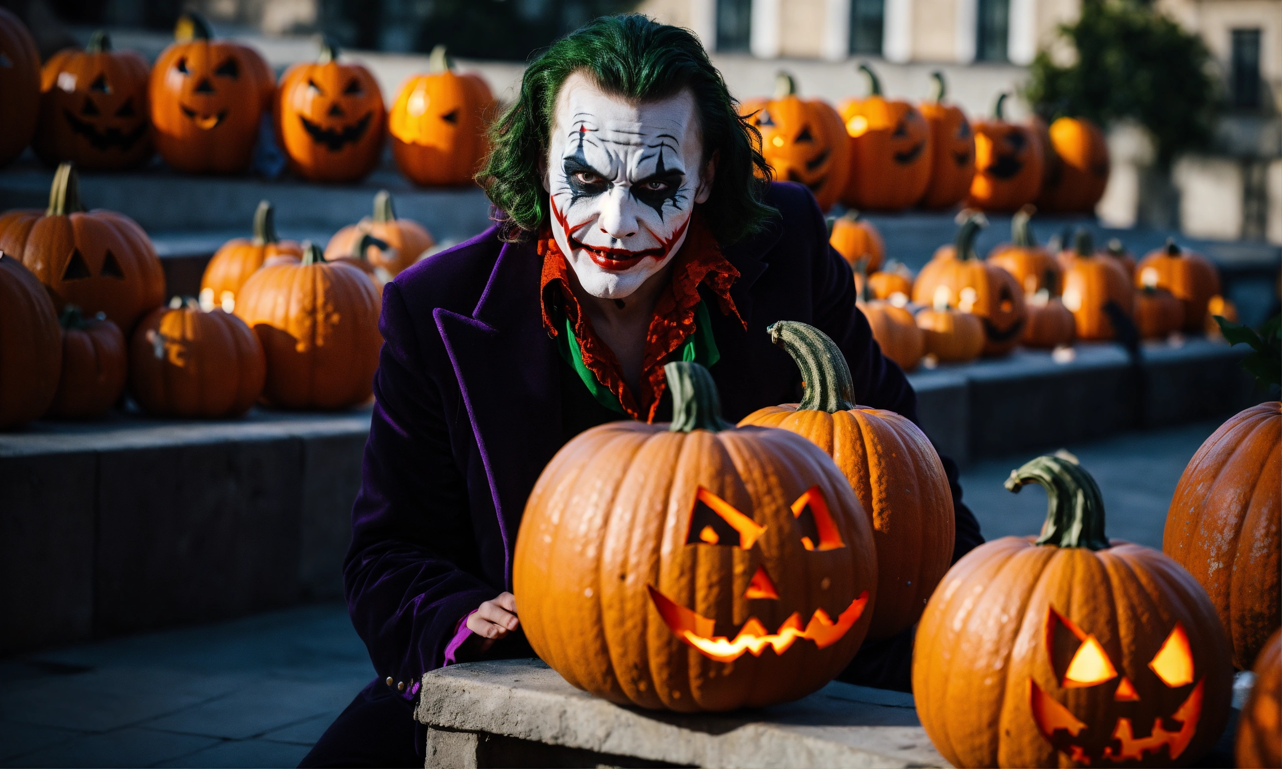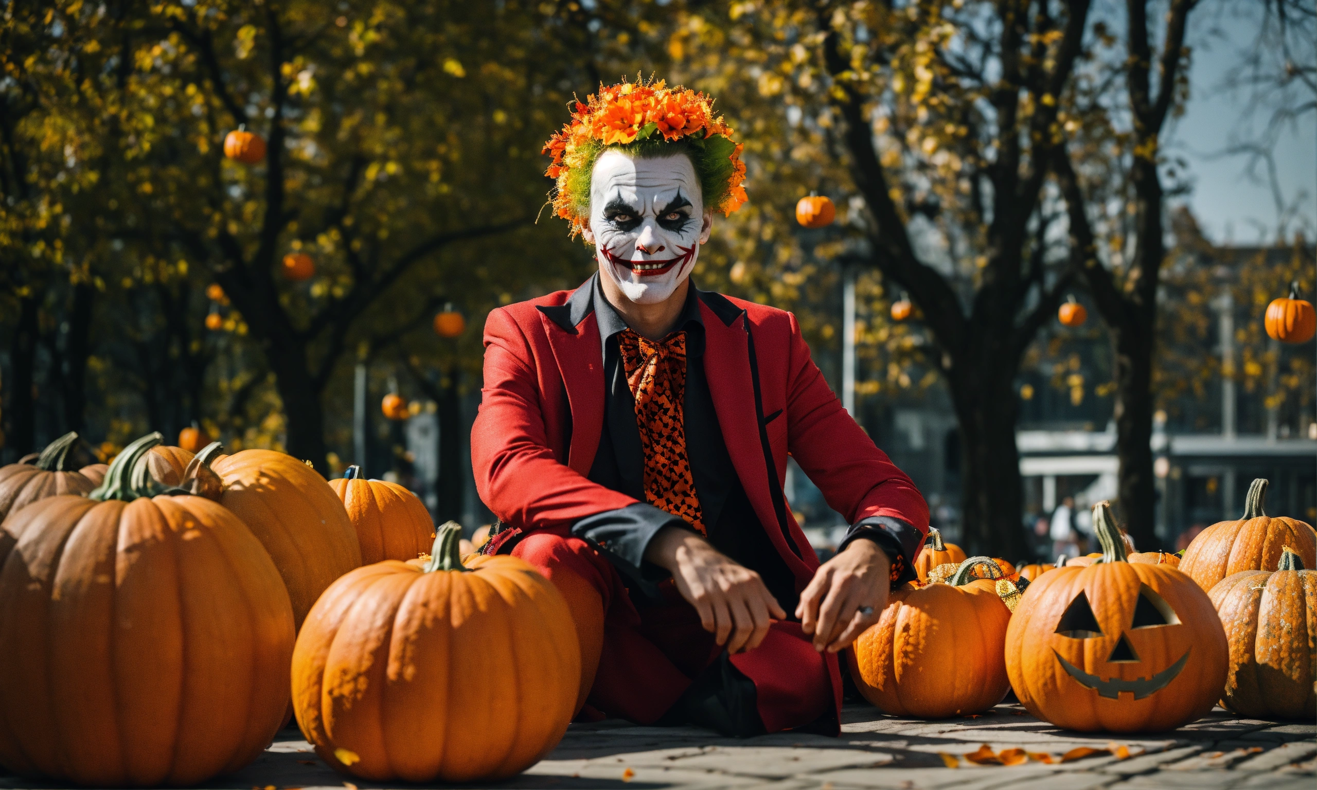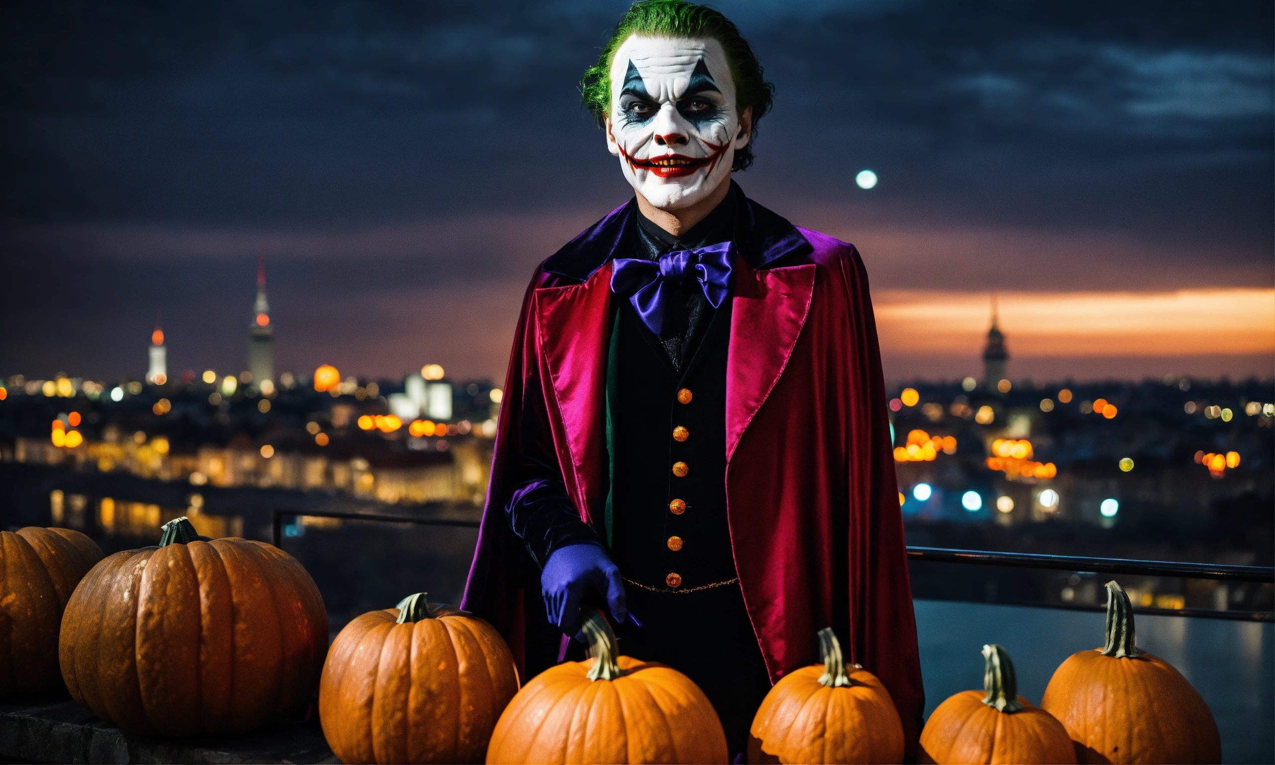 Halloween style, warsaw, poland. man dressed in halloween costume at the top of the riviera looking at the camera at half height, focus on the face, halloween style, pumpkins, evil joker costume
