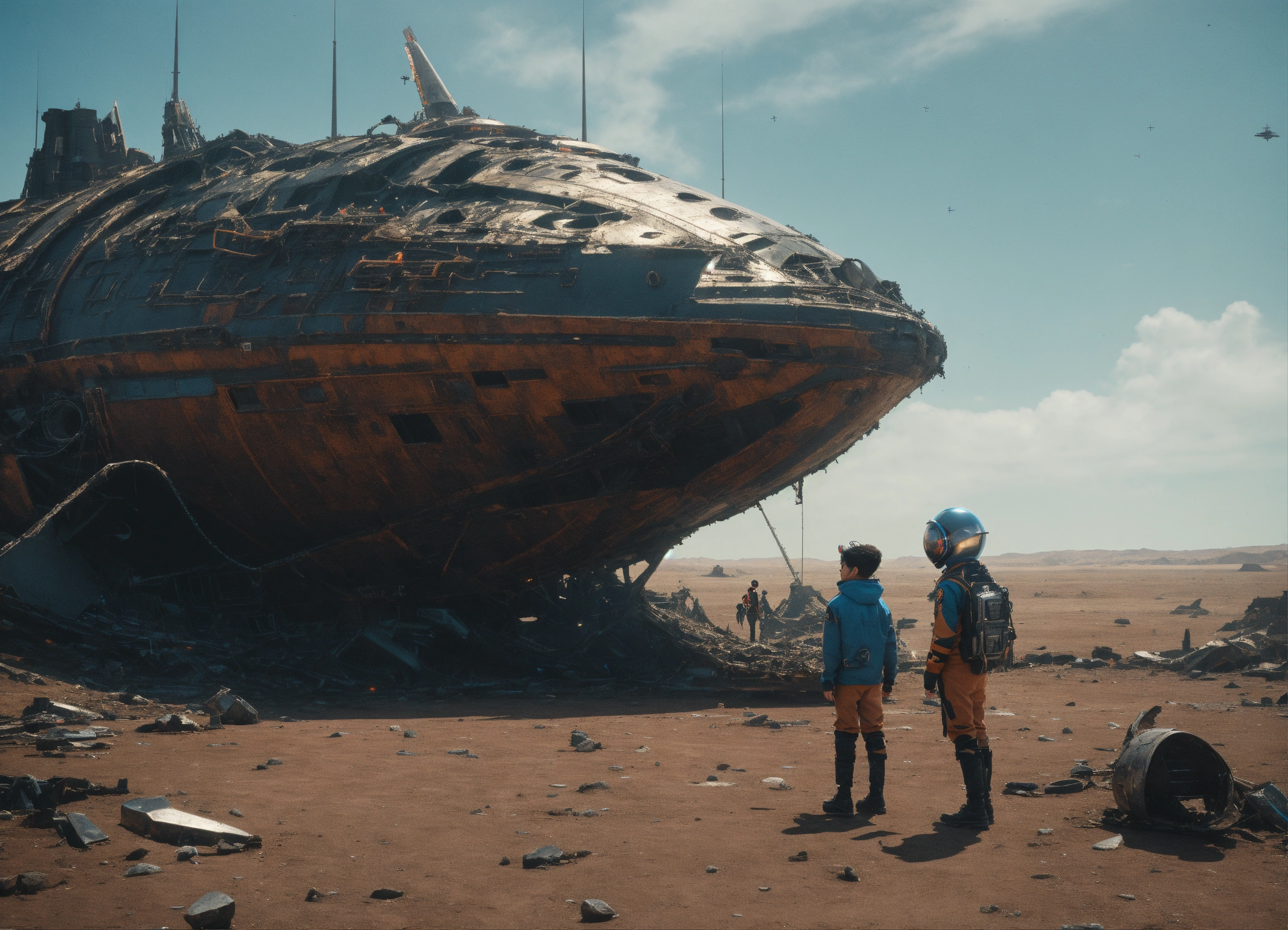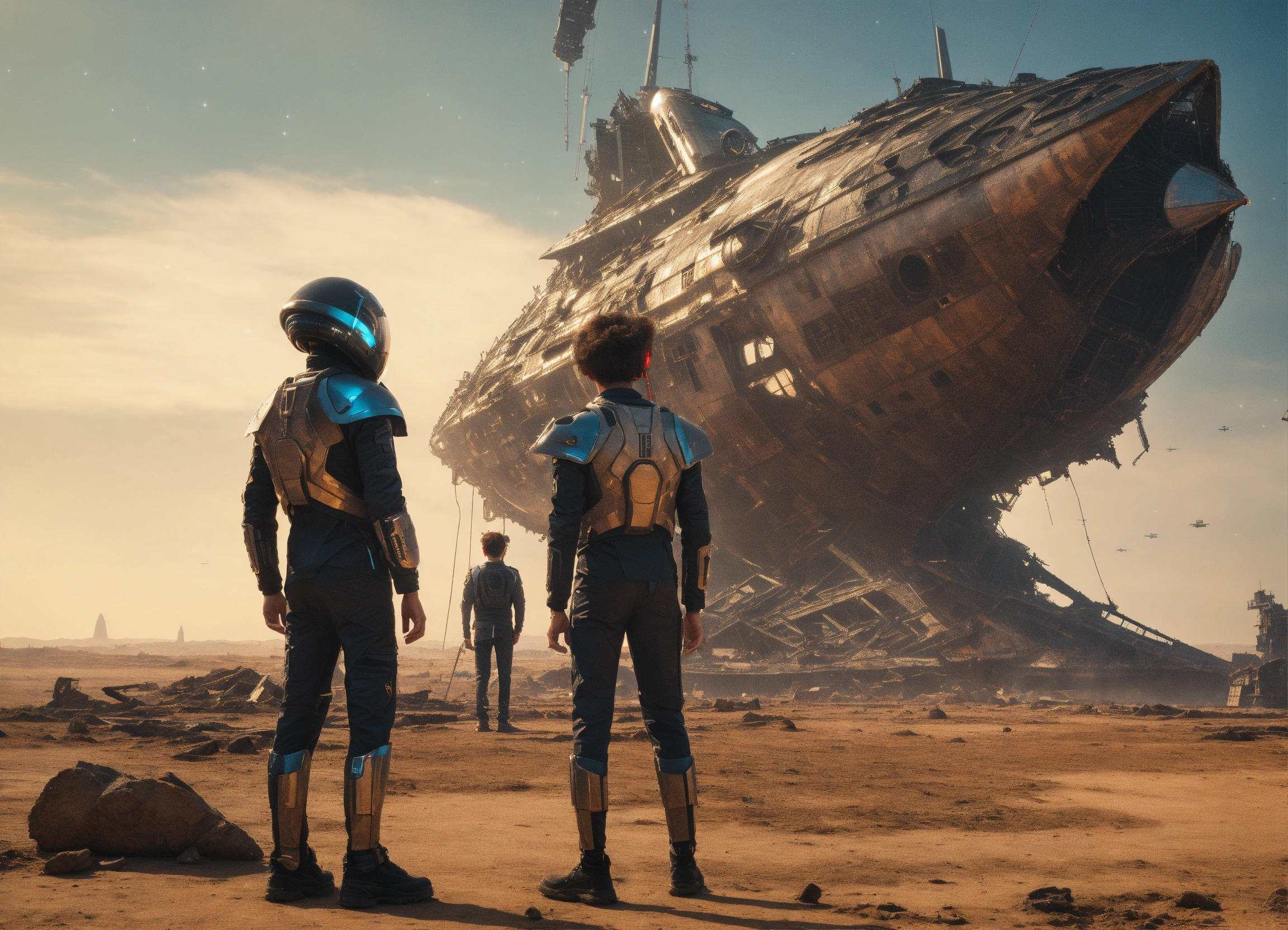 Zoom out of a 3 boys standing outside a wrecked star ship wearing detailed alien ear antennas with futuristic clothing, futuristic, sci-fi, realistic, 8k