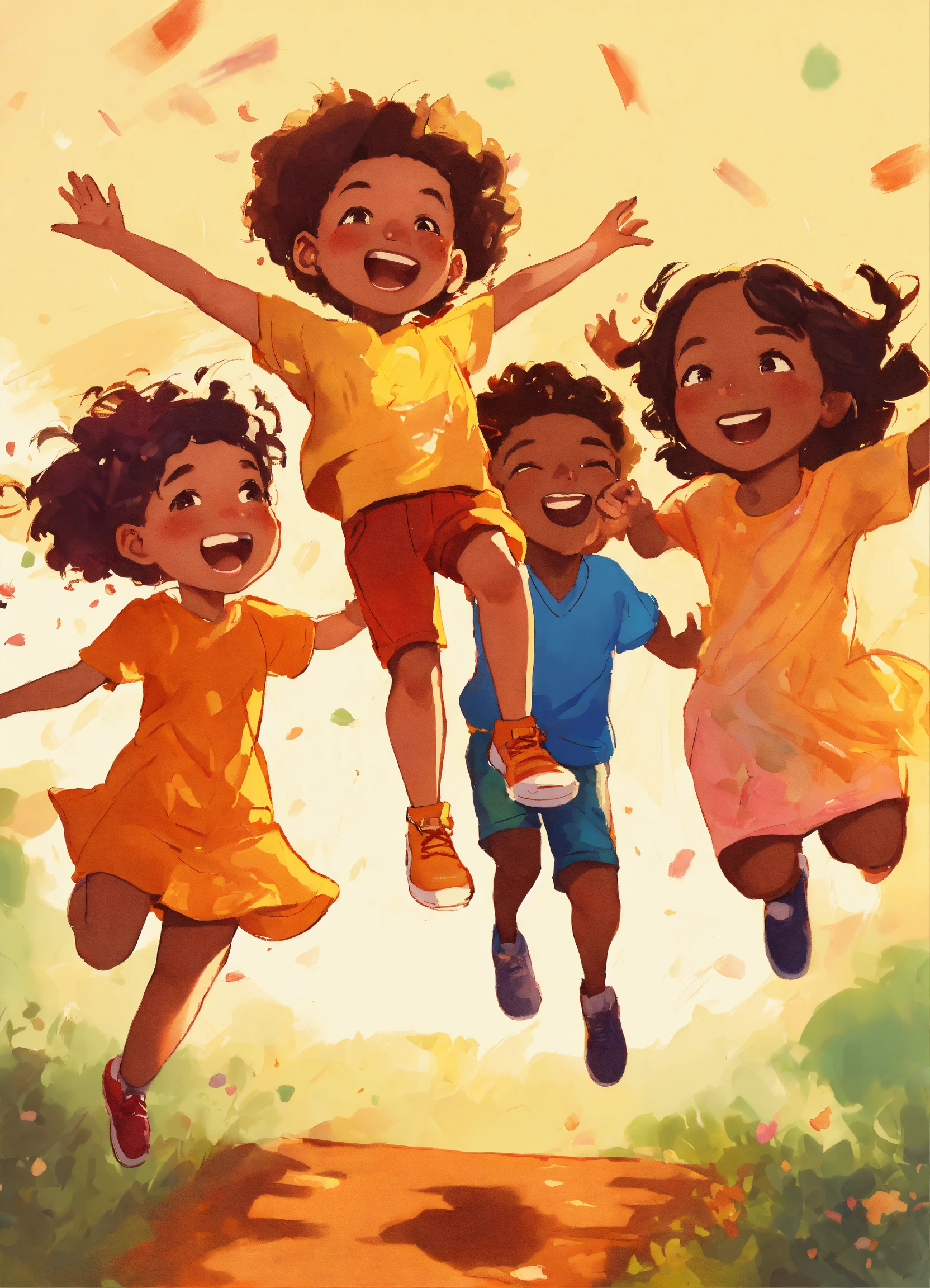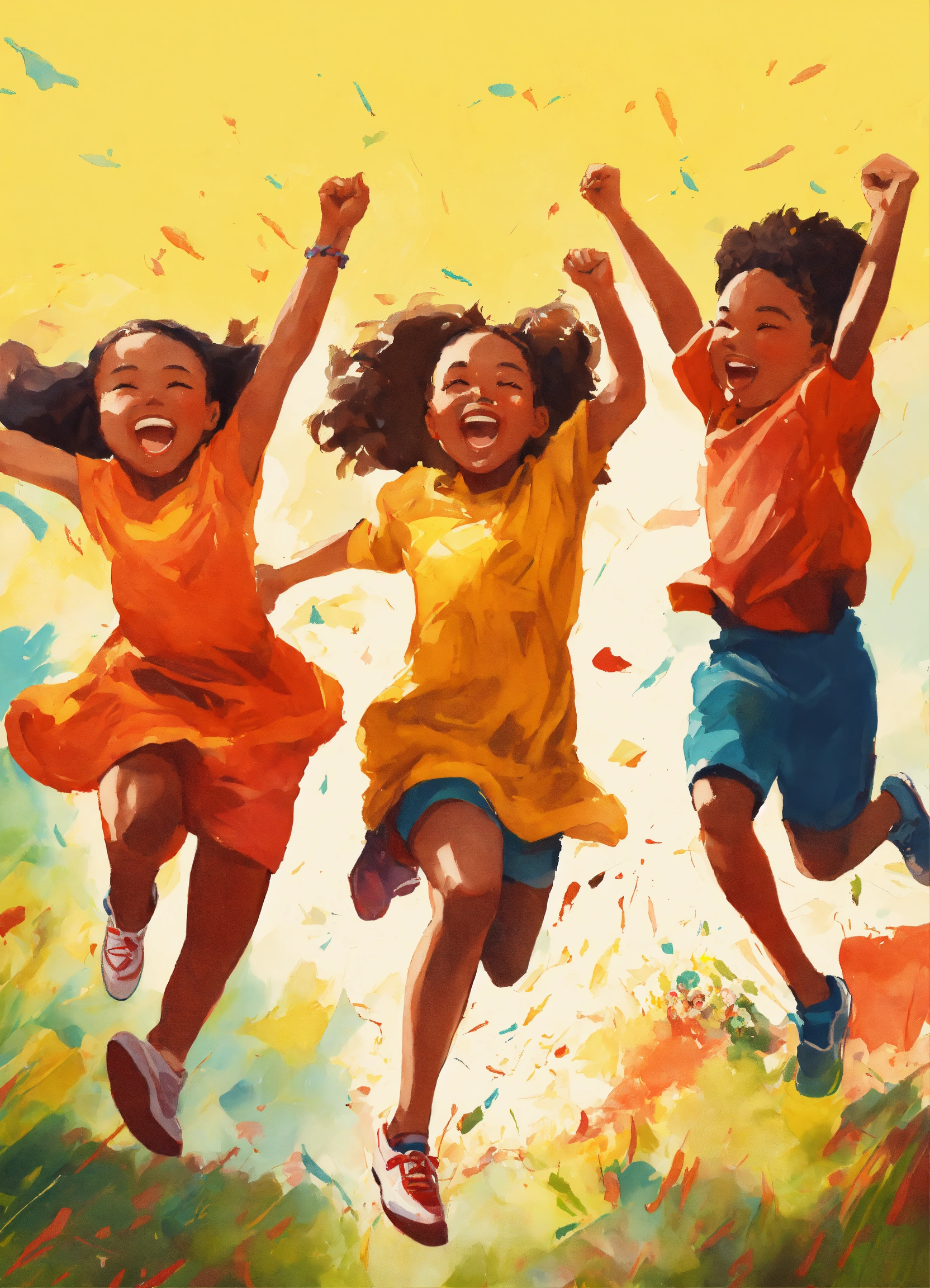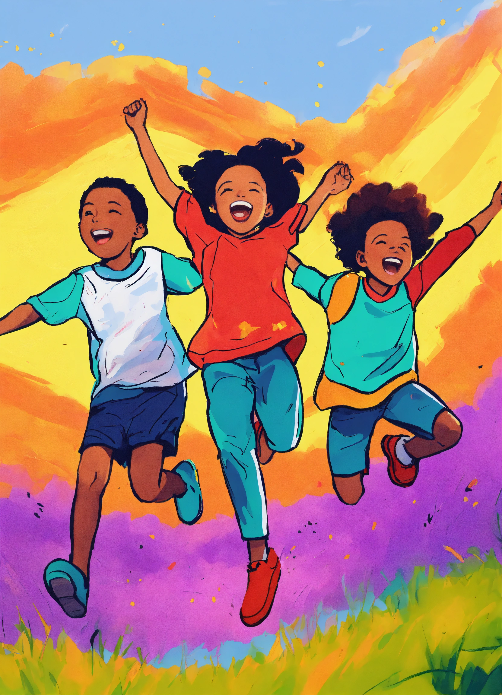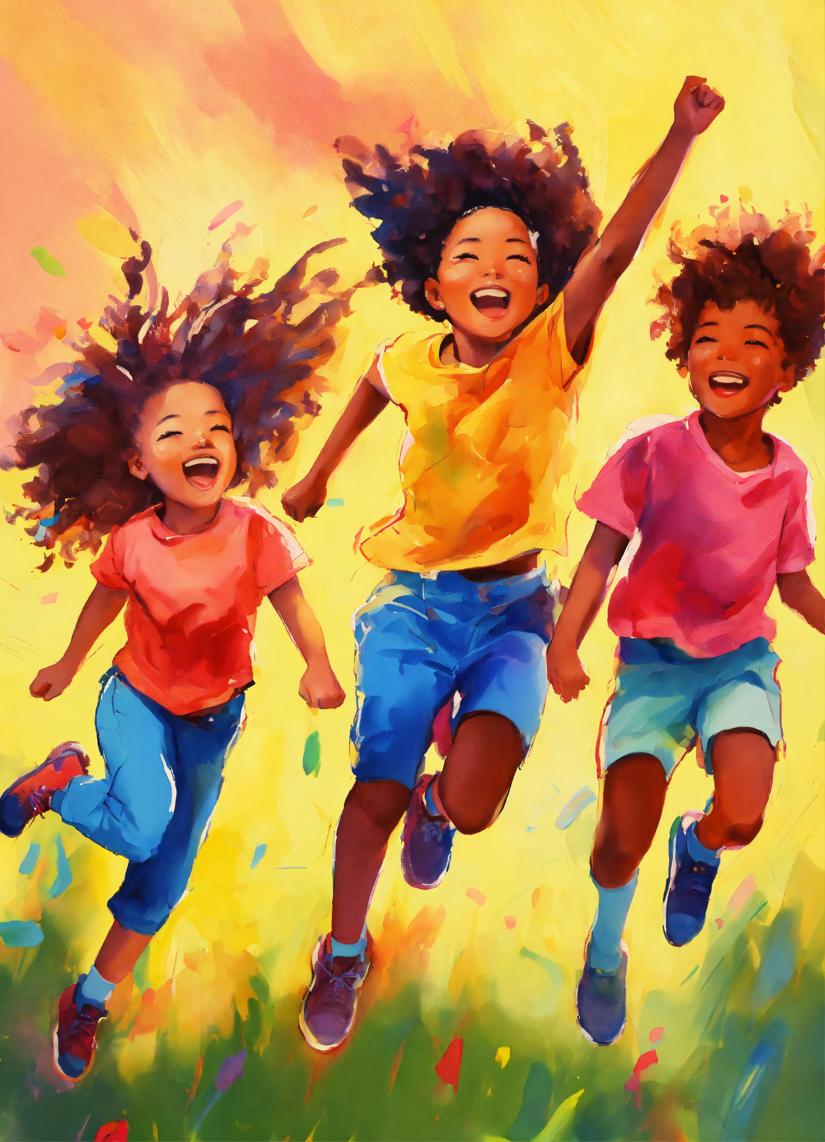 A hand drawn painting of a group of multiracial children, jumping with joy and exuberance, 4k, sharp, vibrant, lively