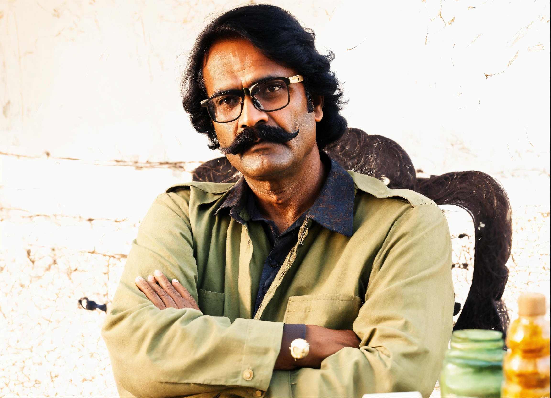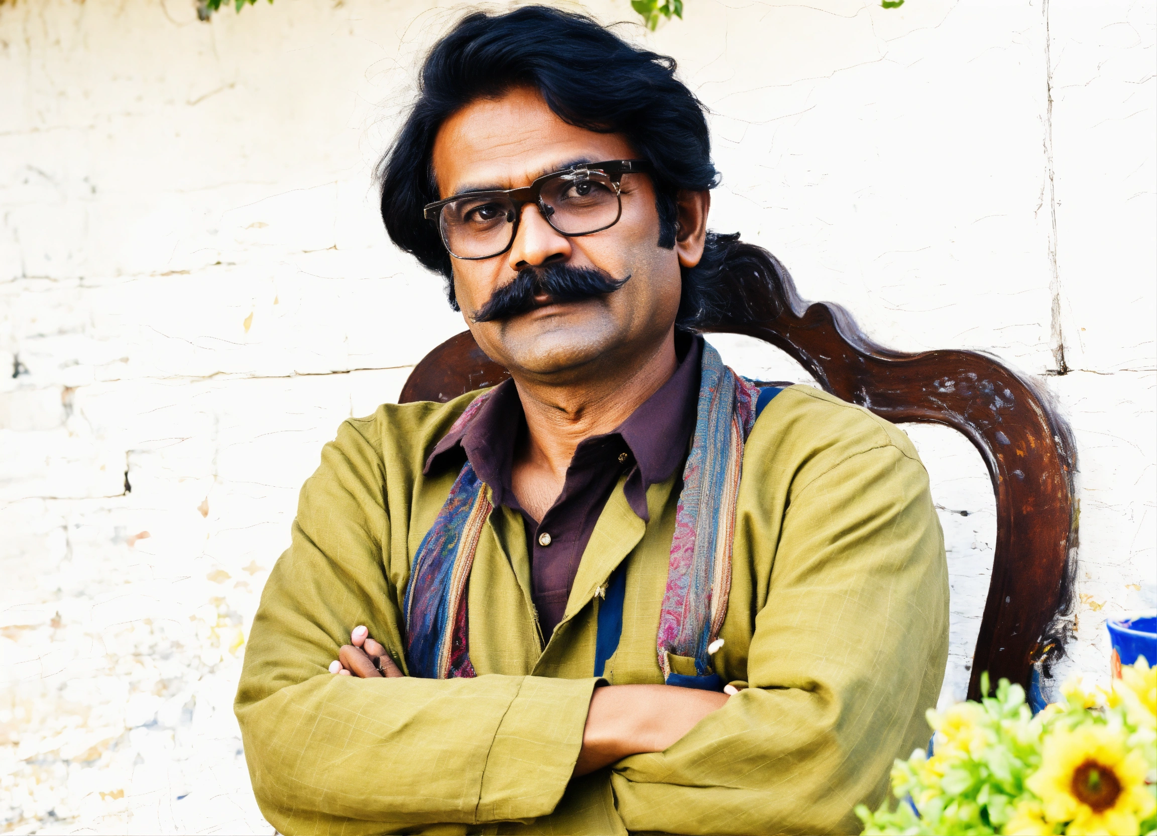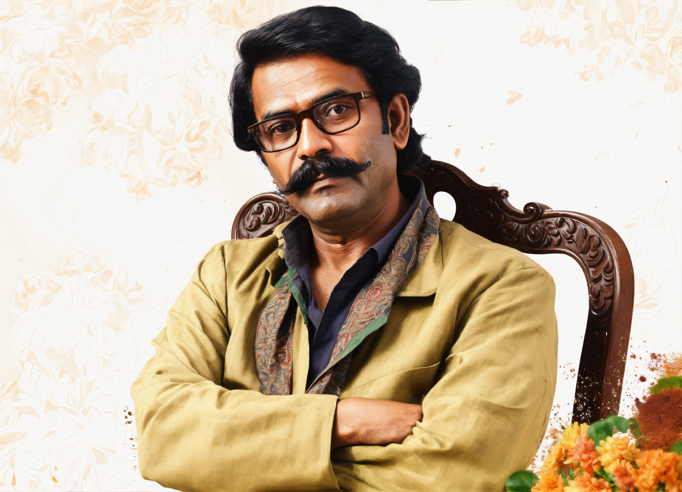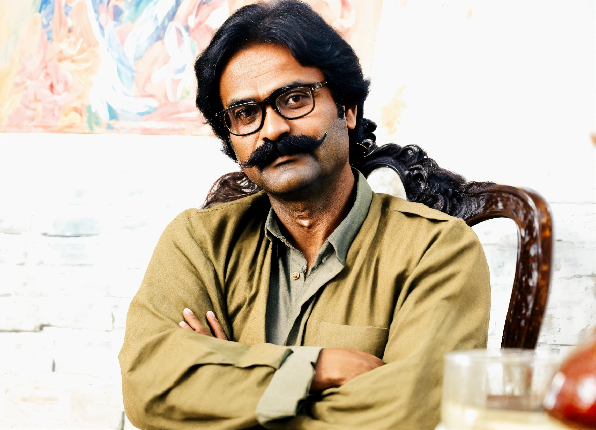 Regenerate an oil painting of this middle-aged bangladeshi man in a similar mustache and glasses in the picture