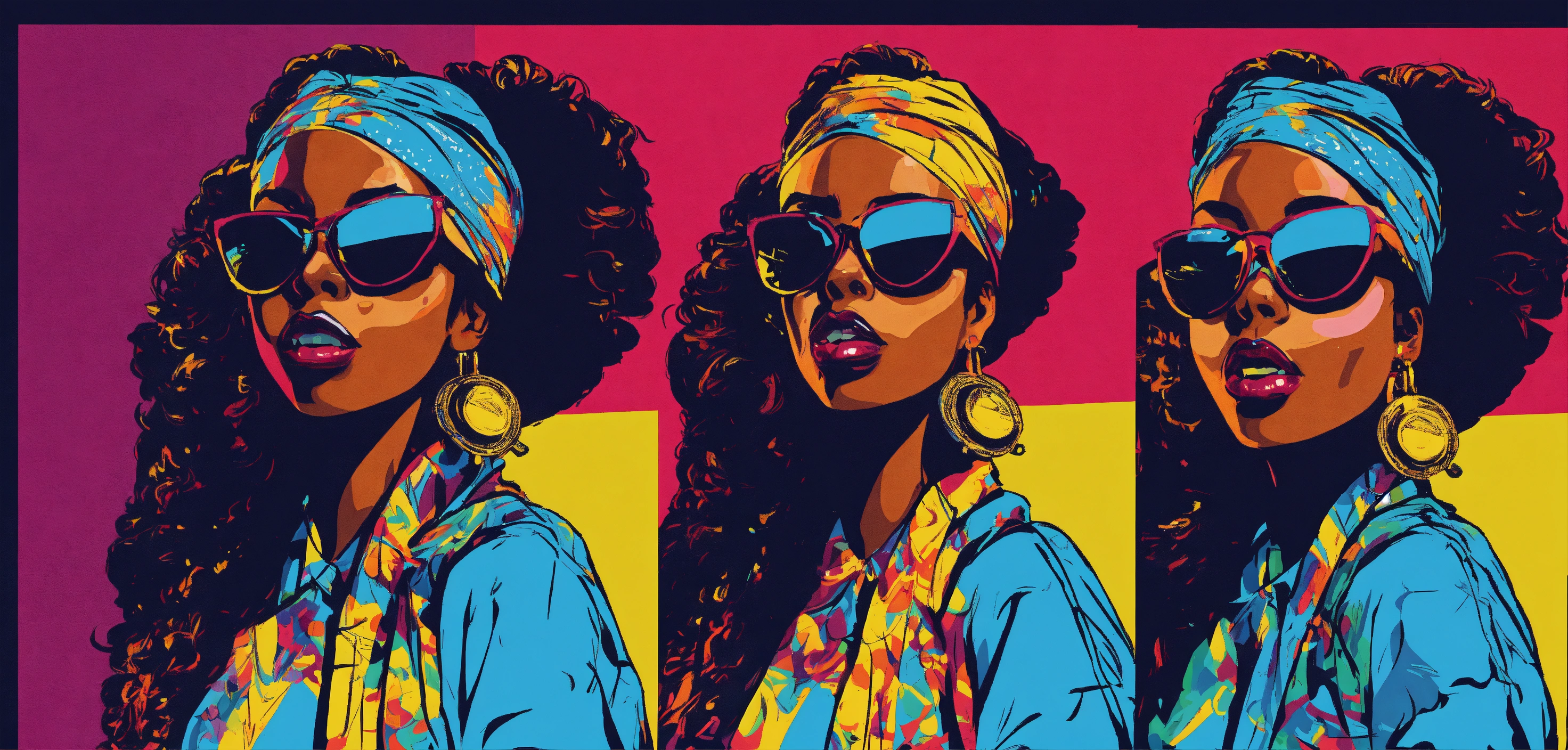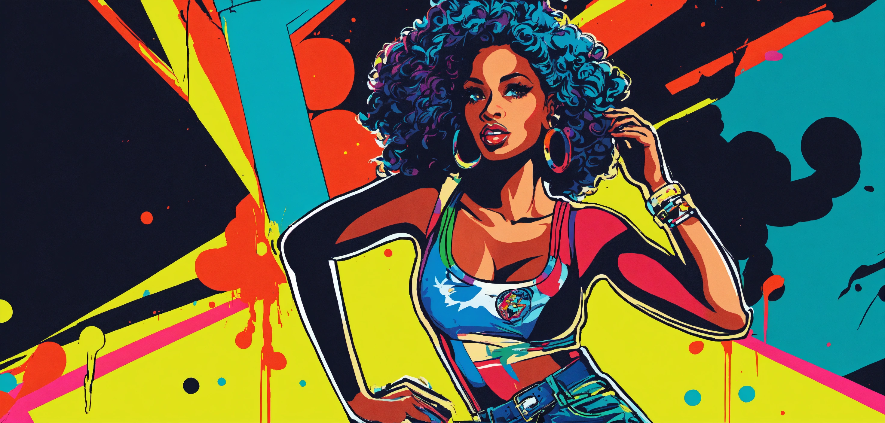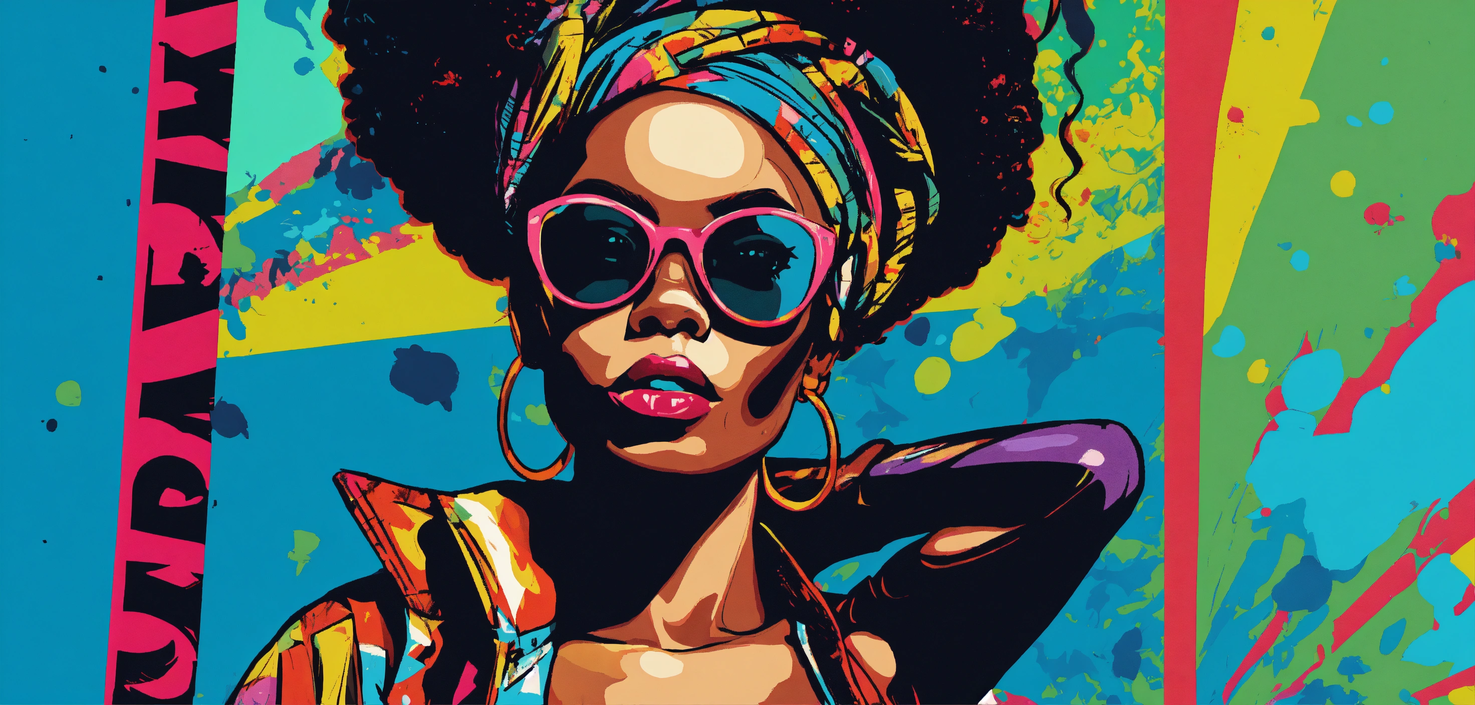 Pop art rebel rebel black woman in rebelinspired pop art clothing, striking a defiant pose amidst bold pop art statements — t-shirt design graphic, vector, contour, black background.