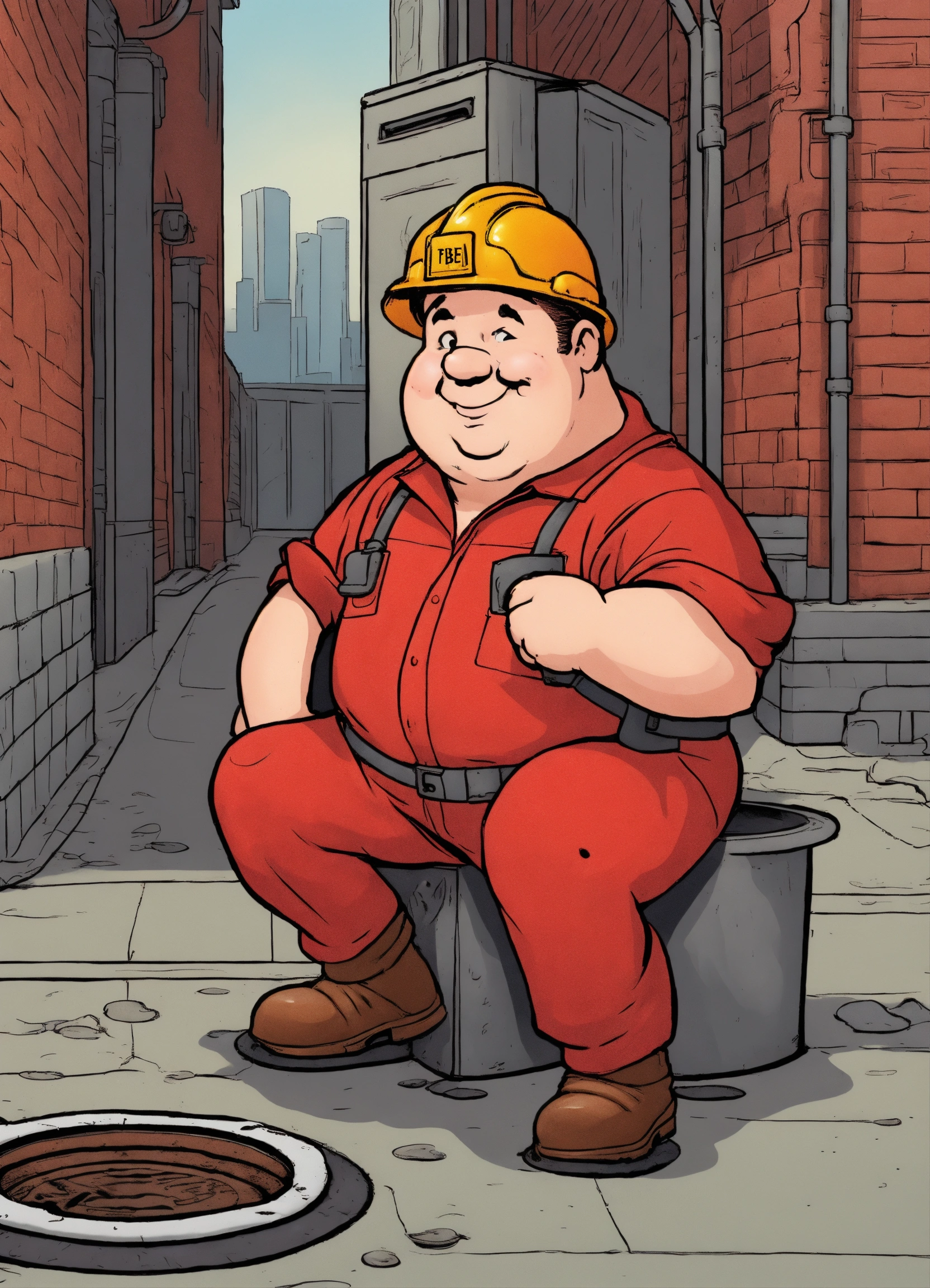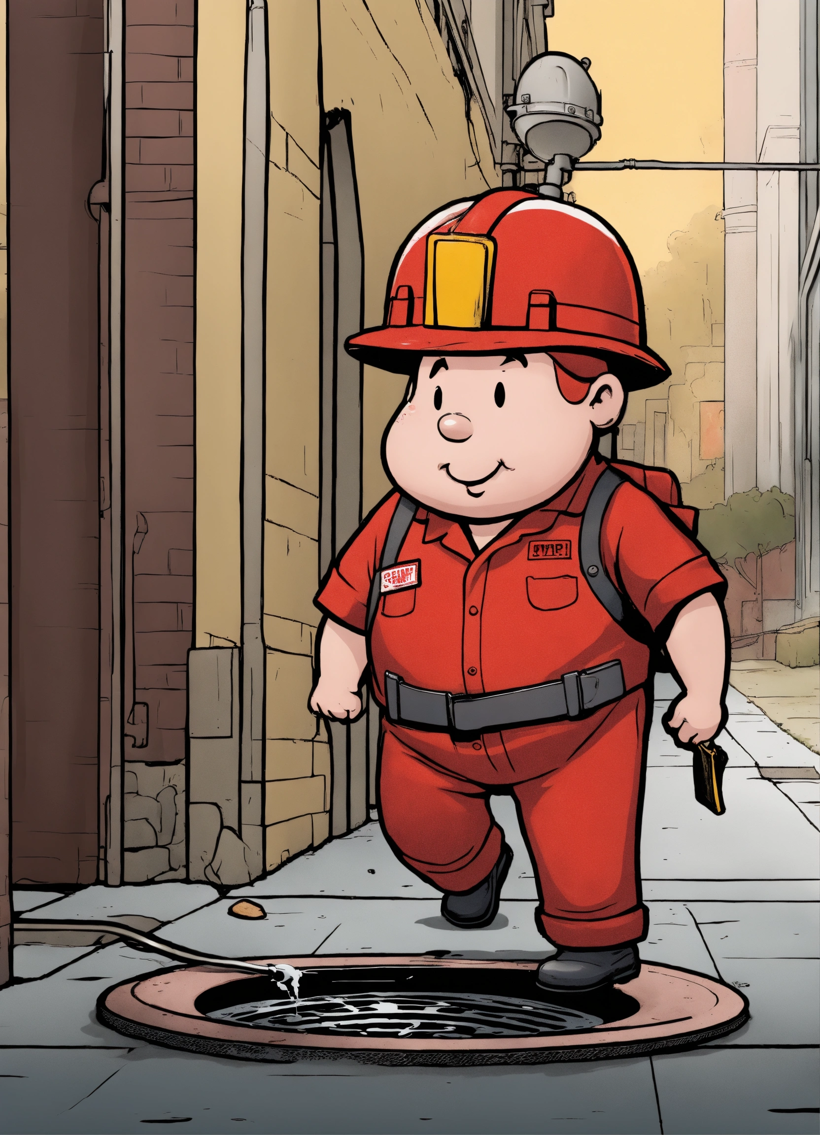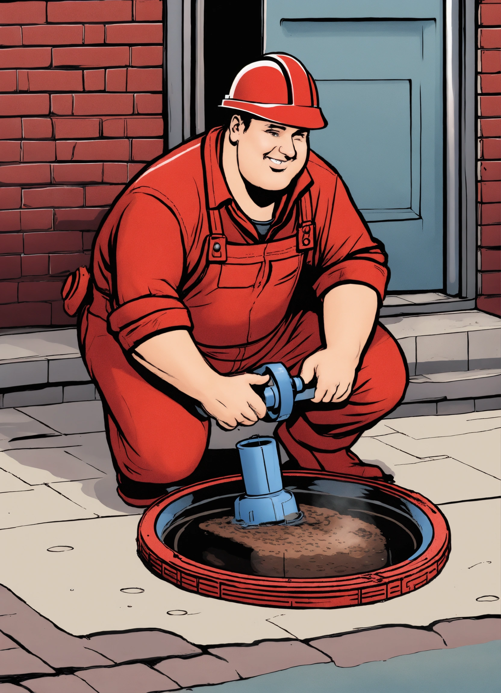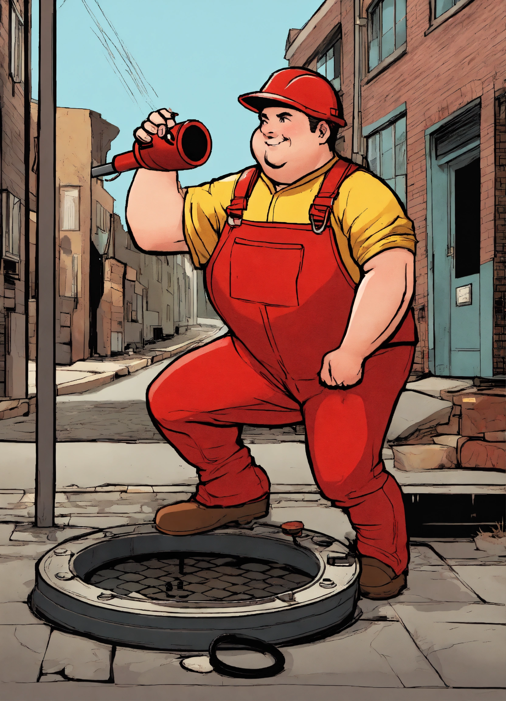 A plumper with a red overall outfit and a red hard hat put a pipe in to the manhole cover on the street, comic style