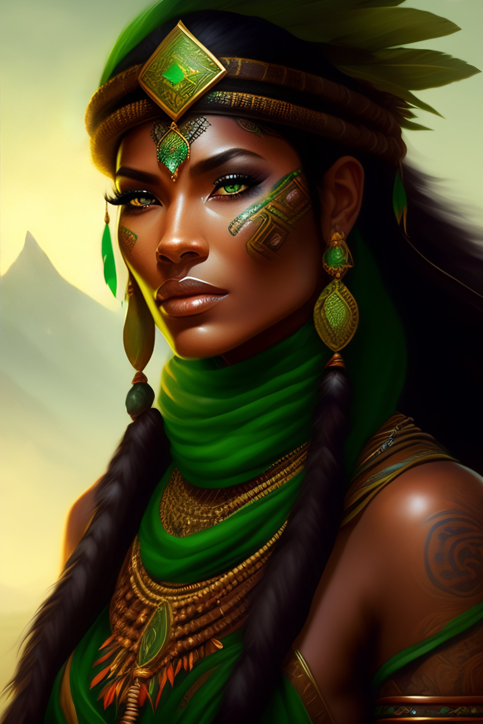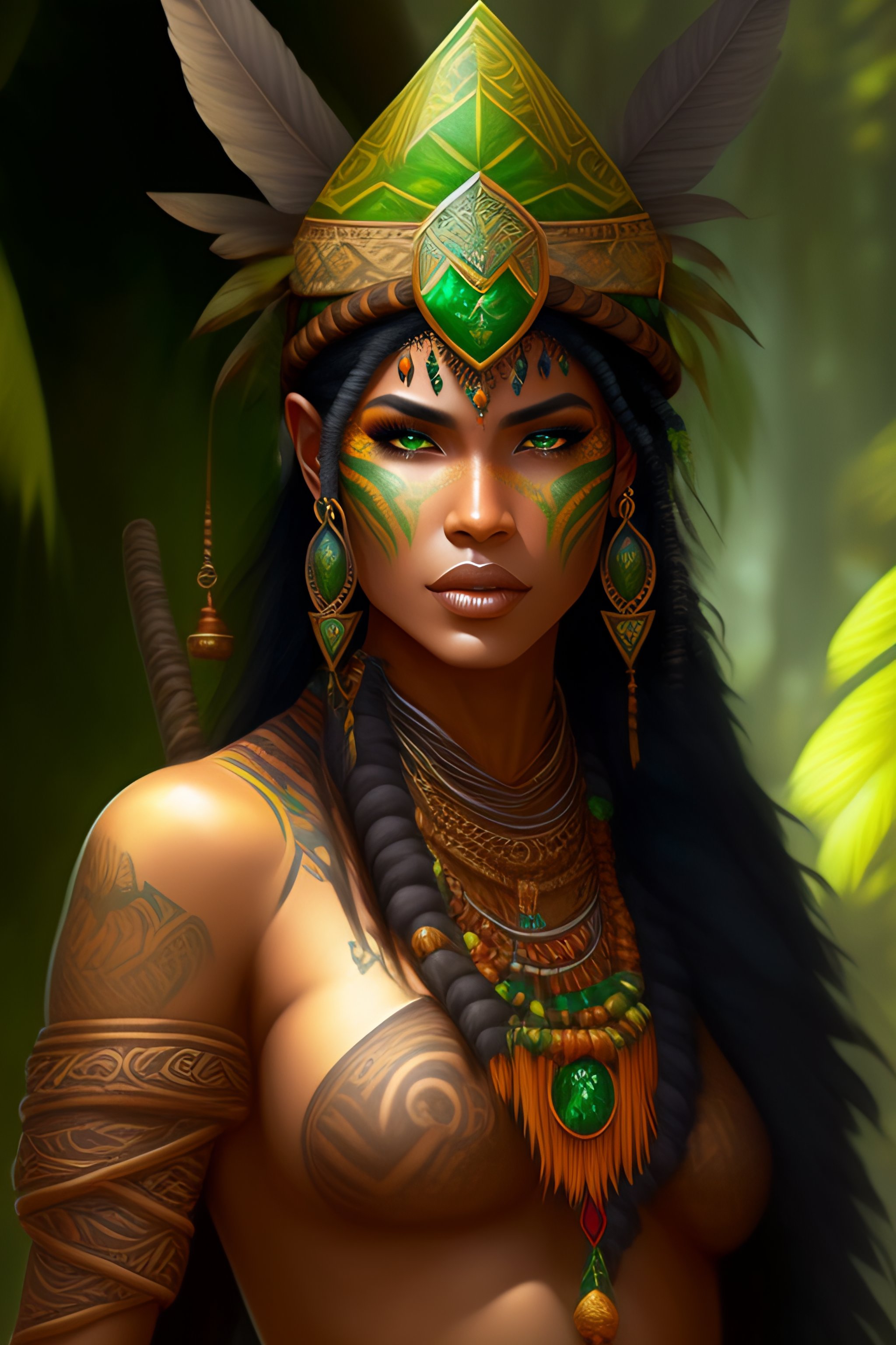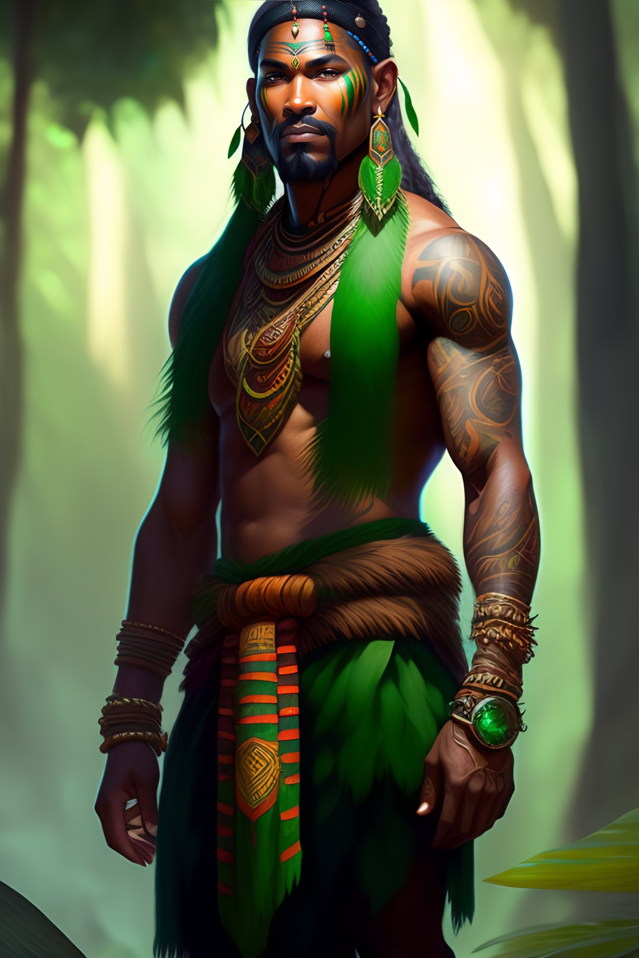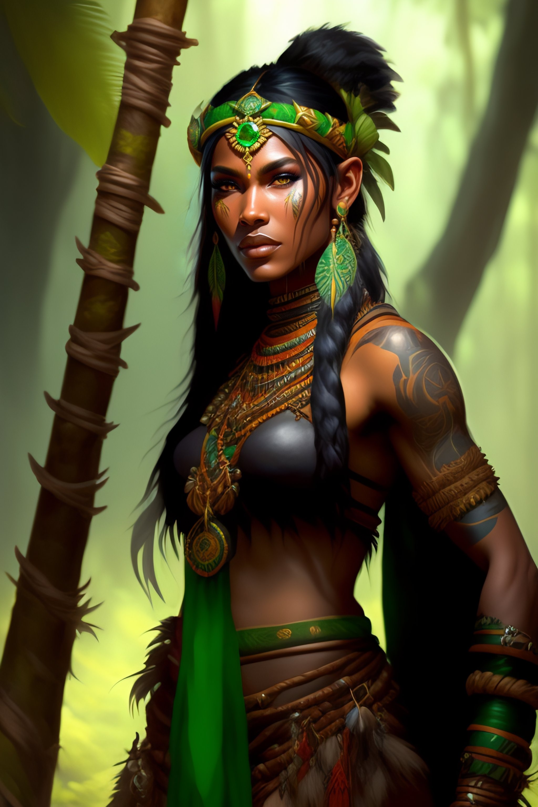 Amazon tribe druid, with tribal tattoos, with a large staff and an emerald rock in the center, green bandana on his head, tribal tattoos, art by artgerm and jordan grimmer and greg rutkowski, trending on artstation, illustrated by sophie anderson