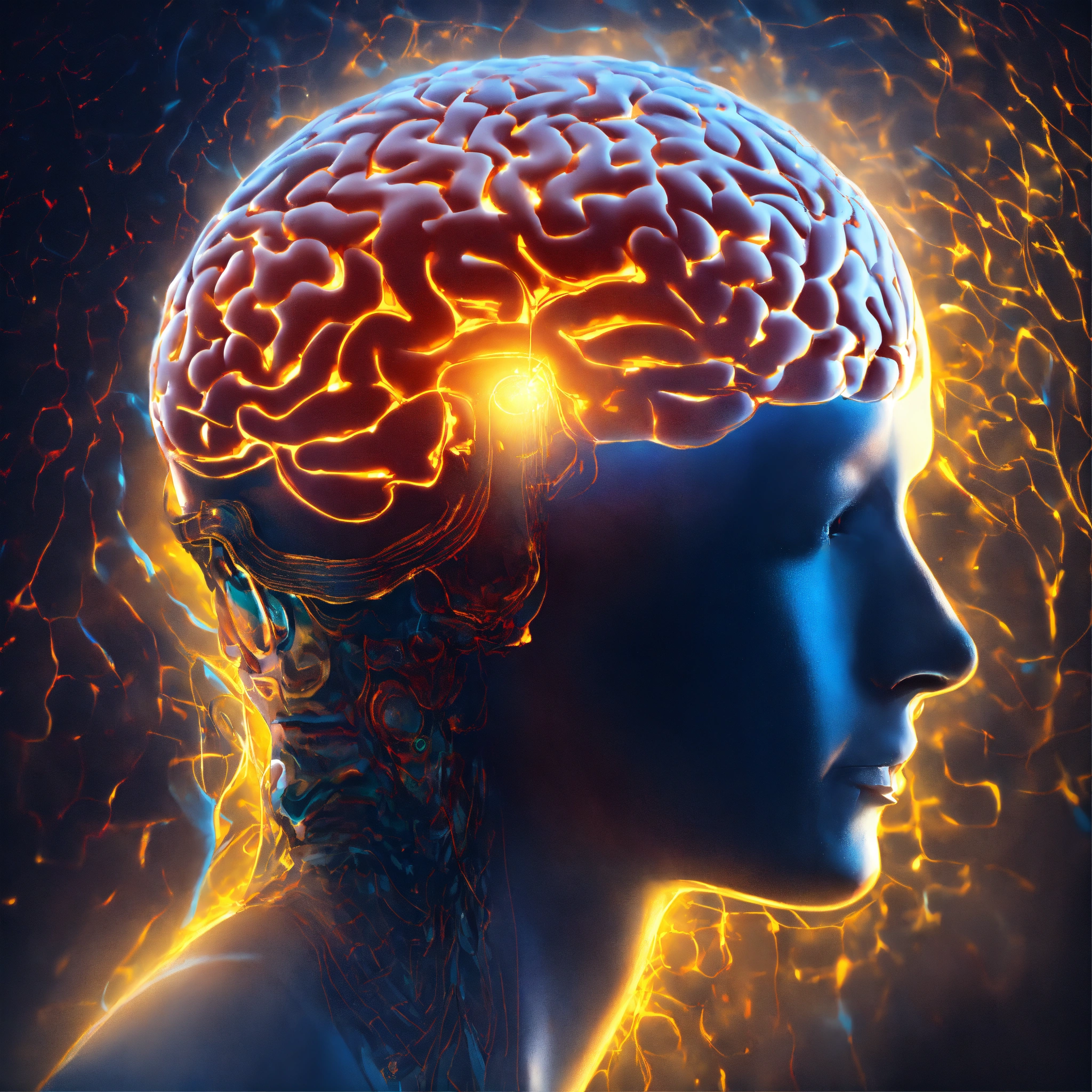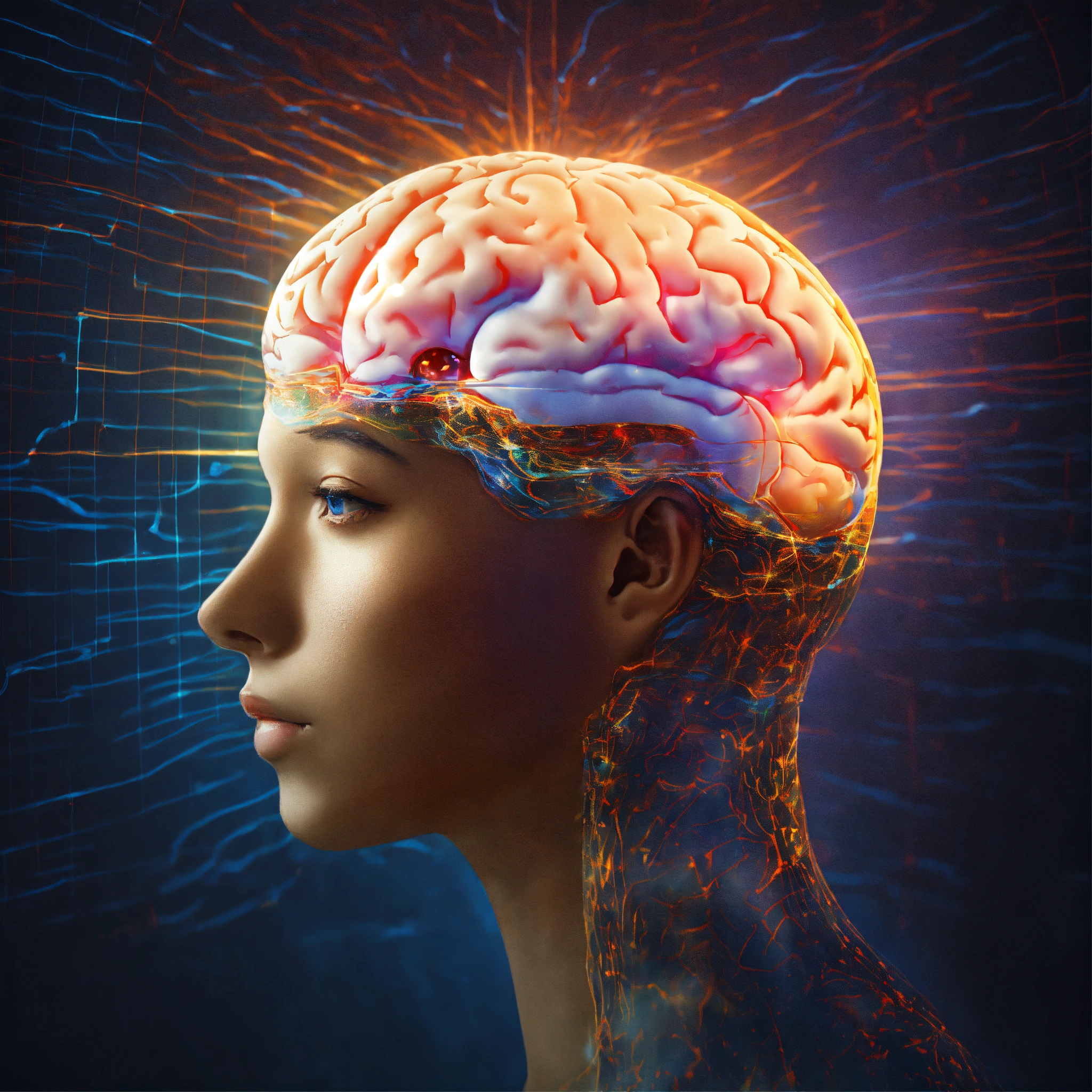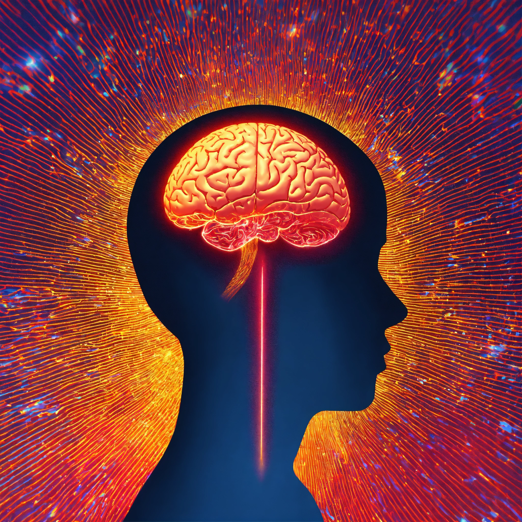 A face depicted as a brain with a ripple effect of light radiating out from the primary visual cortex