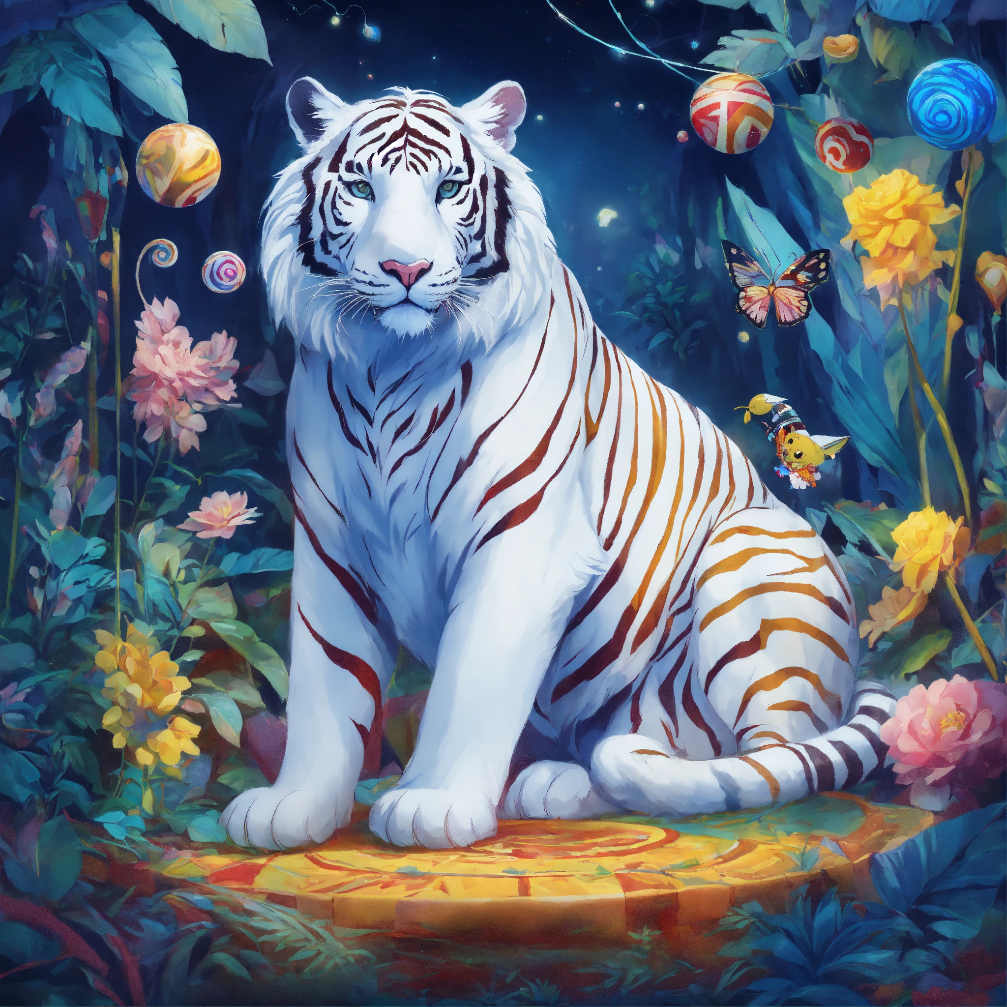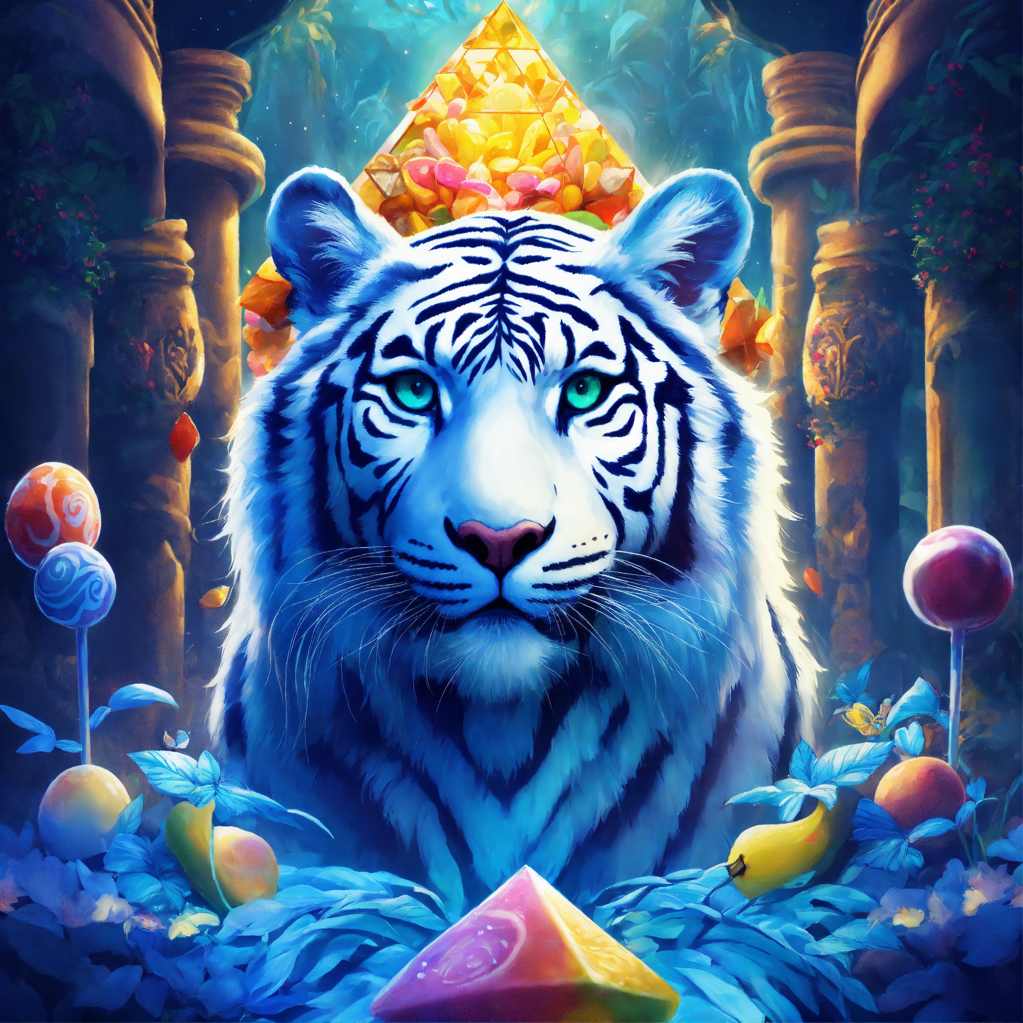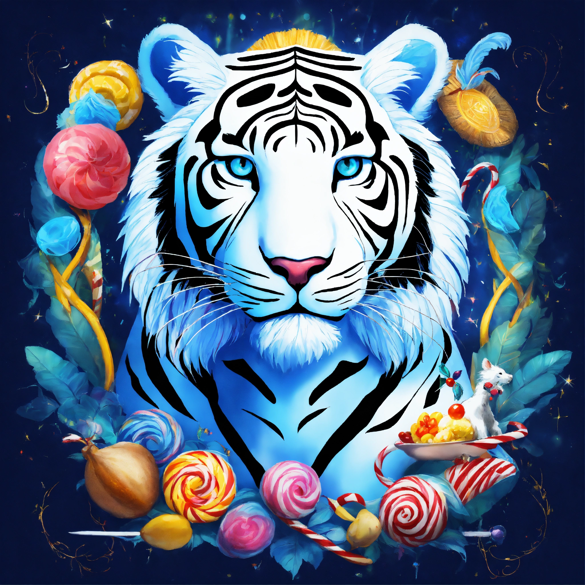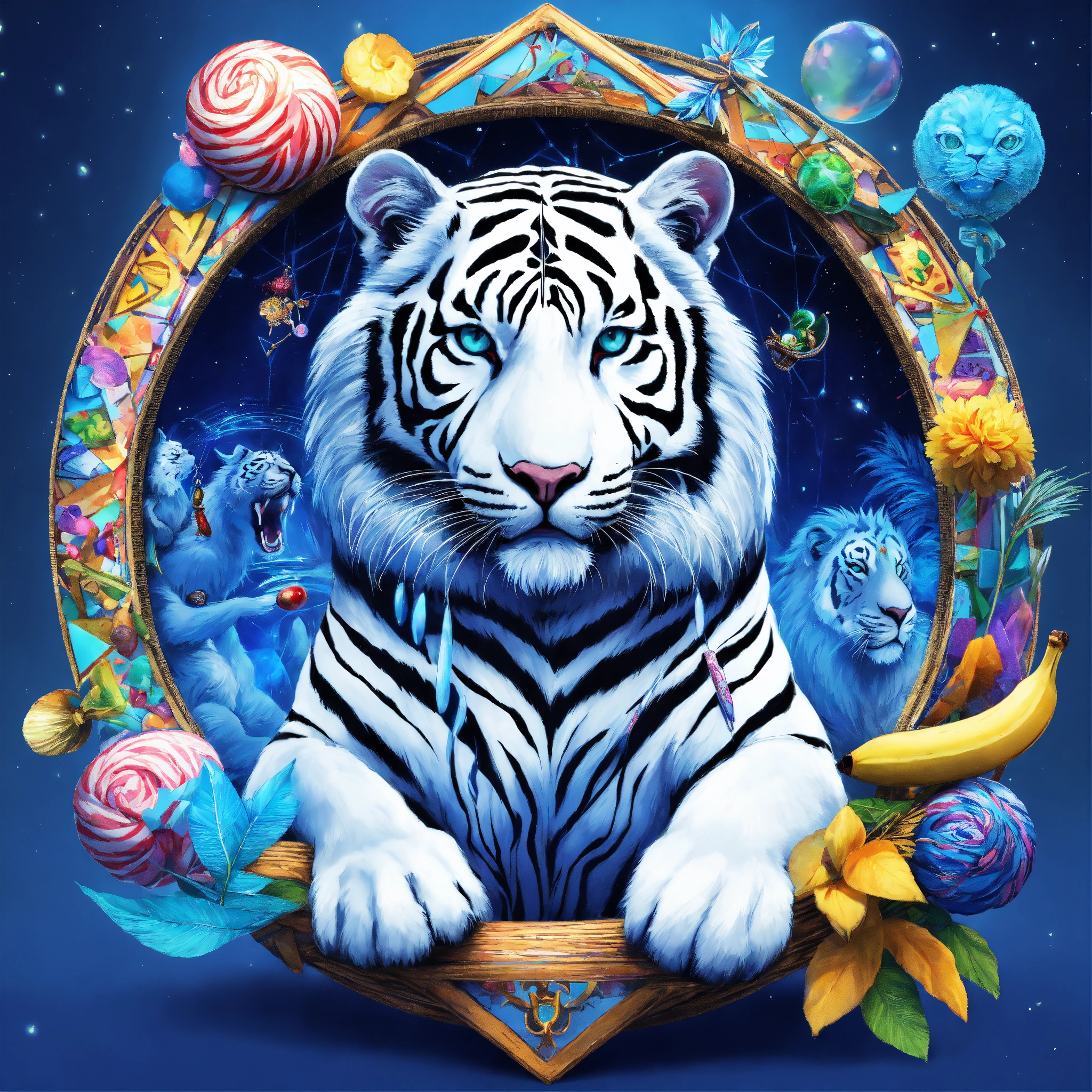 Image. illustrate a white tiger with candy bananas blue monkeys. long exposure photography style, cartoon style, x-ray style, in the style of tim burton, lion king, the chronicles of narnia, beauty and the beast, and peter pan. with native american and sacred geometric patterns on the body. enchanting aura. the chronicles of narnia, wizard of oz, and alice in wonderland background